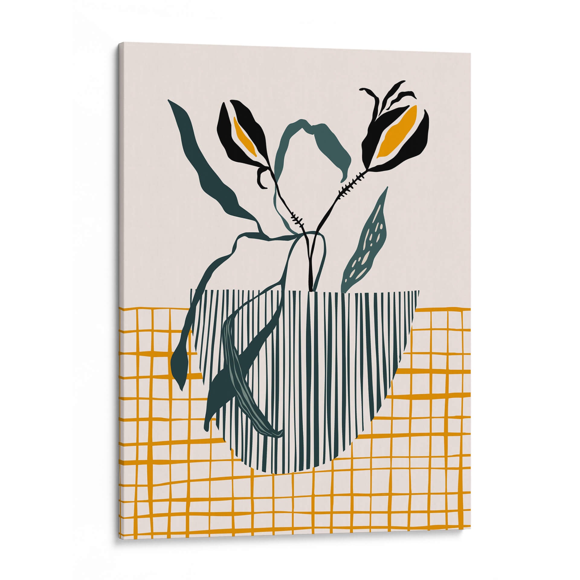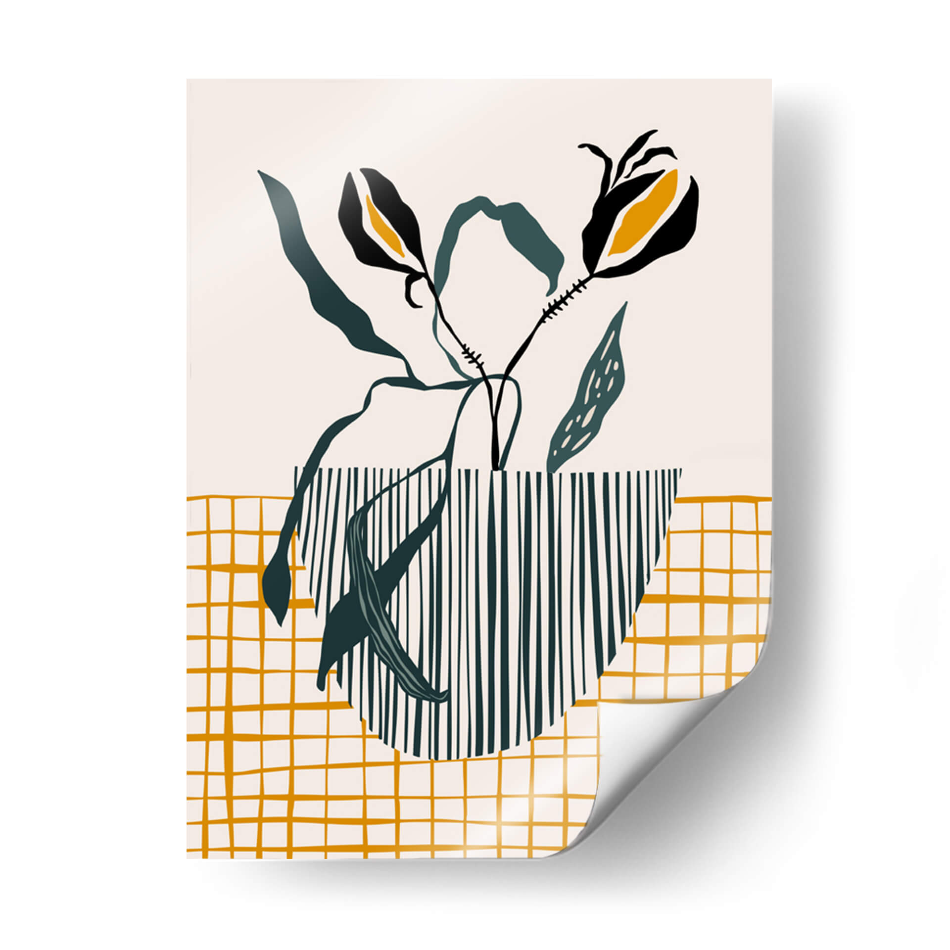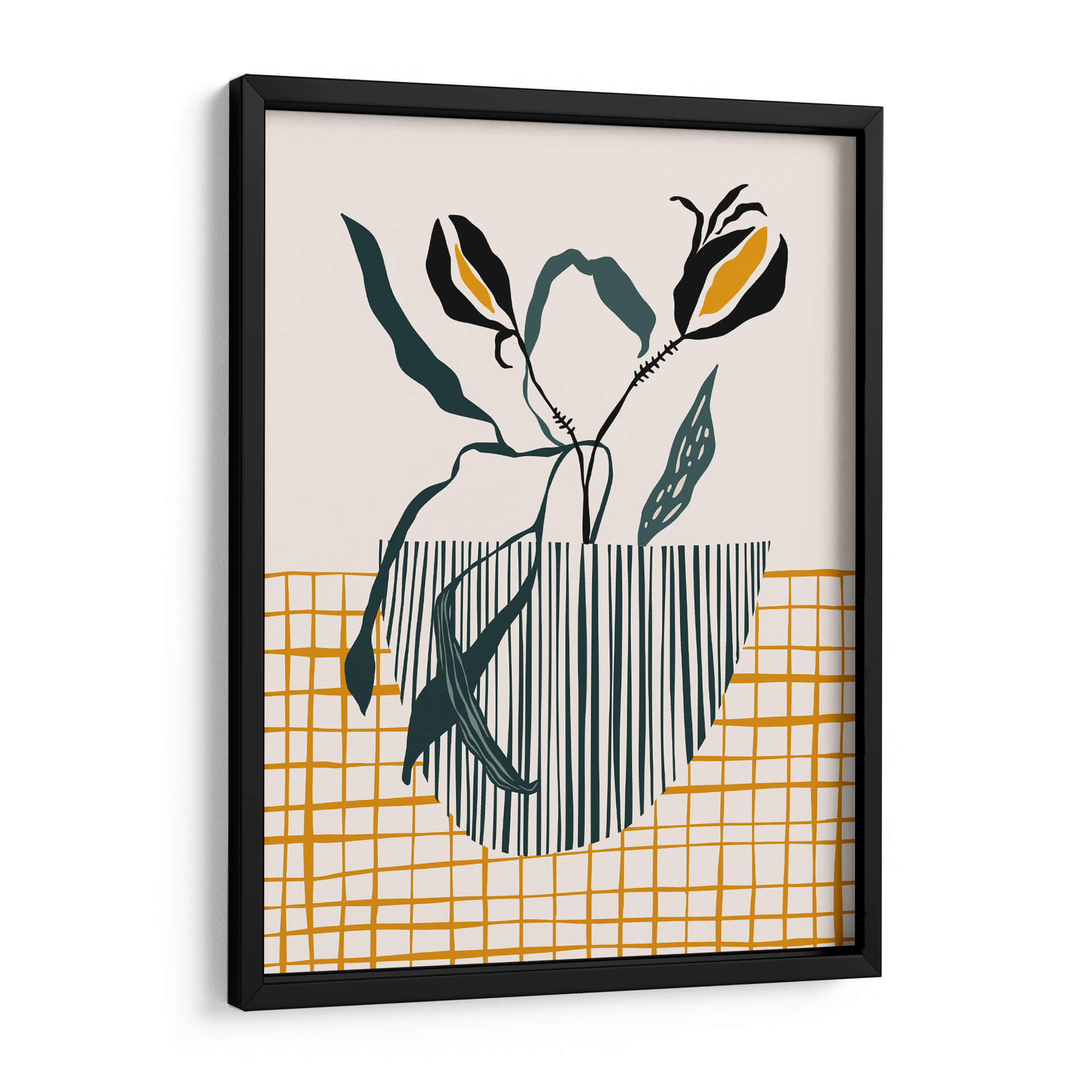 Inyecta un toque de sofisticación escandinava y diseño moderno en tu hogar con este cautivador cuadro decorativo, 'Lámpara de maceta de mediados de siglo'. La obra presenta una composición estilizada de elementos botánicos, con dos flores negras y amarillas que emergen elegantemente de un jarrón rayado en verde oscuro y blanco. El fondo neutro y una cuadrícula dorada texturizada en la parte inferior crean un equilibrio visual armonioso, evocando una sensación de calma y serenidad. El estilo minimalista y la paleta de colores cuidadosamente seleccionada, dominada por el beige, verde oscuro y toques vibrantes de amarillo ocre y negro, hacen de esta pieza una adición versátil para cualquier espacio contemporáneo. Ideal para salones, dormitorios o incluso oficinas, este cuadro decorativo añade un aire de elegancia discreta y un punto de interés artístico sin abrumar. Su diseño abstracto y orgánico se inspira en la estética de mediados de siglo, fusionando la naturaleza con patrones geométricos para crear una atmósfera acogedora y chic. Transforma tus paredes con esta obra de arte única que celebra la simplicidad y el buen gusto.