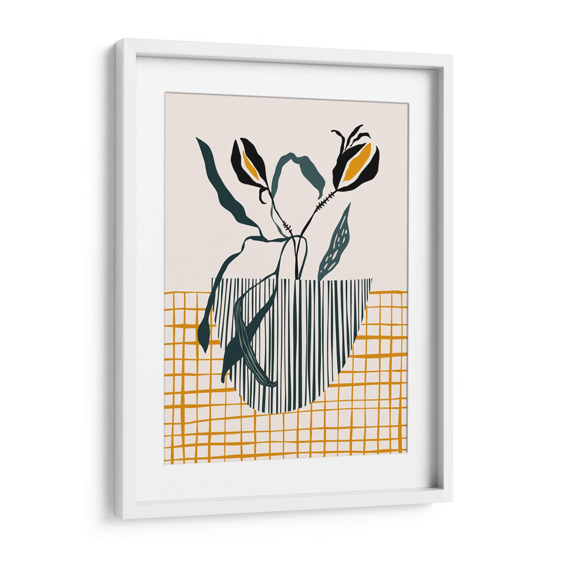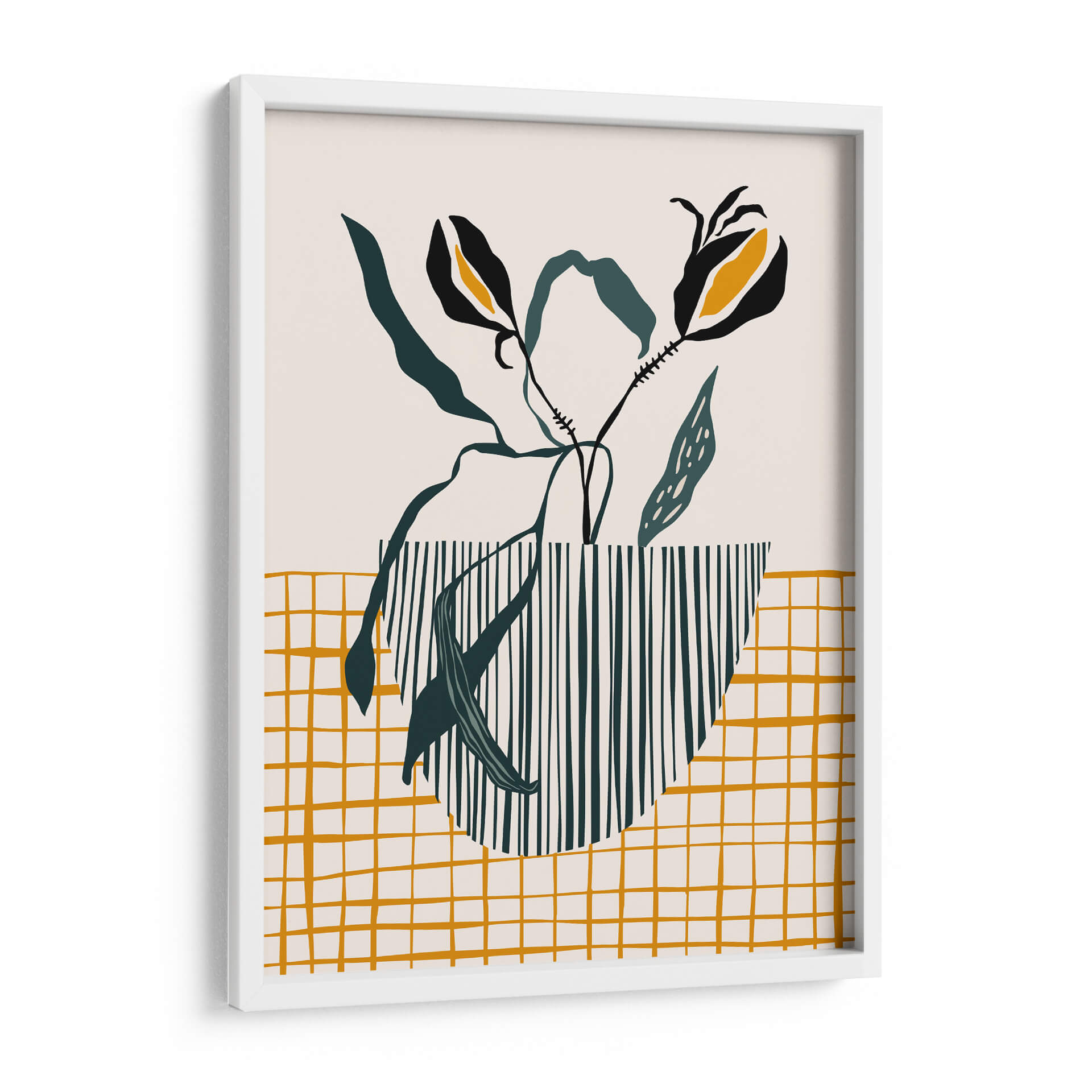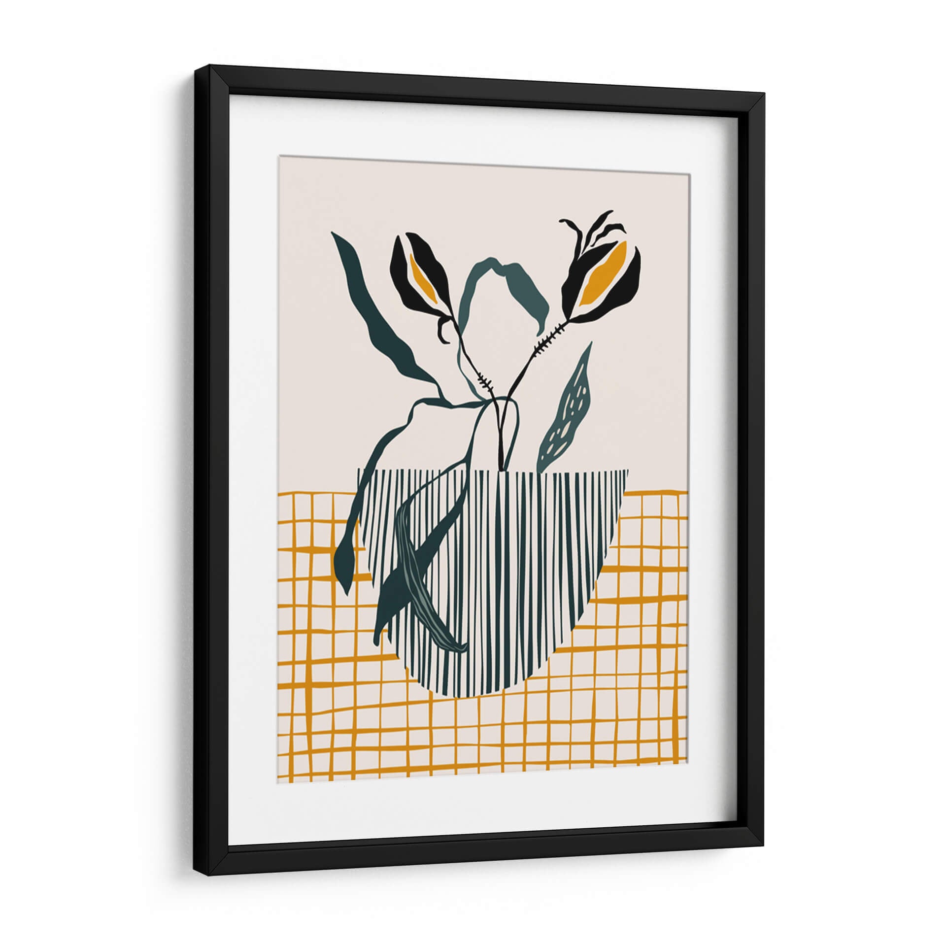 Inyecta un toque de sofisticación escandinava y diseño moderno en tu hogar con este cautivador cuadro decorativo, 'Lámpara de maceta de mediados de siglo'. La obra presenta una composición estilizada de elementos botánicos, con dos flores negras y amarillas que emergen elegantemente de un jarrón rayado en verde oscuro y blanco. El fondo neutro y una cuadrícula dorada texturizada en la parte inferior crean un equilibrio visual armonioso, evocando una sensación de calma y serenidad. El estilo minimalista y la paleta de colores cuidadosamente seleccionada, dominada por el beige, verde oscuro y toques vibrantes de amarillo ocre y negro, hacen de esta pieza una adición versátil para cualquier espacio contemporáneo. Ideal para salones, dormitorios o incluso oficinas, este cuadro decorativo añade un aire de elegancia discreta y un punto de interés artístico sin abrumar. Su diseño abstracto y orgánico se inspira en la estética de mediados de siglo, fusionando la naturaleza con patrones geométricos para crear una atmósfera acogedora y chic. Transforma tus paredes con esta obra de arte única que celebra la simplicidad y el buen gusto.