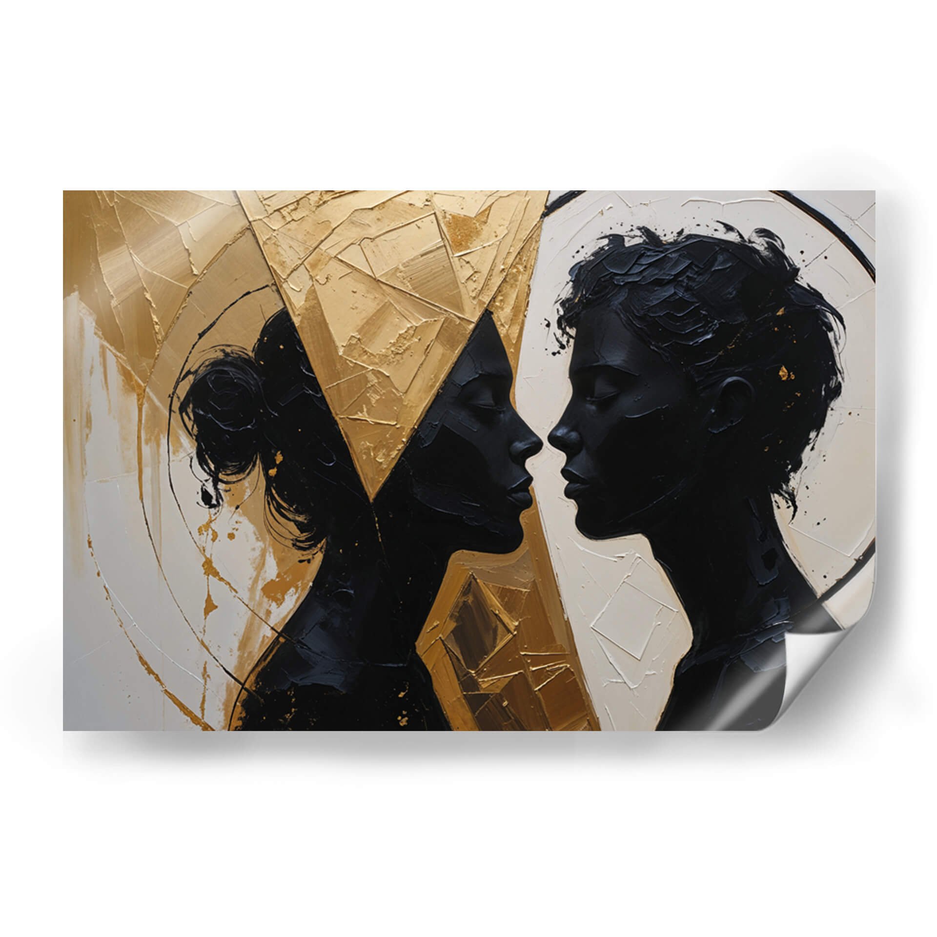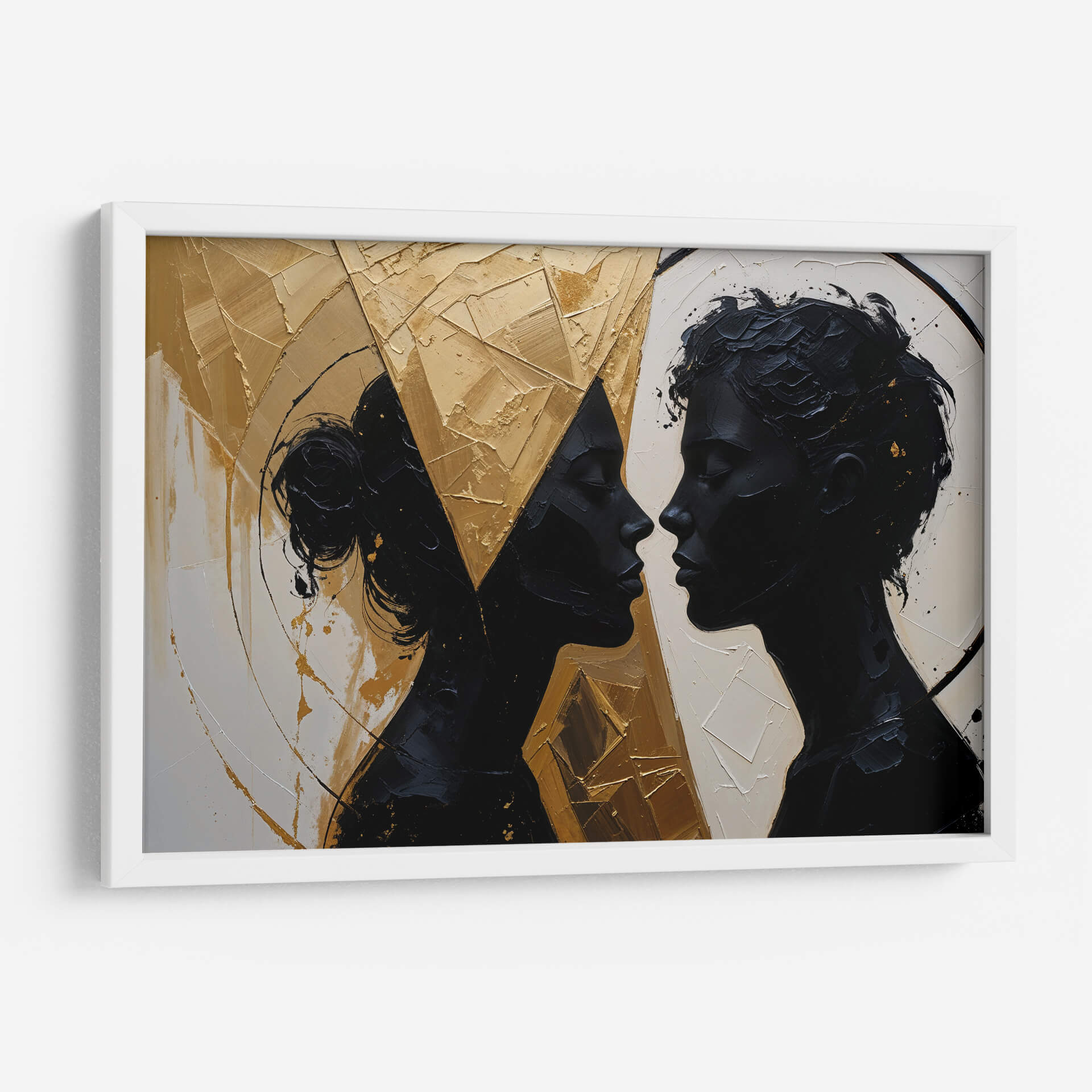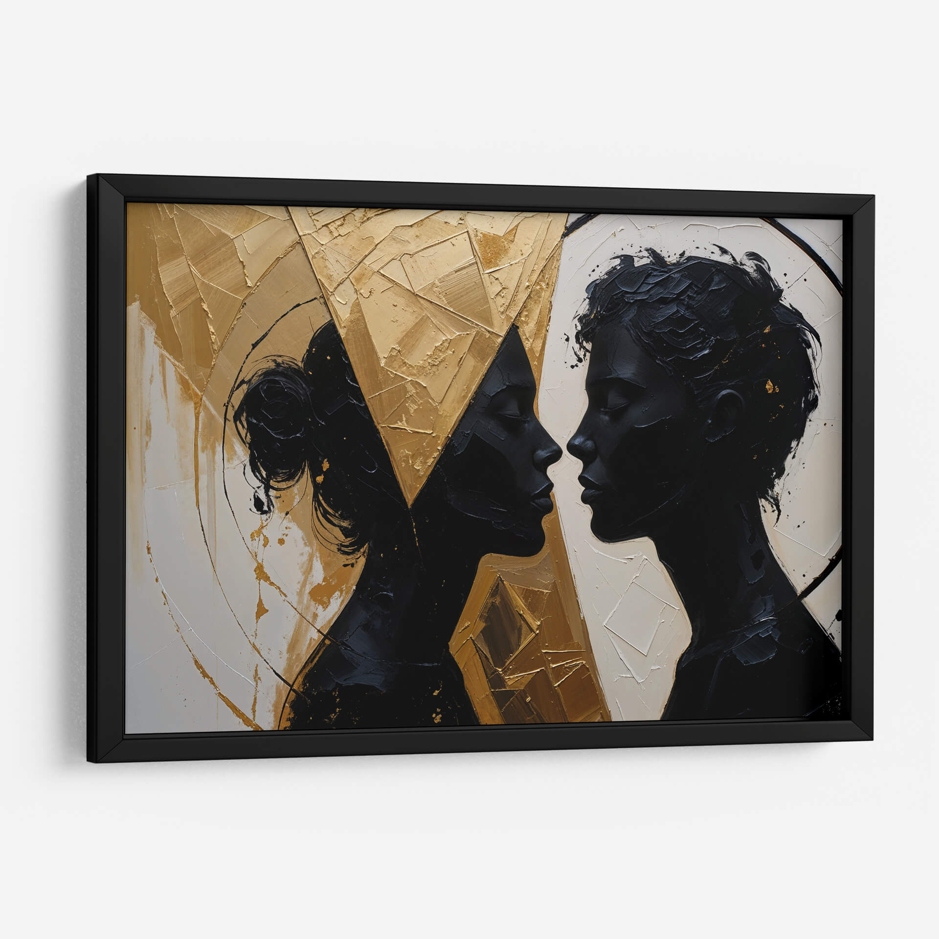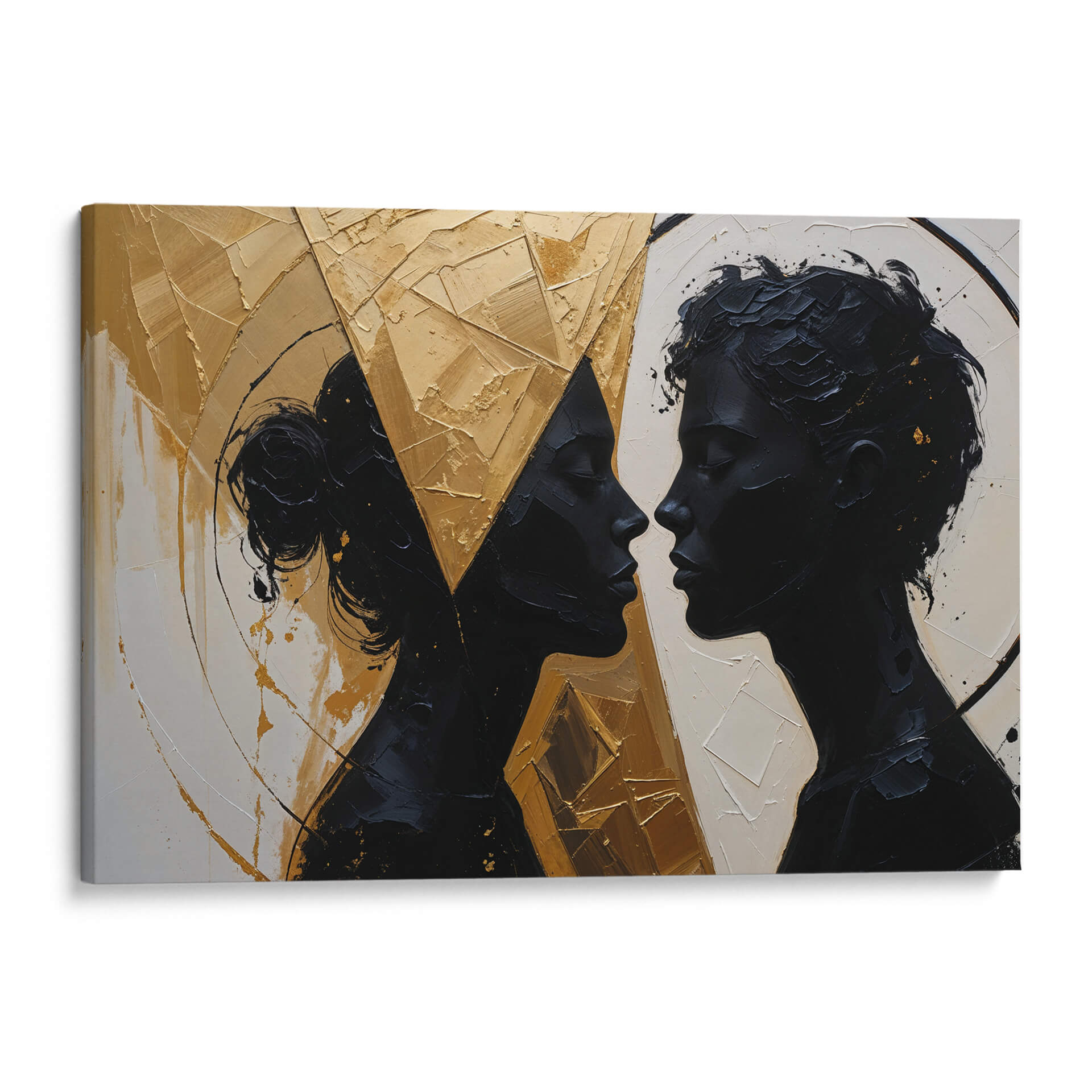 Captura la esencia de la conexión humana con "Nuestro Encuentro", una obra de arte contemporáneo que trasciende las palabras. Las siluetas oscuras de dos perfiles que se miran íntimamente contrastan dramáticamente con un fondo texturizado y vibrante en tonos dorados y ocres. La paleta de colores, dominada por el negro profundo, el blanco crudo y el oro metálico, crea una atmósfera de sofisticación y misterio. El estilo abstracto y la aplicación audaz de la pintura, con empastes que generan relieve y profundidad, invitan a la contemplación de la relación y la energía entre las figuras. Este cuadro decorativo es ideal para añadir un toque de elegancia moderna y un punto focal de conversación a salones, comedores o estudios. Su composición dinámica y la emotividad que evoca, sugiriendo intimidad, unión y una profunda conexión, lo convierten en una pieza versátil que puede complementar tanto espacios minimalistas como decoraciones más audaces. "Nuestro Encuentro" no es solo una imagen, es una invitación a reflexionar sobre las relaciones humanas y la belleza de la intimidad, aportando una dimensión artística única a tu hogar u oficina.