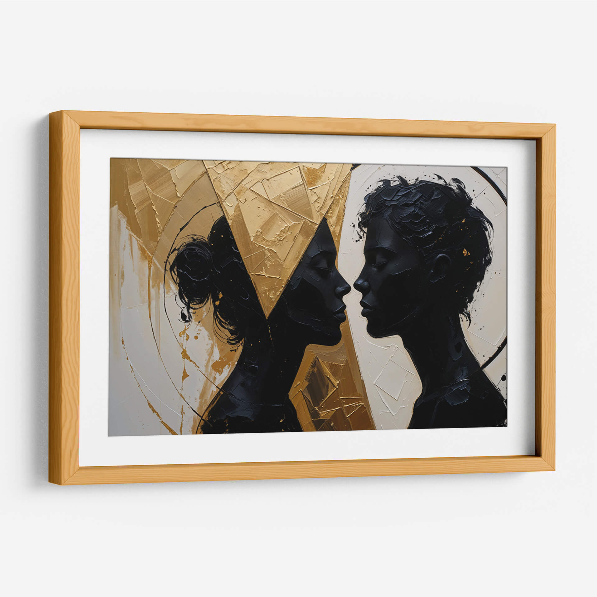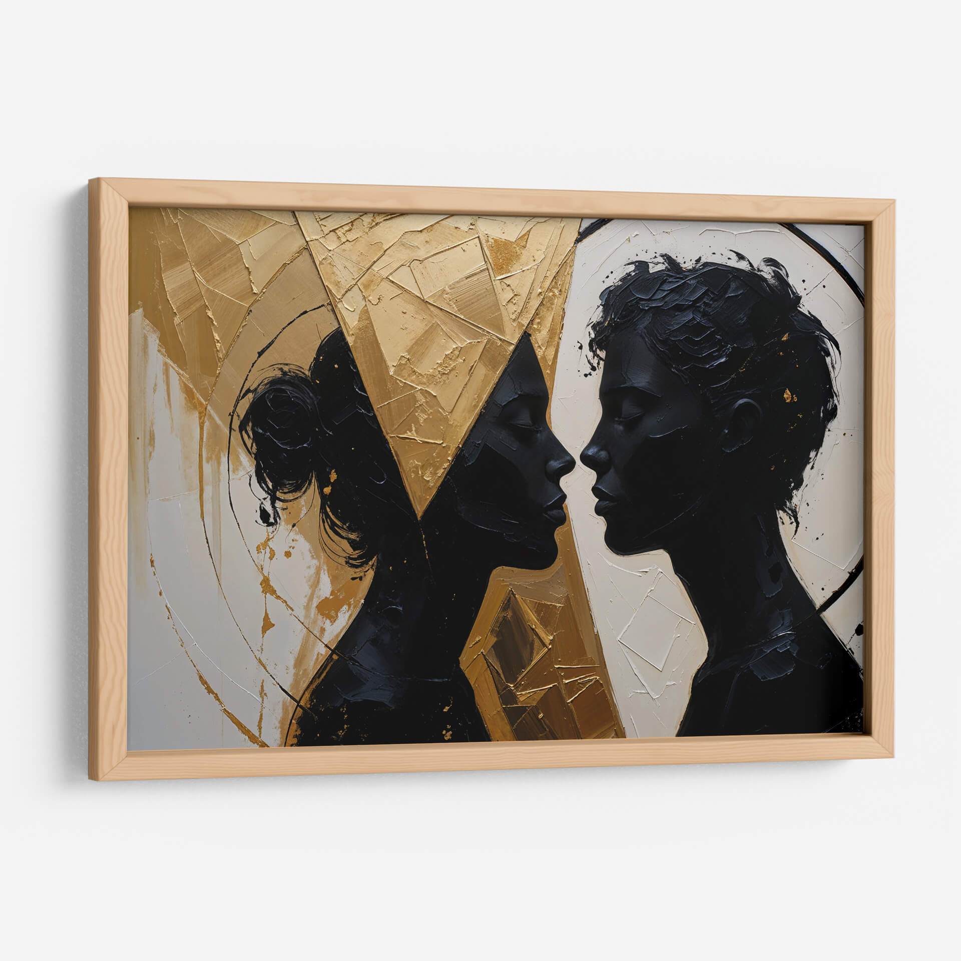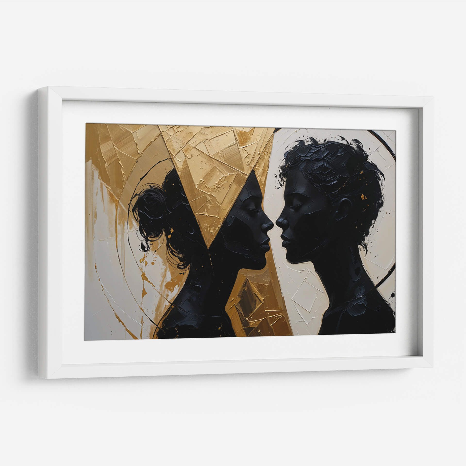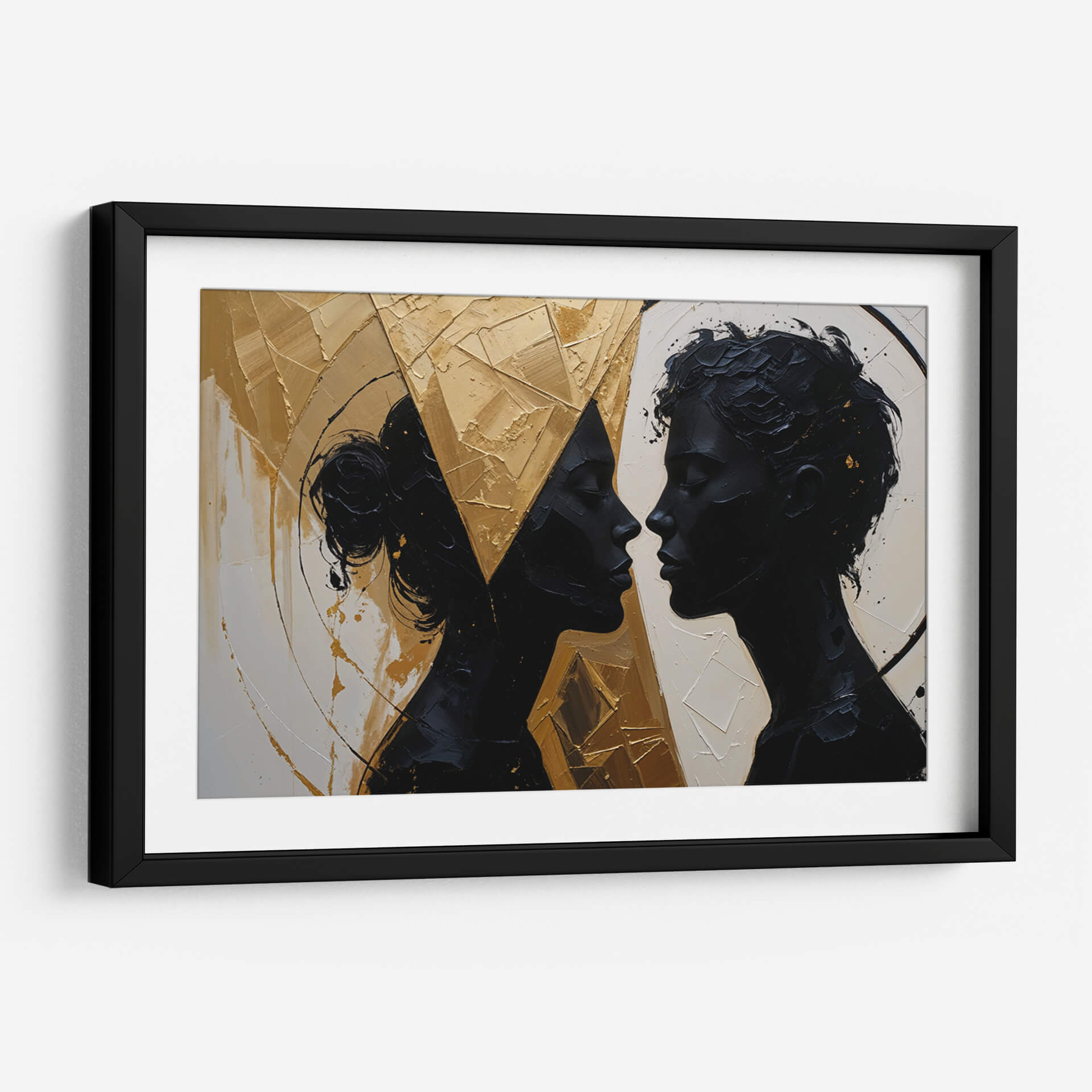 Captura la esencia de la conexión humana con "Nuestro Encuentro", una obra de arte contemporáneo que trasciende las palabras. Las siluetas oscuras de dos perfiles que se miran íntimamente contrastan dramáticamente con un fondo texturizado y vibrante en tonos dorados y ocres. La paleta de colores, dominada por el negro profundo, el blanco crudo y el oro metálico, crea una atmósfera de sofisticación y misterio. El estilo abstracto y la aplicación audaz de la pintura, con empastes que generan relieve y profundidad, invitan a la contemplación de la relación y la energía entre las figuras. Este cuadro decorativo es ideal para añadir un toque de elegancia moderna y un punto focal de conversación a salones, comedores o estudios. Su composición dinámica y la emotividad que evoca, sugiriendo intimidad, unión y una profunda conexión, lo convierten en una pieza versátil que puede complementar tanto espacios minimalistas como decoraciones más audaces. "Nuestro Encuentro" no es solo una imagen, es una invitación a reflexionar sobre las relaciones humanas y la belleza de la intimidad, aportando una dimensión artística única a tu hogar u oficina.