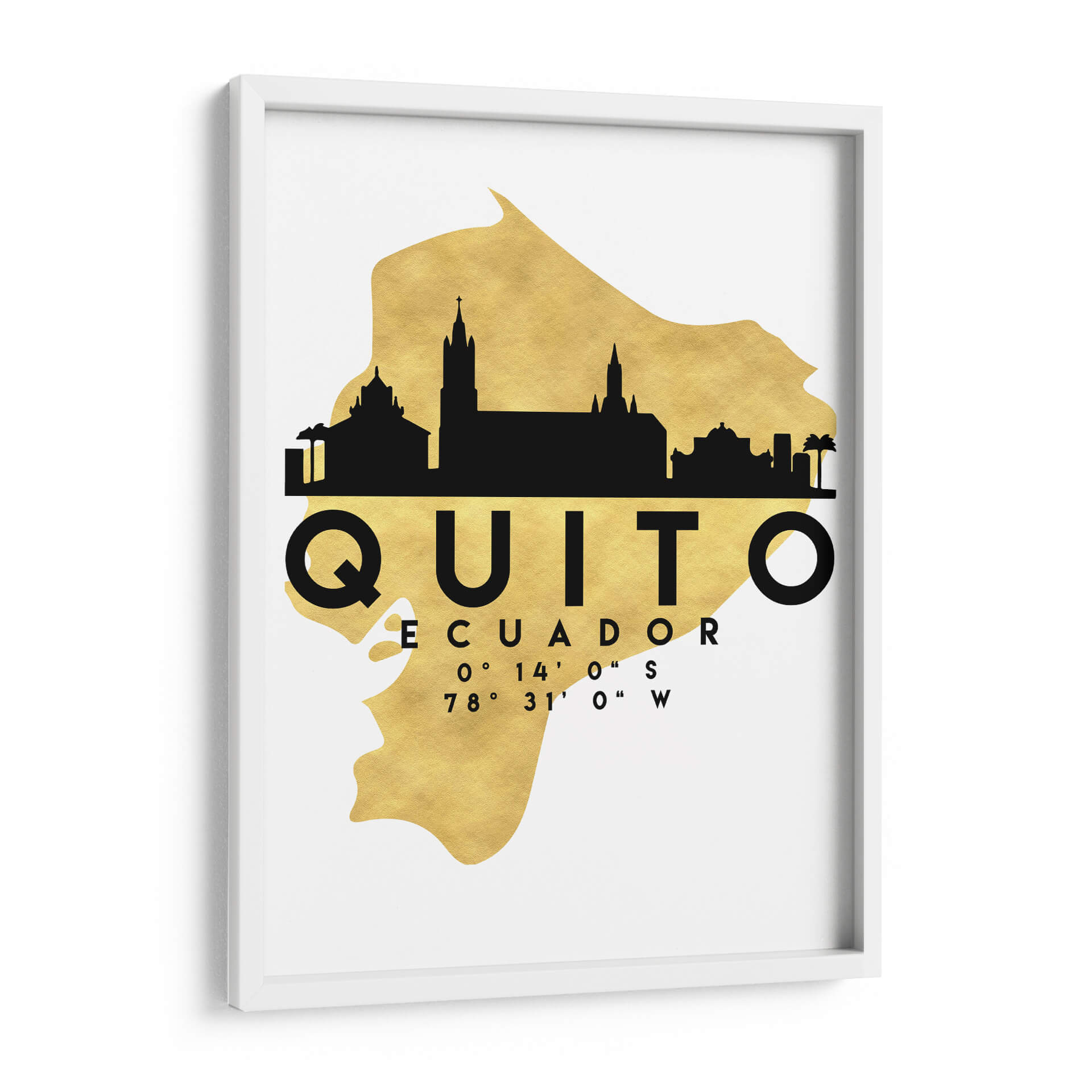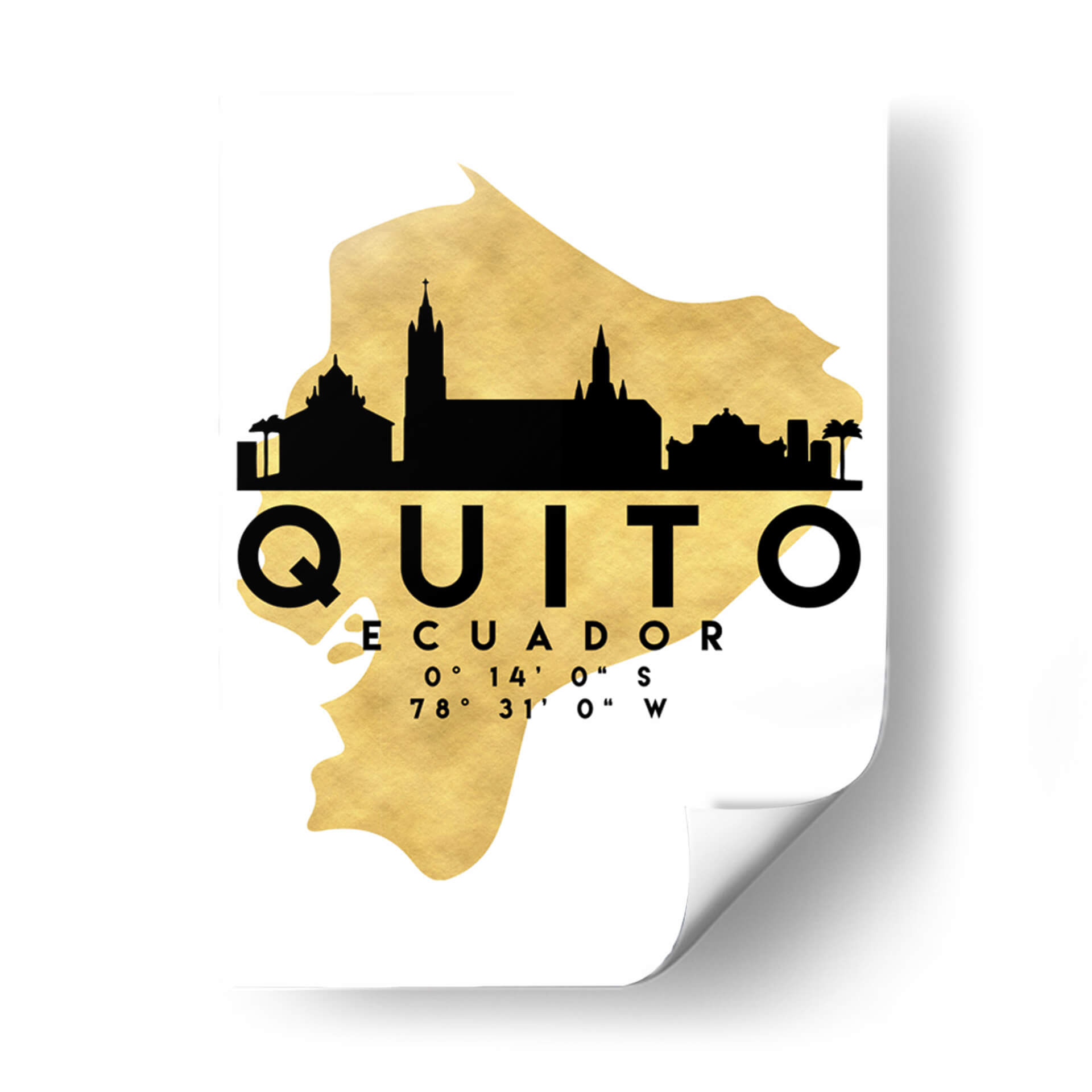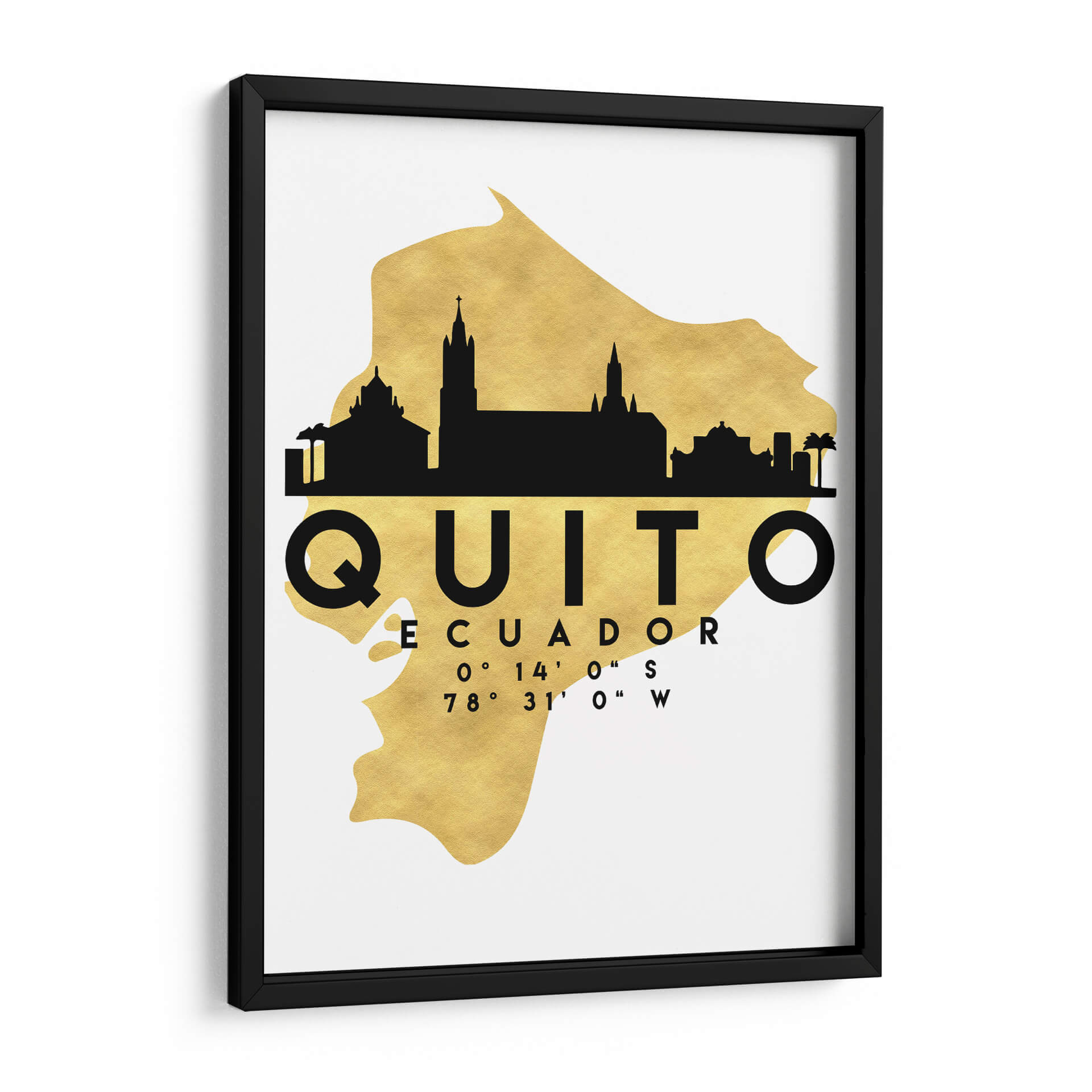Captura la esencia de la capital ecuatoriana con este impactante cuadro decorativo "Quito - 0028 ciudad" del artista Emiliano Deificus. La obra presenta una silueta urbana moderna y elegante de Quito, superpuesta sobre un fondo texturizado de hoja de oro que evoca lujo y sofisticación. Los icónicos edificios de la ciudad se dibujan en un audaz negro, contrastando con el brillo cálido y vibrante del dorado, creando una pieza visualmente cautivadora. El nombre de la ciudad, "QUITO", junto con sus coordenadas geográficas, añade un toque personal y de conexión, ideal para aquellos que guardan un cariño especial por esta metrópoli andina. Este diseño minimalista y contemporáneo es perfecto para añadir un toque de estilo y distinción a cualquier espacio, ya sea en un hogar, una oficina o un estudio. Su paleta de colores, centrada en el contraste entre el negro y el dorado, lo convierte en una adición versátil que complementará una variedad de estilos decorativos, desde el moderno hasta el ecléctico. "Quito - 0028 ciudad" no es solo una decoración de pared, es una celebración de la identidad y la belleza de una de las capitales más altas del mundo, invitando a la reflexión y al orgullo.