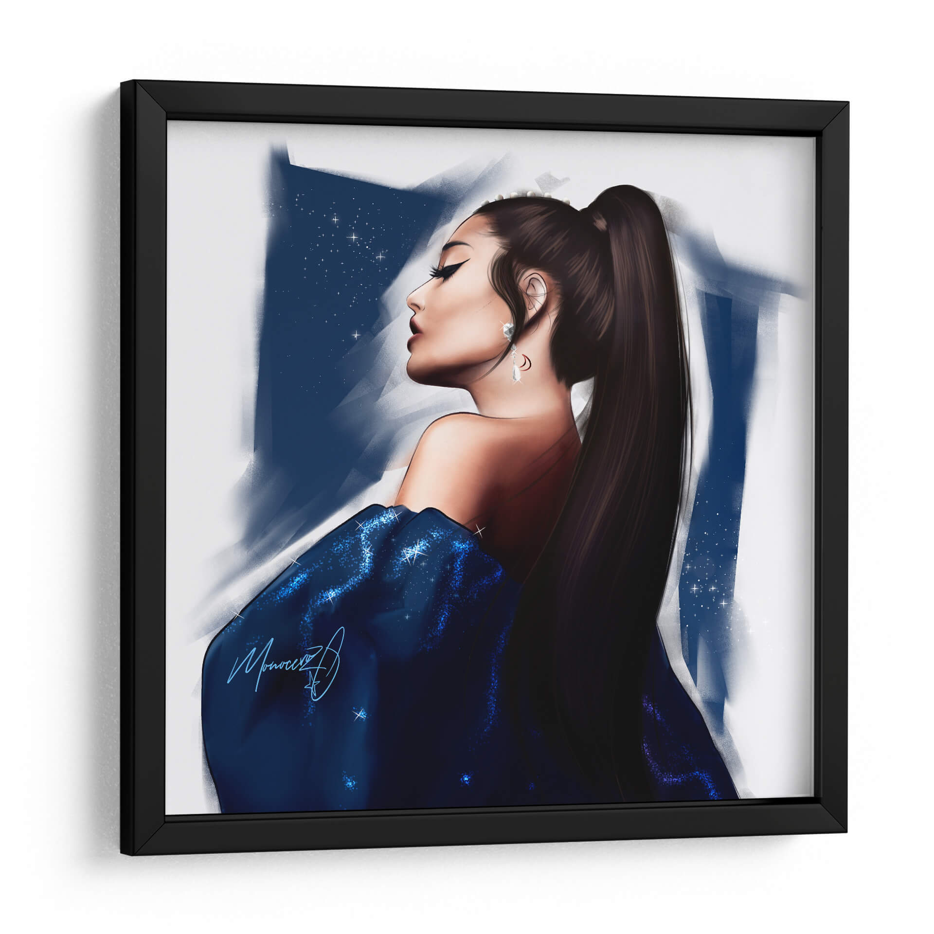 Sumérgete en la enigmática belleza de "Ariana Space" de Monoceroz, una obra de arte digital que captura la esencia de la introspección y la elegancia cósmica. Esta pieza presenta un retrato estilizado de una figura femenina, vista de perfil, envuelta en un vibrante vestido azul con destellos que evocan un cielo estrellado. La paleta de colores, dominada por profundos tonos de azul y contrastes de luz, crea una atmósfera de misterio y sofisticación. El trazo suelto y expresivo del artista, combinado con la composición enfocada en el rostro sereno y el detallado peinado recogido, invita a la contemplación. "Ariana Space" es ideal para añadir un toque de glamour celestial y profundidad a cualquier espacio moderno, ya sea una sala de estar contemporánea, un dormitorio íntimo o una oficina inspiradora. Su estilo único fusiona el retrato con elementos abstractos, resultando en una pieza que es a la vez cautivadora y conmovedora, perfecta para quienes aprecian el arte que combina la belleza humana con la inmensidad del universo.