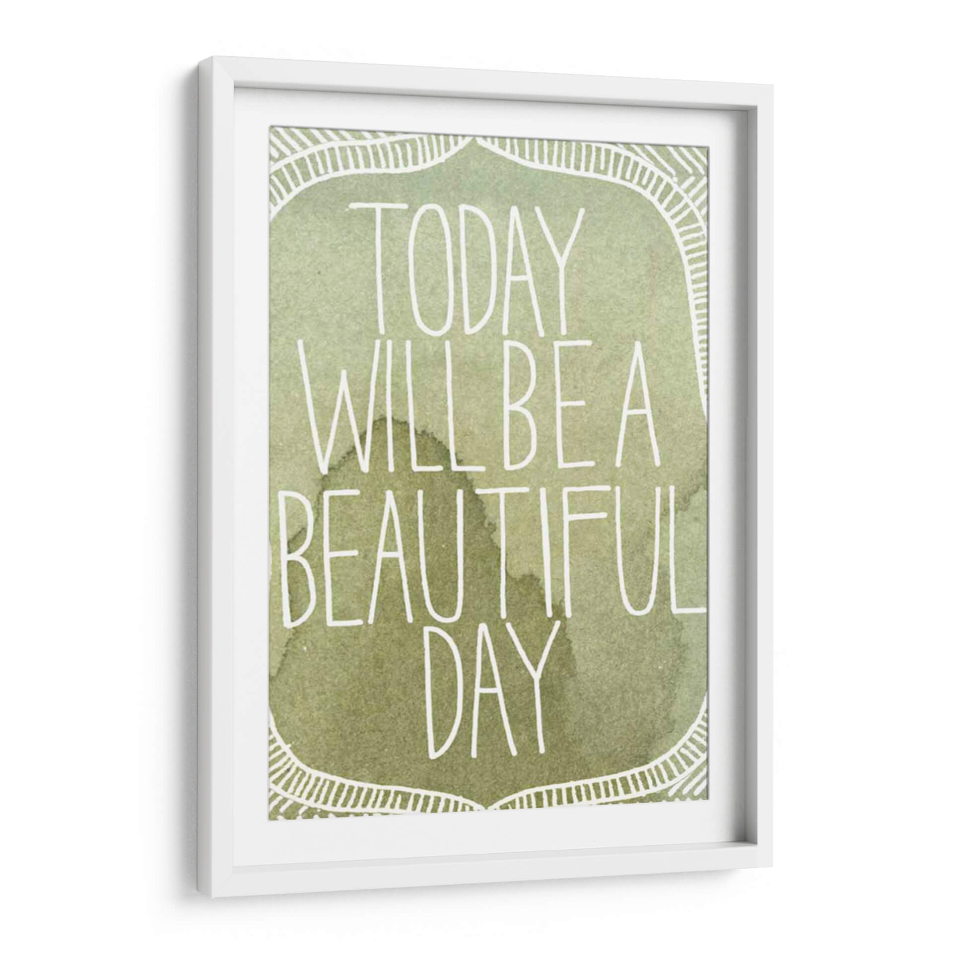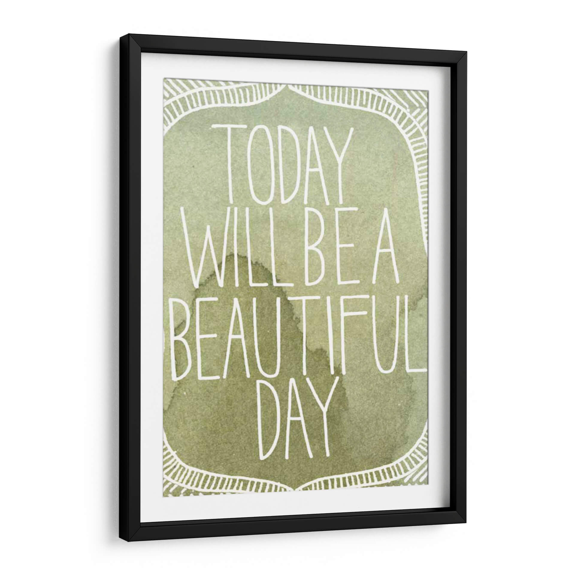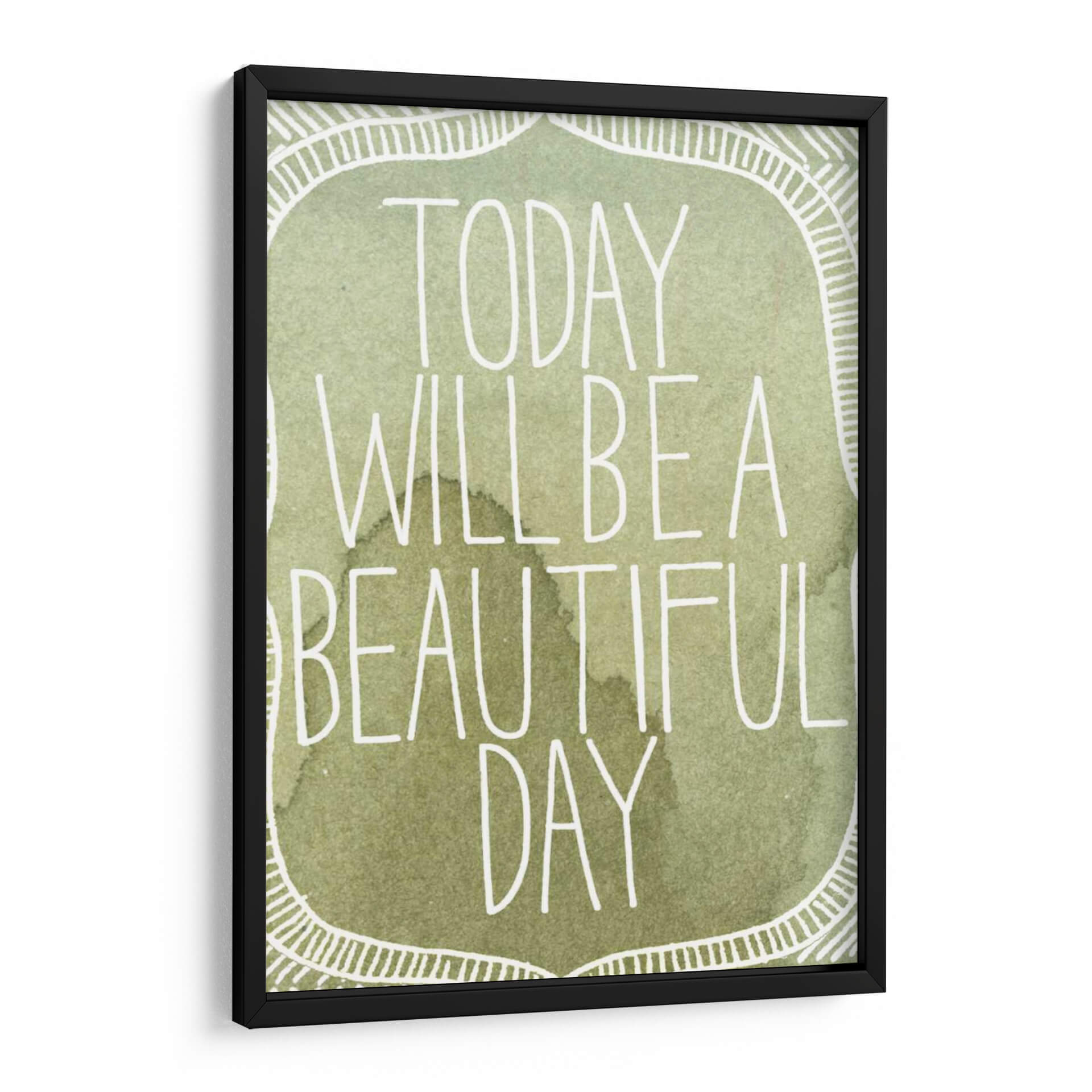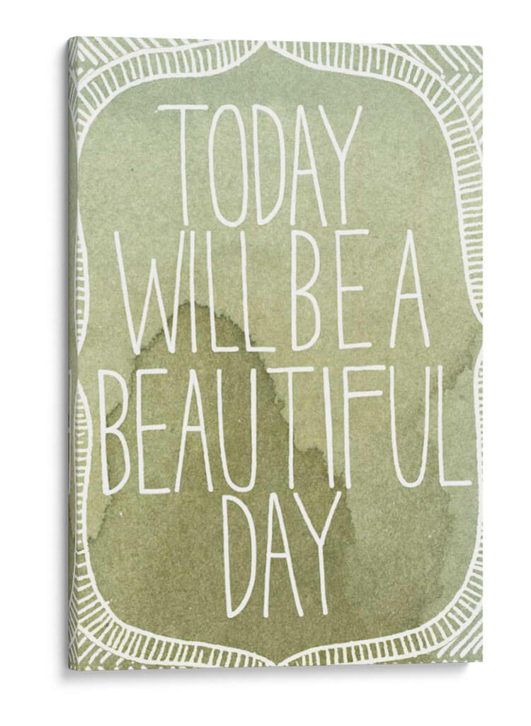 Transforma tu espacio con el inspirador cuadro decorativo "Acuarelas Inspiradas II" de Grace Popp. Esta cautivadora obra presenta una paleta de colores suaves y terrosos, dominada por tonos verdes y marrones que evocan la serenidad de la naturaleza. La frase "Today will be a beautiful day" se despliega en una tipografía blanca y estilizada, añadiendo un toque de optimismo y positividad. El diseño incorpora un delicado borde decorativo con motivos lineales que enmarcan el mensaje principal, creando una composición equilibrada y armoniosa. El estilo acuarela, con sus sutiles matices y texturas fluidas, aporta una sensación de calma y ligereza. Este cuadro es ideal para infundir tranquilidad en tu dormitorio, un ambiente inspirador en tu oficina, o como un punto focal de serenidad en tu sala de estar. Añade un toque de arte contemporáneo y mensajes edificantes a tu hogar con esta pieza única. Su diseño versátil se adapta a diversos estilos decorativos, desde el moderno hasta el bohemio.