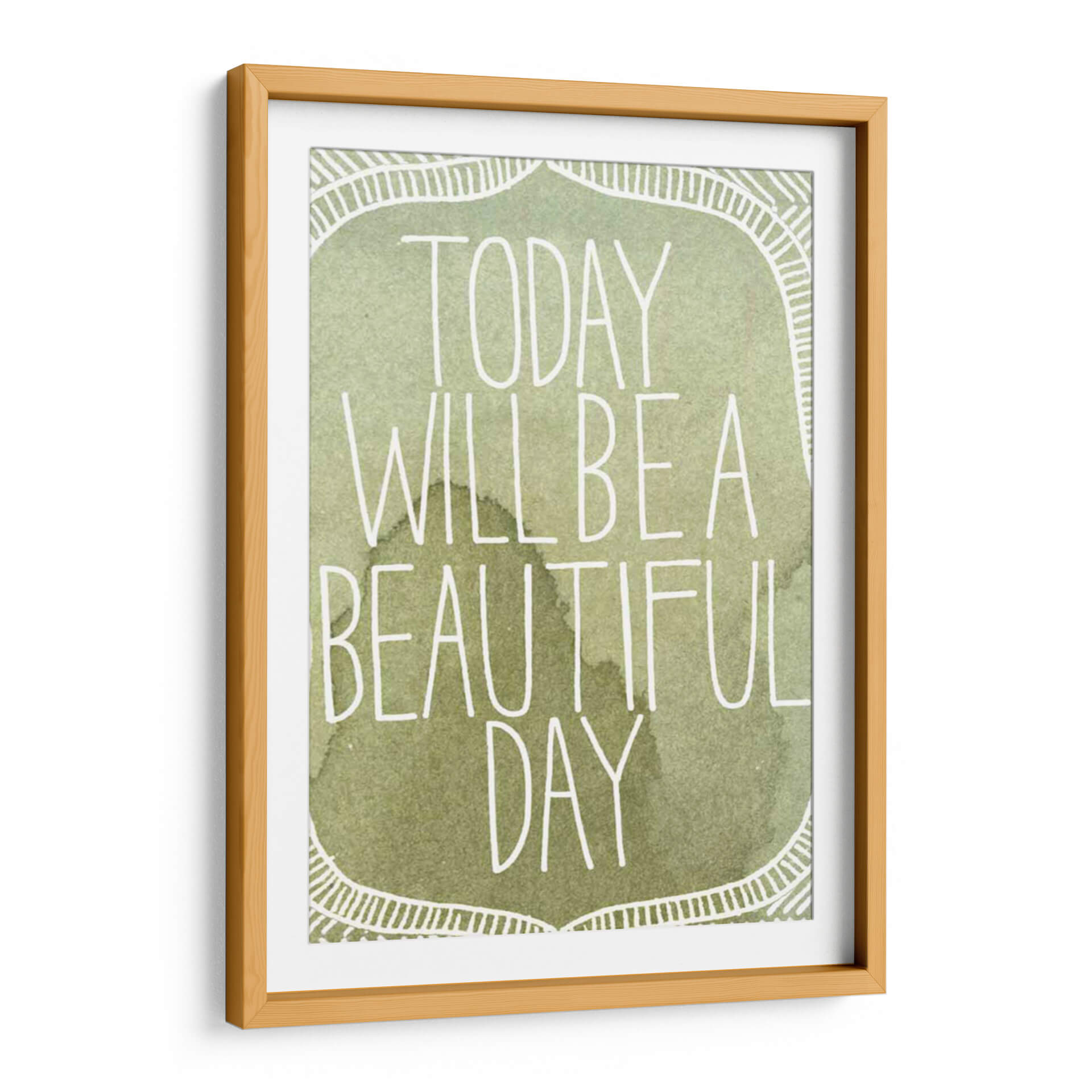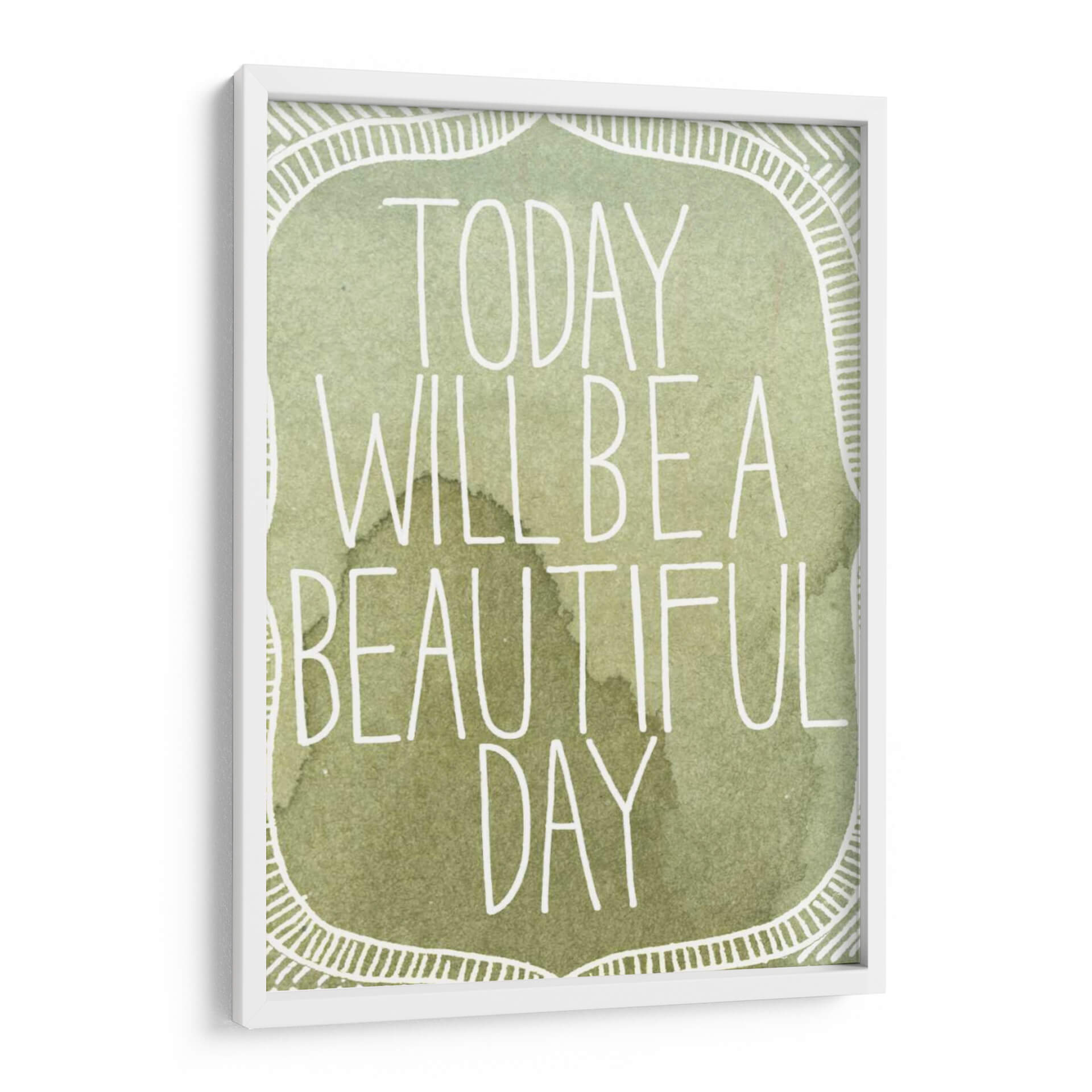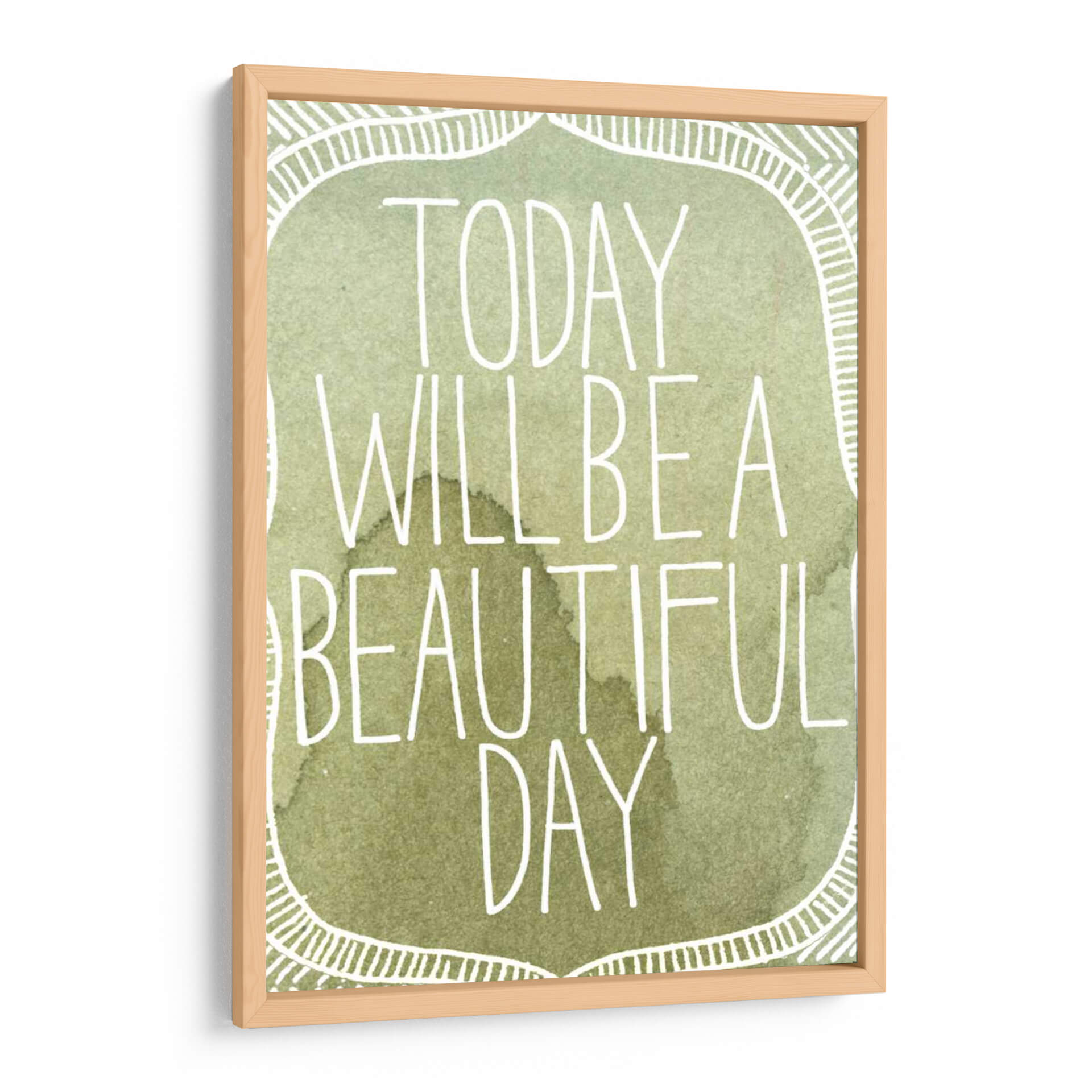 Transforma tu espacio con el inspirador cuadro decorativo "Acuarelas Inspiradas II" de Grace Popp. Esta cautivadora obra presenta una paleta de colores suaves y terrosos, dominada por tonos verdes y marrones que evocan la serenidad de la naturaleza. La frase "Today will be a beautiful day" se despliega en una tipografía blanca y estilizada, añadiendo un toque de optimismo y positividad. El diseño incorpora un delicado borde decorativo con motivos lineales que enmarcan el mensaje principal, creando una composición equilibrada y armoniosa. El estilo acuarela, con sus sutiles matices y texturas fluidas, aporta una sensación de calma y ligereza. Este cuadro es ideal para infundir tranquilidad en tu dormitorio, un ambiente inspirador en tu oficina, o como un punto focal de serenidad en tu sala de estar. Añade un toque de arte contemporáneo y mensajes edificantes a tu hogar con esta pieza única. Su diseño versátil se adapta a diversos estilos decorativos, desde el moderno hasta el bohemio.