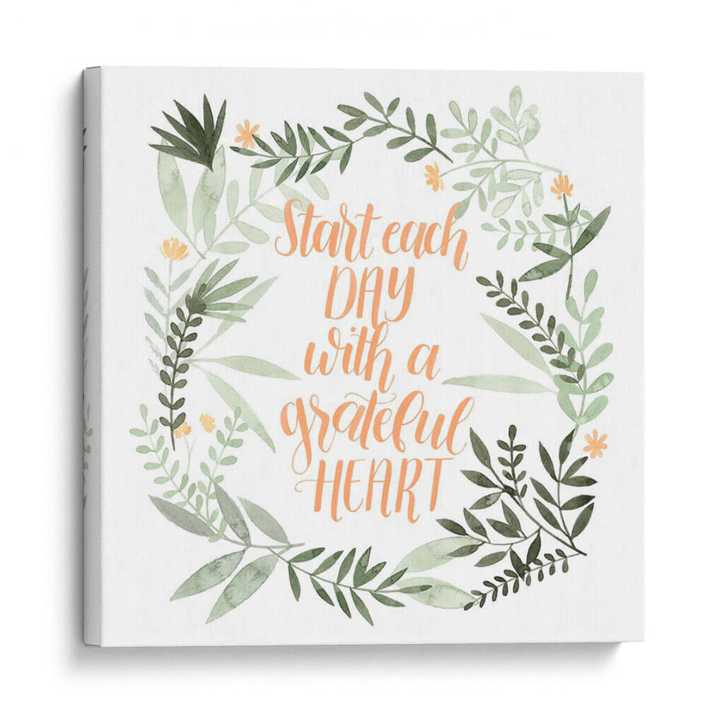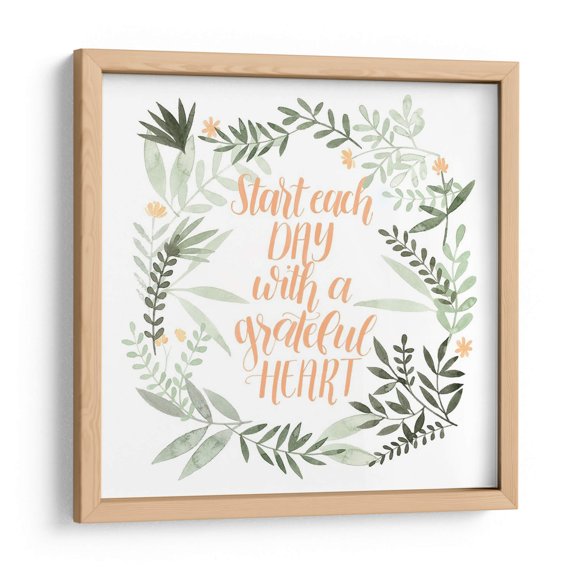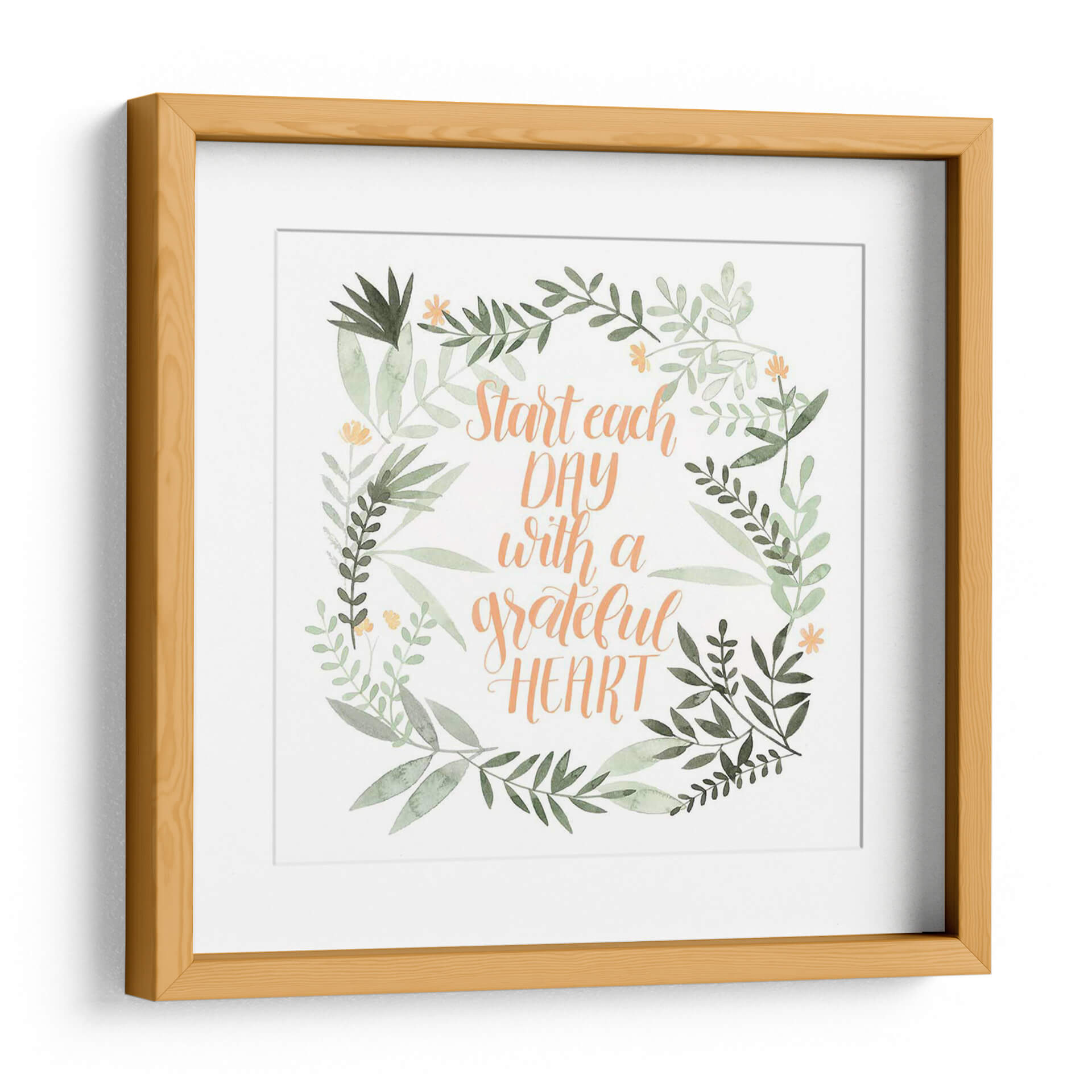 Inspira tus mañanas y transforma tus espacios con "Agradecido I", una obra de arte de Grace Popp que irradia positividad. Este cuadro decorativo presenta una delicada guirnalda de hojas verdes y pequeñas flores en tonos pastel que rodean una cita inspiradora en caligrafía naranja vibrante: "Start each DAY with a grateful HEART". La combinación de acuarela suave y tipografía expresiva crea una atmósfera de calma y optimismo, perfecta para iniciar el día con la actitud correcta. Su estilo botánico moderno y su mensaje edificante lo convierten en una adición encantadora para cualquier hogar u oficina. Imagina este cuadro aportando serenidad a tu dormitorio, energía positiva a tu sala de estar o un toque de motivación a tu espacio de trabajo. "Agradecido I" no es solo una pieza decorativa, sino un recordatorio diario de la importancia de la gratitud, diseñado para resonar con tu estilo de vida y embellecer tu entorno con su belleza sutil y su mensaje poderoso. Ideal para quienes buscan arte que inspire y eleve el espíritu.