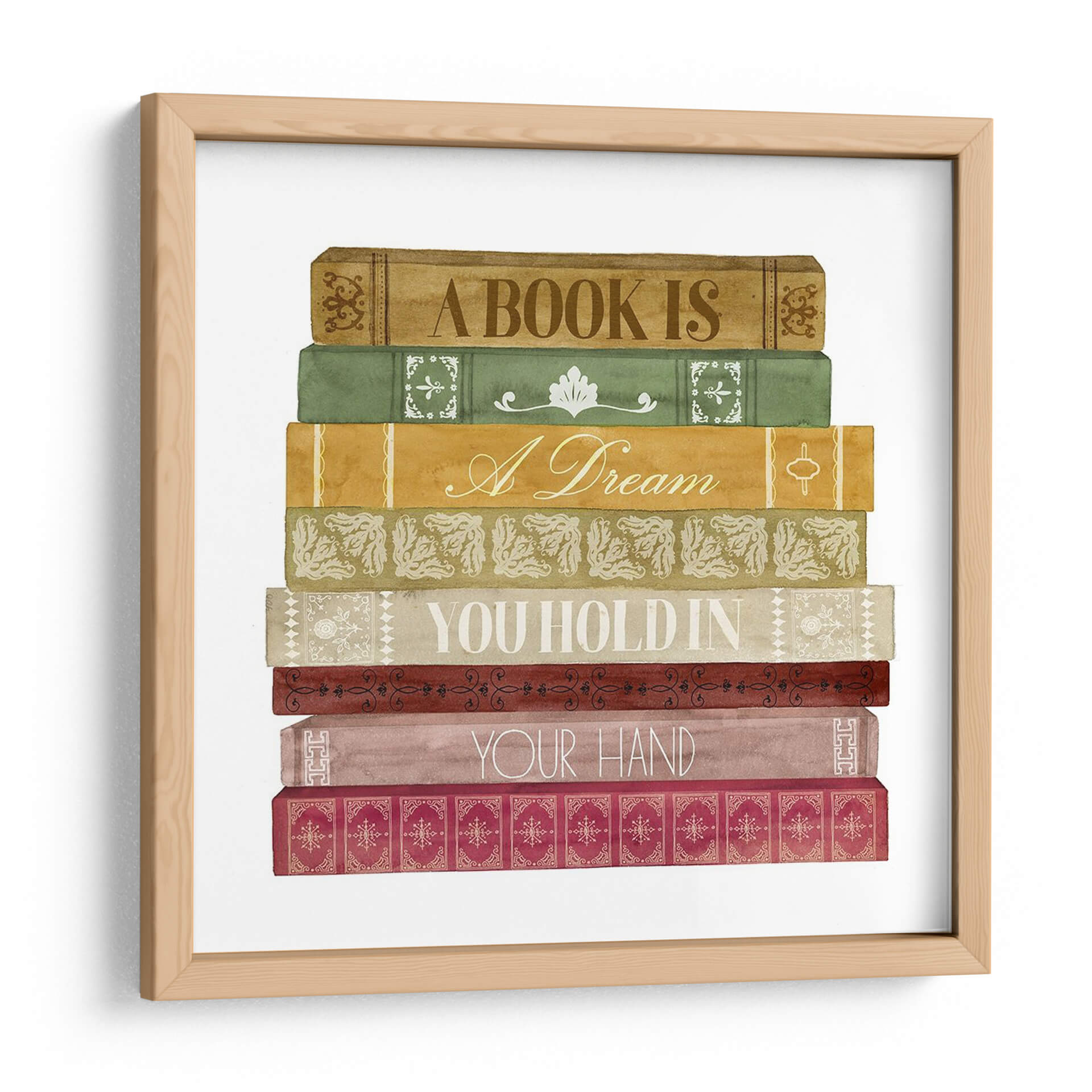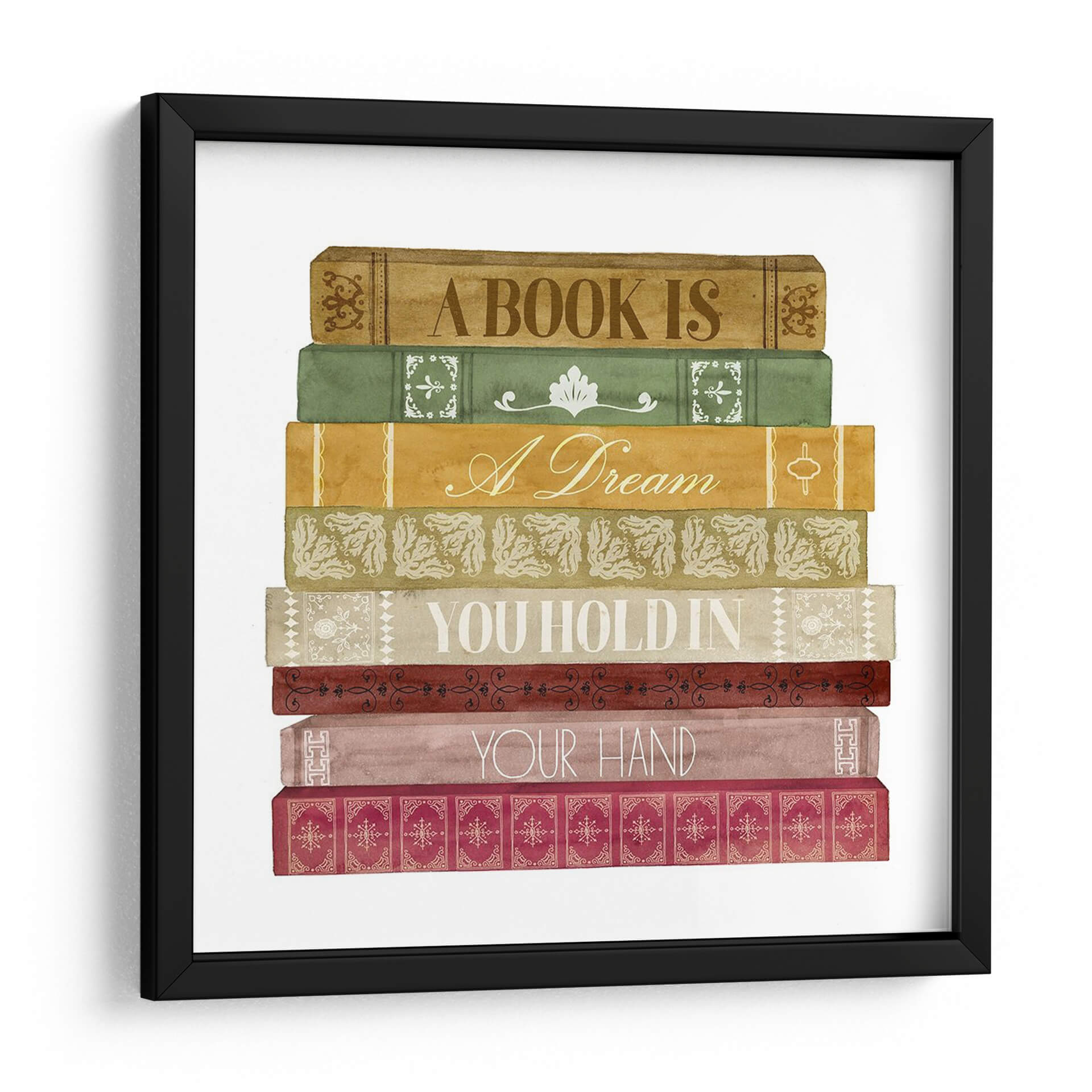 Sumérgete en el mundo de la lectura y la imaginación con "Amante De Libros I", una obra de arte única de Grace Popp. Este cautivador cuadro decorativo presenta una pila de libros antiguos, cada uno con un diseño distintivo y colores cálidos que evocan nostalgia y sabiduría. Las tapas de los libros están adornadas con detalles intrincados y citas inspiradoras que celebran el poder de las historias y los sueños. "A BOOK IS A Dream", "YOU HOLD IN YOUR HAND" son fragmentos que invitan a la reflexión y a la conexión con el placer de la lectura. La paleta de colores, que abarca tonos tierra, verdes y ocres, crea una atmósfera acogedora y sofisticada, perfecta para cualquier espacio que busque un toque de cultura y calidez. Ideal para bibliotecas personales, estudios, oficinas o cualquier rincón donde el conocimiento y la fantasía se encuentren. Este cuadro no solo decora, sino que también inspira y transporta, convirtiéndose en un punto focal lleno de significado para amantes de los libros y del arte.