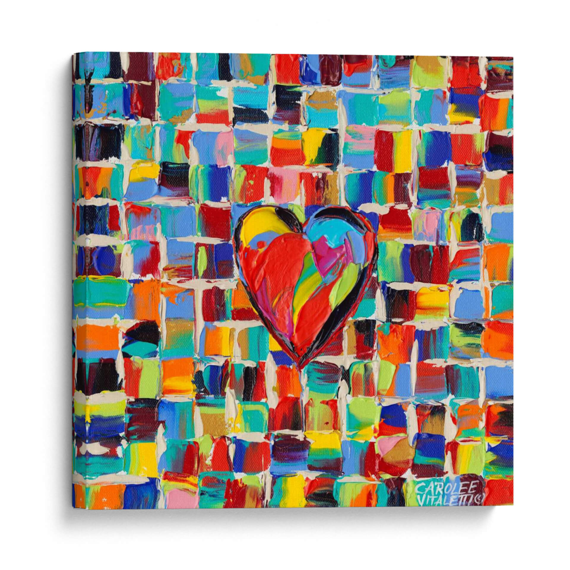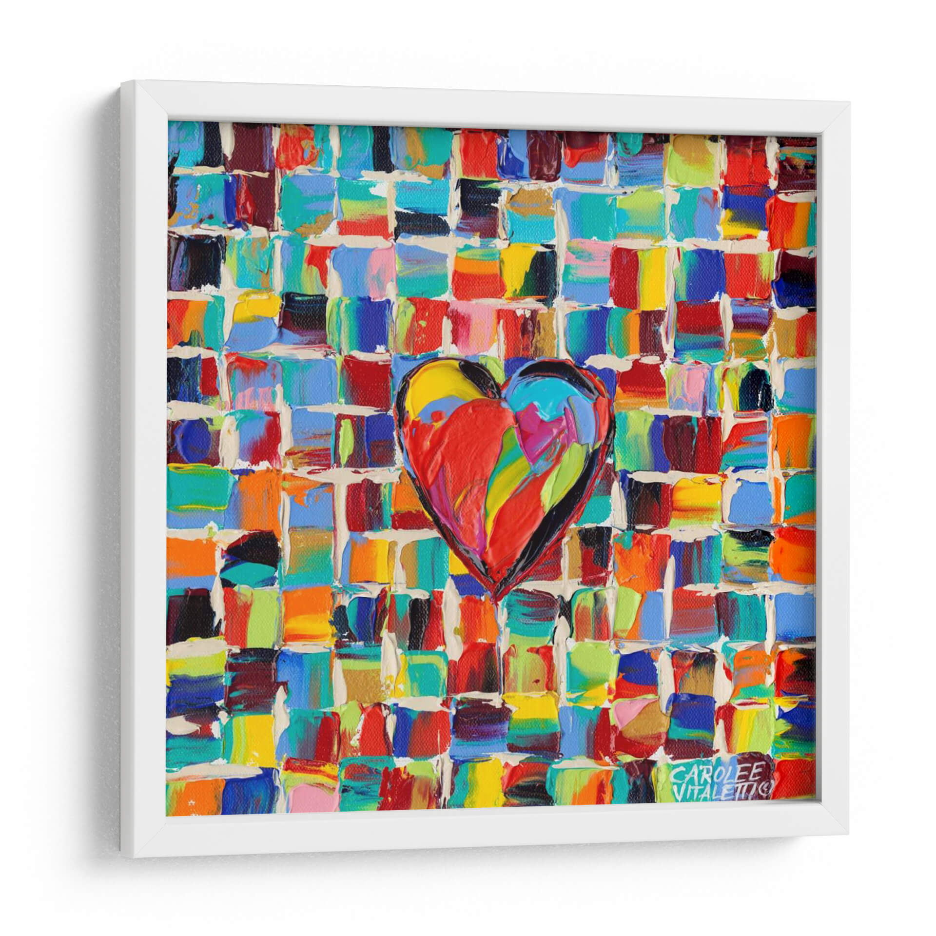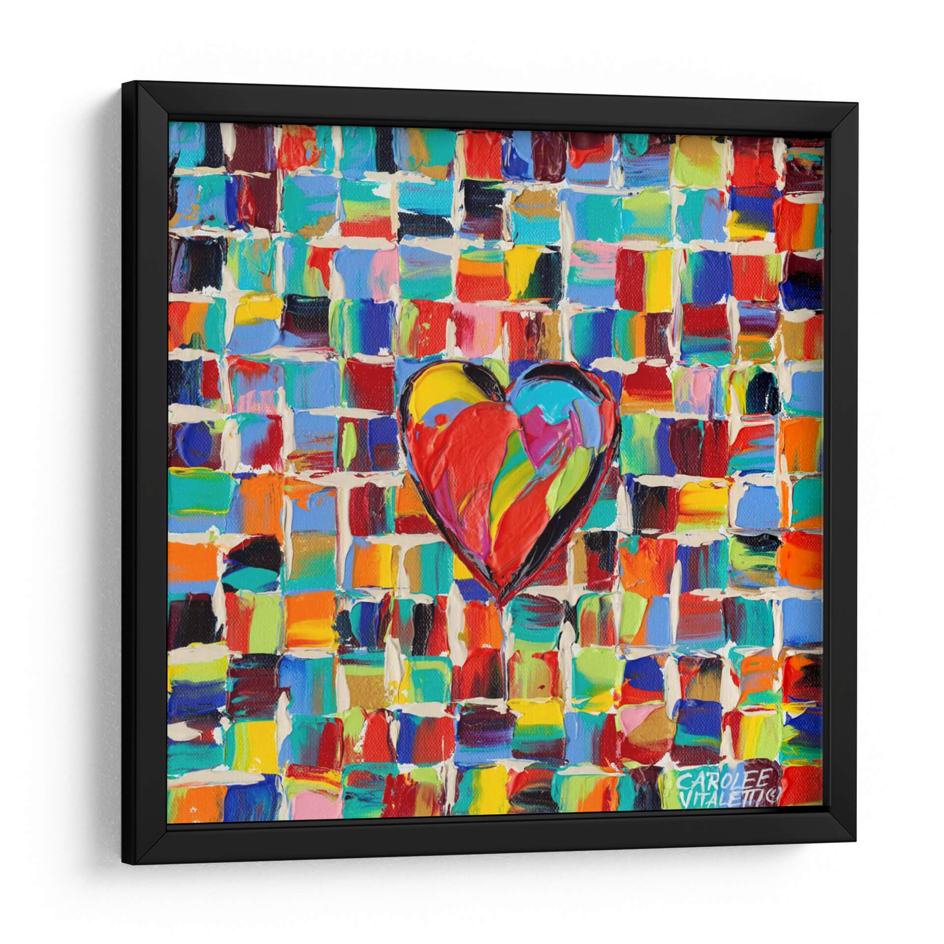 Sumérgete en la explosión de color y emoción con 'Amor Al Color I', una obra de arte contemporáneo que captura la esencia vibrante de la vida. Esta pieza presenta un corazón central, pintado con pinceladas audaces y llenas de textura, que irradia energía y pasión. El fondo, compuesto por un mosaico de pequeños cuadrados de colores intensos y variados —desde rojos ardientes y azules profundos hasta amarillos brillantes y verdes alegres—, crea un efecto dinámico y cautivador. La técnica de pintura aplicada genera una profundidad visual que invita a la contemplación, haciendo que cada detalle sea una nueva sorpresa. Ideal para quienes buscan infundir alegría y vitalidad en su hogar u oficina, este cuadro decorativo es un punto focal que no pasará desapercibido. Su estilo abstracto moderno y su alegre paleta cromática lo convierten en la elección perfecta para salones, comedores o estudios que desean un toque de optimismo y estilo único. 'Amor Al Color I' no es solo una decoración, es una declaración de amor al arte y a la vida misma, un recordatorio constante de la belleza que nos rodea. Añade esta pieza a tu colección y deja que su energía positiva transforme tu espacio.