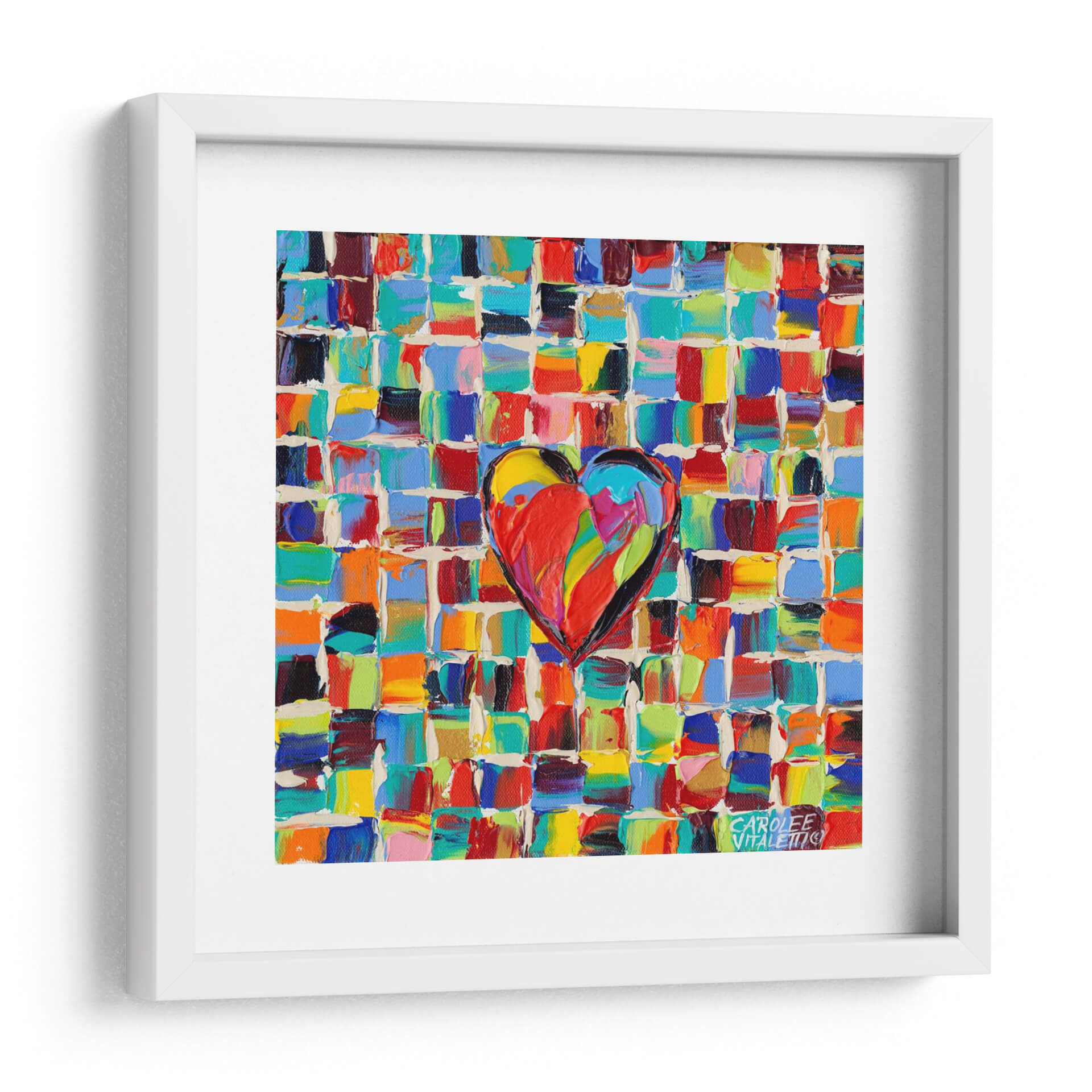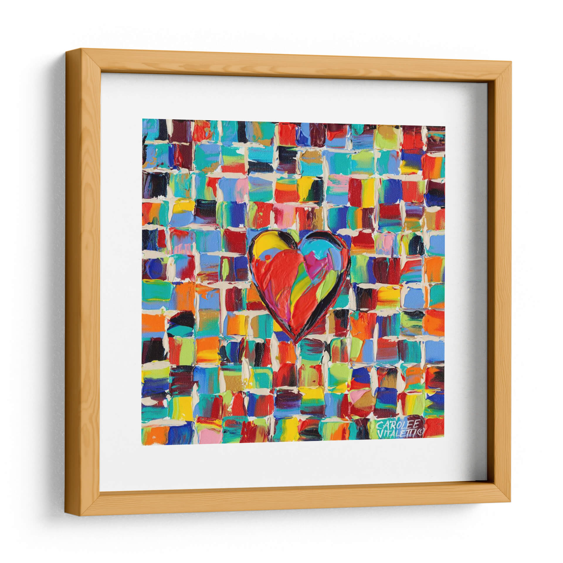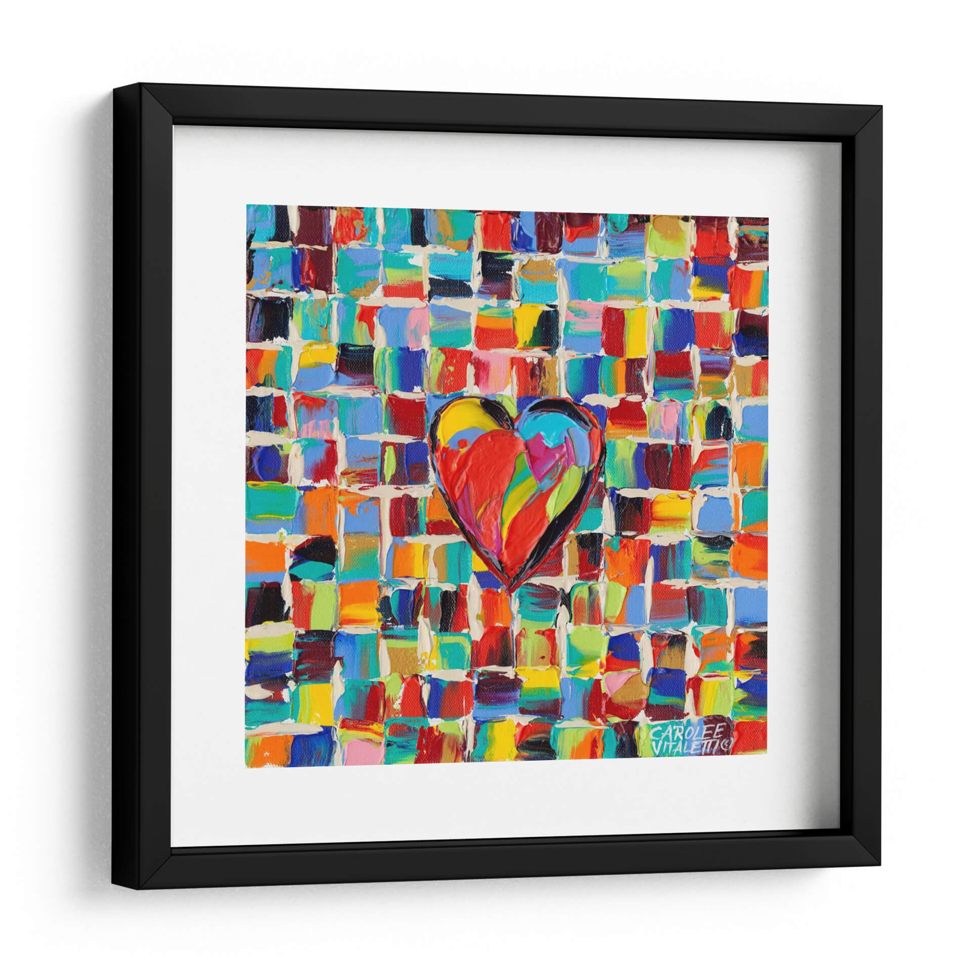Sumérgete en la explosión de color y emoción con 'Amor Al Color I', una obra de arte contemporáneo que captura la esencia vibrante de la vida. Esta pieza presenta un corazón central, pintado con pinceladas audaces y llenas de textura, que irradia energía y pasión. El fondo, compuesto por un mosaico de pequeños cuadrados de colores intensos y variados —desde rojos ardientes y azules profundos hasta amarillos brillantes y verdes alegres—, crea un efecto dinámico y cautivador. La técnica de pintura aplicada genera una profundidad visual que invita a la contemplación, haciendo que cada detalle sea una nueva sorpresa. Ideal para quienes buscan infundir alegría y vitalidad en su hogar u oficina, este cuadro decorativo es un punto focal que no pasará desapercibido. Su estilo abstracto moderno y su alegre paleta cromática lo convierten en la elección perfecta para salones, comedores o estudios que desean un toque de optimismo y estilo único. 'Amor Al Color I' no es solo una decoración, es una declaración de amor al arte y a la vida misma, un recordatorio constante de la belleza que nos rodea. Añade esta pieza a tu colección y deja que su energía positiva transforme tu espacio.