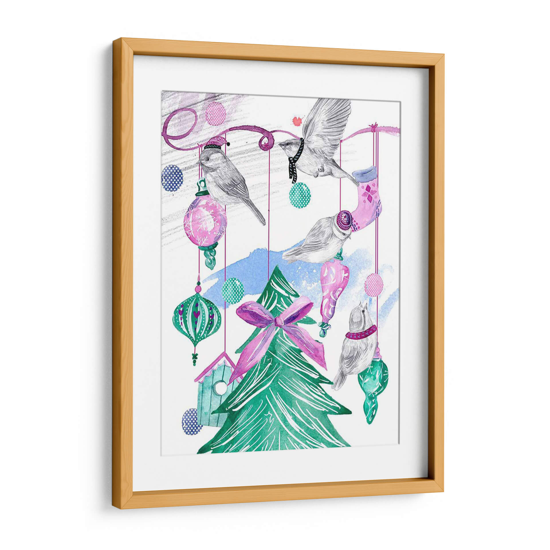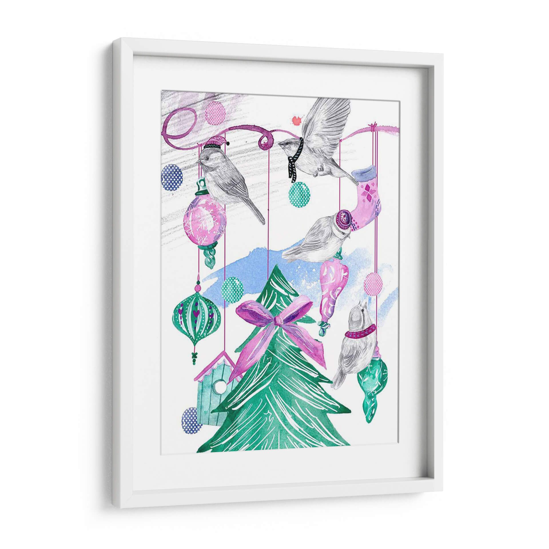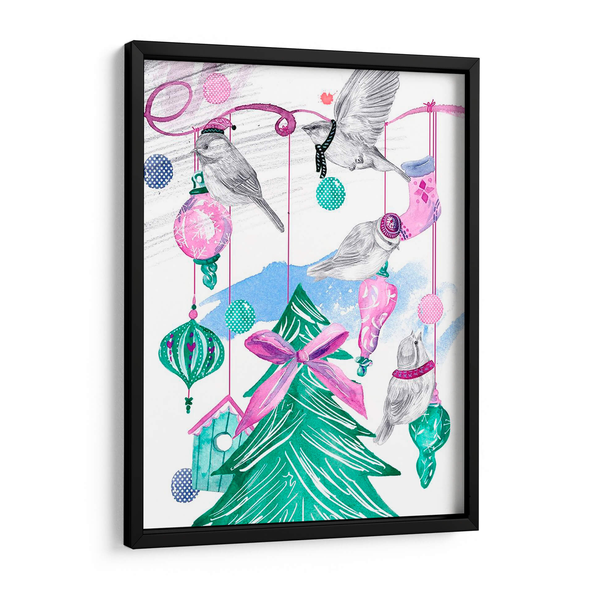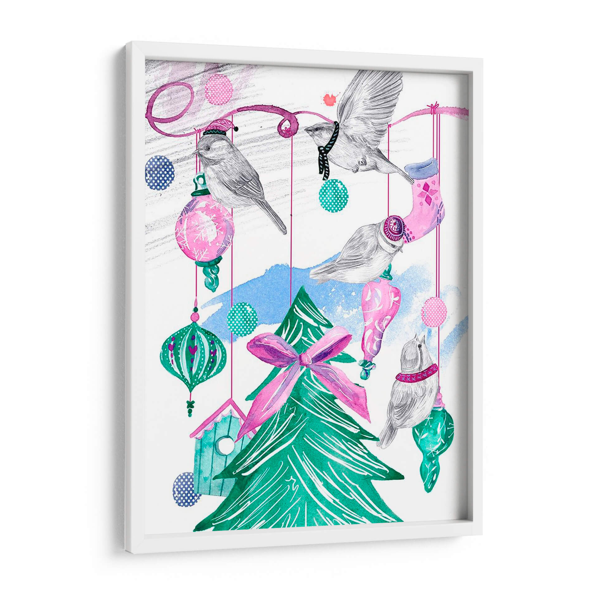Captura la magia festiva y la dulzura de la temporada con "Árbol de Diciembre I", una obra de arte encantadora de Melissa Wang. Esta pieza evoca la calidez y la alegría de las celebraciones invernales a través de una delicada representación de pájaros posados entre adornos navideños y un árbol verde vibrante. La paleta de colores, dominada por tonos pastel de rosa y azul, combinada con el verde intenso del árbol y toques de turquesa, crea una atmósfera juguetona y serena. Los detalles en acuarela y el trazo a mano alzada confieren a la obra una textura y un encanto únicos, invitando a la contemplación. Los pájaros, con sus pequeños sombreros y bufandas, añaden un toque de fantasía y ternura, mientras que las esferas colgantes y la casa de pájaros sugieren un ambiente acogedor y hogareño. Este cuadro decorativo es ideal para añadir un toque de espíritu navideño y sofisticación a cualquier espacio, ya sea una sala de estar, un dormitorio o una oficina. "Árbol de Diciembre I" no es solo una decoración, sino una invitación a revivir la dulzura de los recuerdos invernales y a celebrar la belleza de la naturaleza en su máxima expresión festiva. Su estilo único y su temática entrañable lo convierten en una pieza central perfecta para crear un ambiente acogedor y lleno de encanto.