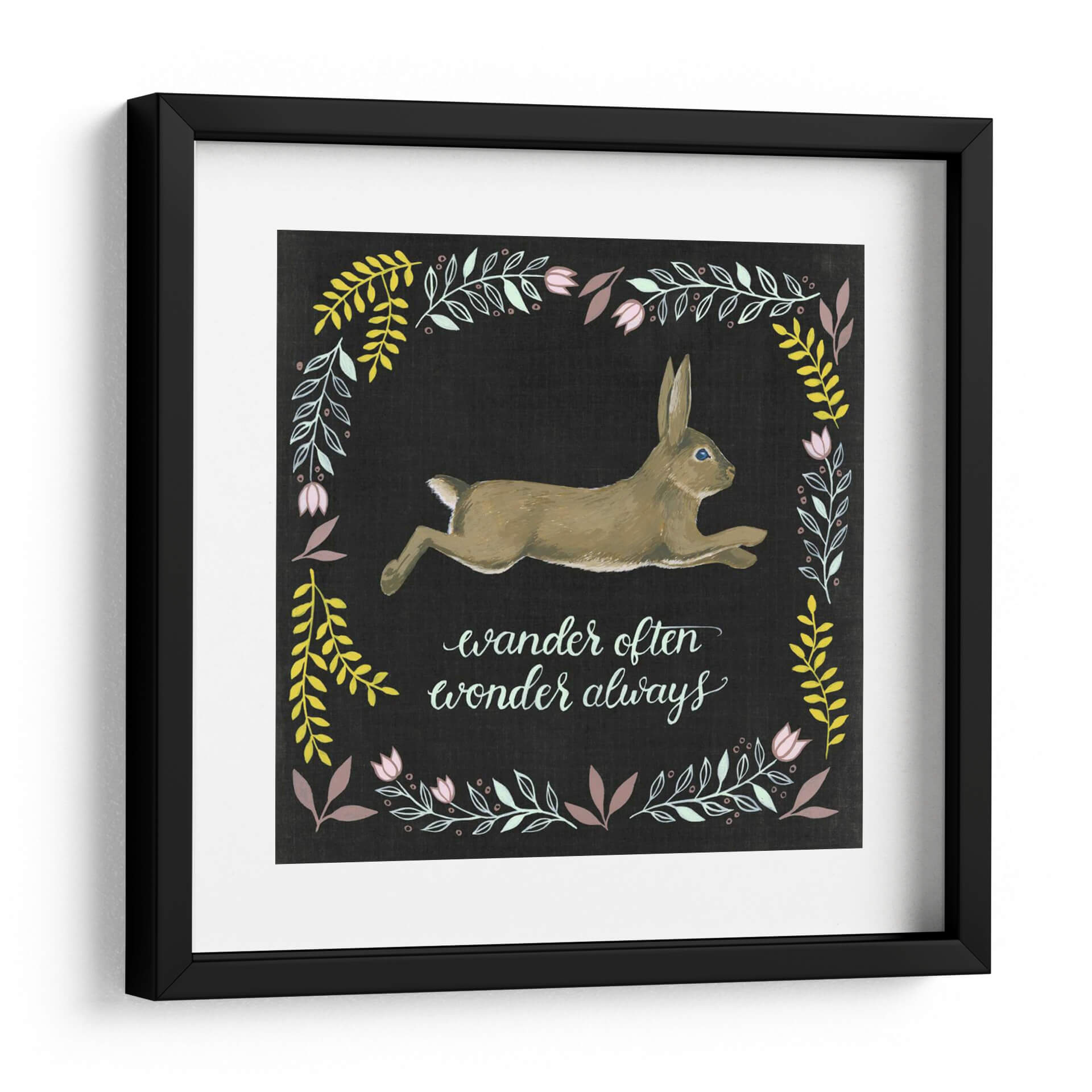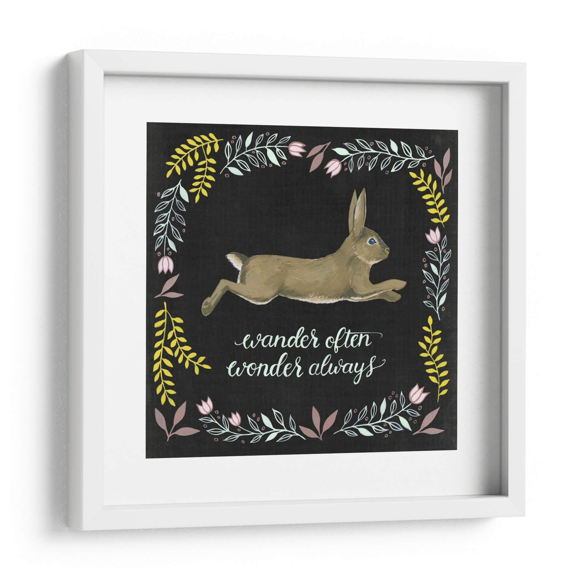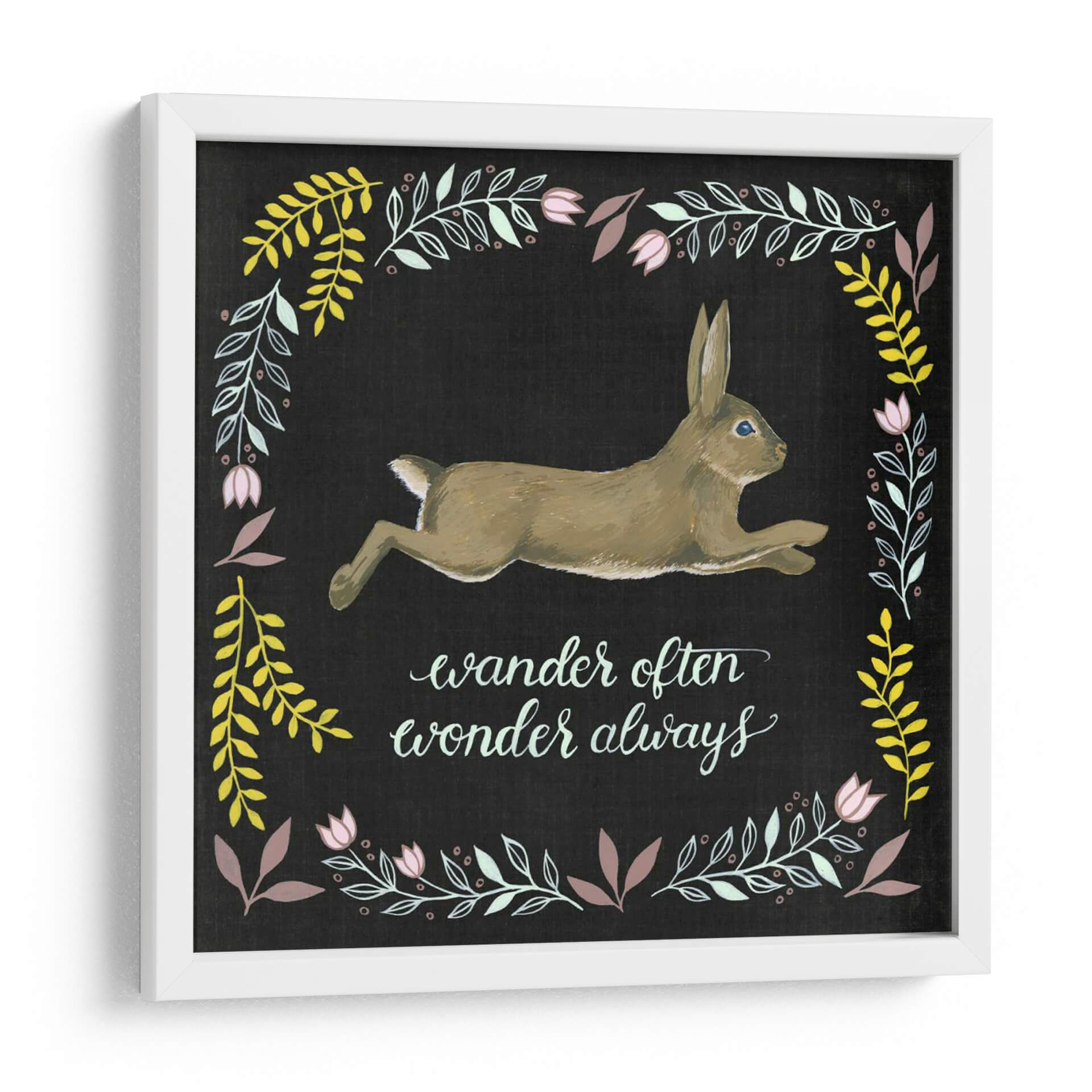 Sumérgete en la serenidad y el encanto de "Aventura Woodland I", una obra de arte contemporáneo de Grace Popp que captura la esencia de la exploración y la maravilla. Este cautivador cuadro decorativo presenta un tierno conejo en pleno galope, enmarcado por un delicado borde floral en tonos pastel y amarillos vibrantes sobre un fondo oscuro y texturizado. La frase "wander often wonder always" ("viaja a menudo, maravíllate siempre") añade un toque inspirador y poético, invitando a la reflexión sobre la aventura y el descubrimiento. La paleta de colores, que combina tonos tierra suaves para el animal con toques de verde menta, amarillo mostaza y rosa palo para la vegetación, crea una atmósfera armoniosa y equilibrada. El estilo artístico, con pinceladas visibles que le confieren una cualidad casi artesanal, lo hace perfecto para añadir un toque de naturaleza y optimismo a cualquier espacio. Ideal para dormitorios, salas de estar o incluso una oficina en casa, este cuadro decorativo es una invitación visual a soñar y explorar el mundo que nos rodea, aportando calma y un espíritu libre a tu decoración.