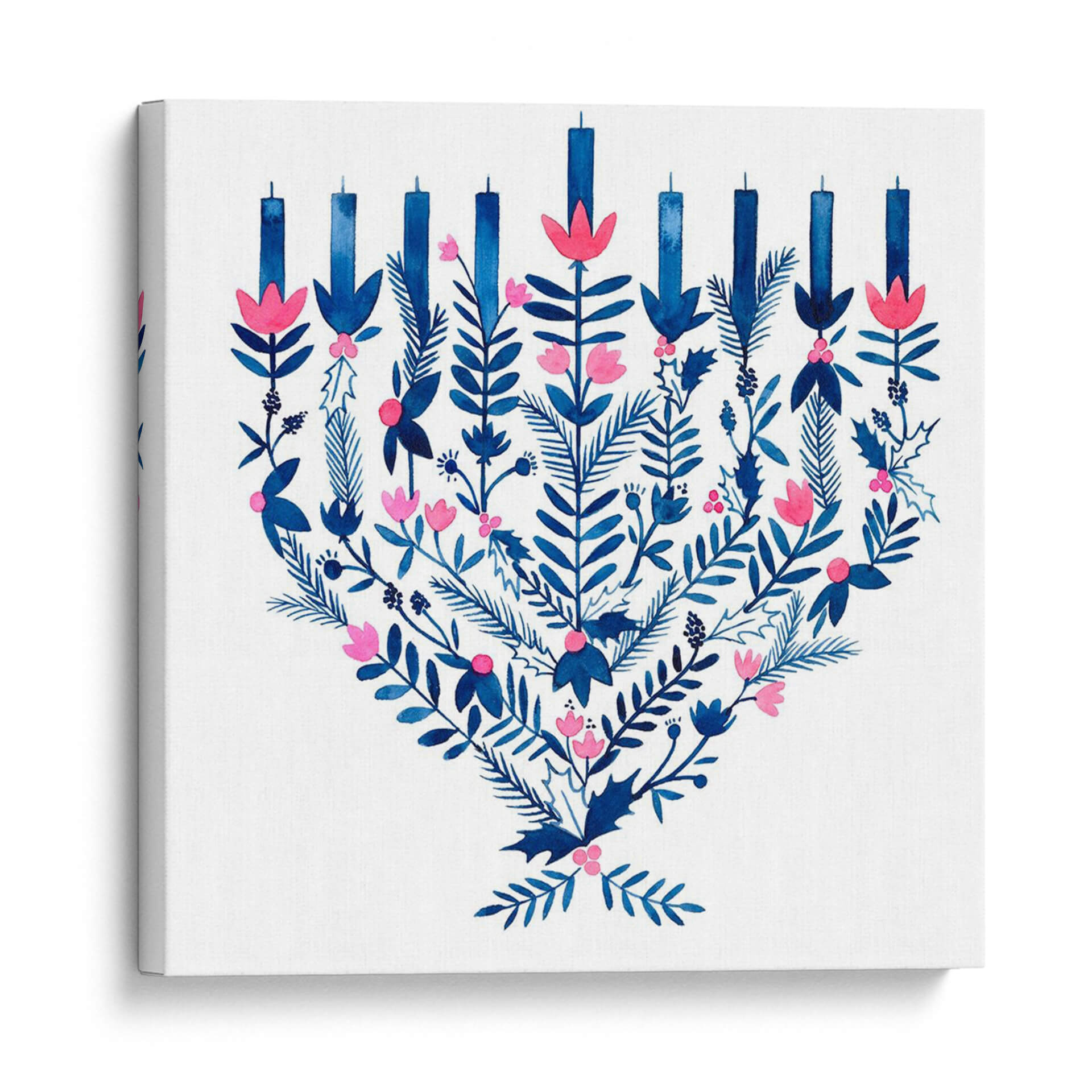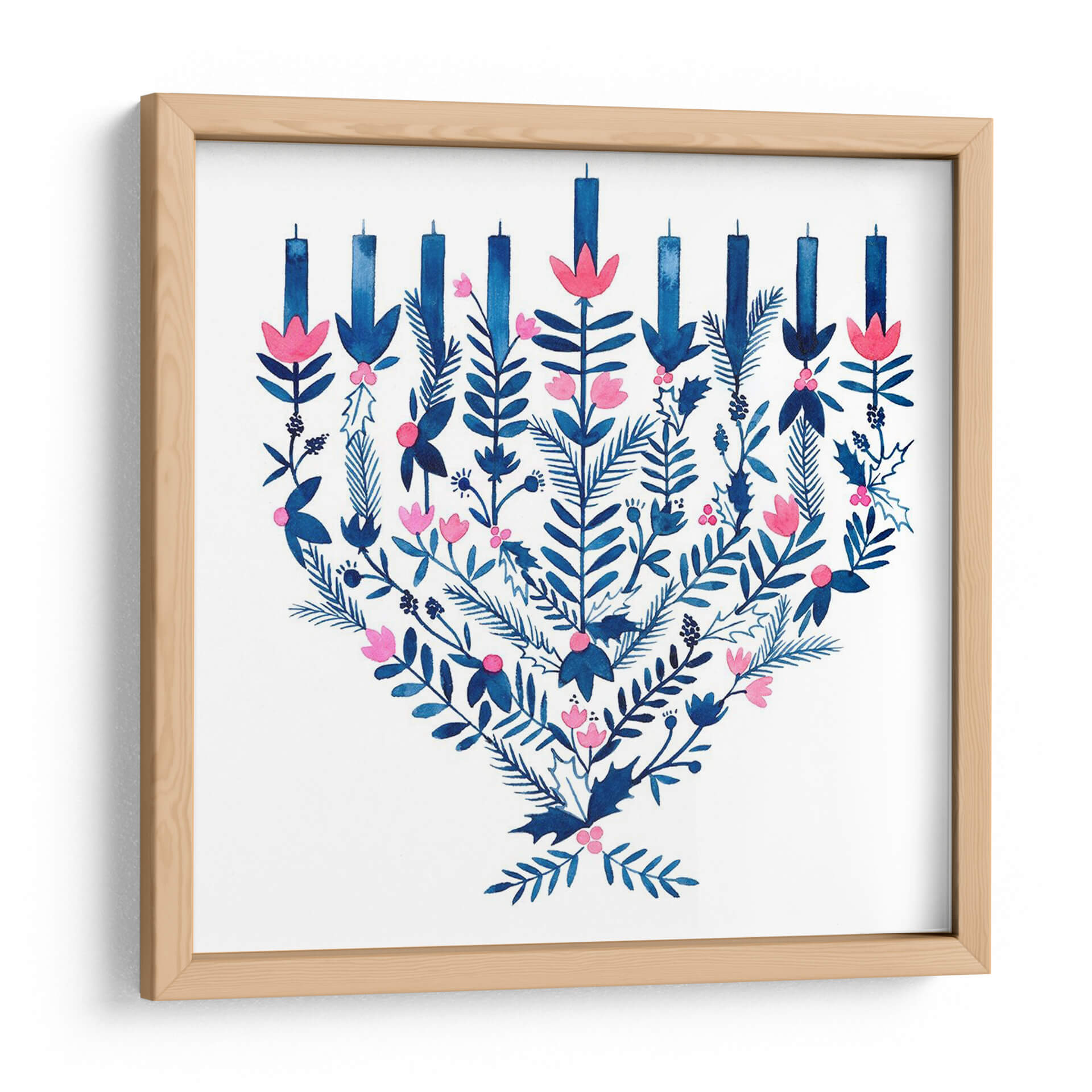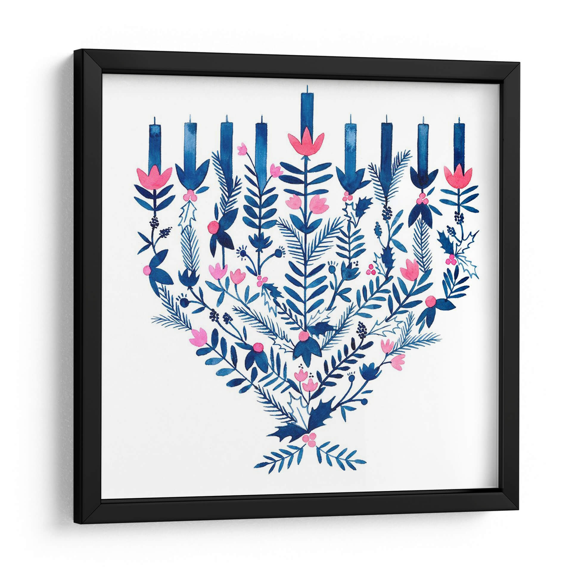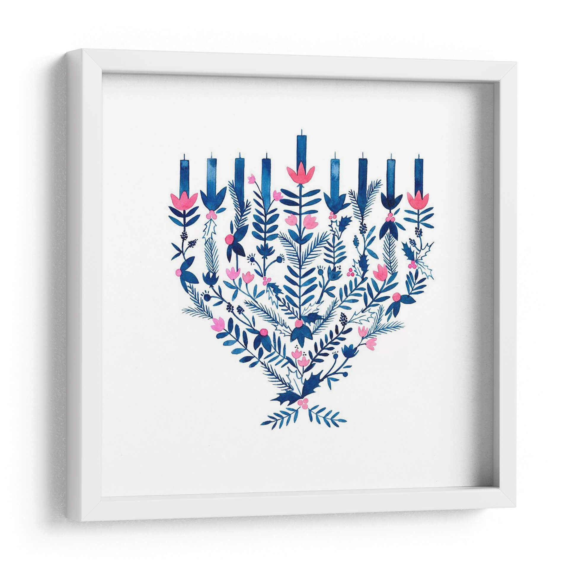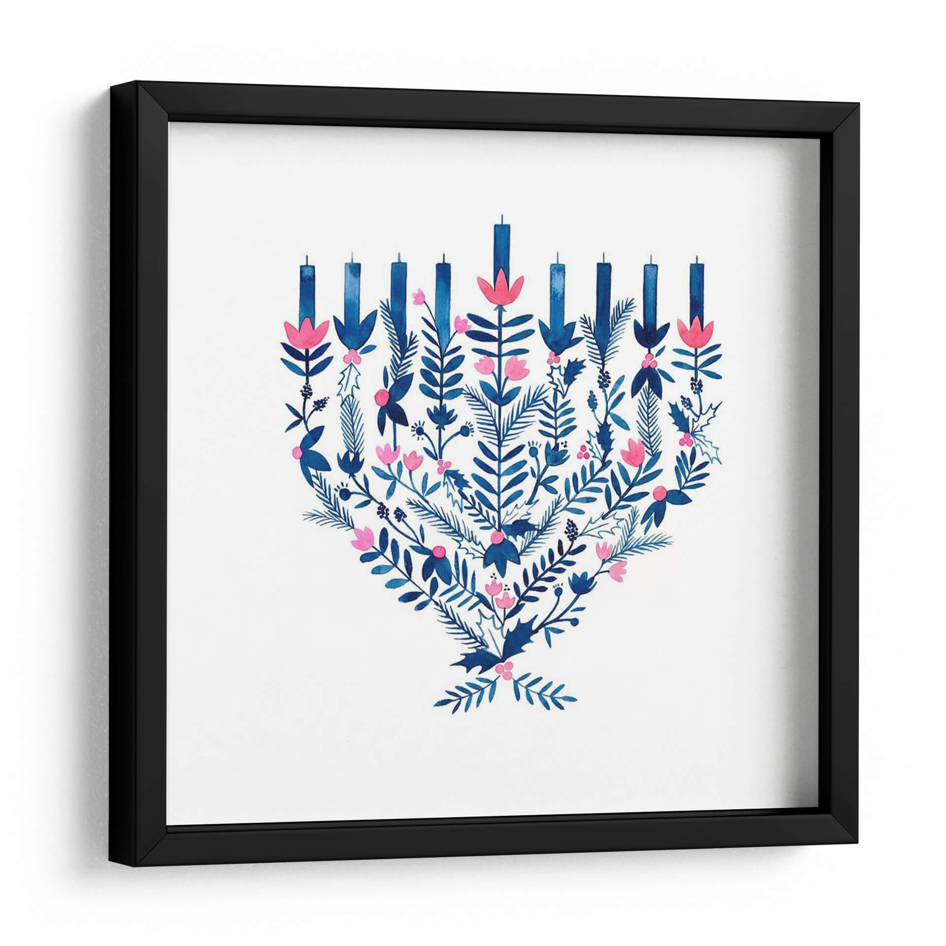 Celebra la alegría y la tradición con este encantador cuadro decorativo "Boho Hanukkah II" de Grace Popp. La obra presenta una interpretación artística de la menorá, adornada con un vibrante follaje en tonos azules profundos y delicadas flores rosadas. Cada elemento, desde las velas estilizadas hasta las hojas detalladas y las bayas, se fusiona en una composición armoniosa que evoca calidez y celebración. La técnica de acuarela aporta una ligereza y fluidez únicas, creando un ambiente acogedor y festivo. Este cuadro es perfecto para añadir un toque de color y significado cultural a tu hogar u oficina, especialmente durante la temporada de Hanukkah, pero su diseño atemporal lo hace ideal para decorar durante todo el año. Imagina este cuadro como el punto focal de tu sala de estar, aportando un aire de sofisticación bohemia y espiritualidad a tu espacio. Su paleta de colores, dominada por el contraste del azul y el rosa sobre un fondo blanco nítido, asegura que complemente una amplia variedad de estilos decorativos, desde el moderno hasta el más tradicional. Añade esta pieza única a tu colección de arte de pared y deja que su espíritu festivo ilumine tus ambientes.