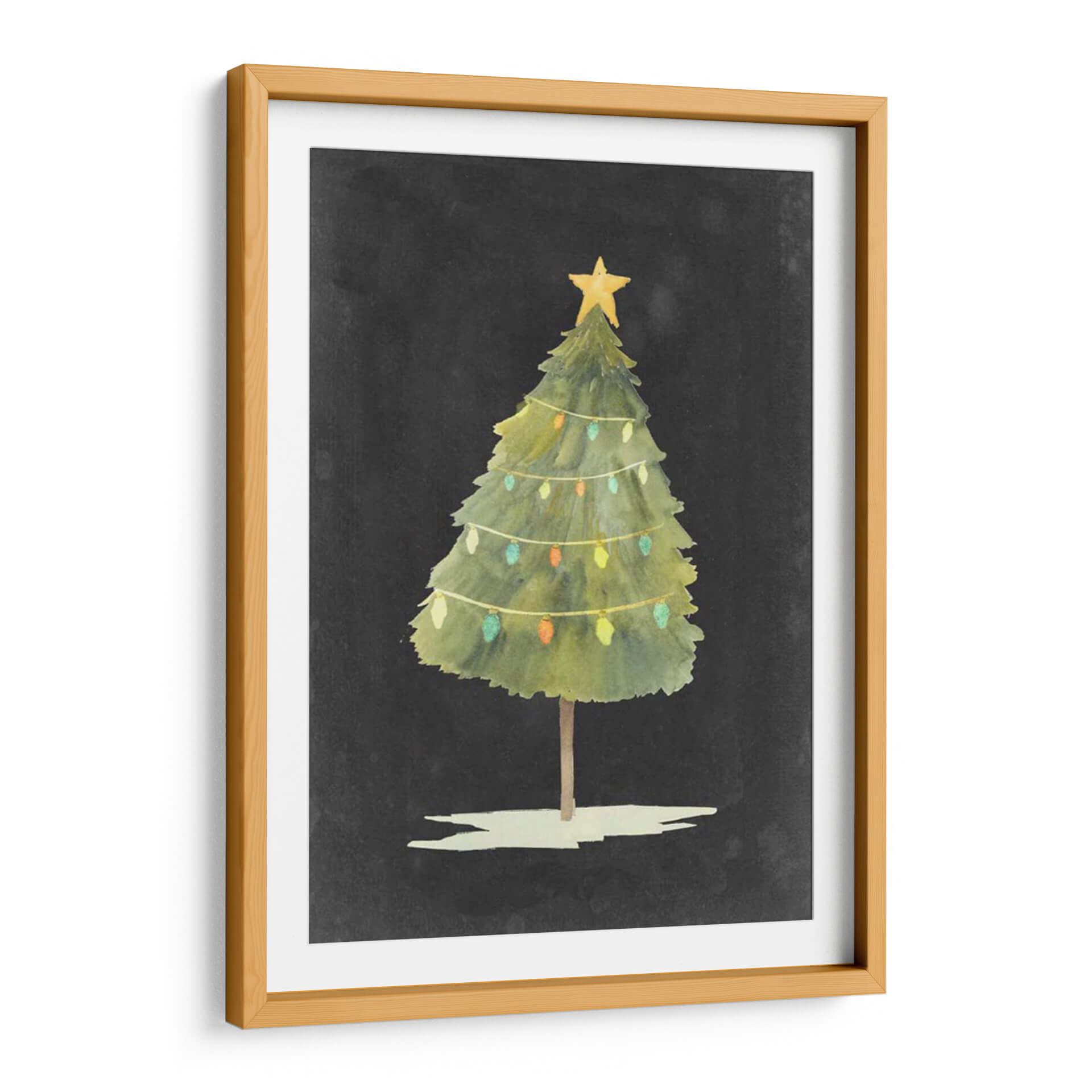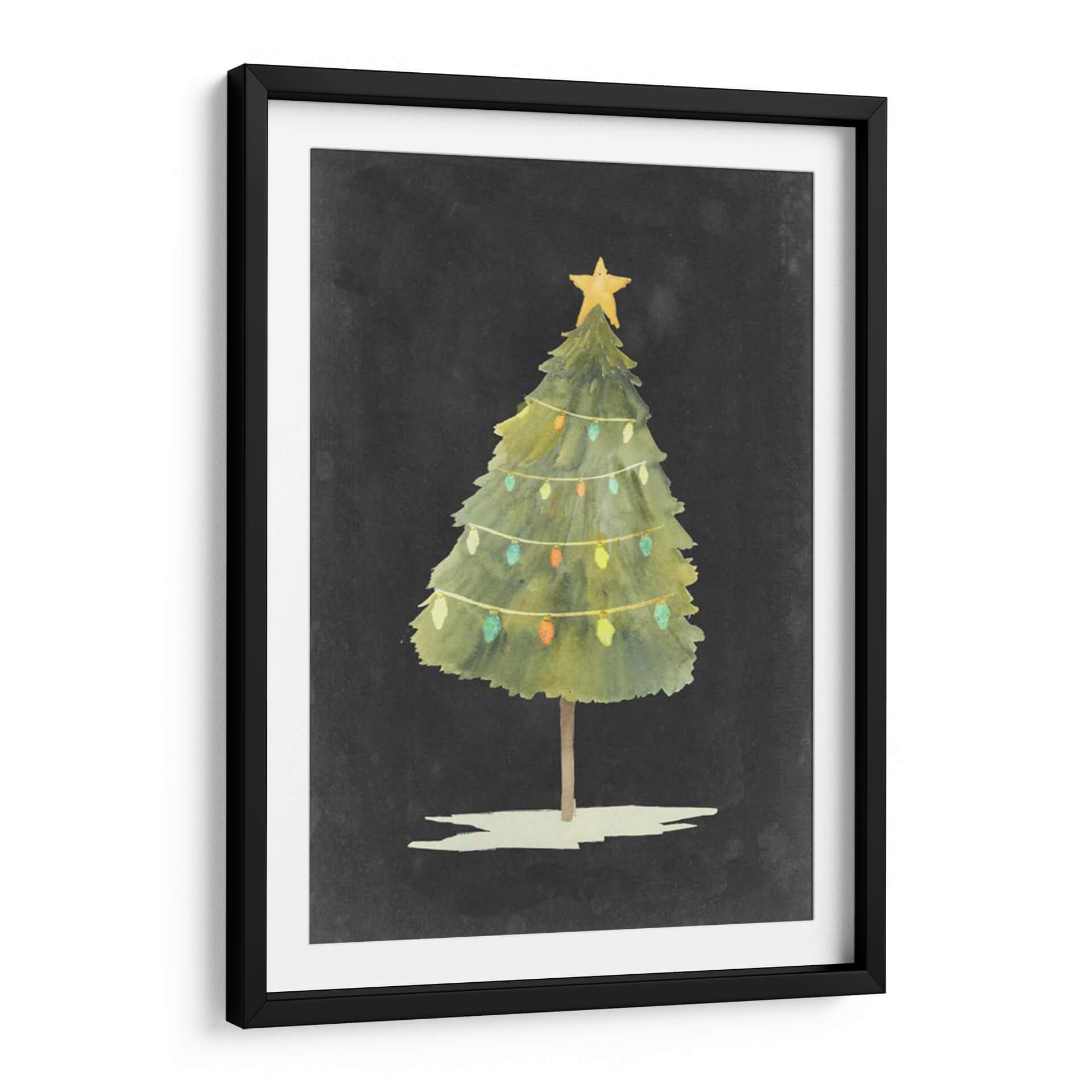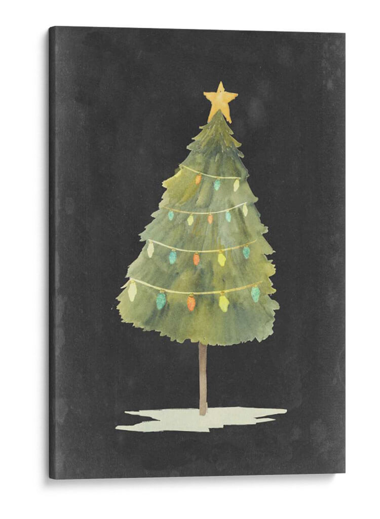 Captura la esencia mágica de la temporada con 'Brillo de Navidad I', una obra de arte digital que evoca la calidez y la alegría de las fiestas. Esta pieza presenta un árbol de Navidad estilizado, con un toque acuarela, coronado por una estrella dorada y adornado con delicadas guirnaldas de luces de colores. Los tonos verdes del árbol, en contraste con el fondo oscuro y texturizado, crean una atmósfera acogedora y festiva. El estilo de Grace Popp se manifiesta en trazos suaves y una paleta de colores vibrante pero sutil, perfecta para infundir espíritu navideño en cualquier espacio. Ideal para quienes buscan añadir un toque de celebración y encanto a su hogar u oficina durante la época invernal, este cuadro decorativo es una representación encantadora y atemporal de la Navidad. Su composición sencilla pero efectiva lo convierte en un punto focal sutil y elegante, invitando a la reflexión y al disfrute de momentos especiales. Una adición perfecta para salones, comedores o cualquier rincón que desee iluminar con la magia de la Navidad.