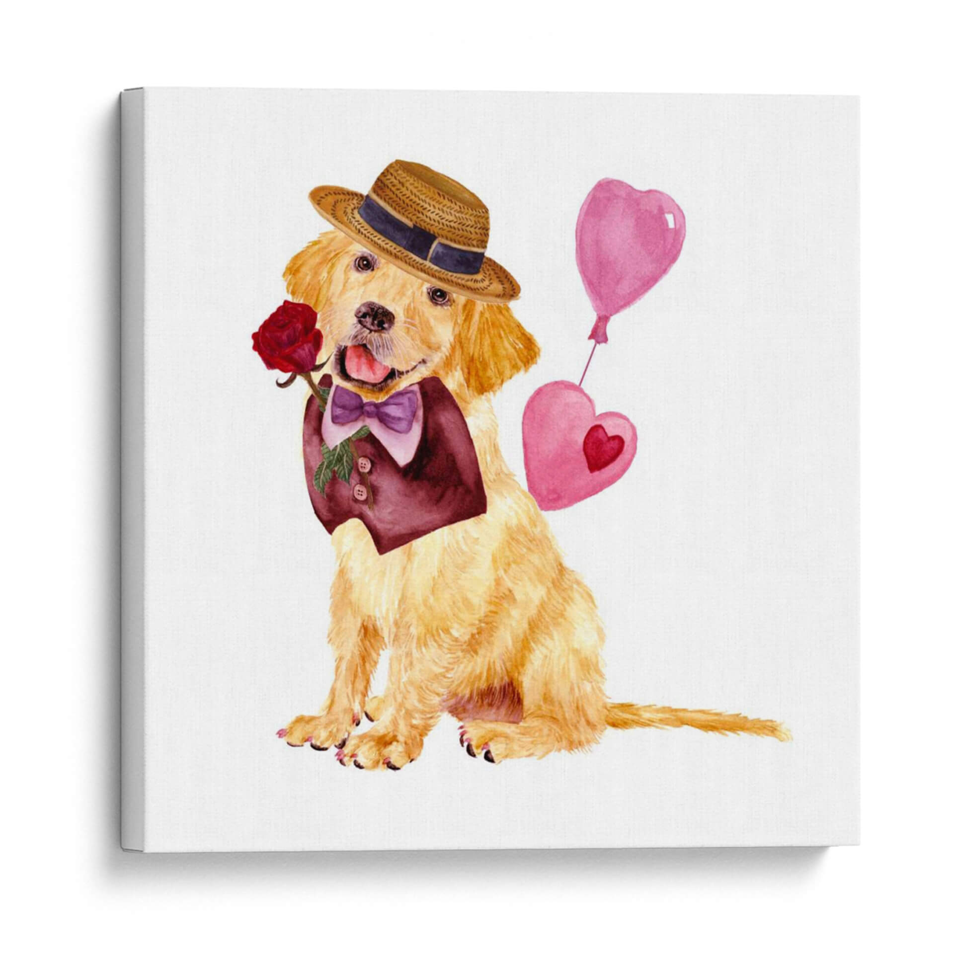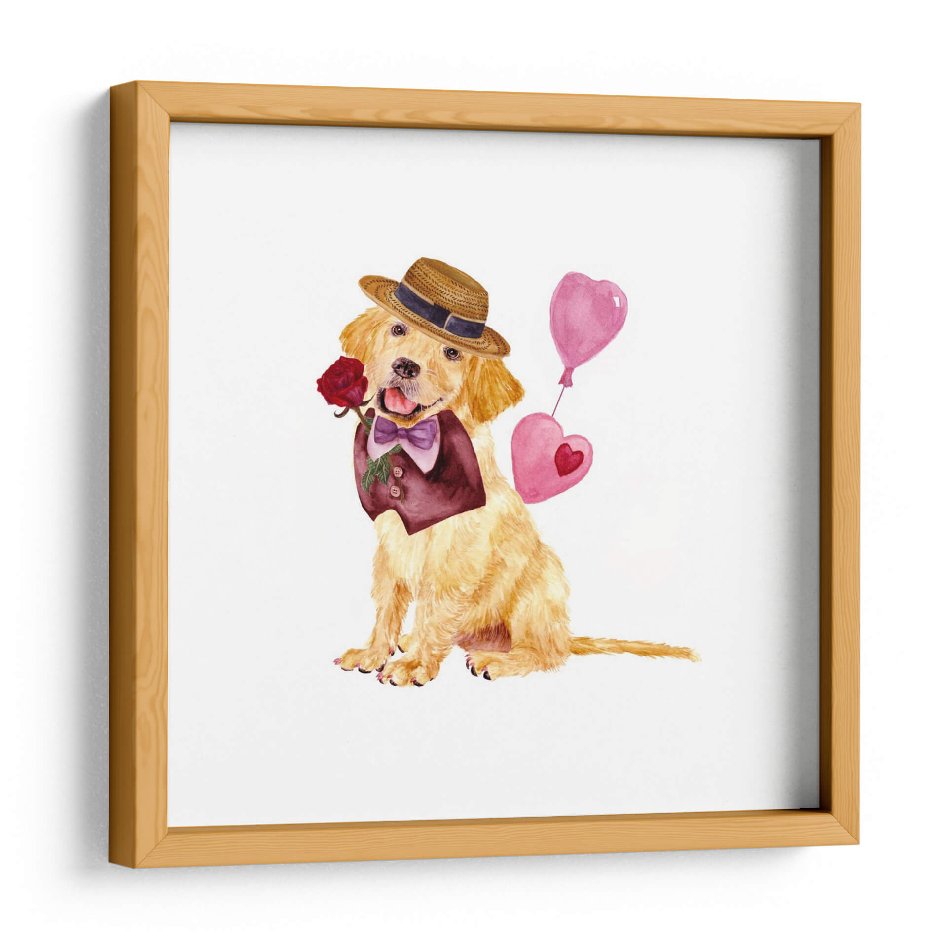Celebra el amor y la ternura con este encantador cuadro decorativo 'Cachorro de San Valentín V' de Melissa Wang. Esta acuarela captura la esencia pura de la alegría canina, presentando a un adorable cachorro de Golden Retriever vestido con un elegante chaleco burdeos, pajarita morada y un sombrero de paja, sosteniendo una rosa roja en su hocico. Dos globos en forma de corazón rosa flotan a su lado, añadiendo un toque juguetón y romántico a la composición. La técnica de acuarela aporta una suavidad etérea y una paleta de colores cálidos y delicados que invitan a la sonrisa. Ideal para cualquier espacio que necesite un toque de dulzura y personalidad, desde una sala de estar moderna hasta un dormitorio acogedor o incluso una oficina que busque un ambiente más amigable. Este cuadro es una expresión visual de afecto y lealtad, perfecto para regalar o para añadir una pieza única y emotiva a tu decoración. Su estilo figurativo y encantador lo convierte en un punto focal que atraerá miradas y generará conversaciones, aportando calidez y carácter a cualquier hogar.