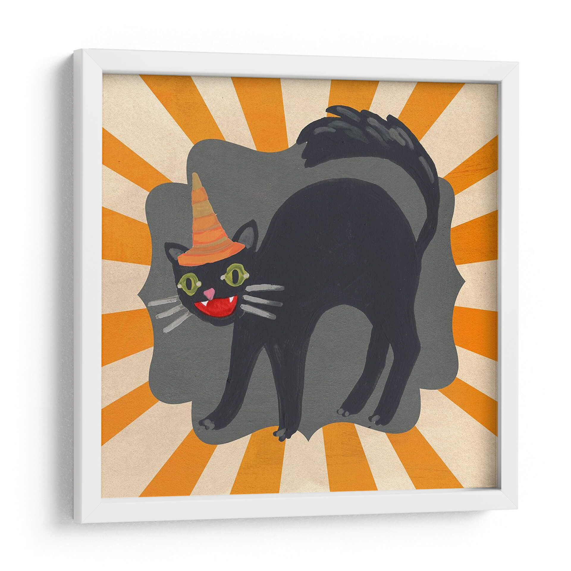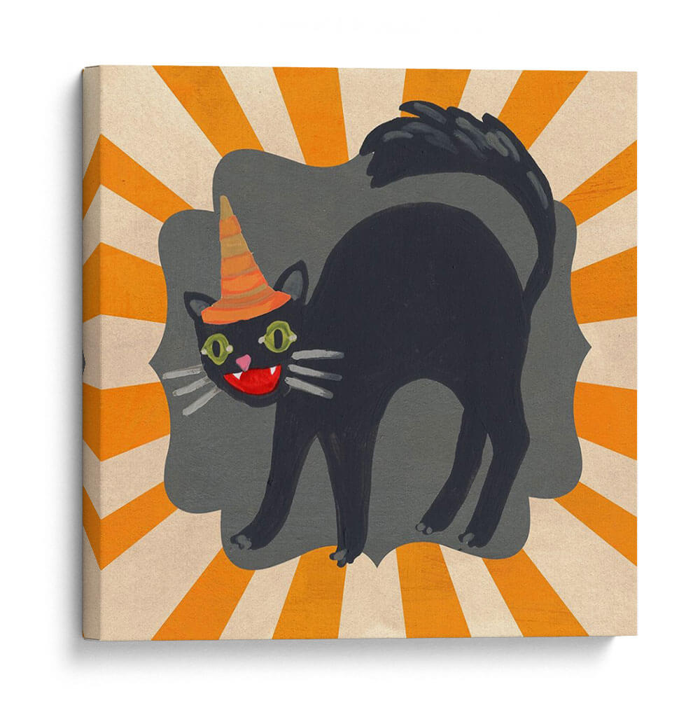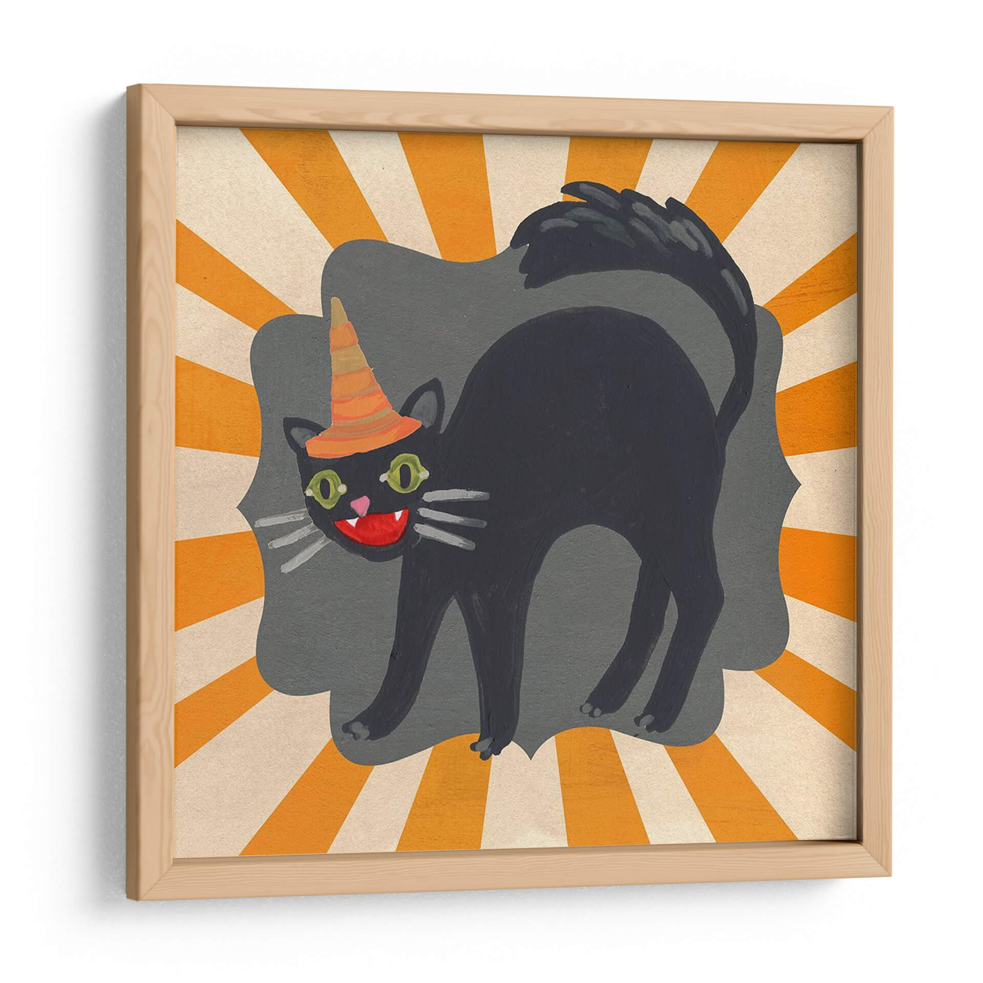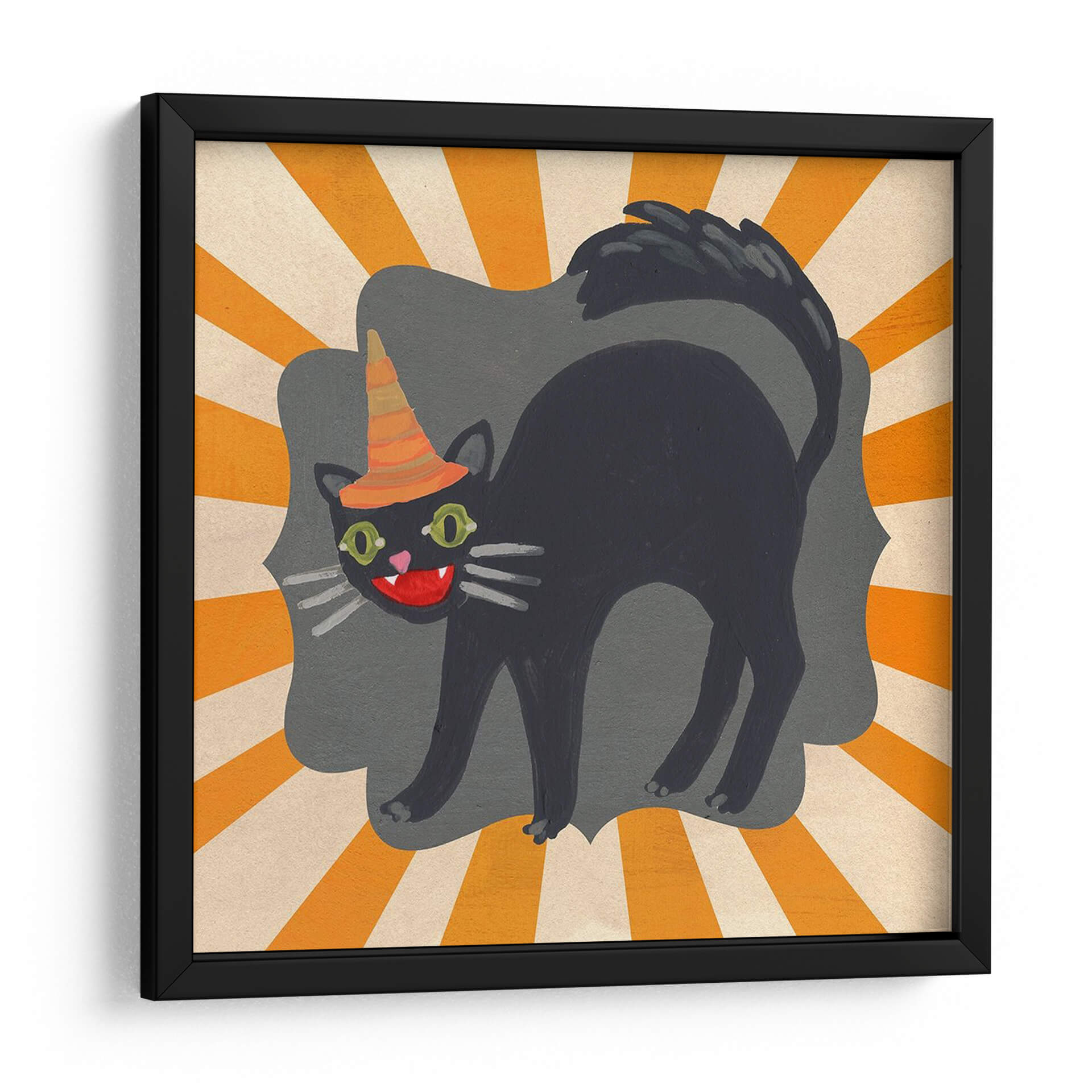 Sumérgete en la atmósfera juguetona y festiva de "Carnaval de Halloween I", una obra de arte vibrante que captura la esencia de la temporada con un toque distintivo. Esta pieza presenta un enigmático gato negro, ataviado con un sombrero de fiesta naranja, posicionado sobre un fondo radiante de rayas naranjas y beige. La mirada intensa del gato, sus colmillos afilados y una expresión traviesa insinúan una celebración llena de misterio y diversión. Los colores cálidos y contrastantes, dominados por el naranja, el negro y toques de verde en los ojos del felino, crean una composición visualmente atractiva que evoca la energía del carnaval y la magia de Halloween. El estilo artístico, con sus trazos audaces y una estética ligeramente retro, le confiere un carácter único, perfecto para añadir un acento divertido y con personalidad a cualquier espacio. Ideal para salas de estar, estudios o incluso para infundir un espíritu festivo en una oficina, este cuadro decorativo es una elección excepcional para quienes buscan una decoración de pared que combine arte, carácter y un guiño a las celebraciones. Añade un toque de encanto y originalidad a tu hogar con esta cautivadora representación del espíritu de Halloween.