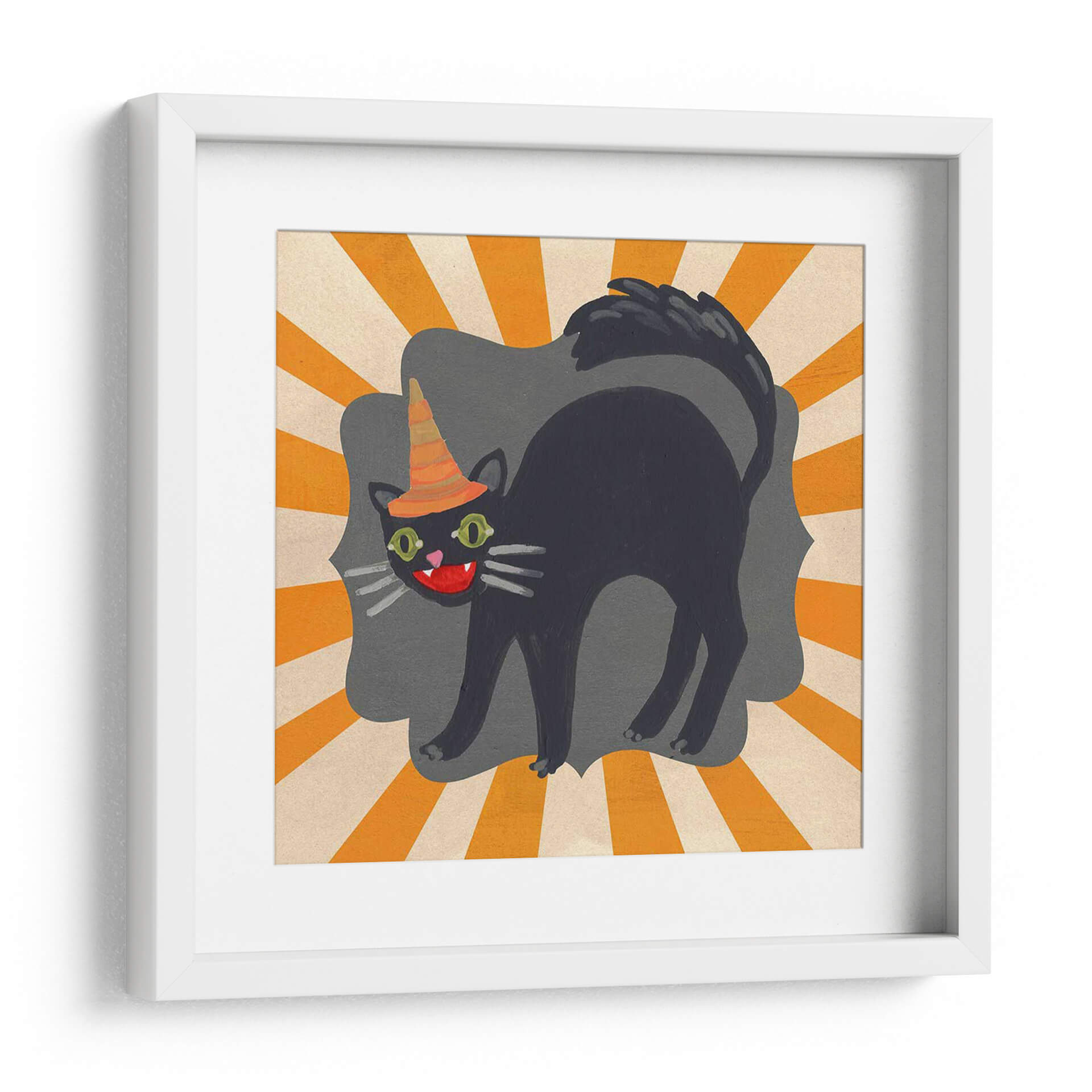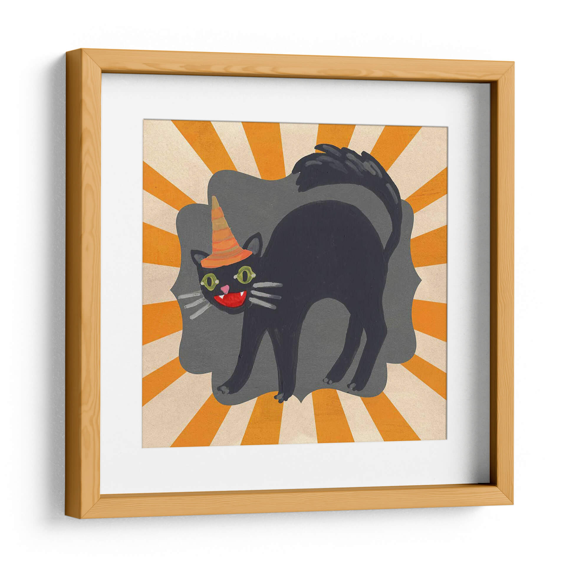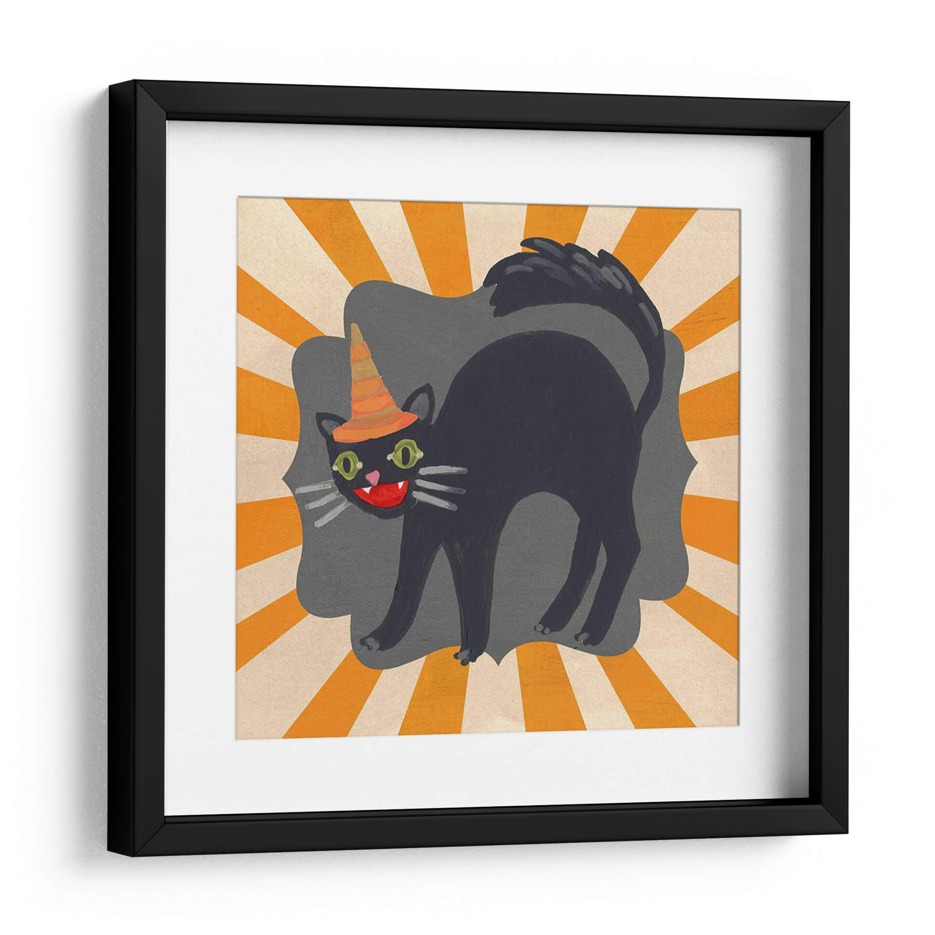 Sumérgete en la atmósfera juguetona y festiva de "Carnaval de Halloween I", una obra de arte vibrante que captura la esencia de la temporada con un toque distintivo. Esta pieza presenta un enigmático gato negro, ataviado con un sombrero de fiesta naranja, posicionado sobre un fondo radiante de rayas naranjas y beige. La mirada intensa del gato, sus colmillos afilados y una expresión traviesa insinúan una celebración llena de misterio y diversión. Los colores cálidos y contrastantes, dominados por el naranja, el negro y toques de verde en los ojos del felino, crean una composición visualmente atractiva que evoca la energía del carnaval y la magia de Halloween. El estilo artístico, con sus trazos audaces y una estética ligeramente retro, le confiere un carácter único, perfecto para añadir un acento divertido y con personalidad a cualquier espacio. Ideal para salas de estar, estudios o incluso para infundir un espíritu festivo en una oficina, este cuadro decorativo es una elección excepcional para quienes buscan una decoración de pared que combine arte, carácter y un guiño a las celebraciones. Añade un toque de encanto y originalidad a tu hogar con esta cautivadora representación del espíritu de Halloween.