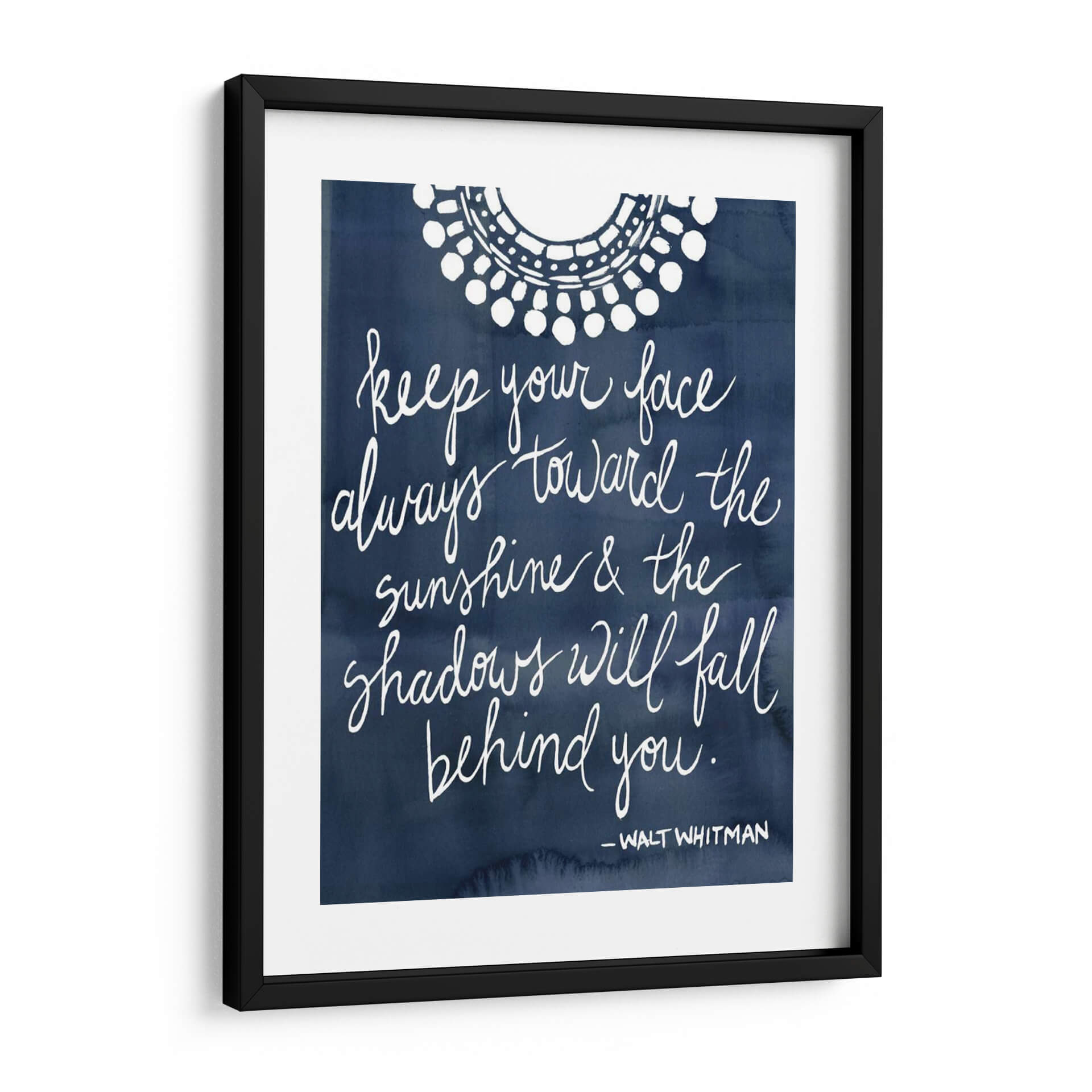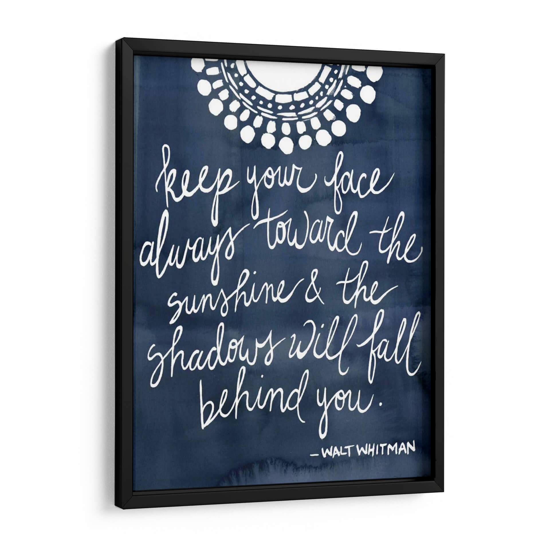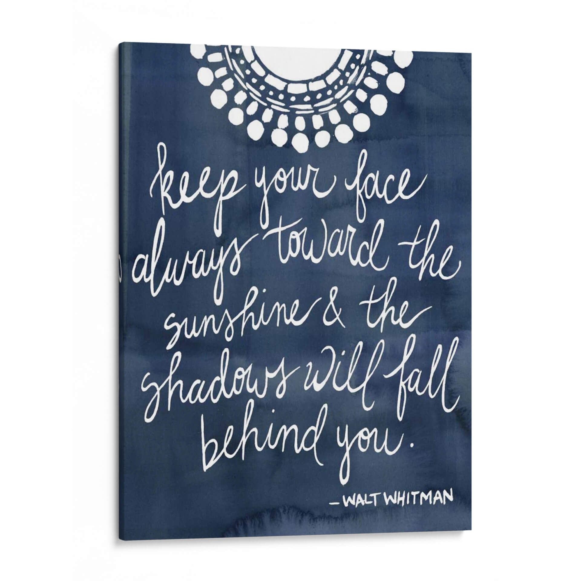 Inunda tus espacios con optimismo y estilo a través de la obra "Cita De Sol Ii" de Grace Popp. Este cuadro decorativo, en una cautivadora paleta de azules profundos con toques blancos luminosos, presenta una cita inspiradora de Walt Whitman: "Mantén tu rostro siempre hacia el sol y las sombras caerán detrás de ti". La caligrafía fluida y elegante, junto a un delicado patrón ornamental en la parte superior, crea una pieza visualmente atractiva y llena de significado. El estilo moderno y minimalista de la obra, combinado con la textura sutil que evoca la acuarela, la hace ideal para cualquier ambiente que busque un mensaje de perseverancia y positividad. Ya sea en tu sala de estar, oficina o dormitorio, este lienzo decorativo se convertirá en un punto focal que inspira serenidad y una actitud proactiva ante la vida. Añade un toque de luz y sabiduría a tu decoración con esta pieza única de arte contemporáneo.
