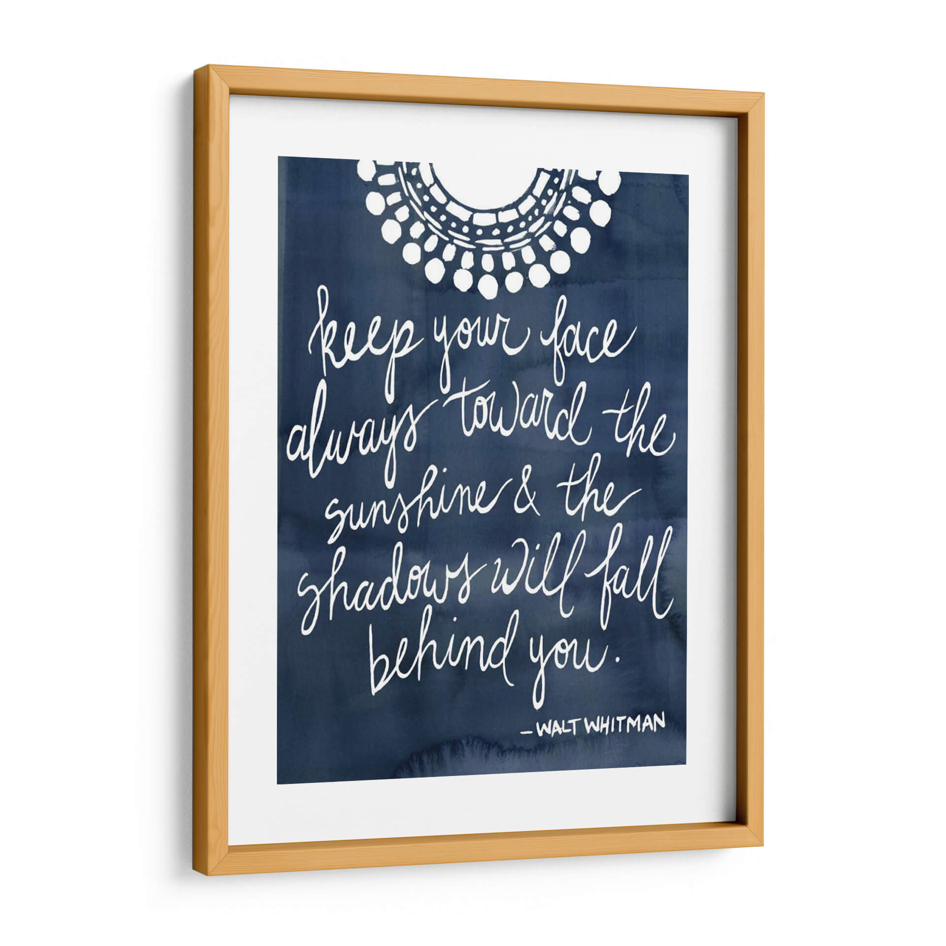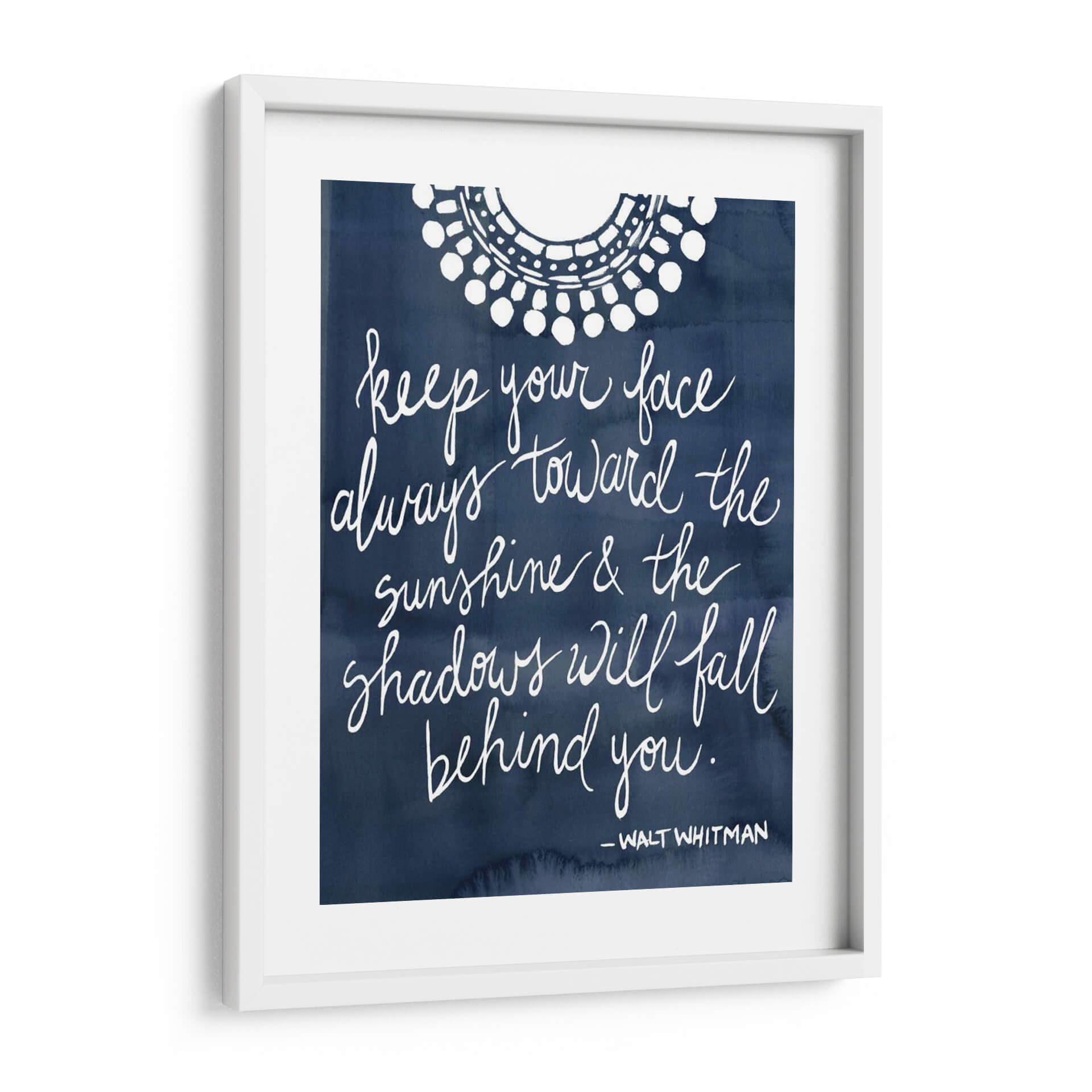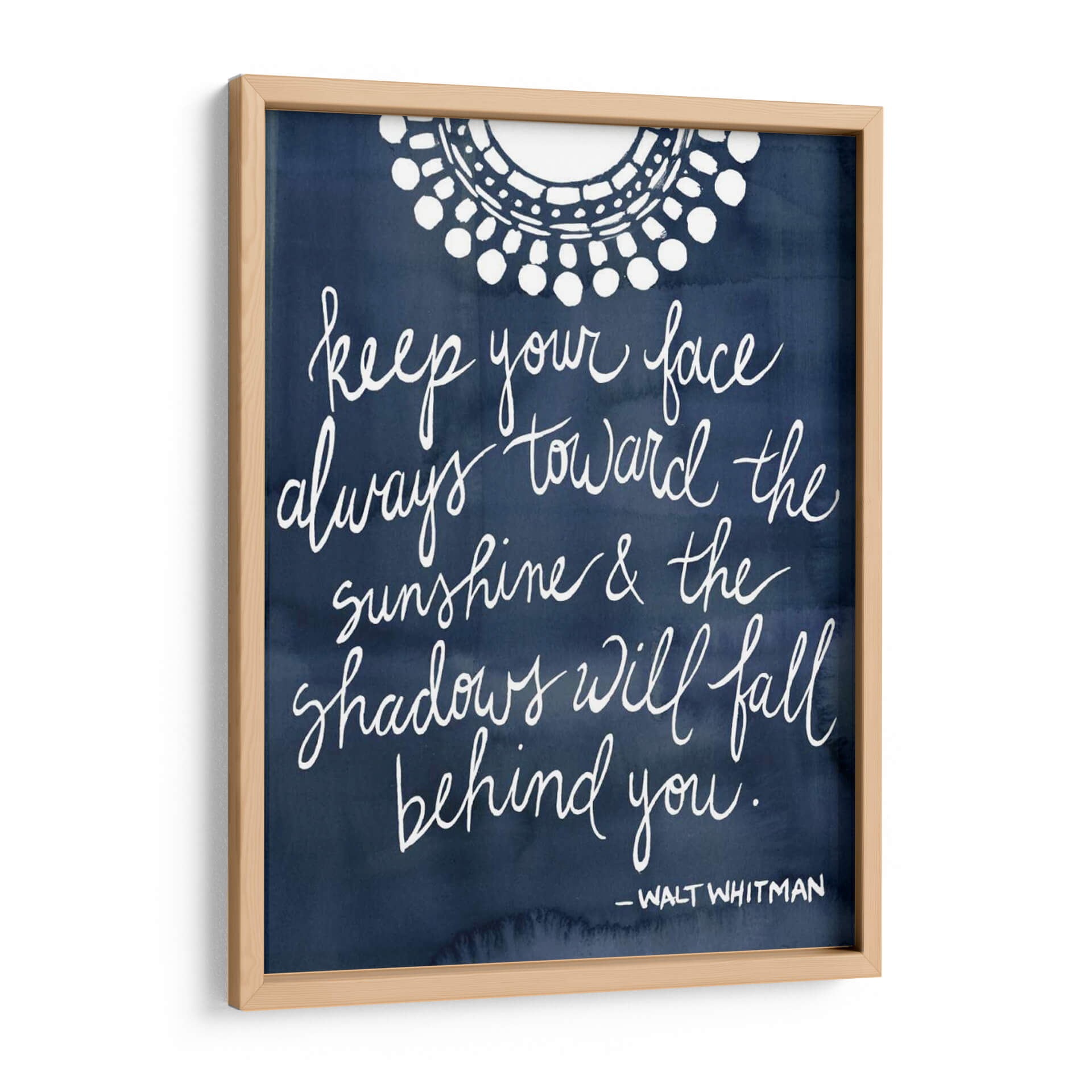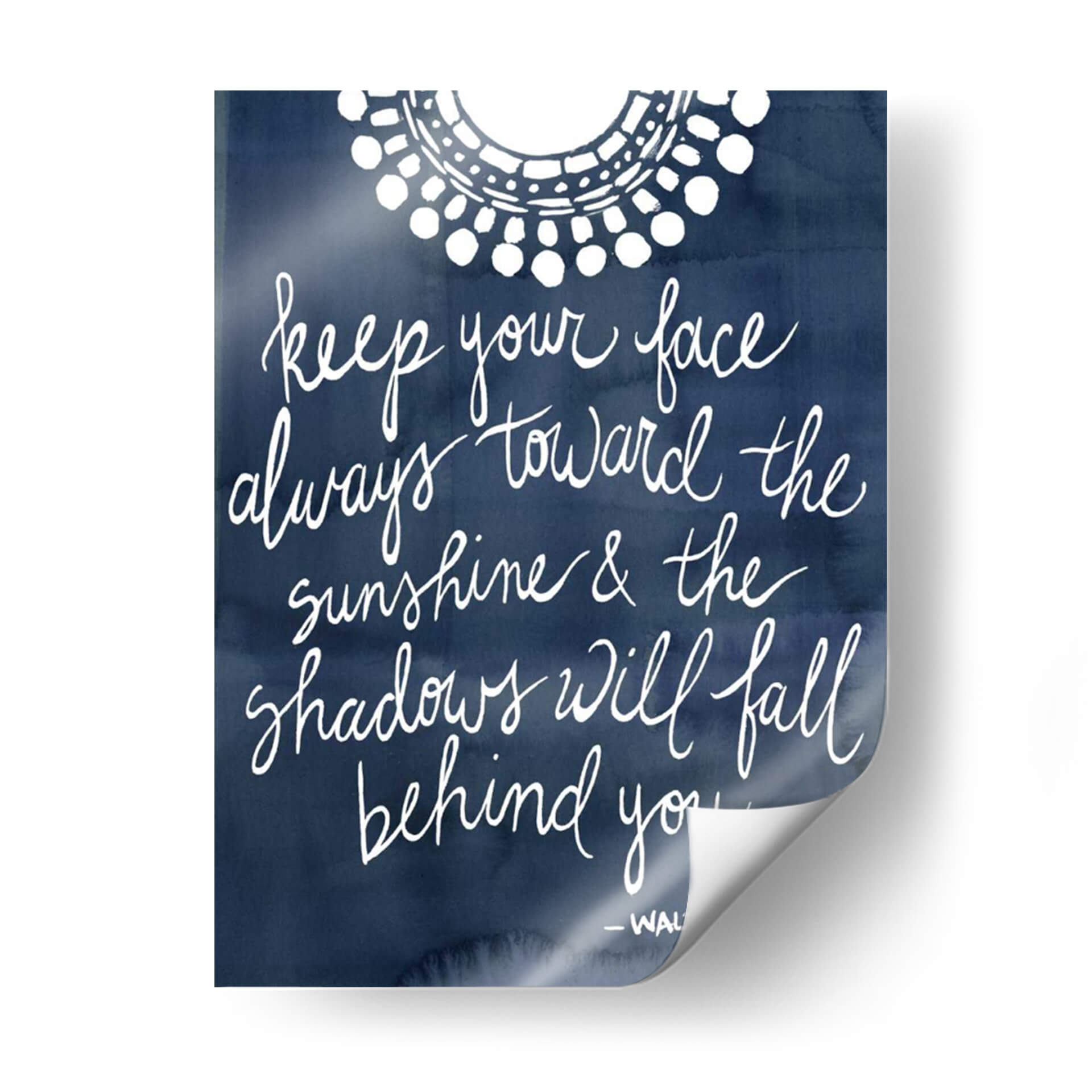 Inunda tus espacios con optimismo y estilo a través de la obra "Cita De Sol Ii" de Grace Popp. Este cuadro decorativo, en una cautivadora paleta de azules profundos con toques blancos luminosos, presenta una cita inspiradora de Walt Whitman: "Mantén tu rostro siempre hacia el sol y las sombras caerán detrás de ti". La caligrafía fluida y elegante, junto a un delicado patrón ornamental en la parte superior, crea una pieza visualmente atractiva y llena de significado. El estilo moderno y minimalista de la obra, combinado con la textura sutil que evoca la acuarela, la hace ideal para cualquier ambiente que busque un mensaje de perseverancia y positividad. Ya sea en tu sala de estar, oficina o dormitorio, este lienzo decorativo se convertirá en un punto focal que inspira serenidad y una actitud proactiva ante la vida. Añade un toque de luz y sabiduría a tu decoración con esta pieza única de arte contemporáneo.