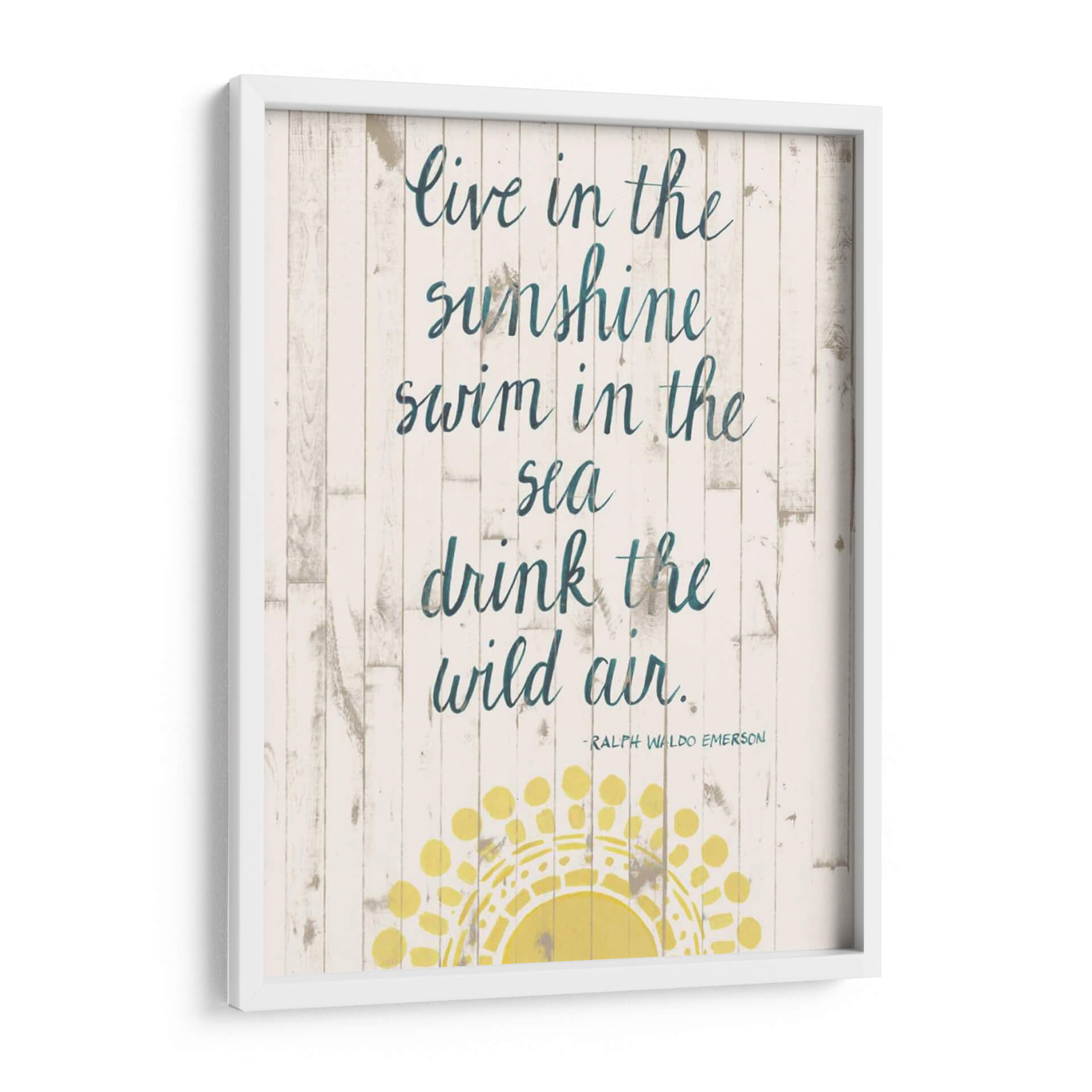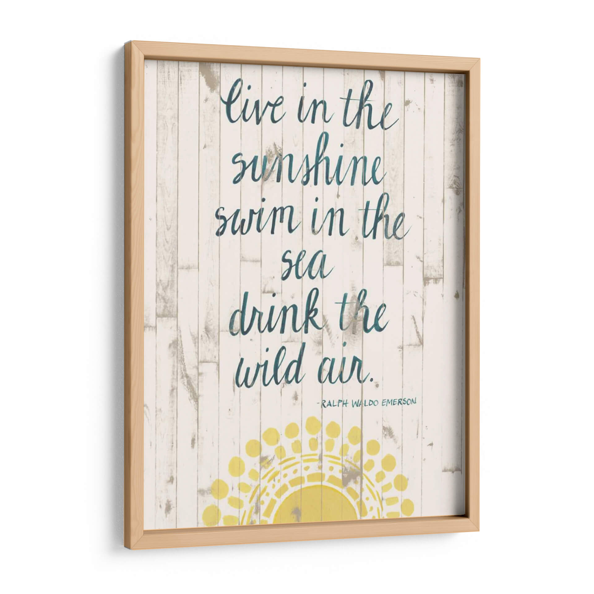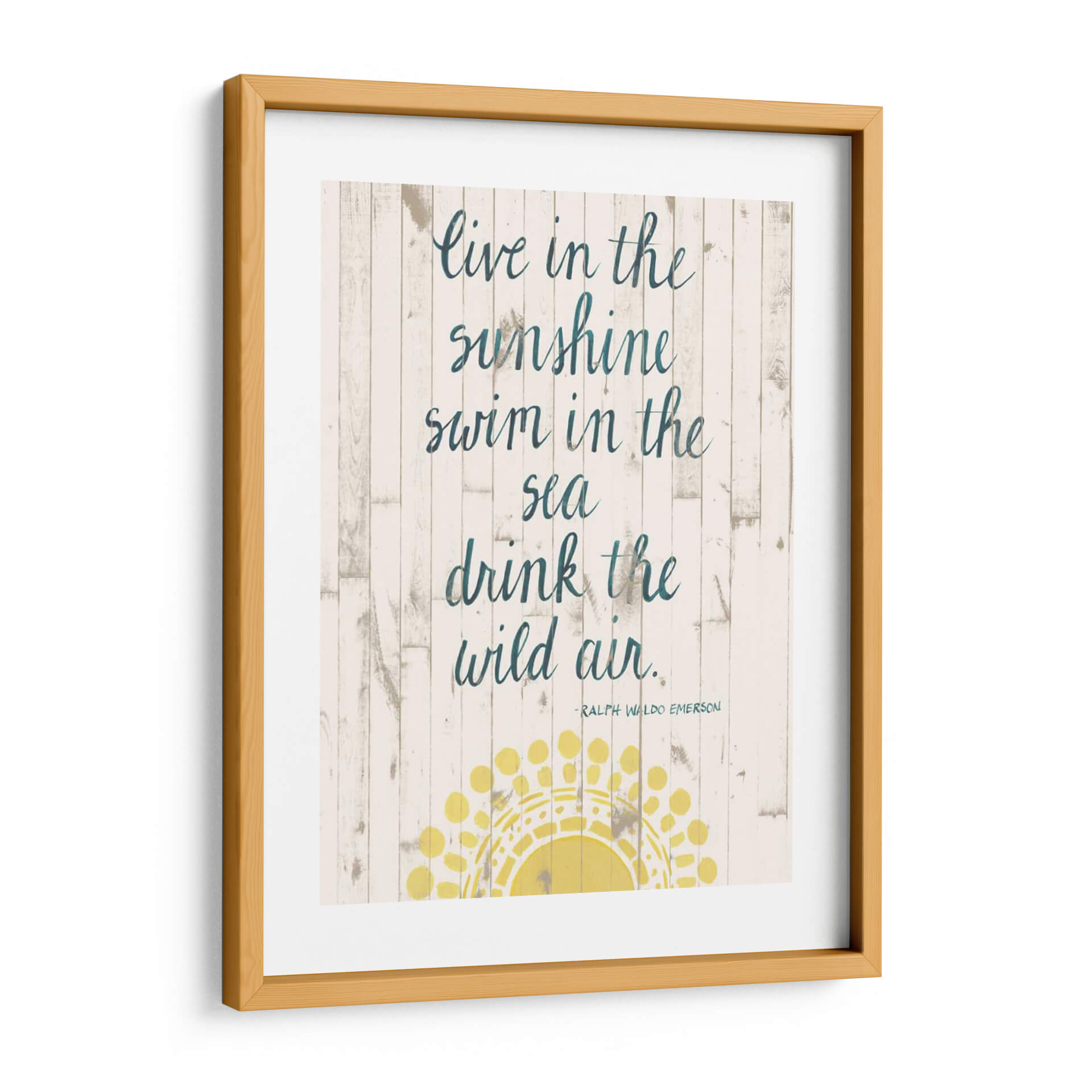 Inspira tu hogar con 'Cita De Sol Iv', una obra de arte de Grace Popp que captura la esencia del verano y la libertad. Este cuadro decorativo presenta una cita inspiradora sobre un fondo rústico de tablones de madera blanqueada, evocando la tranquilidad de la costa. Los versos "Live in the sunshine, swim in the sea, drink the wild air" resuenan con un espíritu aventurero y una conexión profunda con la naturaleza. La paleta de colores, dominada por blancos desgastados, tonos tierra y acentos de azul petróleo en la caligrafía, crea una atmósfera serena y costera. Un sol estilizado en tonos amarillos vibrantes ilumina la parte inferior de la composición, añadiendo un toque de calidez y optimismo. Perfecta para salones, dormitorios o espacios de oficina que buscan un toque de inspiración playera y un ambiente relajado. Este cuadro decorativo es ideal para quienes aprecian el arte con mensajes positivos y un diseño que fusiona lo rústico con lo moderno. Añade una dosis de luz y aire fresco a tu decoración con esta pieza única.