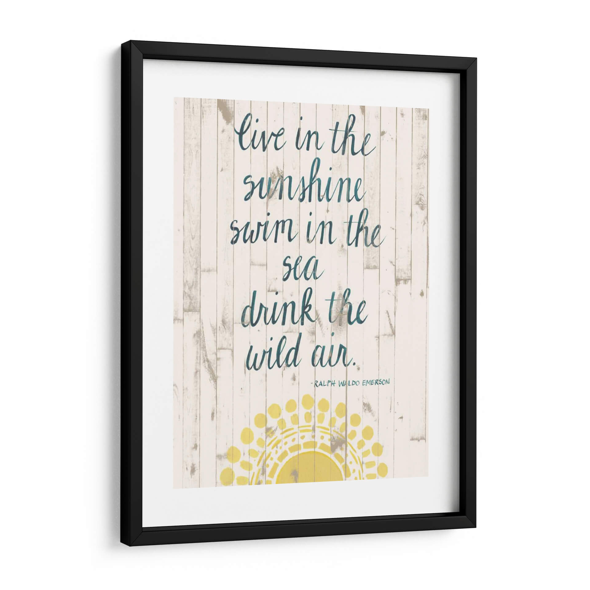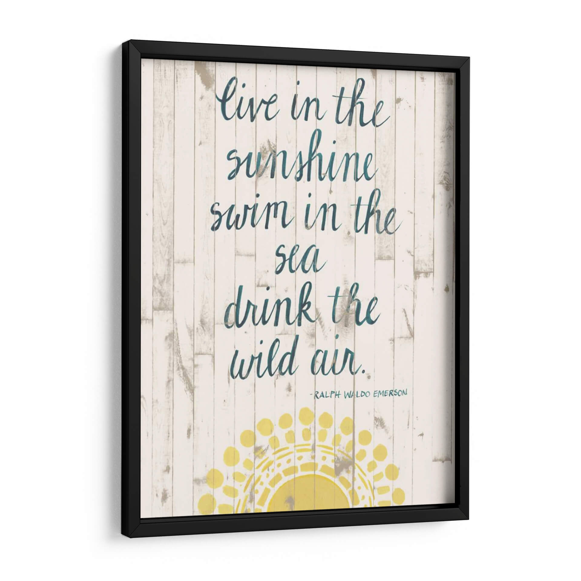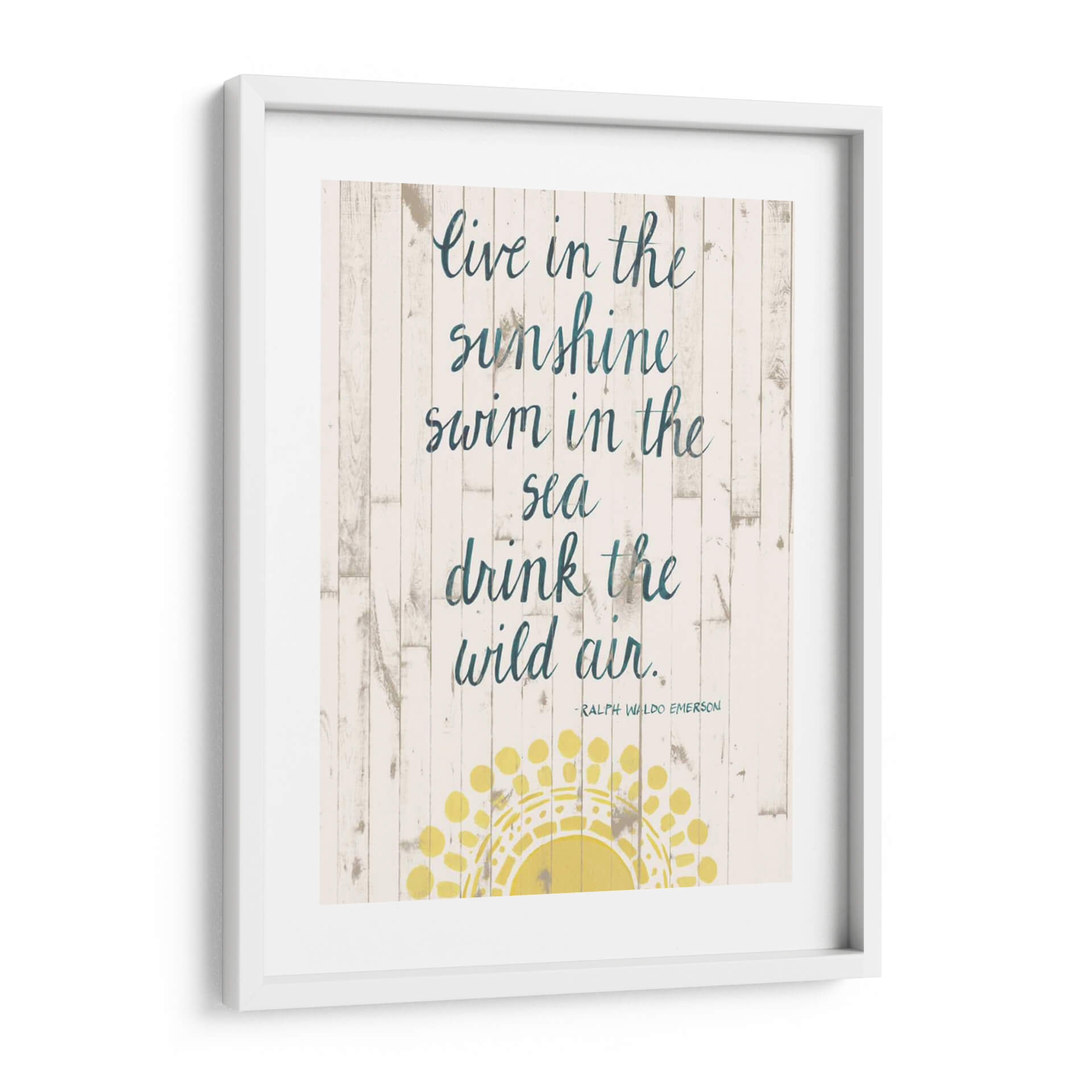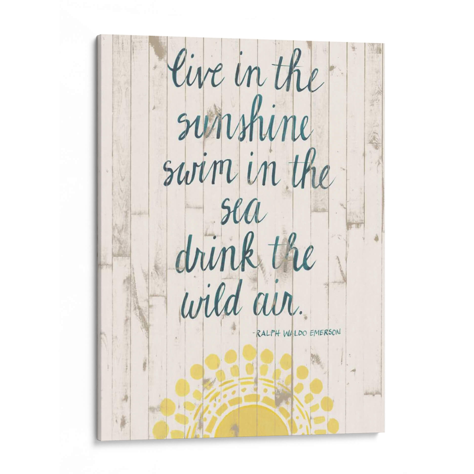 Inspira tu hogar con 'Cita De Sol Iv', una obra de arte de Grace Popp que captura la esencia del verano y la libertad. Este cuadro decorativo presenta una cita inspiradora sobre un fondo rústico de tablones de madera blanqueada, evocando la tranquilidad de la costa. Los versos "Live in the sunshine, swim in the sea, drink the wild air" resuenan con un espíritu aventurero y una conexión profunda con la naturaleza. La paleta de colores, dominada por blancos desgastados, tonos tierra y acentos de azul petróleo en la caligrafía, crea una atmósfera serena y costera. Un sol estilizado en tonos amarillos vibrantes ilumina la parte inferior de la composición, añadiendo un toque de calidez y optimismo. Perfecta para salones, dormitorios o espacios de oficina que buscan un toque de inspiración playera y un ambiente relajado. Este cuadro decorativo es ideal para quienes aprecian el arte con mensajes positivos y un diseño que fusiona lo rústico con lo moderno. Añade una dosis de luz y aire fresco a tu decoración con esta pieza única.