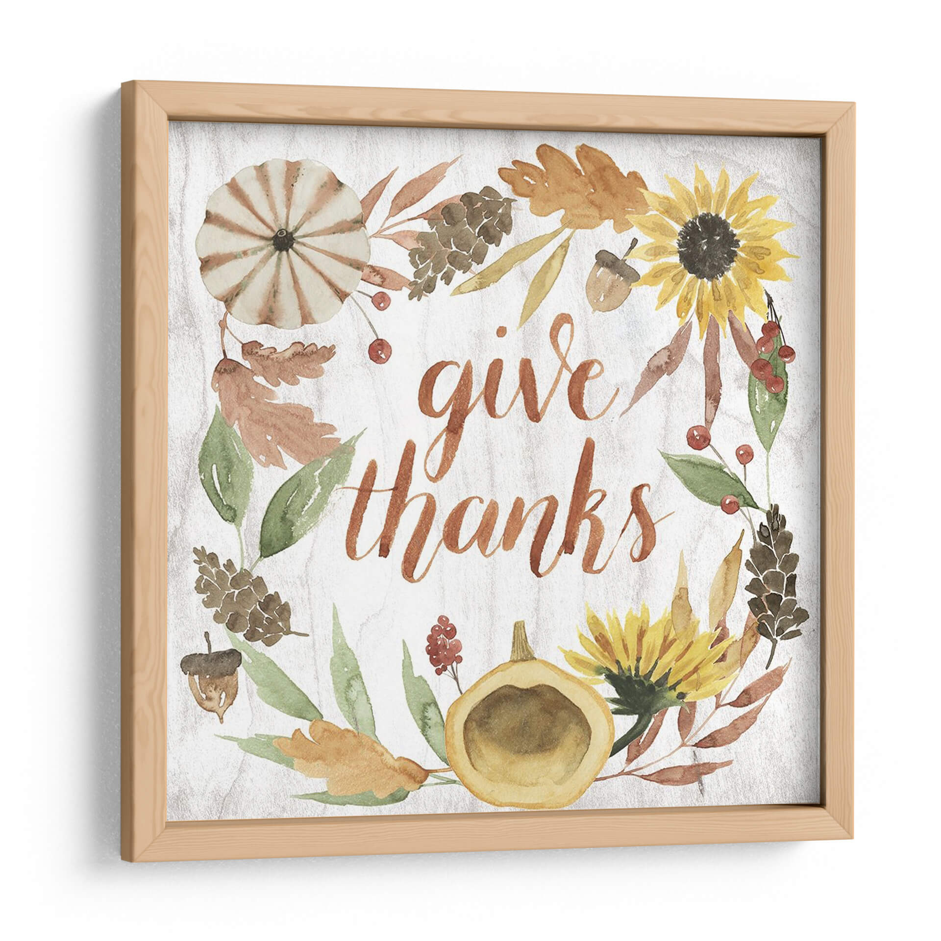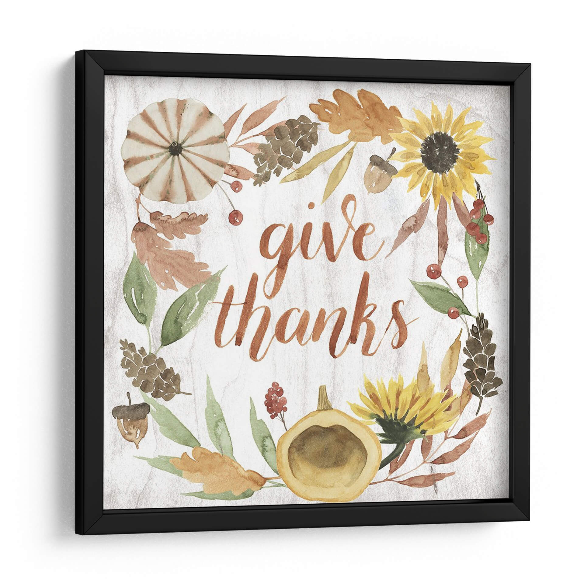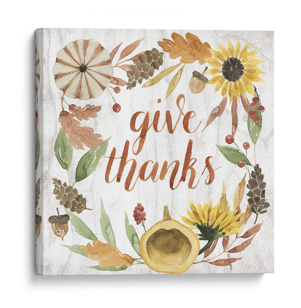 Celebra la gratitud y la calidez de la temporada con "Cornucopia Moderna I", una obra de arte que encapsula el espíritu del otoño. Esta pieza presenta una encantadora corona de elementos otoñales, incluyendo girasoles vibrantes, calabazas rústicas, hojas en tonos tierra y piñas, todo ello enmarcando la frase "give thanks" (da gracias) en una caligrafía fluida y elegante. Los colores cálidos y terrosos, junto con las sutiles texturas que imitan la madera, crean una atmósfera acogedora y serena, perfecta para infundir un sentimiento de apreciación en tu hogar. El estilo, que combina la acuarela con un toque moderno, hace que esta obra sea versátil, ideal para cocinas, comedores o salas de estar, especialmente durante las festividades de Acción de Gracias o en cualquier momento del año en que desees un recordatorio de las cosas por las que estar agradecido. Su composición circular y la tipografía atractiva la convierten en un punto focal amigable y lleno de significado, añadiendo un toque de encanto rústico y contemporáneo a tu decoración.