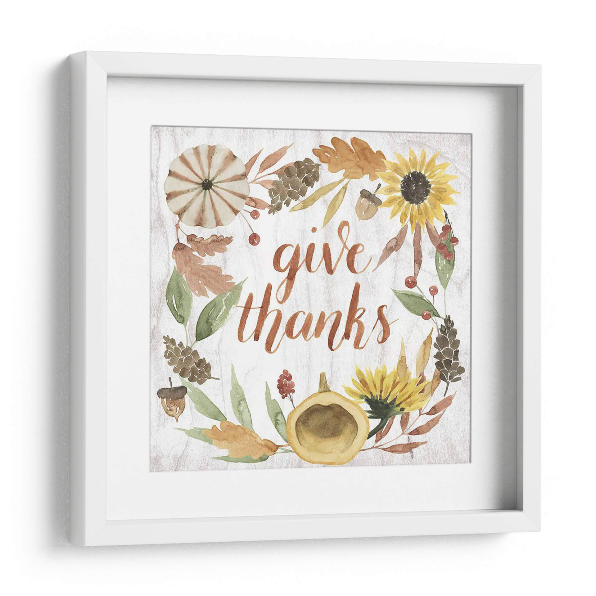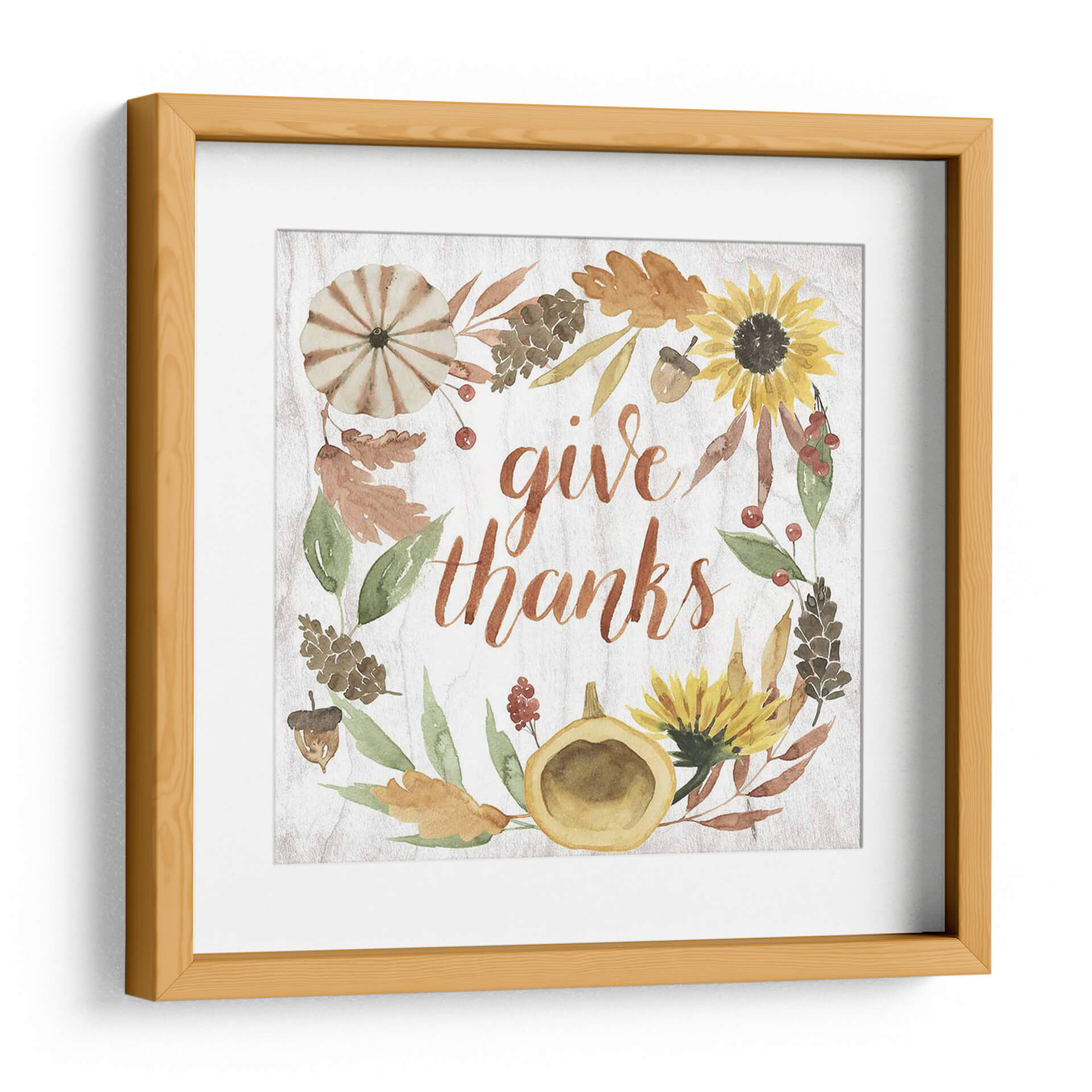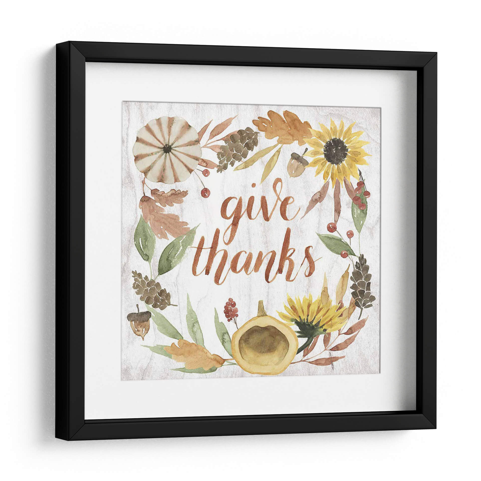 Celebra la gratitud y la calidez de la temporada con "Cornucopia Moderna I", una obra de arte que encapsula el espíritu del otoño. Esta pieza presenta una encantadora corona de elementos otoñales, incluyendo girasoles vibrantes, calabazas rústicas, hojas en tonos tierra y piñas, todo ello enmarcando la frase "give thanks" (da gracias) en una caligrafía fluida y elegante. Los colores cálidos y terrosos, junto con las sutiles texturas que imitan la madera, crean una atmósfera acogedora y serena, perfecta para infundir un sentimiento de apreciación en tu hogar. El estilo, que combina la acuarela con un toque moderno, hace que esta obra sea versátil, ideal para cocinas, comedores o salas de estar, especialmente durante las festividades de Acción de Gracias o en cualquier momento del año en que desees un recordatorio de las cosas por las que estar agradecido. Su composición circular y la tipografía atractiva la convierten en un punto focal amigable y lleno de significado, añadiendo un toque de encanto rústico y contemporáneo a tu decoración.