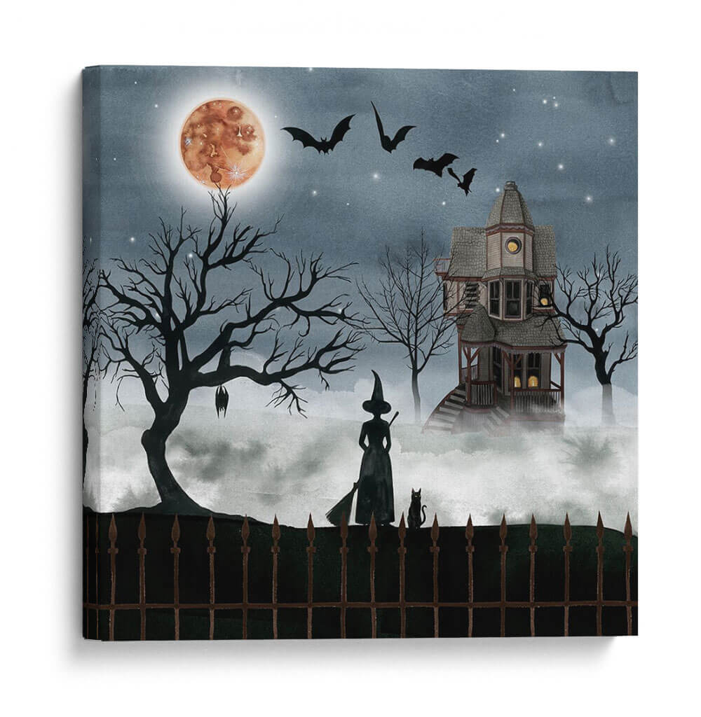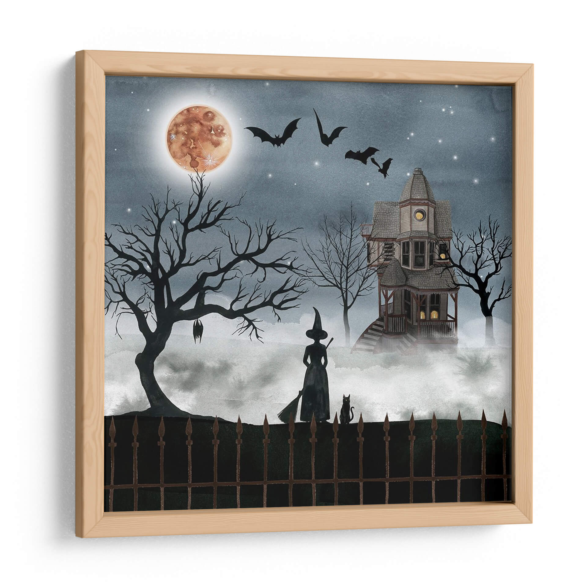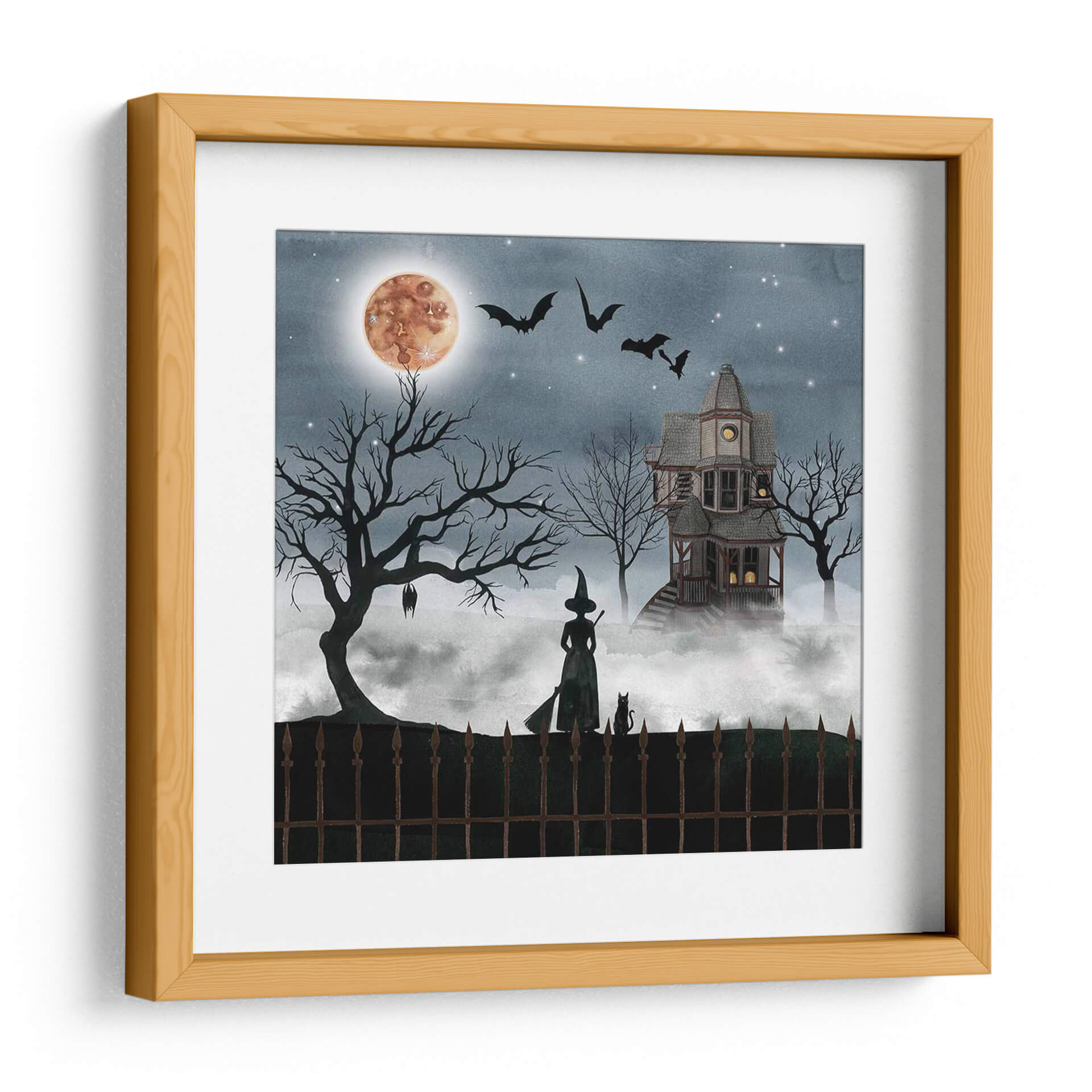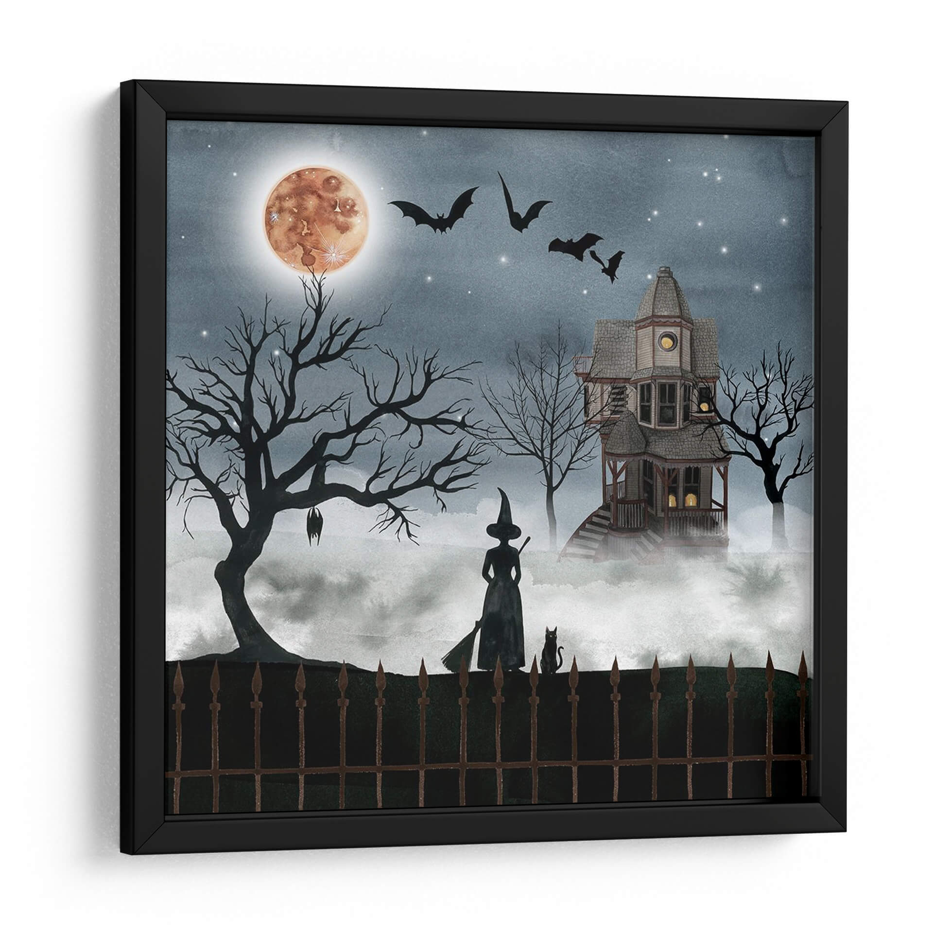 Adéntrate en el misterio y la magia con "Cosecha Luna I", una obra de arte cautivadora de Grace Popp que evoca la atmósfera de una noche de Halloween inolvidable. Esta pieza presenta una silueta icónica de bruja, acompañada de su fiel gato negro, de pie frente a una espeluznante casa victoriana envuelta en niebla. Un árbol retorcido y deshojado se alza majestuosamente a la izquierda, con murciélagos volando bajo una luna llena de tonos anaranjados, creando una escena de ensueño y fantasía. Los tonos fríos y sombríos del cielo nocturno, salpicado de estrellas tenues, contrastan con el cálido resplandor que emana de las ventanas de la casa, añadiendo un toque de intriga. El estilo artístico, que fusiona elementos góticos con un toque de acuarela digital, crea una textura visual única. "Cosecha Luna I" es perfecta para añadir un toque de encanto y misterio a tu decoración, ideal para espacios como salones, estudios o incluso habitaciones temáticas, transportando a quien la contemple a un mundo de fantasía y tradición. Este cuadro decorativo es una invitación a celebrar la temporada y la imaginación.