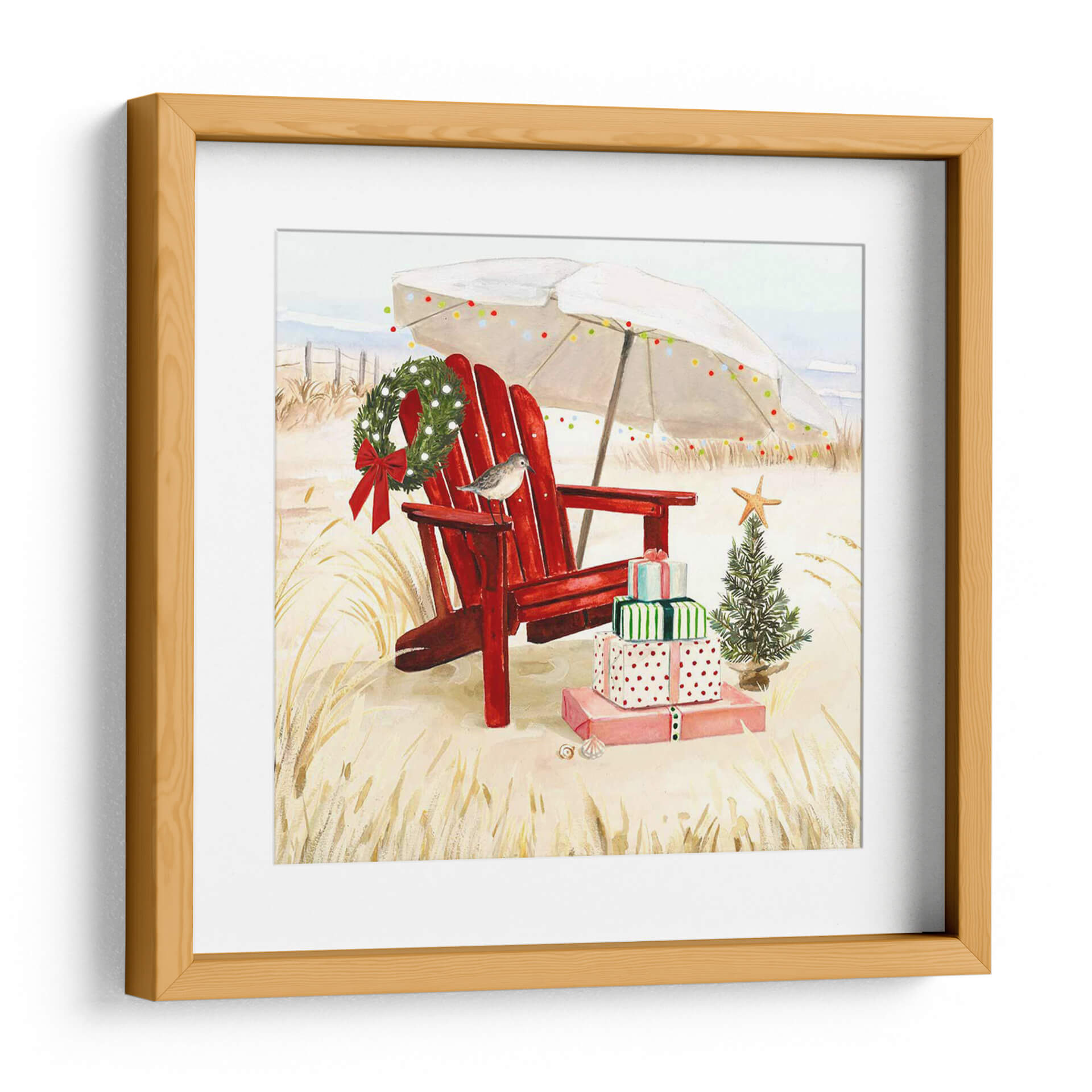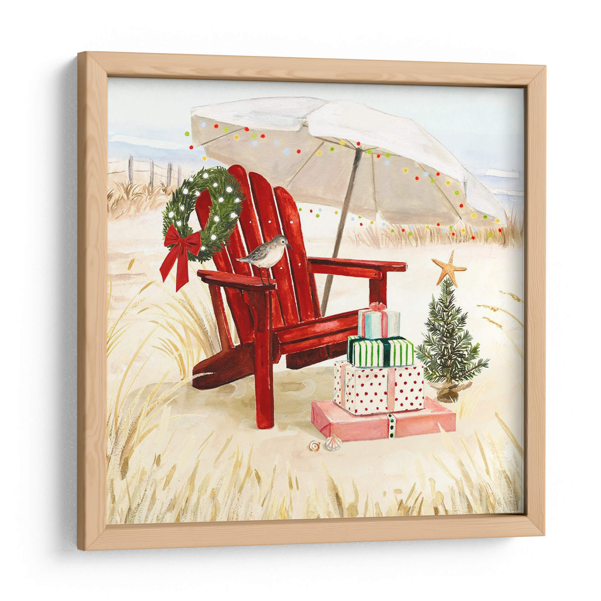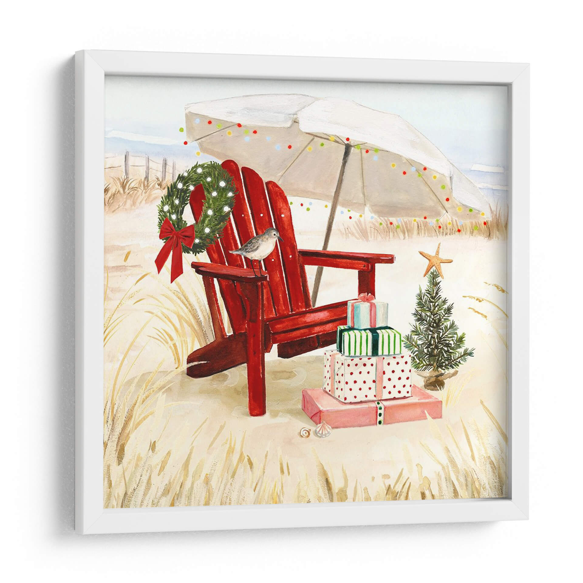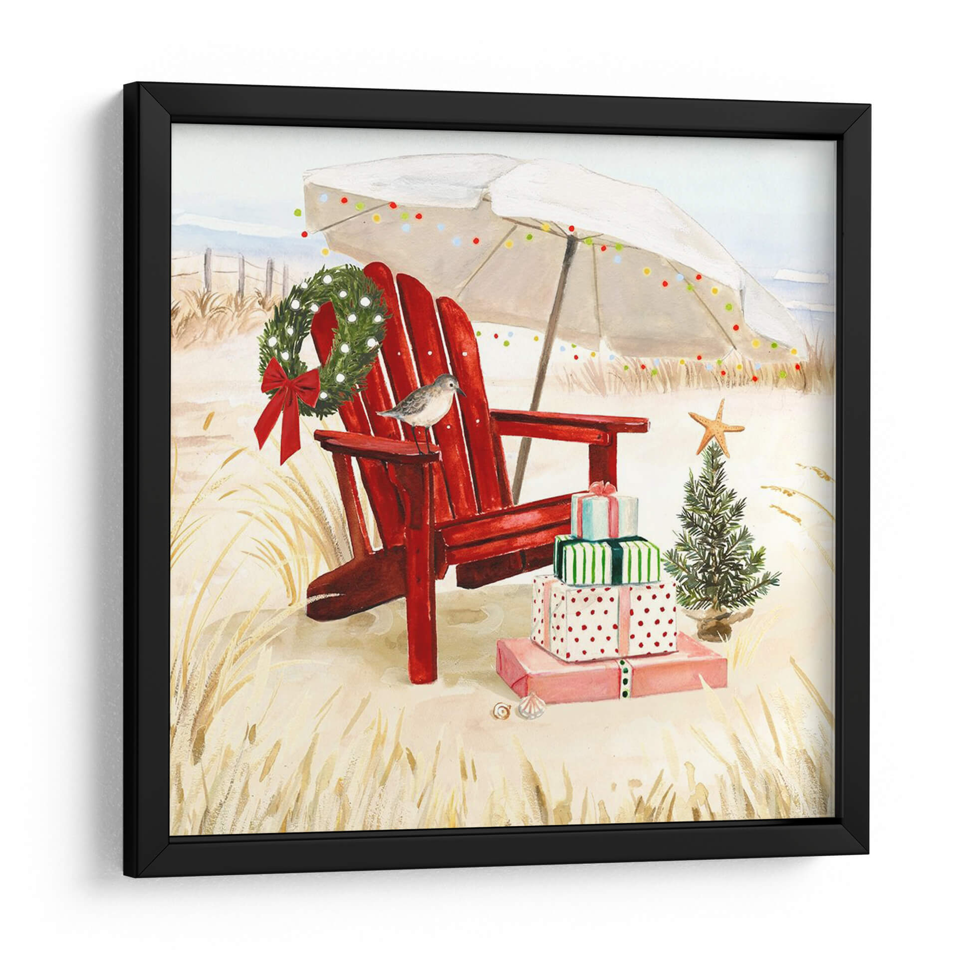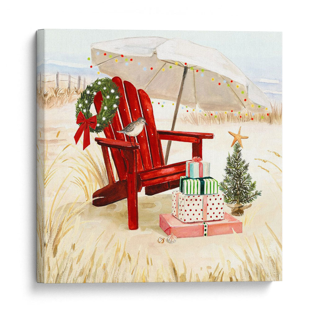 Sumérgete en la magia de unas fiestas costeras con "Costa De Navidad Ii", una obra de arte que captura la esencia de la celebración en un entorno playero. Este cuadro decorativo presenta una icónica silla roja de Adirondack, perfectamente posicionada sobre la arena dorada, invitando a la relajación. Sobre ella y a su lado, se apilan regalos envueltos con cintas festivas, junto a un pequeño árbol de Navidad adornado con una estrella de mar, y una guirnalda verde esmeralda cuelga delicadamente del respaldo de la silla. Una sombrilla blanca, decorada con luces de colores, ofrece un toque de calidez y alegría veraniega, mientras una pequeña ave posada en la silla añade un detalle encantador y natural. La paleta de colores, dominada por tonos cálidos de arena, el vibrante rojo de la silla y los verdes festivos, crea una atmósfera acogedora y alegre. Ideal para quienes buscan un toque único y festivo en su decoración, este lienzo es perfecto para añadir un espíritu navideño distinto a salones, dormitorios o incluso espacios comerciales que deseen destacar durante la temporada. Transforma tu hogar con esta pieza que evoca la serenidad de la playa combinada con la festividad de la Navidad, creando un ambiente memorable y lleno de encanto.