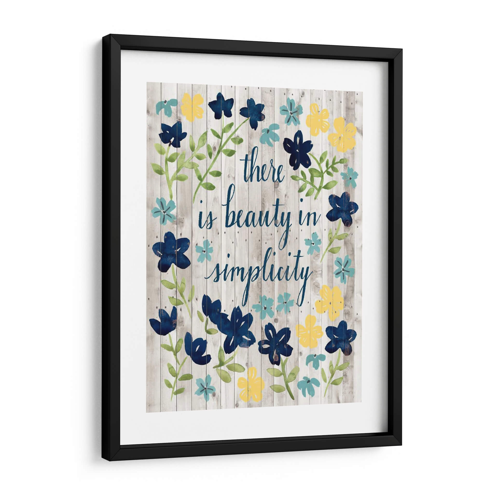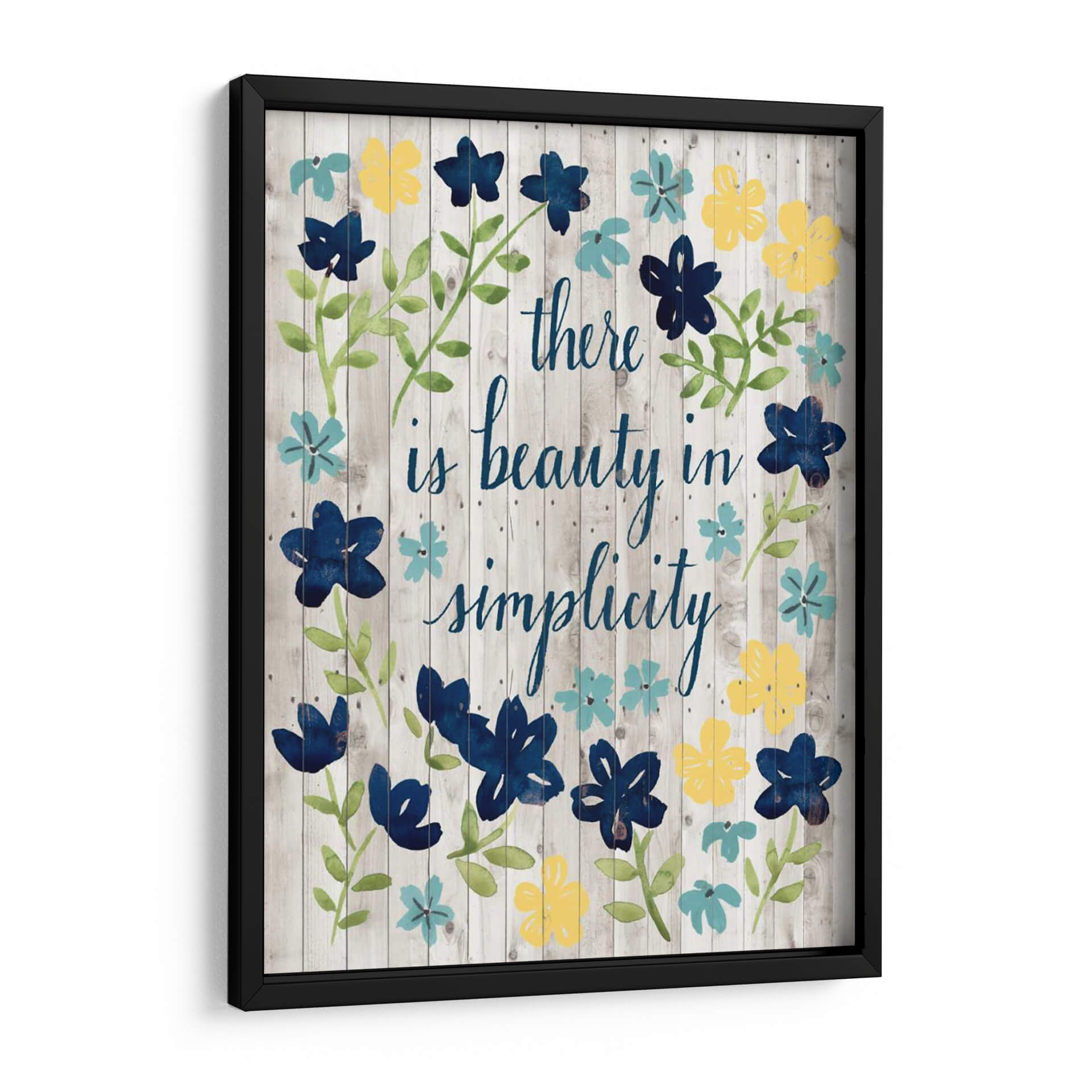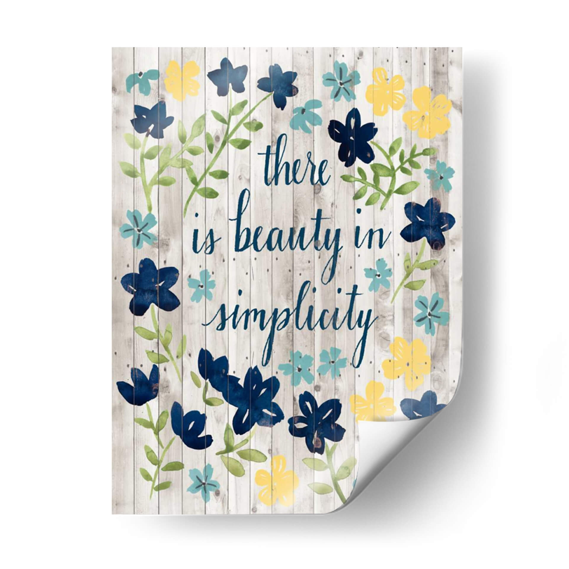 Este encantador cuadro decorativo, titulado "Cottage Inspiration I" del artista Grace Popp, es una celebración de la belleza en la simplicidad, transmitiendo una atmósfera de calma y serenidad. La obra presenta un diseño floral vibrante en tonos de azul profundo, amarillo soleado y turquesa, delicadamente pintado sobre un fondo texturizado de tablones de madera rústica en tonos grises. La caligrafía fluida en azul, con el inspirador mensaje "there is beauty in simplicity", añade un toque personal y reflexivo a la composición. El estilo de pintura a acuarela y las pinceladas sueltas otorgan a la pieza una cualidad etérea y artesanal. Ideal para espacios que buscan un toque de naturaleza y positividad, como dormitorios, salas de estar, cocinas o incluso oficinas hogareñas, este cuadro decorativo en lienzo es perfecto para añadir color y un mensaje inspirador a cualquier pared. Su diseño versátil se adapta a decoraciones rústicas, de granja o contemporáneas, aportando luz y una sensación de tranquilidad.