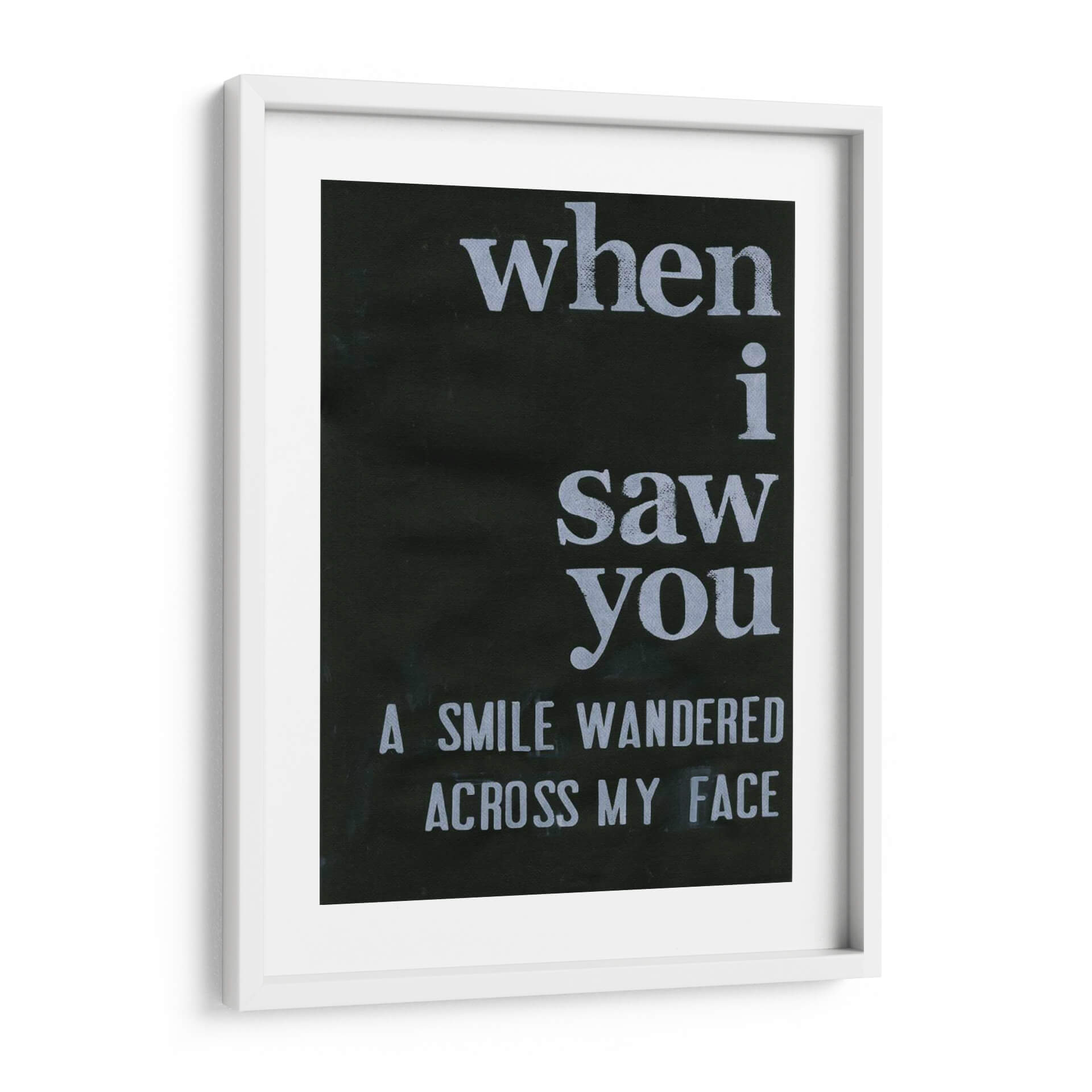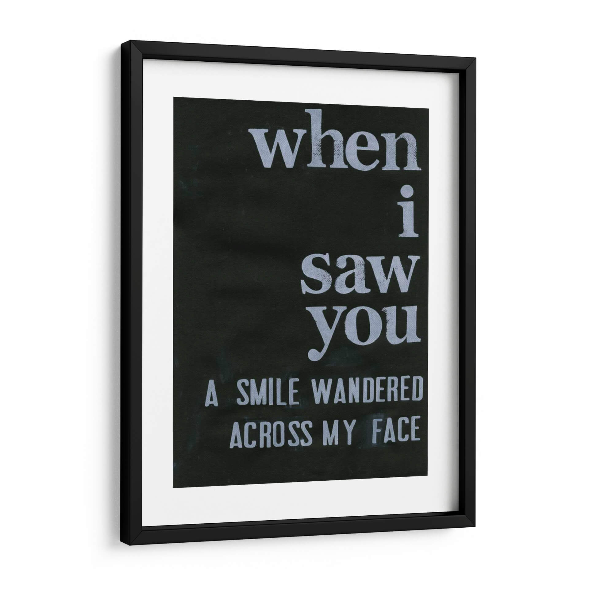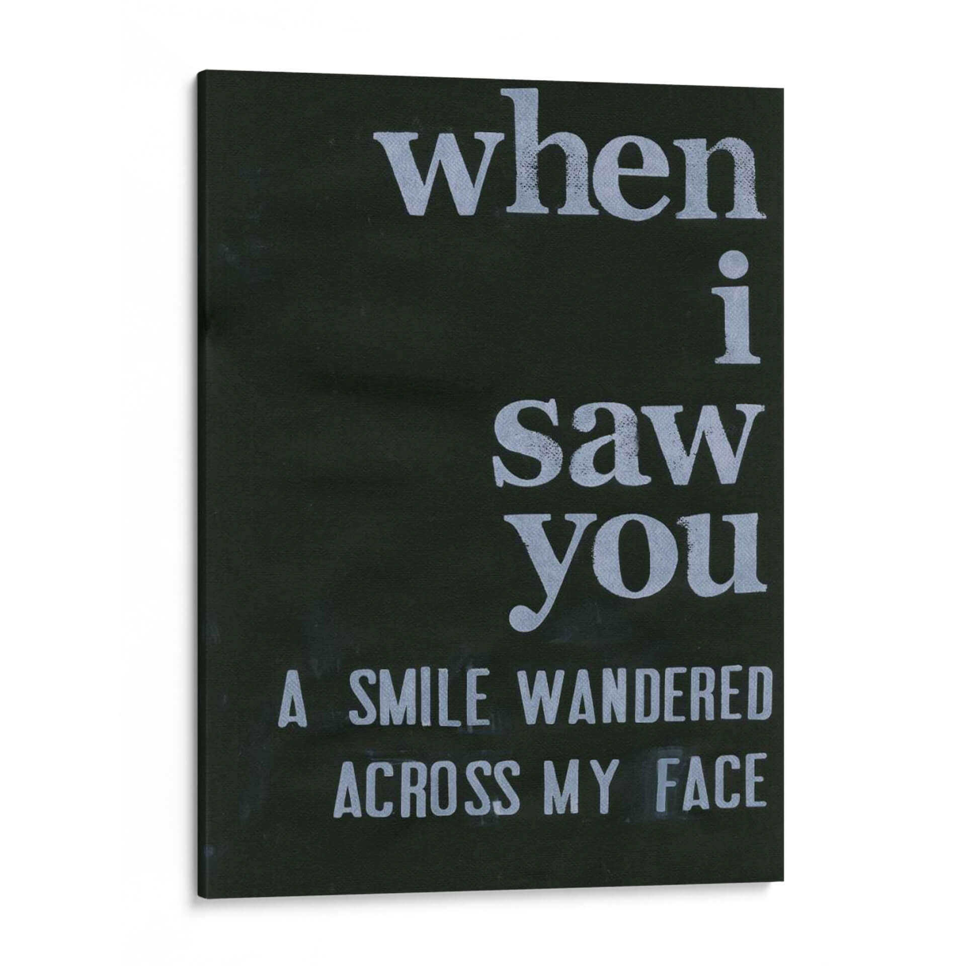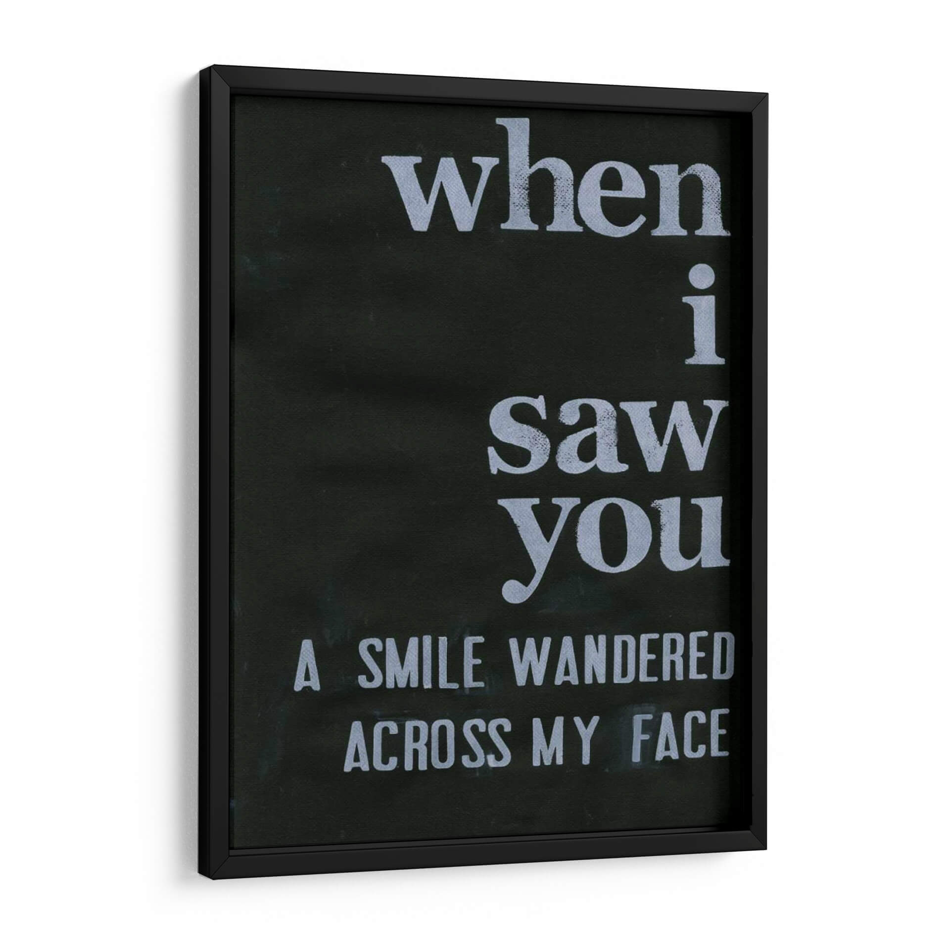 Sumérgete en la nostalgia y la dulzura con "Cuando Te Vi... II", una obra de arte textual que captura un momento íntimo y universal. Esta pieza presenta una tipografía clara y legible sobre un fondo oscuro, evocando una sensación de profundidad y reflexión. Las letras, de un tono grisáceo suave, contrastan sutilmente con el negro intenso del fondo, creando un efecto visual cautivador que invita a la contemplación. La frase "When I saw you... A smile wandered across my face" se despliega con una elegancia sencilla, transmitiendo la alegría espontánea y el recuerdo tierno de un encuentro significativo. El estilo minimalista y el uso de texto como elemento principal de la composición la convierten en una pieza moderna y versátil, perfecta para añadir un toque personal y emotivo a cualquier espacio. Ideal para salones, dormitorios o estudios, este cuadro decorativo resonará con aquellos que aprecian las expresiones sinceras y los momentos fugaces de felicidad. Su diseño limpio y su mensaje universal la hacen una adición encantadora y significativa a tu decoración.