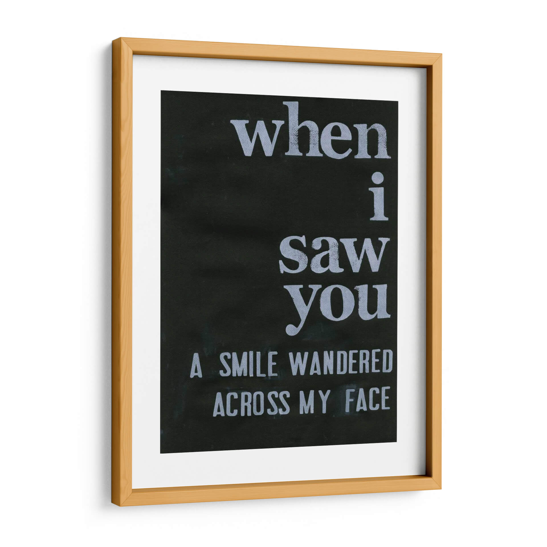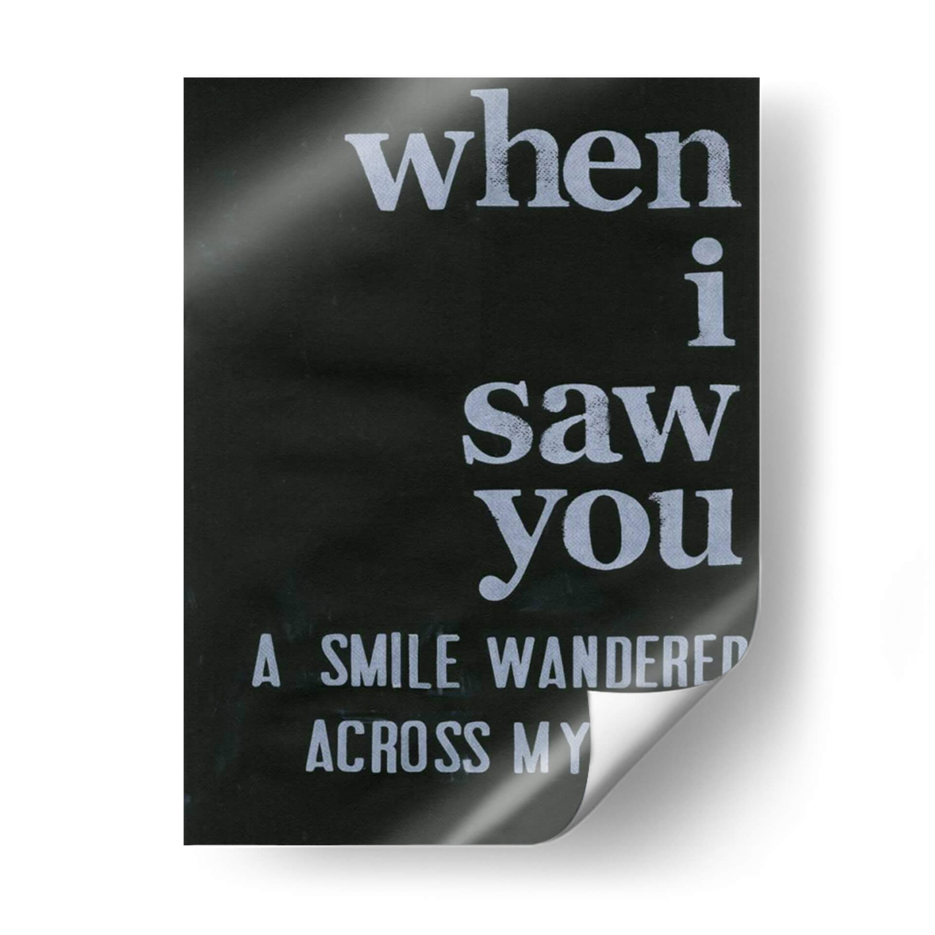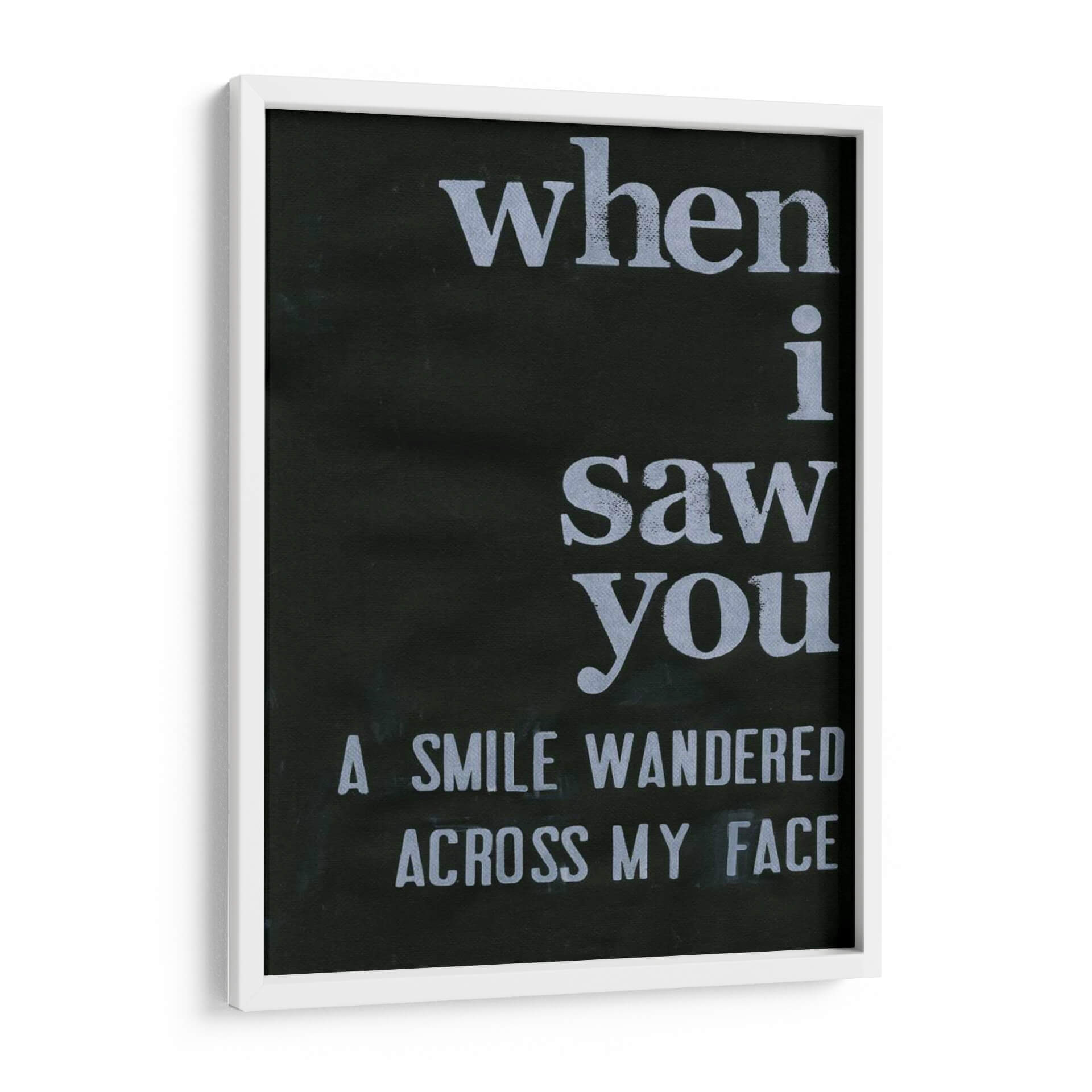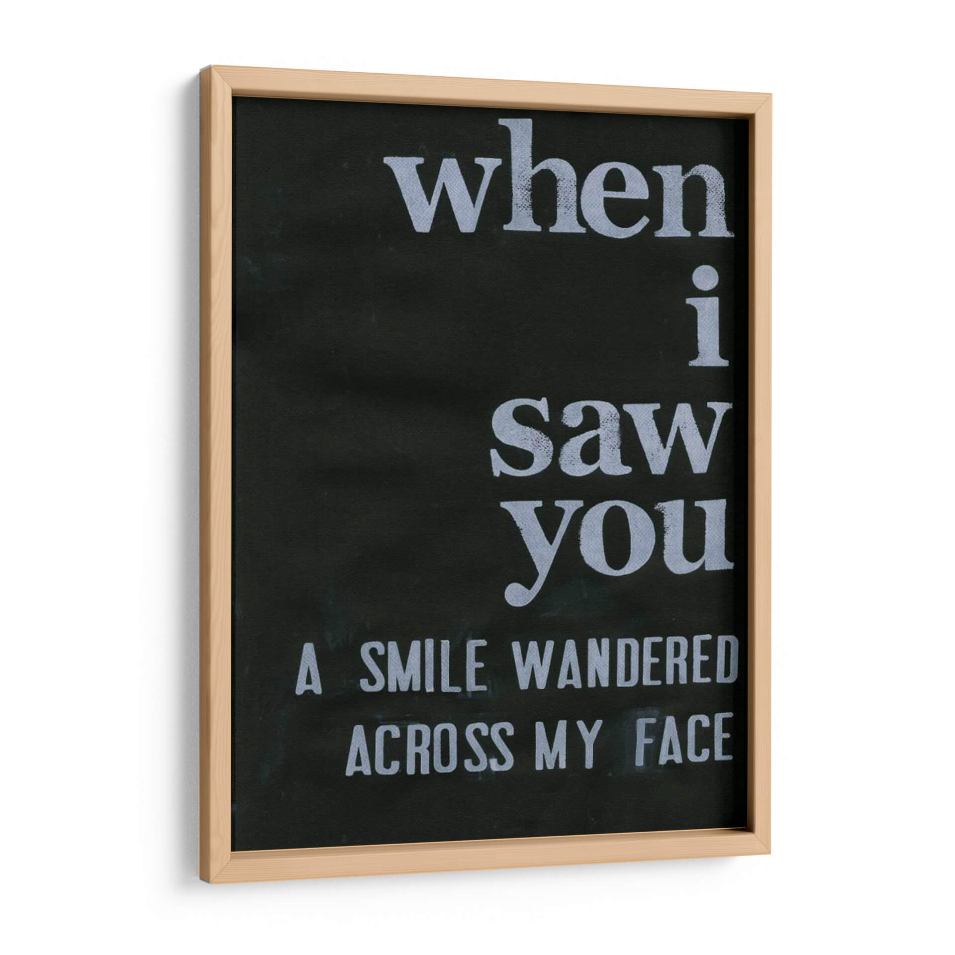 Sumérgete en la nostalgia y la dulzura con "Cuando Te Vi... II", una obra de arte textual que captura un momento íntimo y universal. Esta pieza presenta una tipografía clara y legible sobre un fondo oscuro, evocando una sensación de profundidad y reflexión. Las letras, de un tono grisáceo suave, contrastan sutilmente con el negro intenso del fondo, creando un efecto visual cautivador que invita a la contemplación. La frase "When I saw you... A smile wandered across my face" se despliega con una elegancia sencilla, transmitiendo la alegría espontánea y el recuerdo tierno de un encuentro significativo. El estilo minimalista y el uso de texto como elemento principal de la composición la convierten en una pieza moderna y versátil, perfecta para añadir un toque personal y emotivo a cualquier espacio. Ideal para salones, dormitorios o estudios, este cuadro decorativo resonará con aquellos que aprecian las expresiones sinceras y los momentos fugaces de felicidad. Su diseño limpio y su mensaje universal la hacen una adición encantadora y significativa a tu decoración.