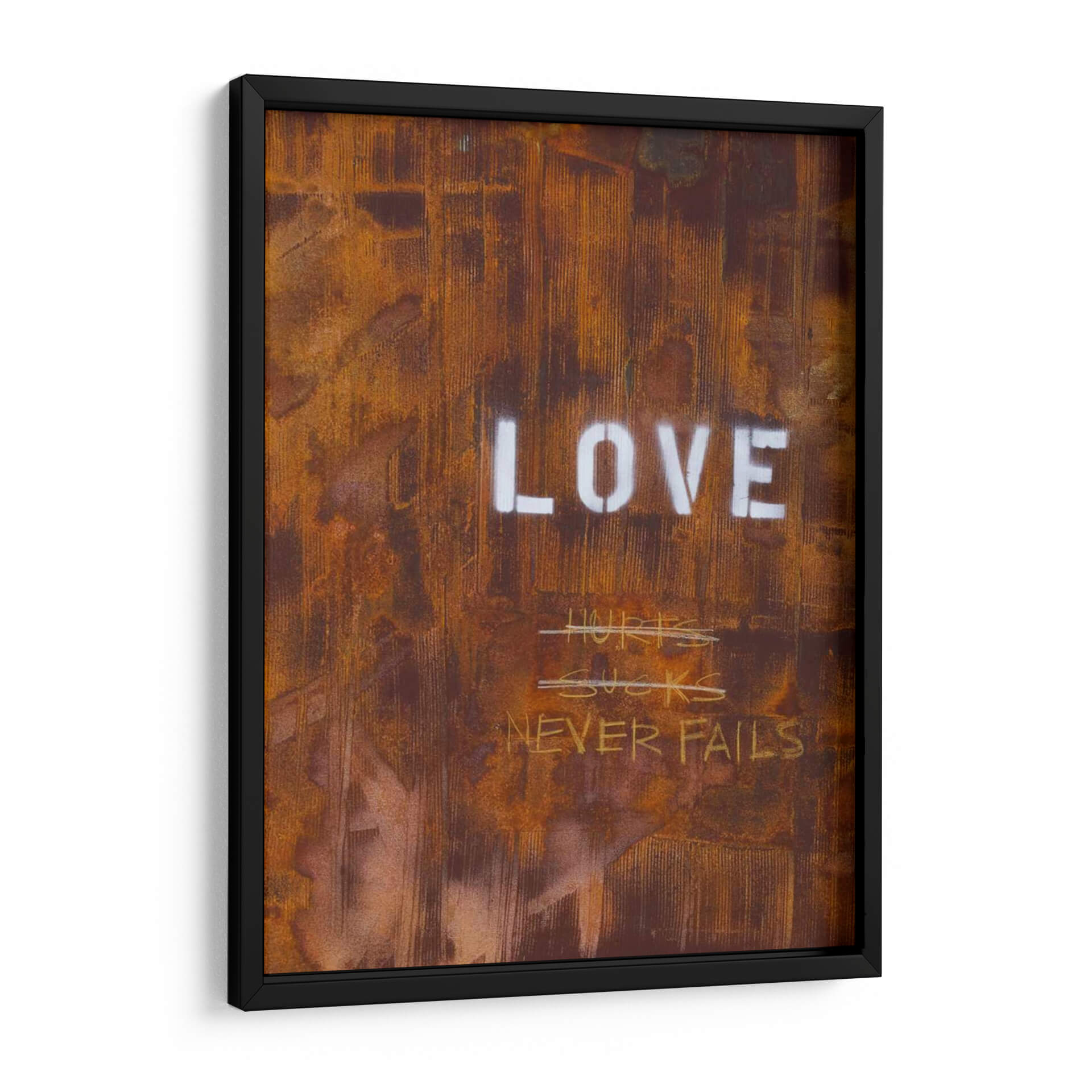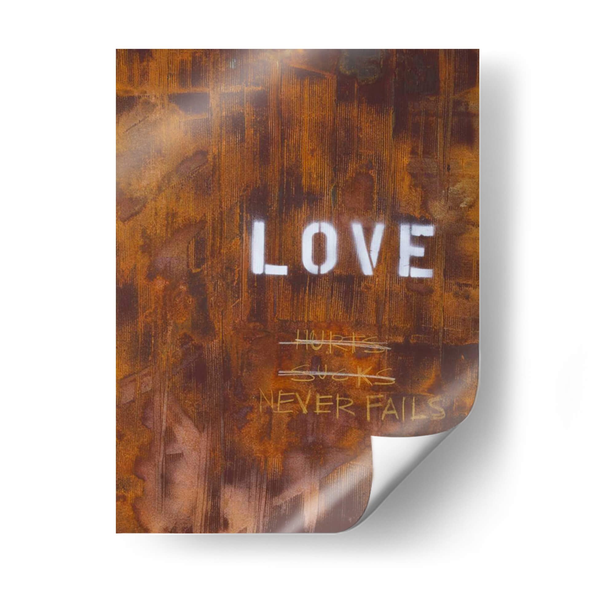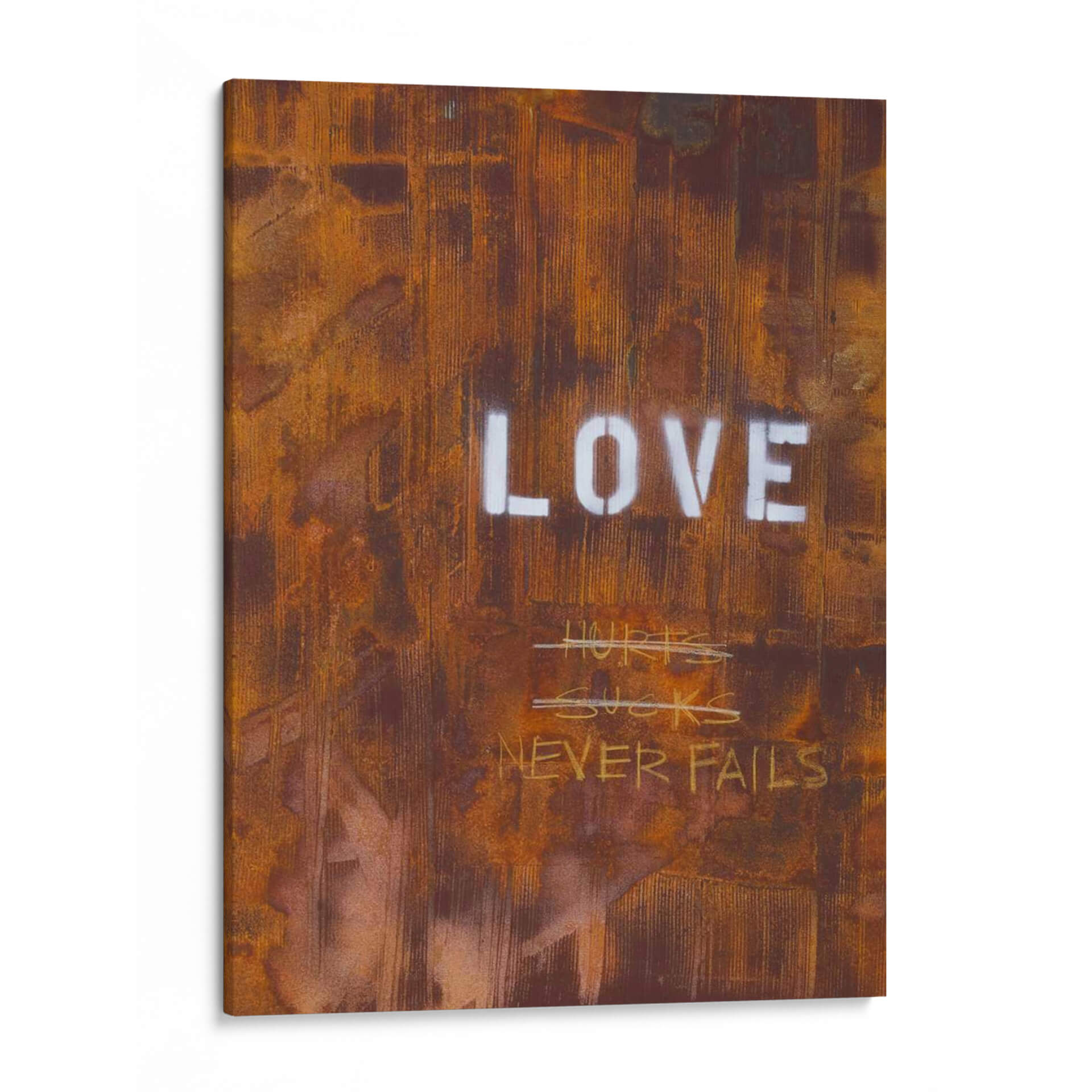El cuadro decorativo "El Amor Nunca Falla Yo" de Kent Youngstrom es una obra de arte contemporáneo que evoca una profunda reflexión sobre la naturaleza del amor. Su textura rica y desgastada, con tonos predominantes de óxido, marrón y toques de blanco, crea una atmósfera industrial y urbana, casi como un grafiti intervenido sobre una superficie metálica corroída. Las palabras "LOVE" en mayúsculas y stencil contrastan con la crudeza del fondo, reforzando el mensaje central. Debajo, escrituras a mano alzada como "HURTS SUCKS" tachadas, seguidas por la afirmación "NEVER FAILS", sugieren un viaje emocional, reconociendo las dificultades pero reafirmando la resiliencia del amor verdadero. Esta pieza es ideal para espacios que buscan un toque de carácter, autenticidad y un mensaje inspirador, como una sala de estar moderna, un estudio o una oficina. Su estilo crudo y directo lo convierte en un punto focal impactante que invita a la conversación y a la introspección sobre las experiencias del amor a lo largo de la vida. Aporta una dimensión de profundidad y significado a cualquier decoración.