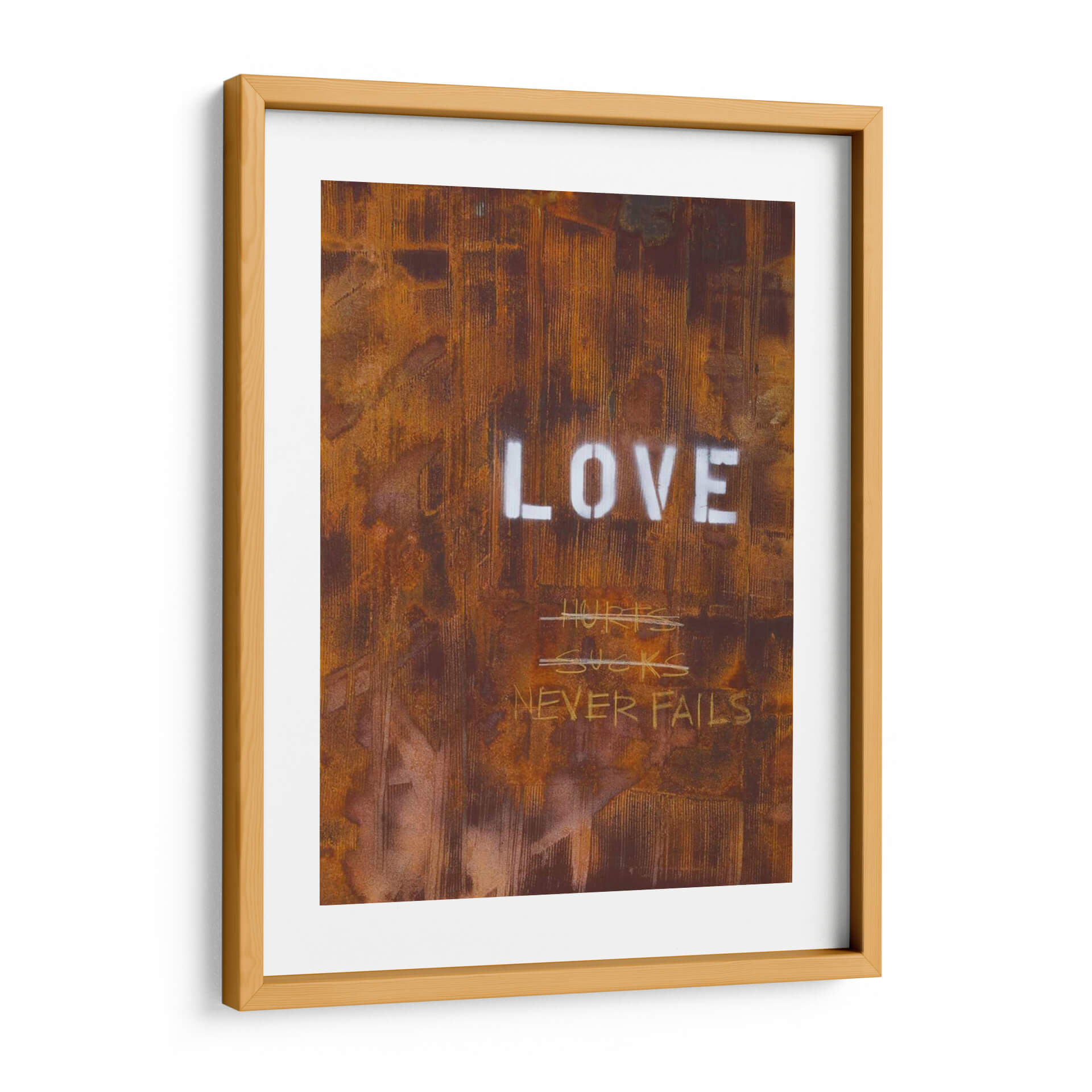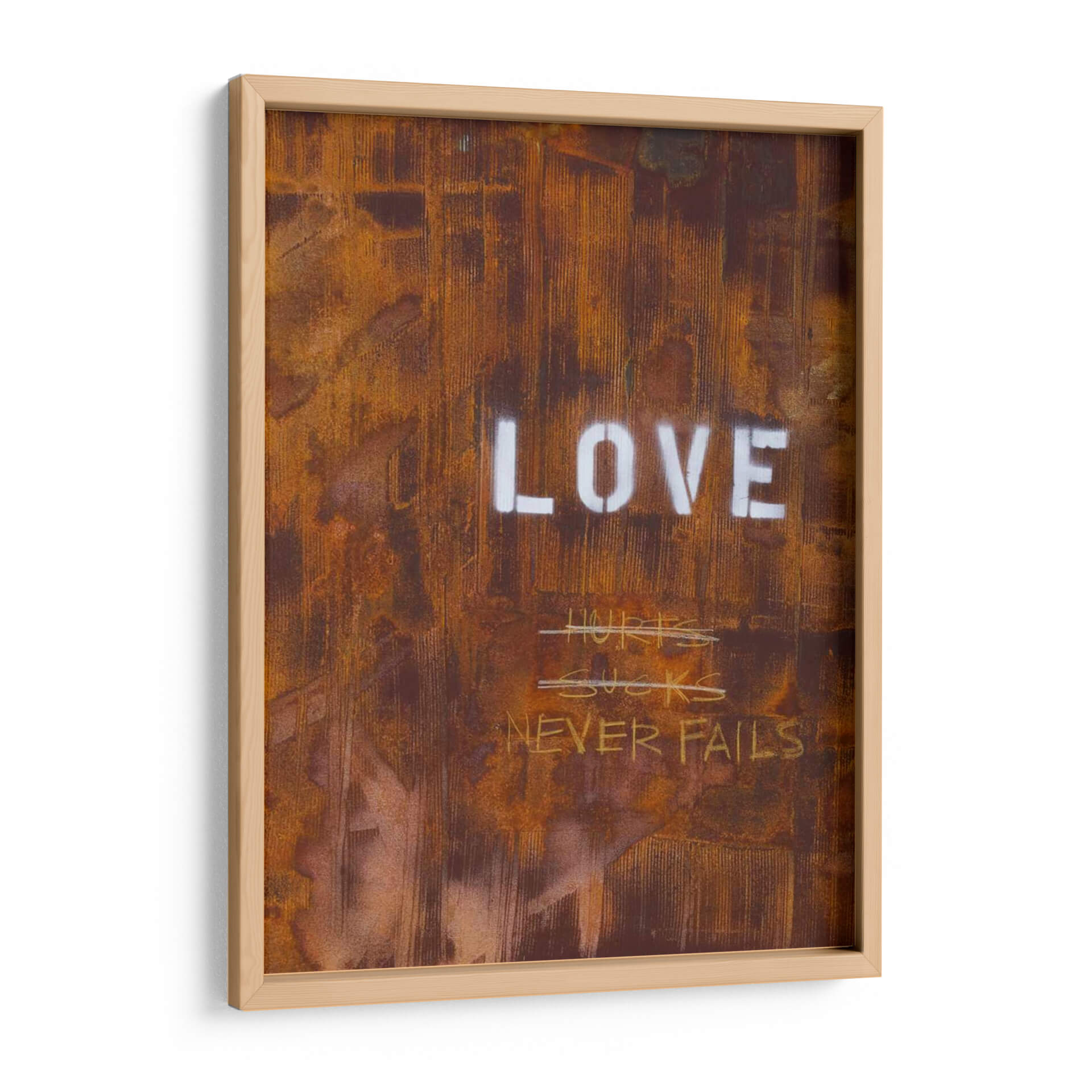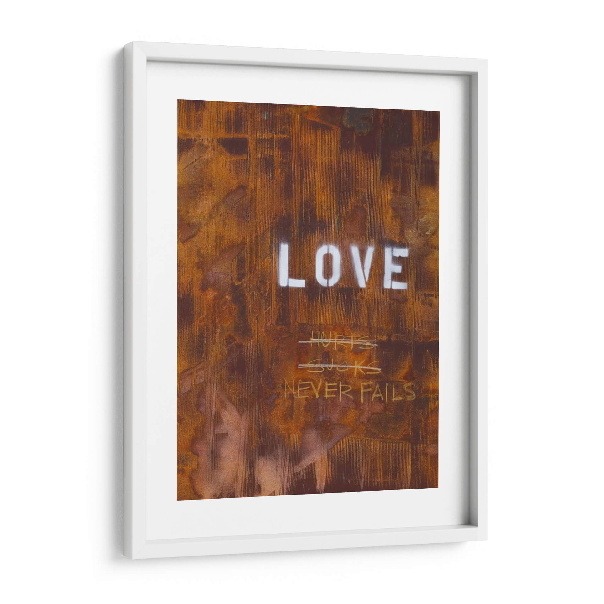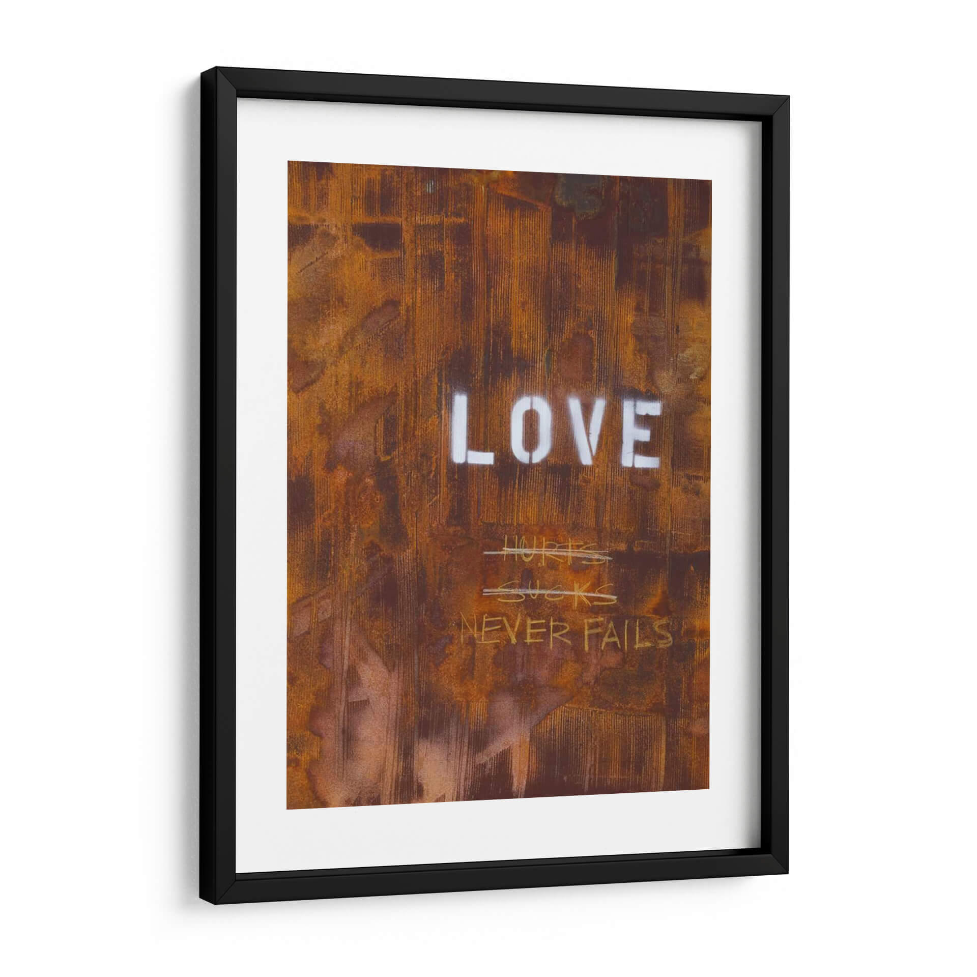 El cuadro decorativo "El Amor Nunca Falla Yo" de Kent Youngstrom es una obra de arte contemporáneo que evoca una profunda reflexión sobre la naturaleza del amor. Su textura rica y desgastada, con tonos predominantes de óxido, marrón y toques de blanco, crea una atmósfera industrial y urbana, casi como un grafiti intervenido sobre una superficie metálica corroída. Las palabras "LOVE" en mayúsculas y stencil contrastan con la crudeza del fondo, reforzando el mensaje central. Debajo, escrituras a mano alzada como "HURTS SUCKS" tachadas, seguidas por la afirmación "NEVER FAILS", sugieren un viaje emocional, reconociendo las dificultades pero reafirmando la resiliencia del amor verdadero. Esta pieza es ideal para espacios que buscan un toque de carácter, autenticidad y un mensaje inspirador, como una sala de estar moderna, un estudio o una oficina. Su estilo crudo y directo lo convierte en un punto focal impactante que invita a la conversación y a la introspección sobre las experiencias del amor a lo largo de la vida. Aporta una dimensión de profundidad y significado a cualquier decoración.