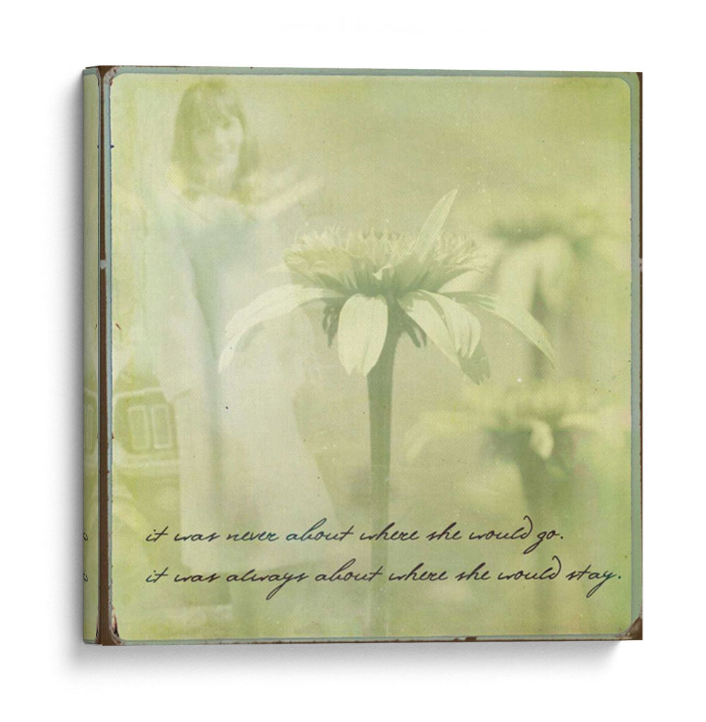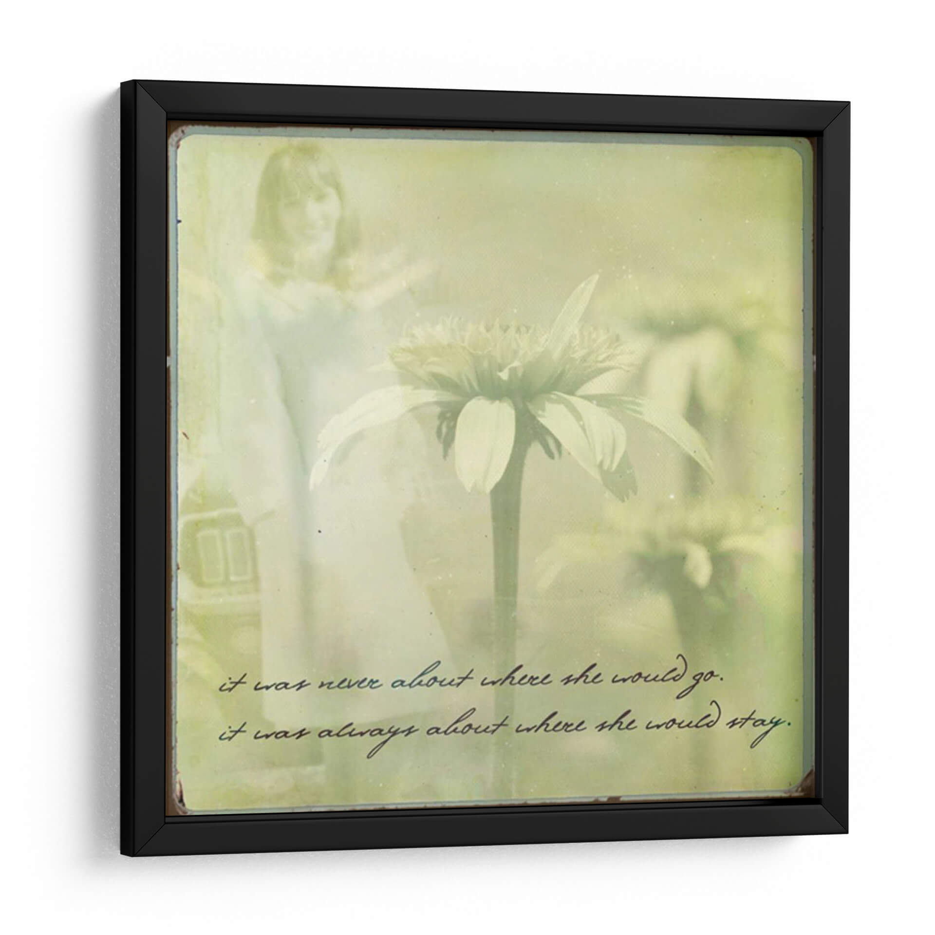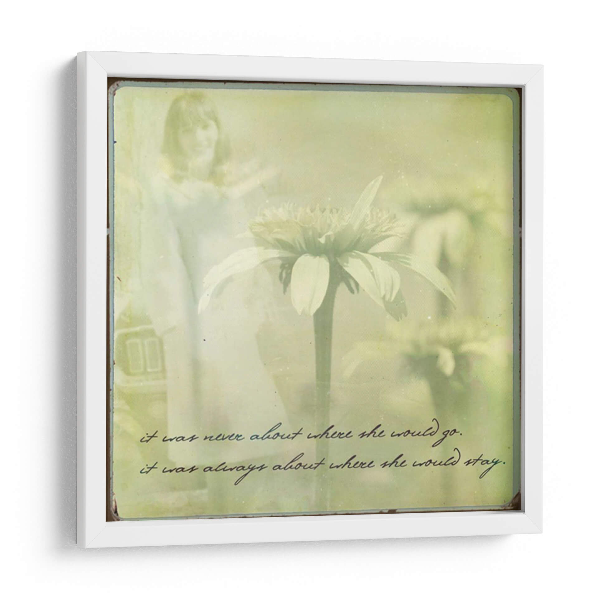 Sumérgete en la serena belleza de "Ella II", una cautivadora obra de arte de Jennifer Jorgensen. Este cuadro decorativo evoca una atmósfera de ensueño, combinando la delicadeza de una flor central con la figura etérea de una mujer en el fondo. La paleta de colores, dominada por suaves tonos verdes y amarillos, crea una sensación de calma y nostalgia. El estilo, que fusiona elementos fotográficos con un toque pictórico y el uso de texto manuscrito, añade una capa de profundidad y emoción. La composición centra la atención en la flor, mientras la figura femenina se desvanece en un halo de luz, sugiriendo recuerdos o presencias sutiles. "Ella II" es ideal para espacios que buscan transmitir paz y reflexión, como un dormitorio, un rincón de lectura o una sala de estar tranquila. Su estética única la convierte en un punto focal inspirador, perfecto para quienes aprecian el arte contemporáneo con un toque poético y sentimental. Añade esta pieza a tu colección para infundir a tu hogar una elegancia atemporal y una invitación a la contemplación.