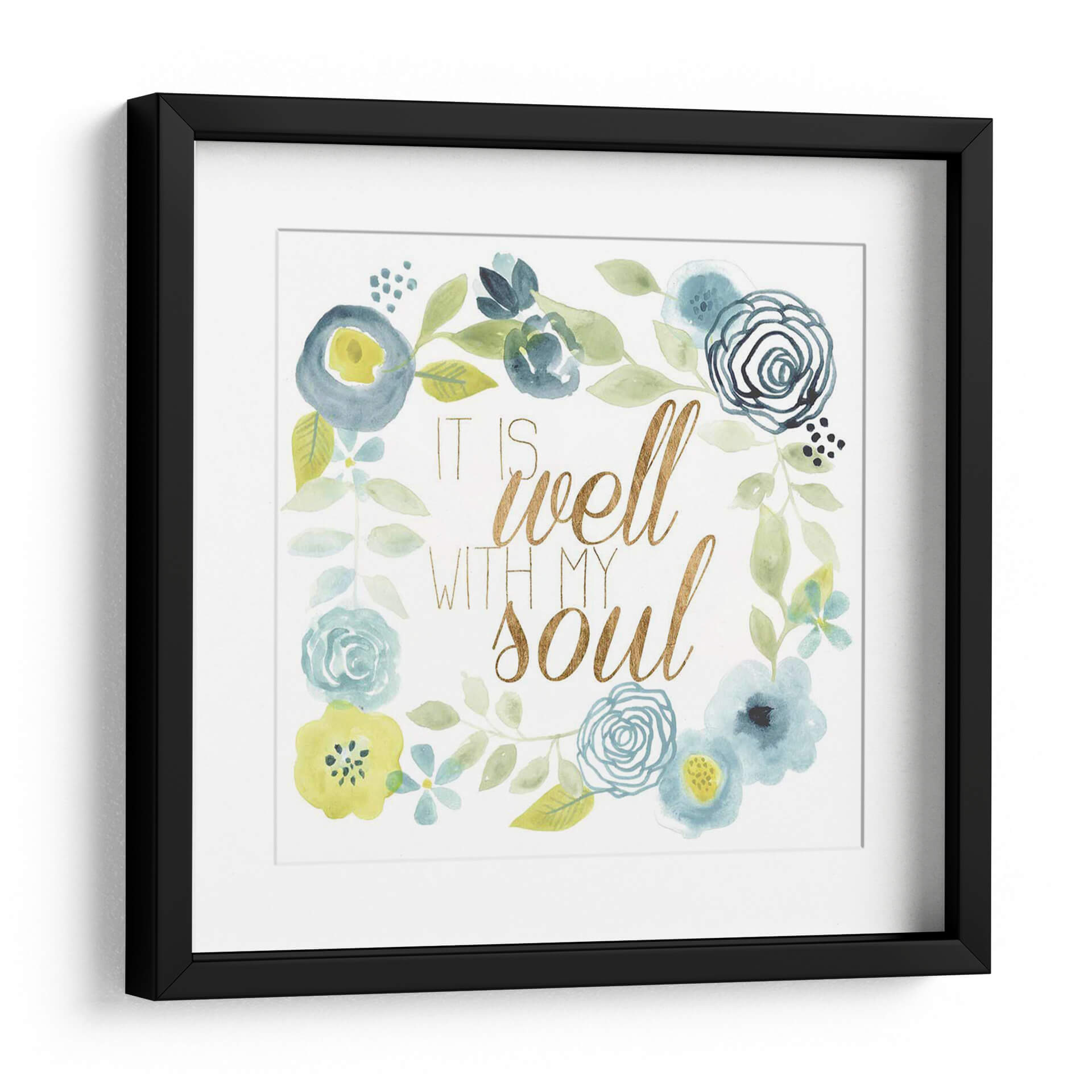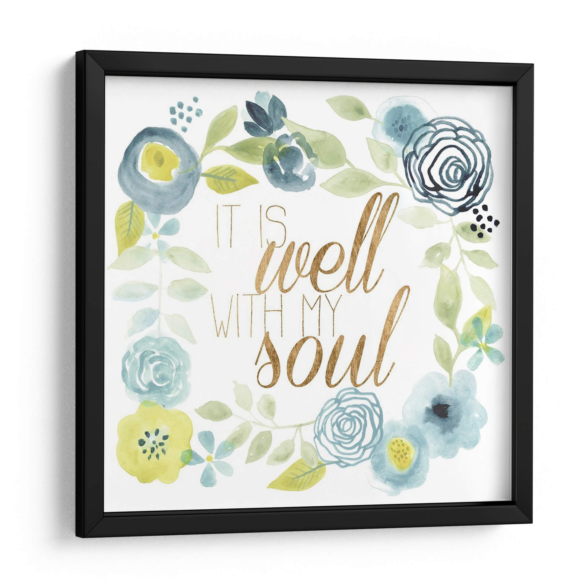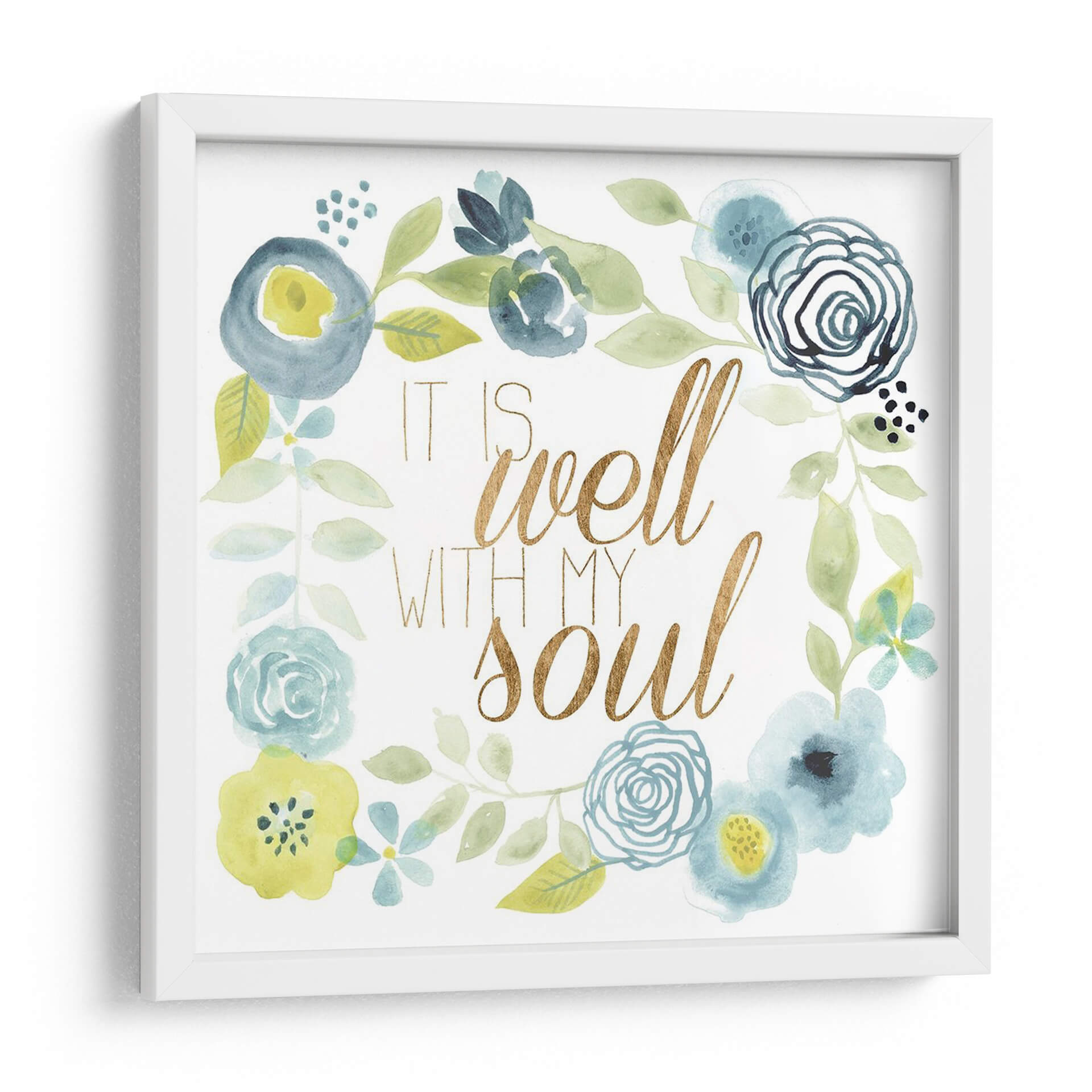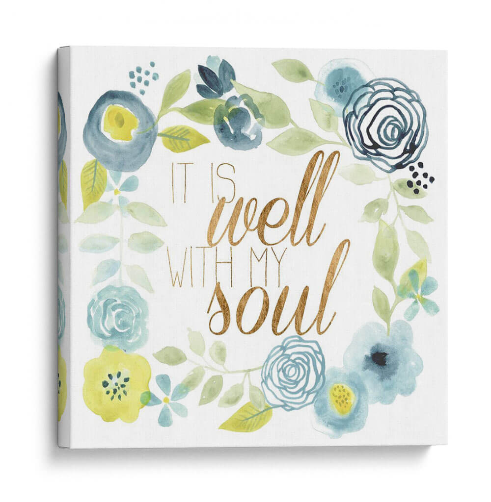 Este encantador cuadro decorativo, titulado 'Esta Bien Ii' del artista Studio W, es una obra de arte que irradia calma y serenidad. La pieza presenta una delicada composición floral en acuarela, con una paleta de colores suaves que incluye tonos azules, verdes y toques de amarillo. Las flores, representadas con trazos fluidos y orgánicos, se entrelazan en un diseño circular, enmarcando la inspiradora frase "It is well with my soul" escrita en una elegante tipografía dorada. La textura de acuarela añade una cualidad etérea y soñadora a la obra, creando un ambiente de paz y bienestar. Este cuadro es ideal para añadir un toque de espiritualidad y belleza a cualquier espacio, ya sea un dormitorio, una sala de estar o un rincón de meditación. Su diseño versátil lo convierte en una pieza de arte de pared perfecta para quienes buscan inspiración y un recordatorio visual de tranquilidad en su hogar. Añade un toque de armonía y estilo a tu decoración con esta pieza única.