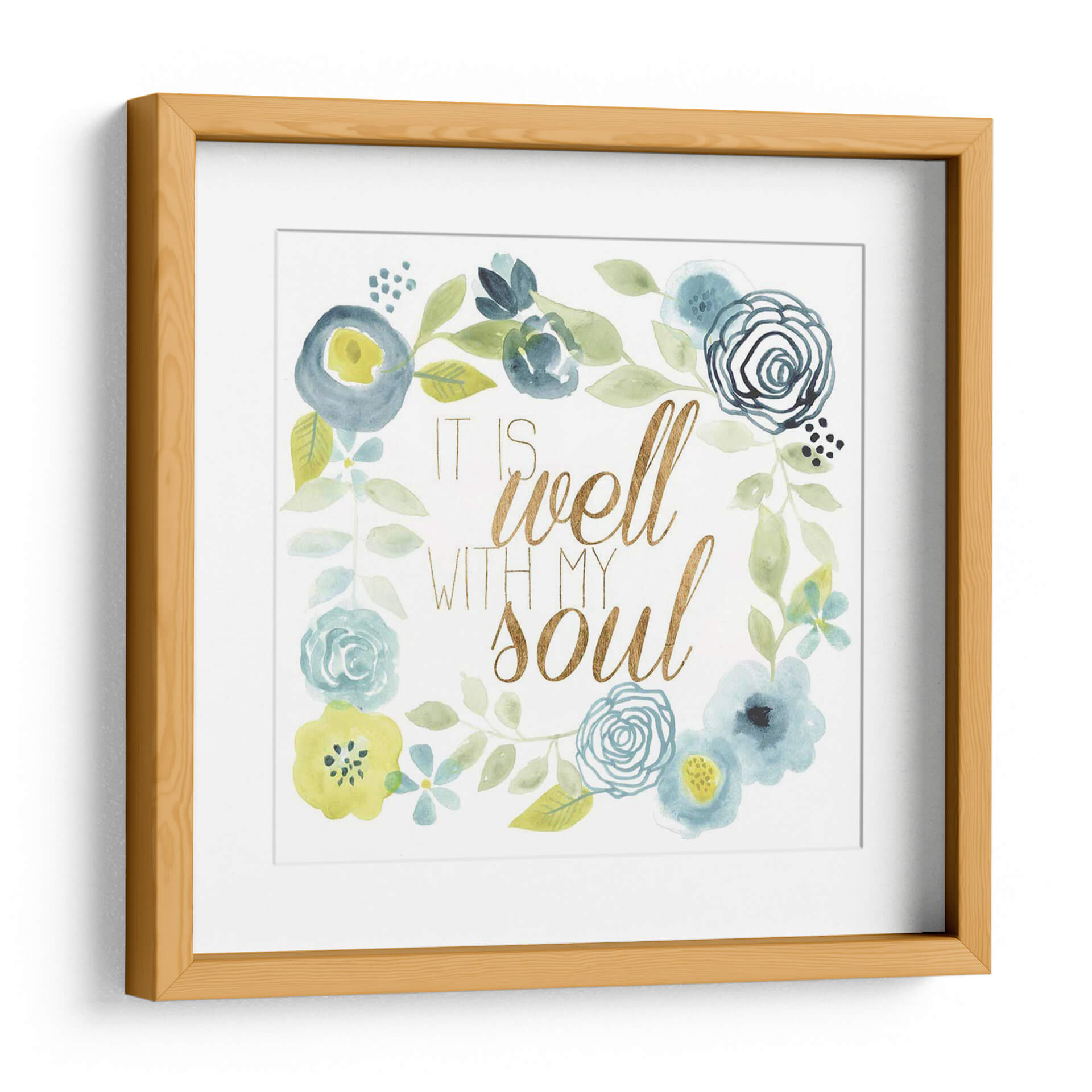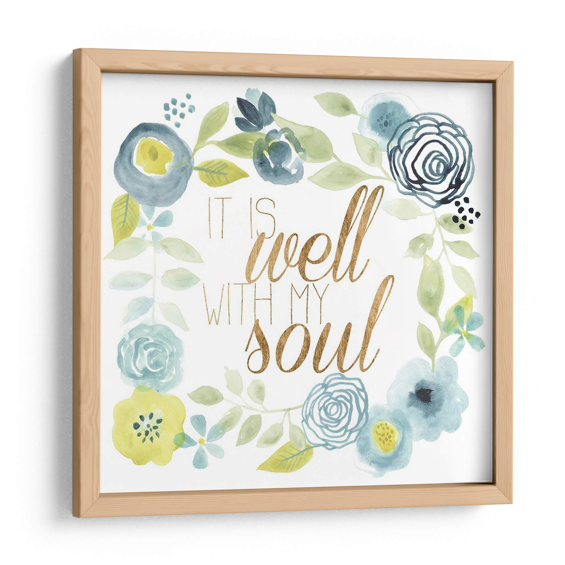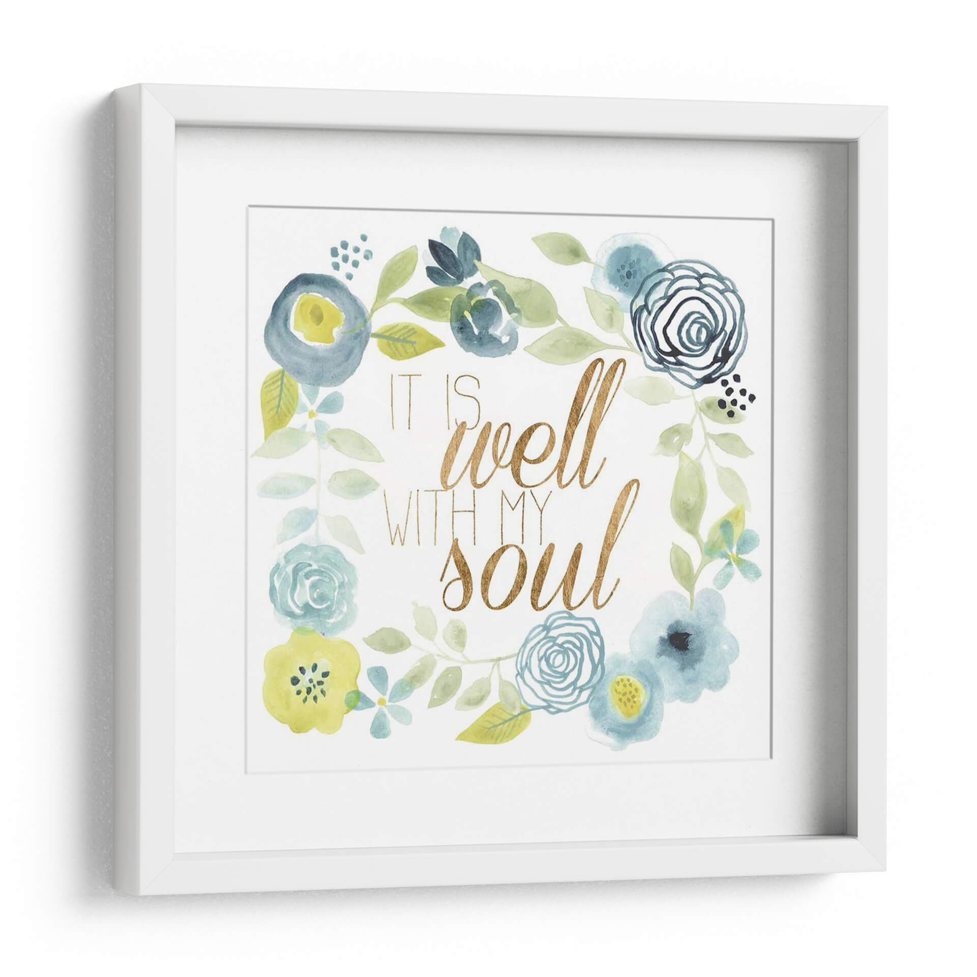 Este encantador cuadro decorativo, titulado 'Esta Bien Ii' del artista Studio W, es una obra de arte que irradia calma y serenidad. La pieza presenta una delicada composición floral en acuarela, con una paleta de colores suaves que incluye tonos azules, verdes y toques de amarillo. Las flores, representadas con trazos fluidos y orgánicos, se entrelazan en un diseño circular, enmarcando la inspiradora frase "It is well with my soul" escrita en una elegante tipografía dorada. La textura de acuarela añade una cualidad etérea y soñadora a la obra, creando un ambiente de paz y bienestar. Este cuadro es ideal para añadir un toque de espiritualidad y belleza a cualquier espacio, ya sea un dormitorio, una sala de estar o un rincón de meditación. Su diseño versátil lo convierte en una pieza de arte de pared perfecta para quienes buscan inspiración y un recordatorio visual de tranquilidad en su hogar. Añade un toque de armonía y estilo a tu decoración con esta pieza única.