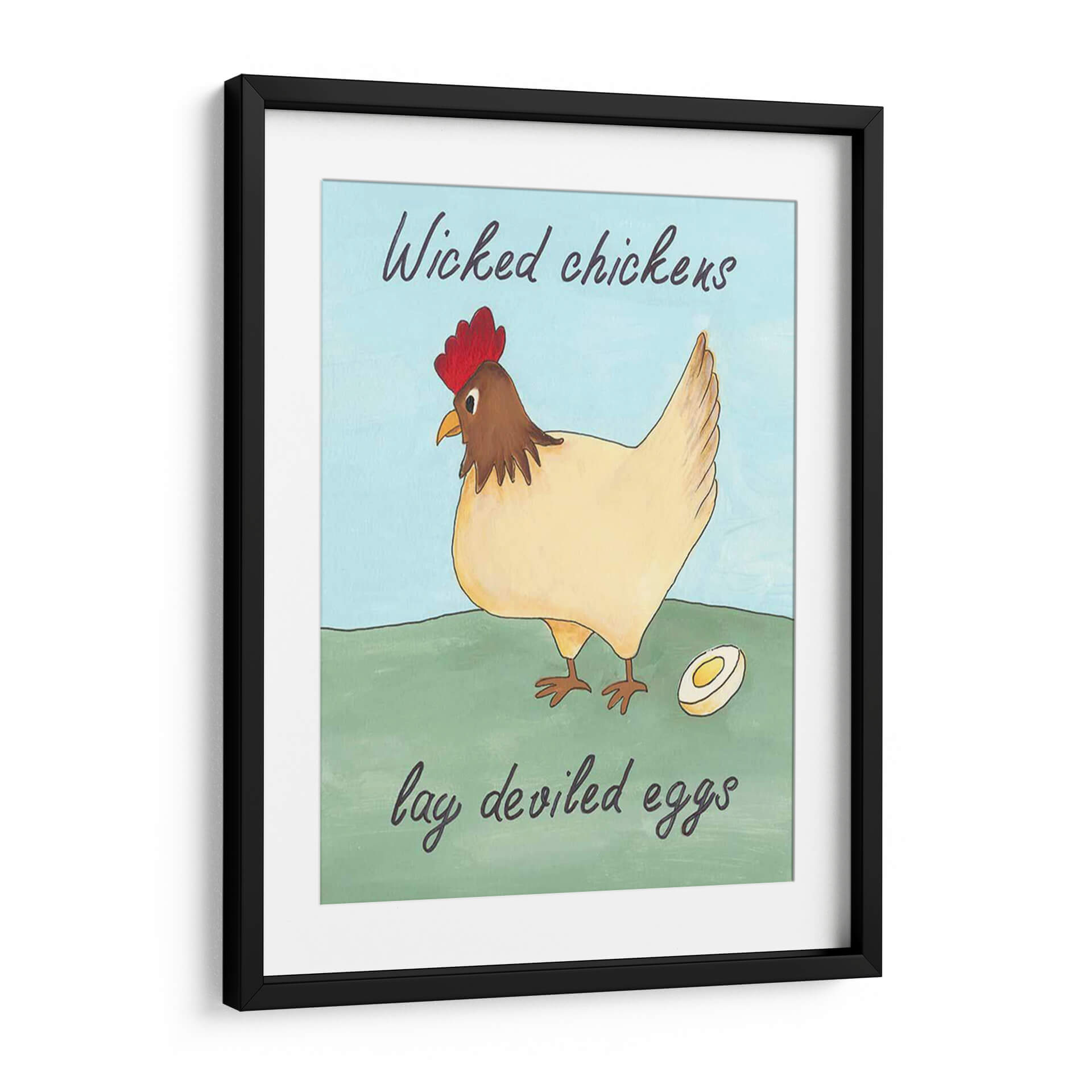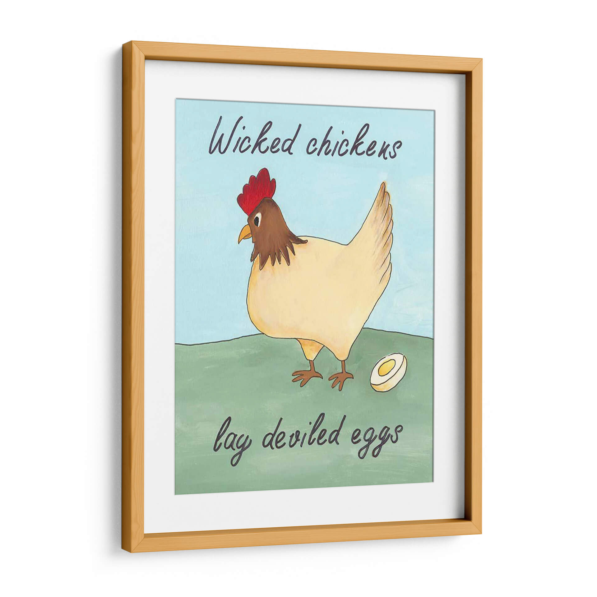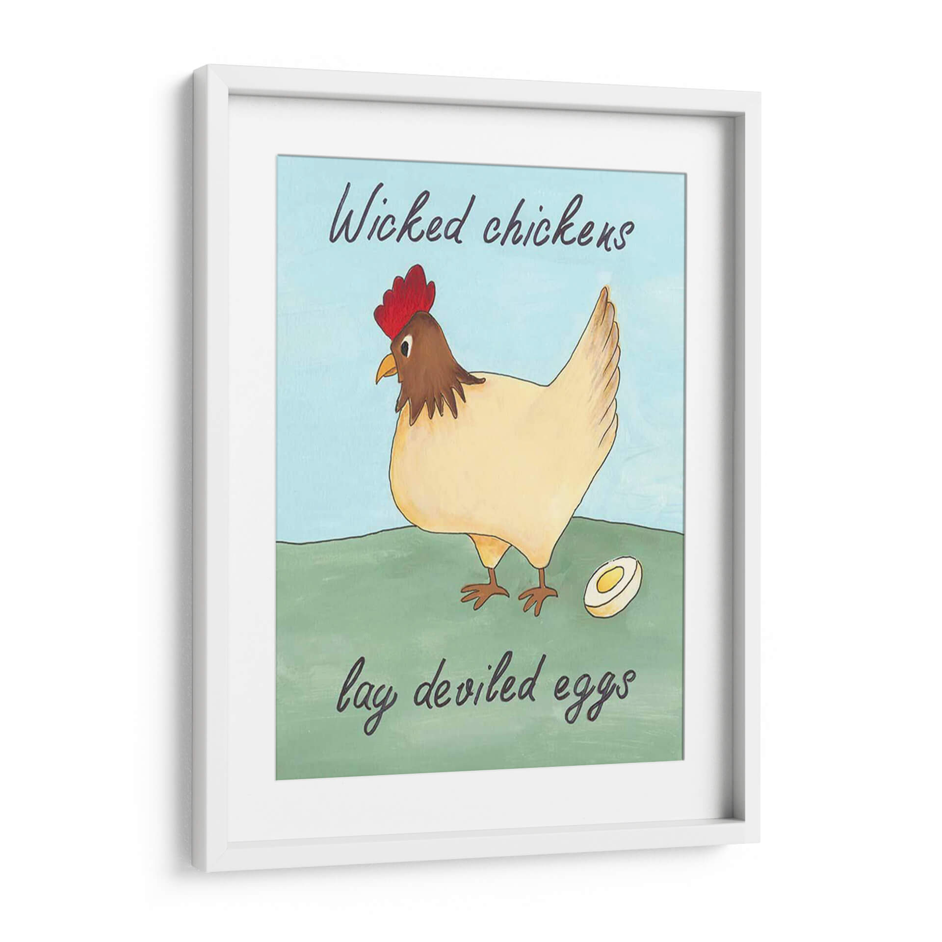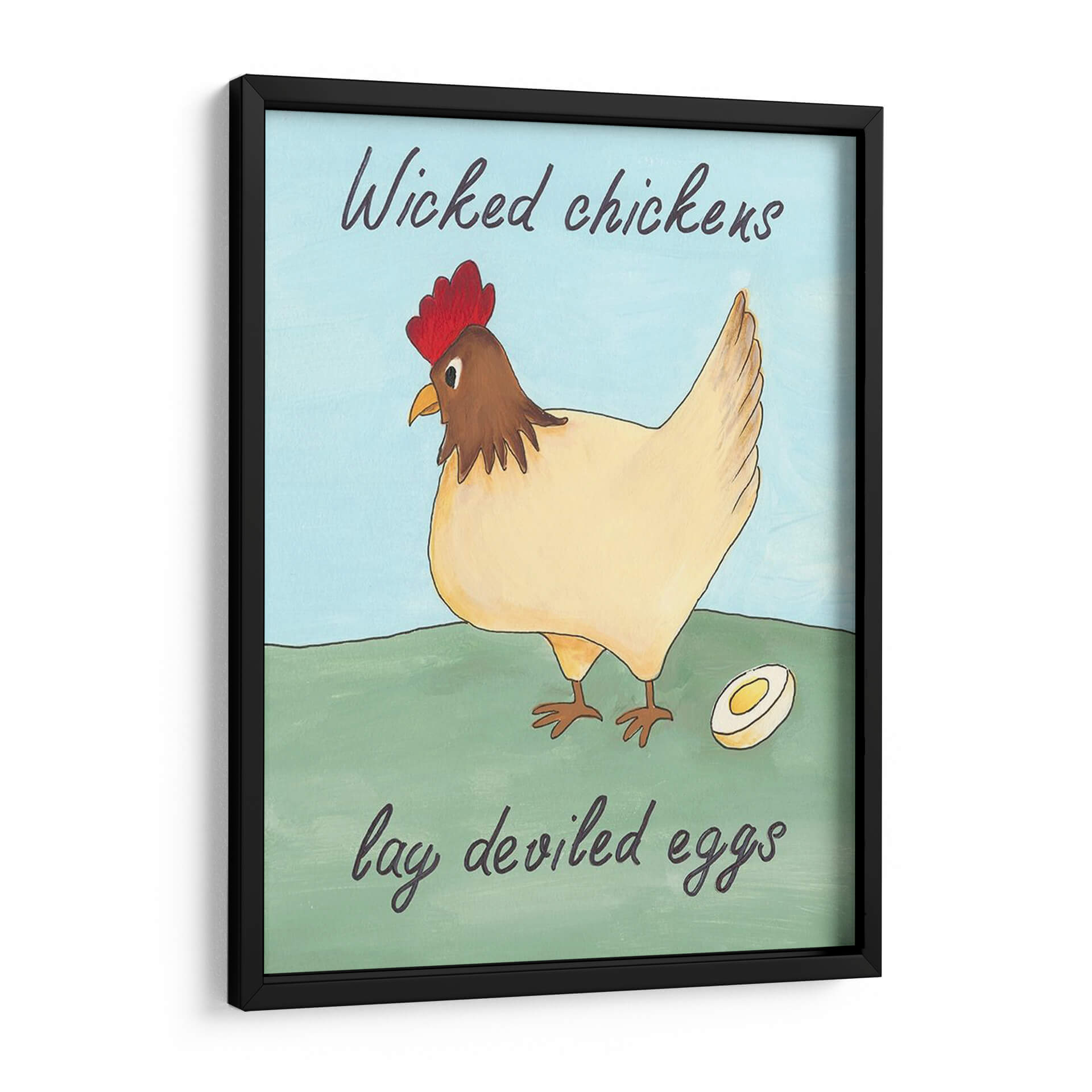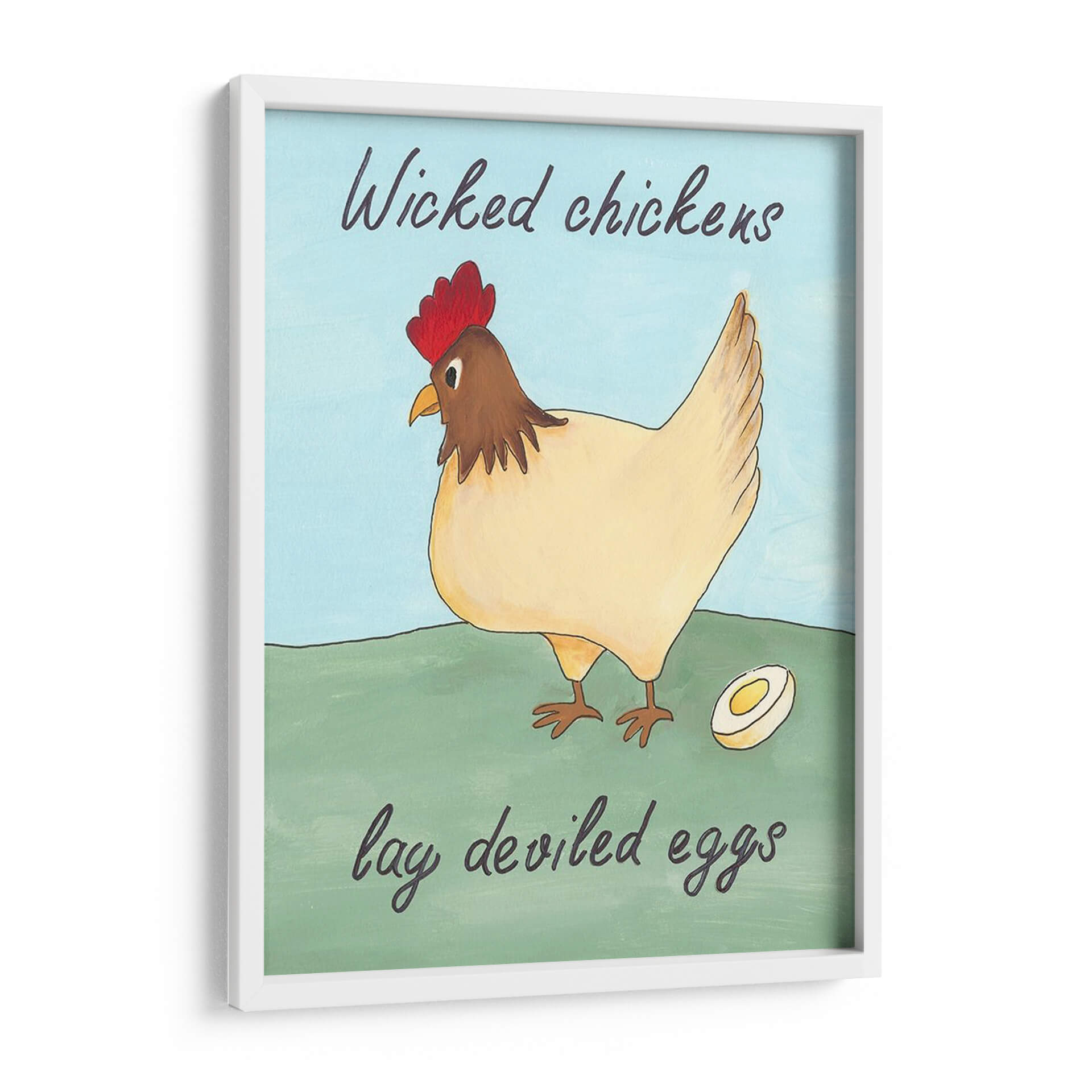 Dale un toque de humor y encanto rústico a tu hogar con este encantador cuadro decorativo. La obra presenta una juguetona ilustración de una gallina, con su cresta roja vibrante y plumaje en tonos crema, posada con elegancia sobre un prado verde. A su lado, un huevo cortado a la mitad insinúa la ingeniosa frase que la acompaña. Los colores suaves y la paleta de cielo azul claro crean una atmósfera serena y amigable, perfecta para añadir personalidad a cualquier espacio. Este cuadro es ideal para cocinas, comedores o cualquier rincón que necesite una dosis de alegría y originalidad. Su estilo artístico, que evoca la sencillez y el encanto de las ilustraciones clásicas, lo convierte en una pieza versátil que complementará tanto decoraciones campestres como modernas con un toque de humor.