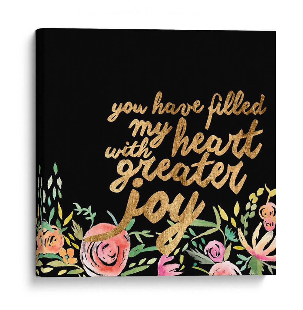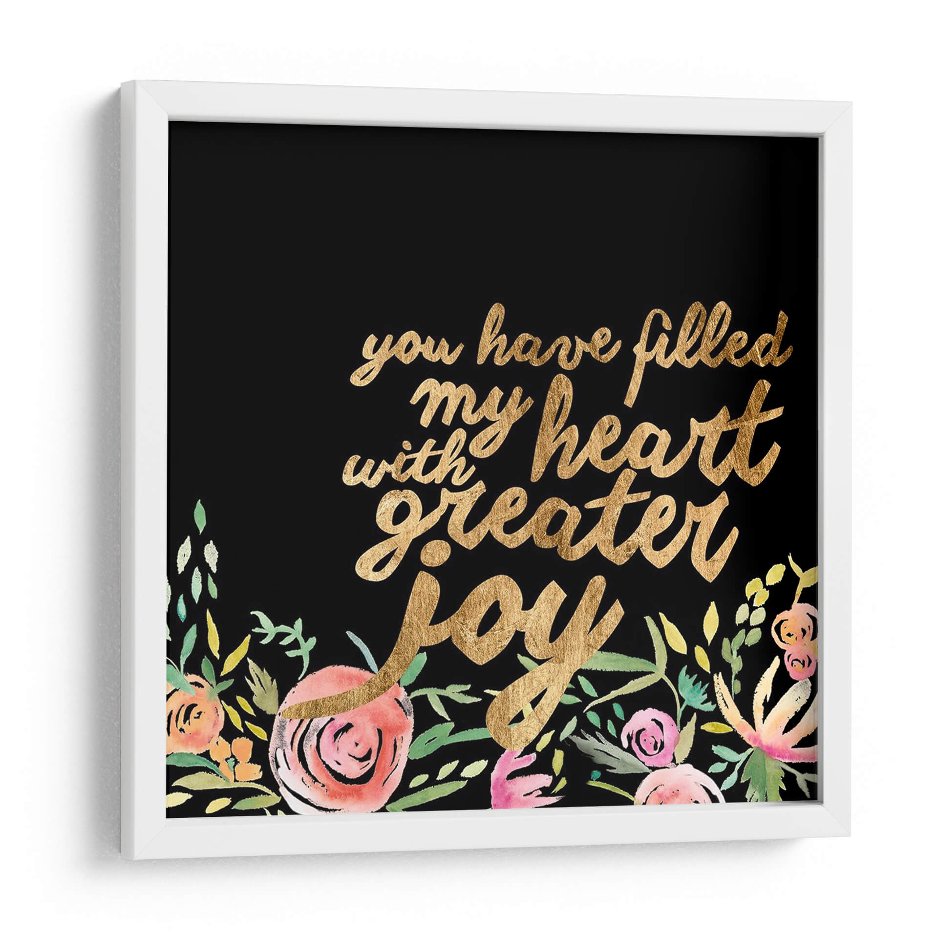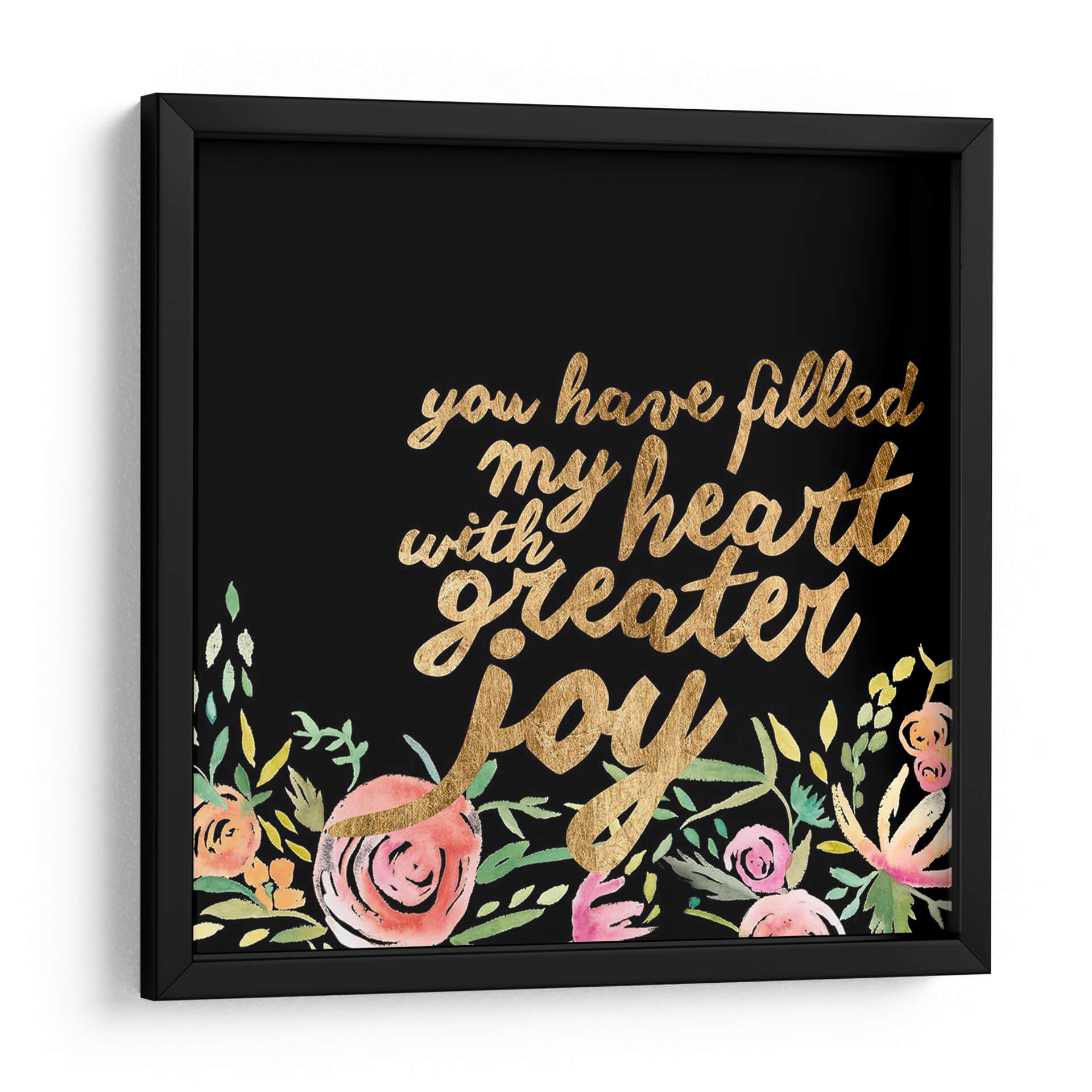 Embellece tu espacio con el cuadro decorativo "Fe Floral I", una obra que irradia positividad y calidez. Esta pieza presenta una explosión de flores delicadas y vibrantes, pintadas en acuarela con toques de rosa, coral y verde, que contrastan maravillosamente con un fondo negro profundo. La caligrafía dorada resalta la frase inspiradora "you have filled my heart with greater joy", añadiendo un toque de elegancia y significado espiritual. Es una composición visualmente atractiva que combina la sutileza de la naturaleza con un mensaje poderoso. Ideal para crear un ambiente de alegría y gratitud en tu sala de estar, dormitorio o incluso en un espacio de trabajo, este cuadro decorativo es perfecto para quienes buscan añadir un toque de luz y optimismo a su decoración. Su estilo, que fusiona elementos botánicos con tipografía inspiradora, lo convierte en una pieza única que resonará con tu estilo personal y aportará un punto focal lleno de encanto y serenidad a cualquier habitación, transformando tu hogar en un santuario de felicidad.