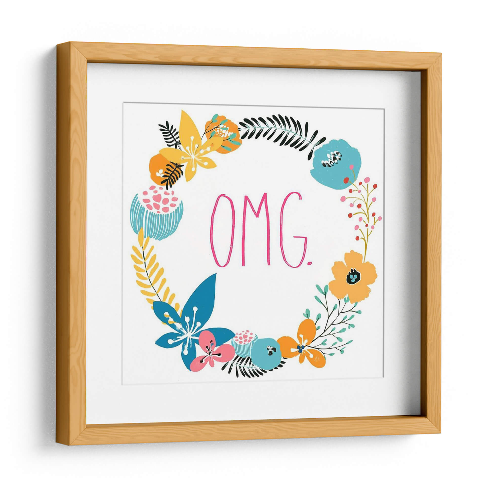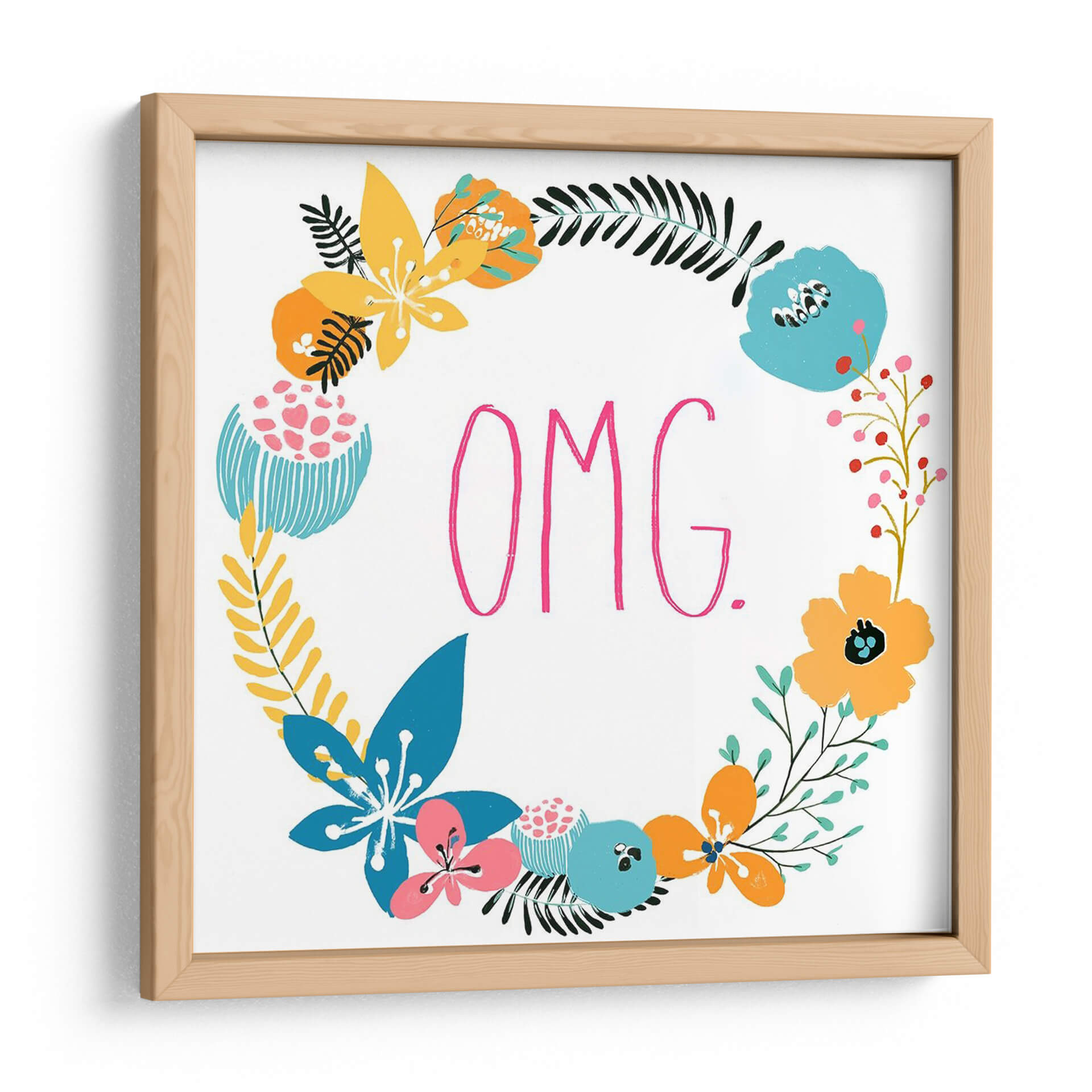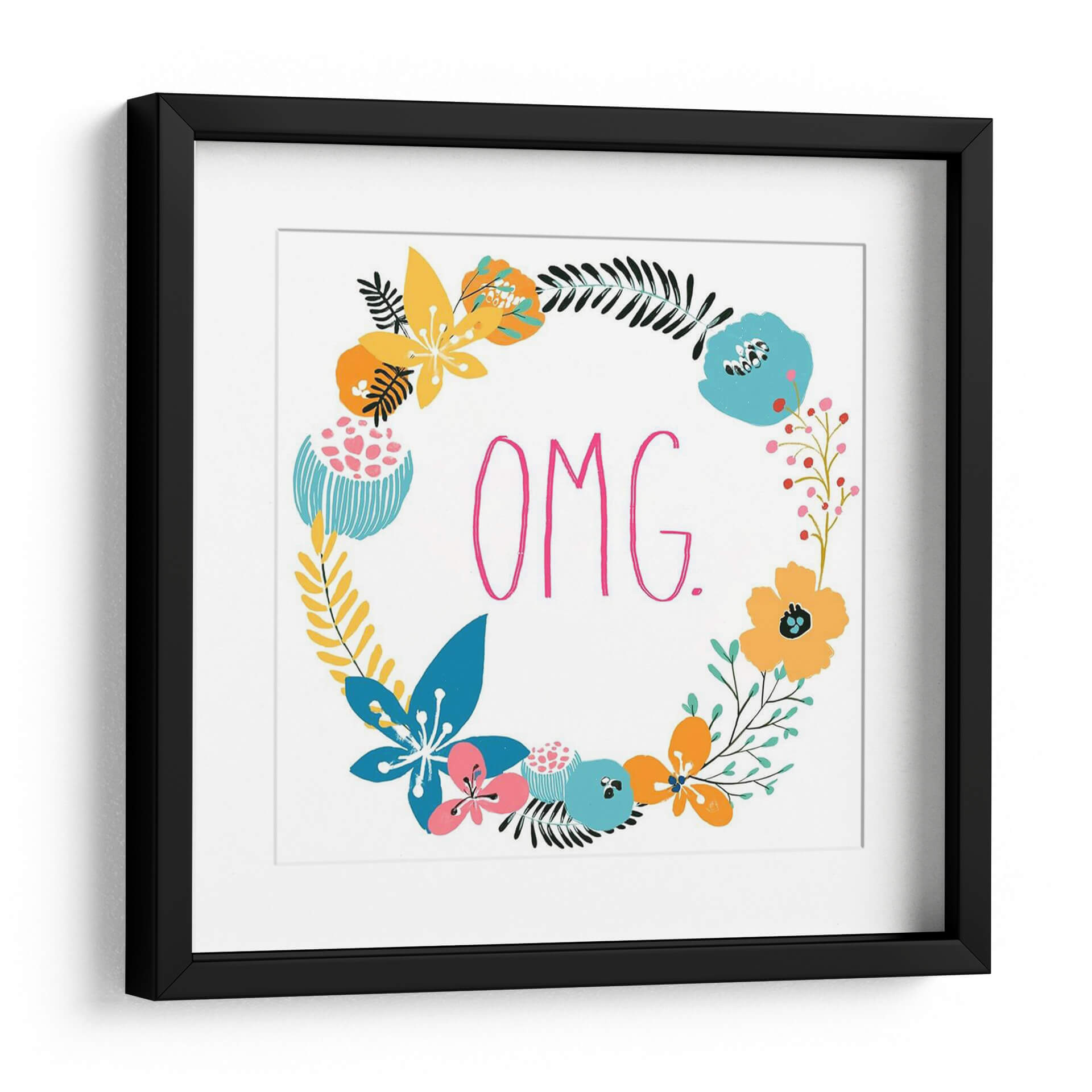 Sumérgete en la vibrante y juguetona obra de arte 'Florals Snarky X' de June Erica Vess, una pieza que combina audazmente la delicadeza floral con un toque de irreverencia moderna. Este cuadro decorativo presenta un exuberante arreglo floral circular, compuesto por una variedad de flores estilizadas y hojas en una paleta de colores alegres y contrastantes que incluye amarillos intensos, azules eléctricos, rosas vibrantes y naranjas cálidos, todos sobre un fondo blanco nítido. En el centro, la enérgica frase 'OMG.' escrita en un llamativo rosa fucsia añade un punto focal inesperado y audaz, fusionando la naturaleza con la cultura pop de una manera única. El estilo, una mezcla de ilustración y arte gráfico contemporáneo, crea una estética fresca y atractiva. Ideal para infundir personalidad y color en cualquier espacio, desde una sala de estar moderna hasta una oficina creativa o un dormitorio juvenil. 'Florals Snarky X' es perfecto para quienes buscan una decoración de pared que hable de diversión, estilo y un sentido del humor desenfadado. Añade un toque de arte contemporáneo y optimismo a tu hogar con esta cautivadora pieza que sin duda será un tema de conversación.