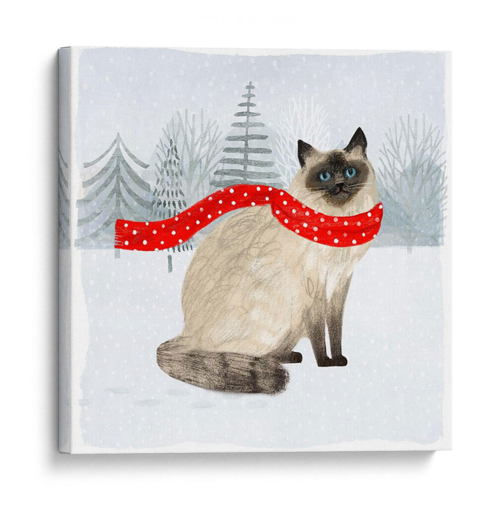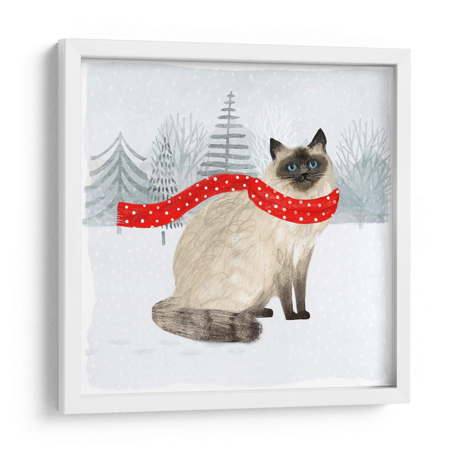 Sumérgete en la dulzura invernal con este encantador cuadro decorativo de una gata siamesa, vestida con una bufanda roja de lunares blancos, sentada en un paisaje nevado adornado con árboles estilizados. La obra, titulada "Gatos Y Perros De Navidad Iii" de Victoria Borges, captura una atmósfera acogedora y festiva, ideal para añadir un toque de calidez a tu hogar durante la temporada navideña o en cualquier momento que desees evocar alegría. La paleta de colores suaves, dominada por grises y blancos, se ve realzada por el vibrante rojo de la bufanda, creando un contraste visual cautivador. El estilo ilustrativo, con pinceladas sutiles y una composición centrada, dirige la mirada directamente a la expresión serena del felino. Este cuadro decorativo es perfecto para salas de estar, dormitorios o incluso como un detalle encantador en una oficina, aportando una sensación de paz y compañía. Su diseño atemporal y temático lo convierte en una pieza versátil que complementará diversos estilos decorativos, desde el nórdico hasta el contemporáneo, añadiendo personalidad y un toque artístico único a cualquier espacio. Un regalo perfecto para los amantes de los gatos y la decoración festiva.