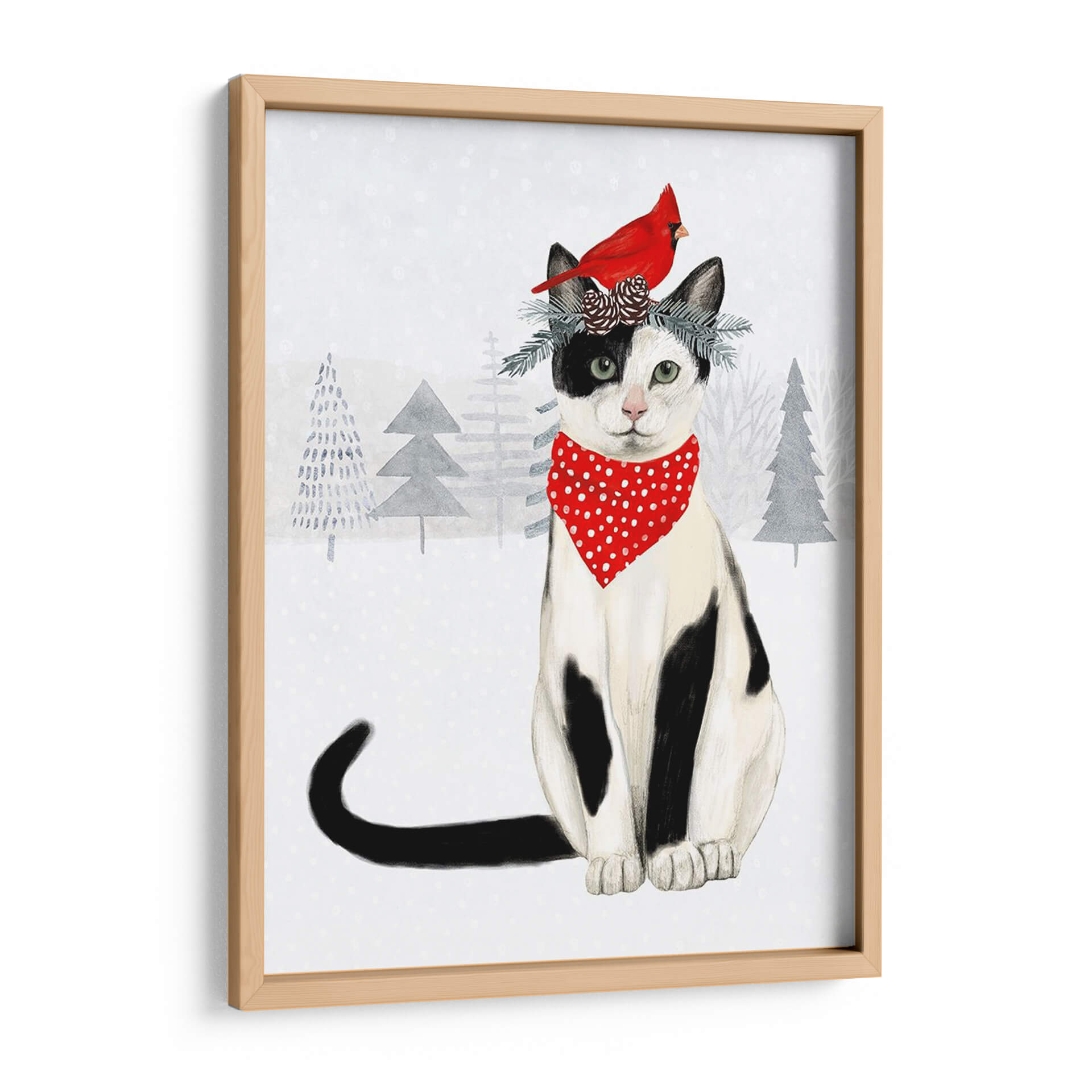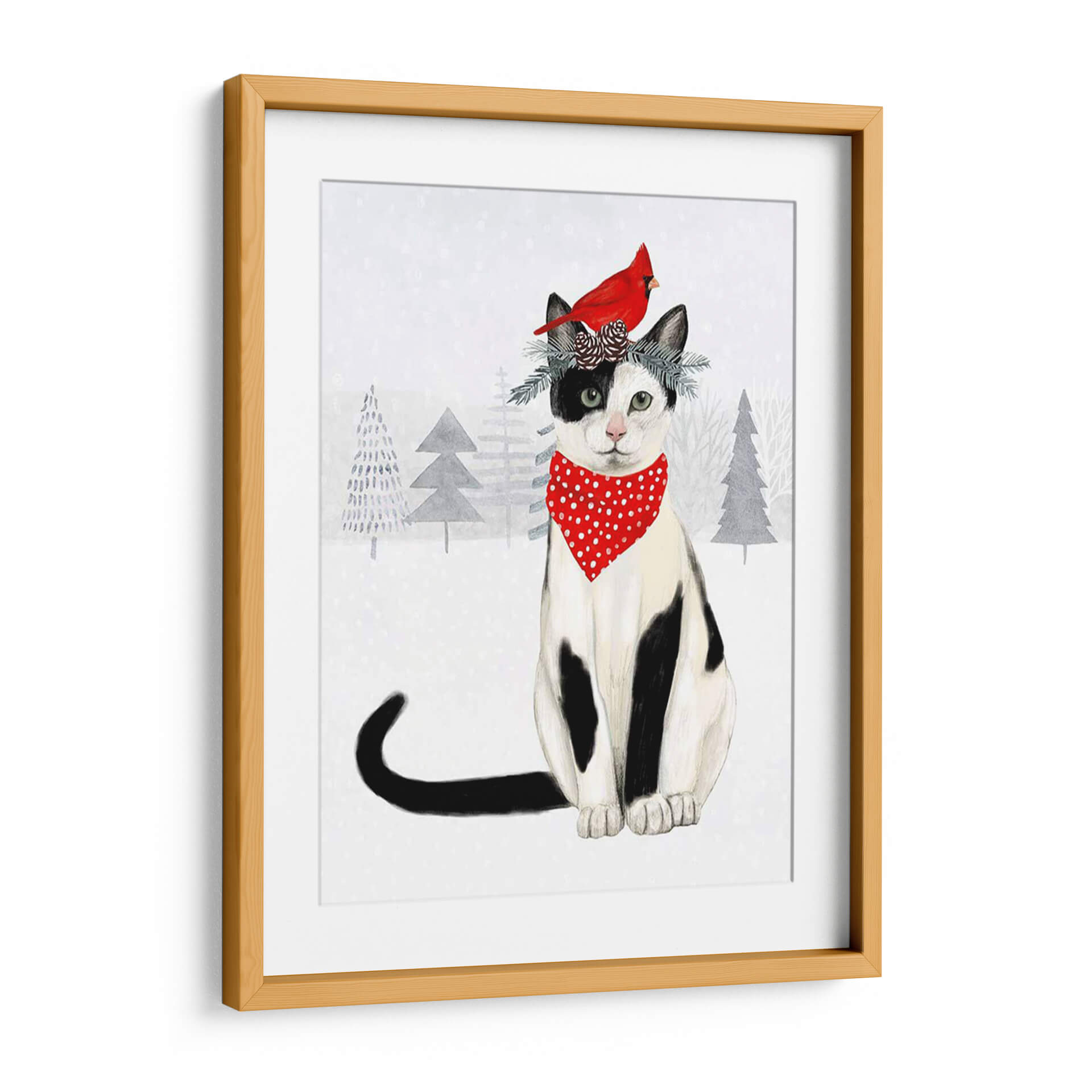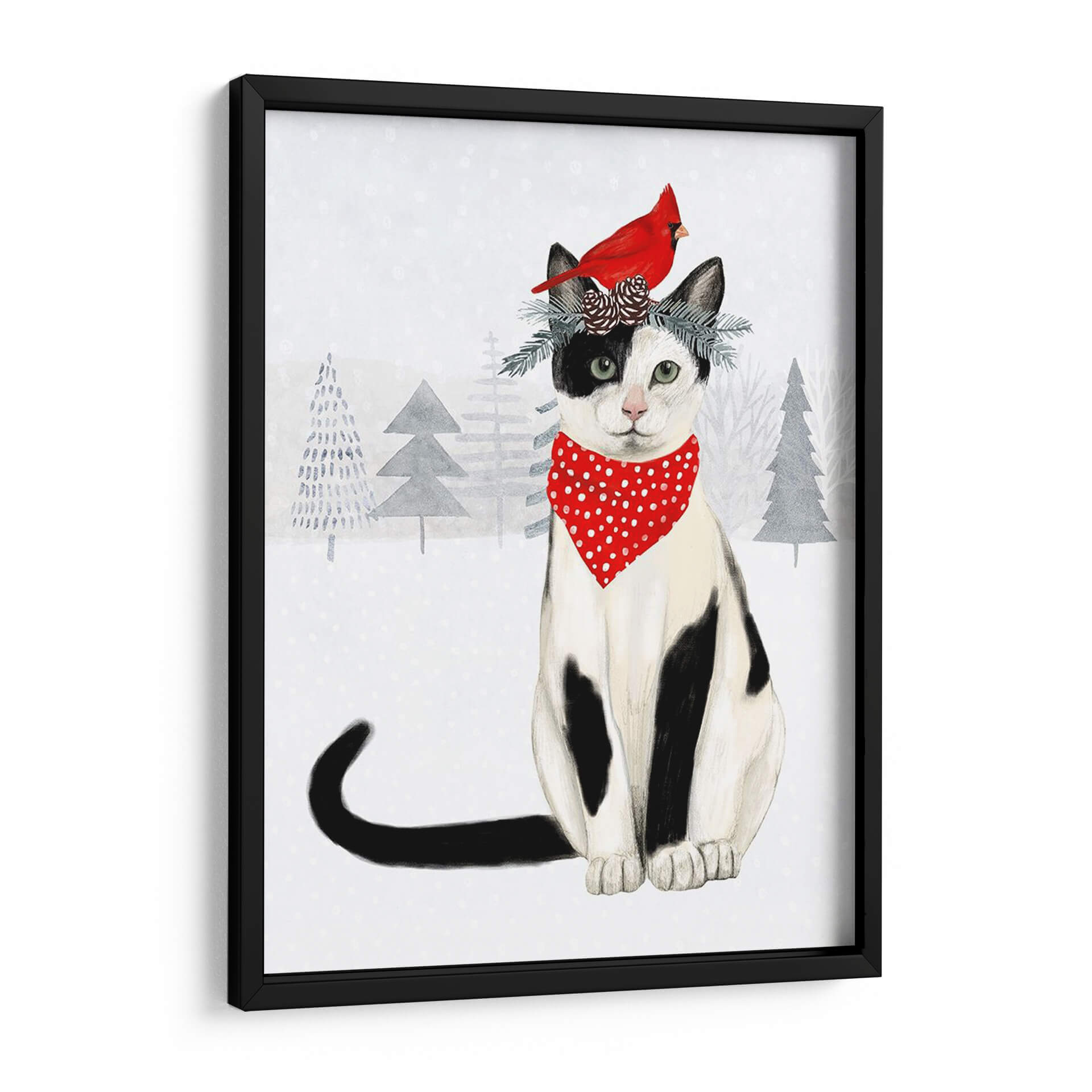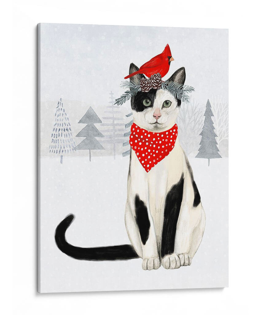 Captura la magia de la temporada invernal con este encantador cuadro decorativo que presenta a un gato atigrado y blanco ataviado con un pañuelo rojo de lunares y una corona festiva de ramas y piñas, coronada por un vibrante petirrojo. La obra, titulada "Gatos Y Perros De Navidad Vi" de Victoria Borges, evoca una sensación de calidez y alegría hogareña, perfecta para añadir un toque festivo a tu decoración. El fondo nevado, con siluetas de árboles invernales en tonos grises, crea una atmósfera serena y acogedora. Los colores predominantes, como el blanco, el negro, el rojo vibrante del petirrojo y el pañuelo, y los tonos fríos del fondo, se combinan armoniosamente para crear una pieza visualmente atractiva. Este cuadro es ideal para infundir espíritu navideño en salones, dormitorios o cualquier rincón que necesite un toque de encanto y color. Su estilo ilustrativo y el tierno tema lo convierten en una adición entrañable a cualquier hogar durante las fiestas o durante todo el año para los amantes de los animales.