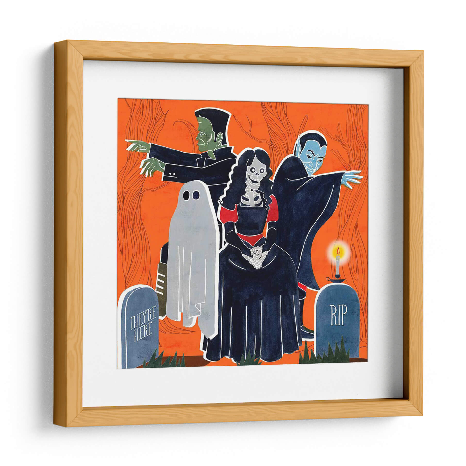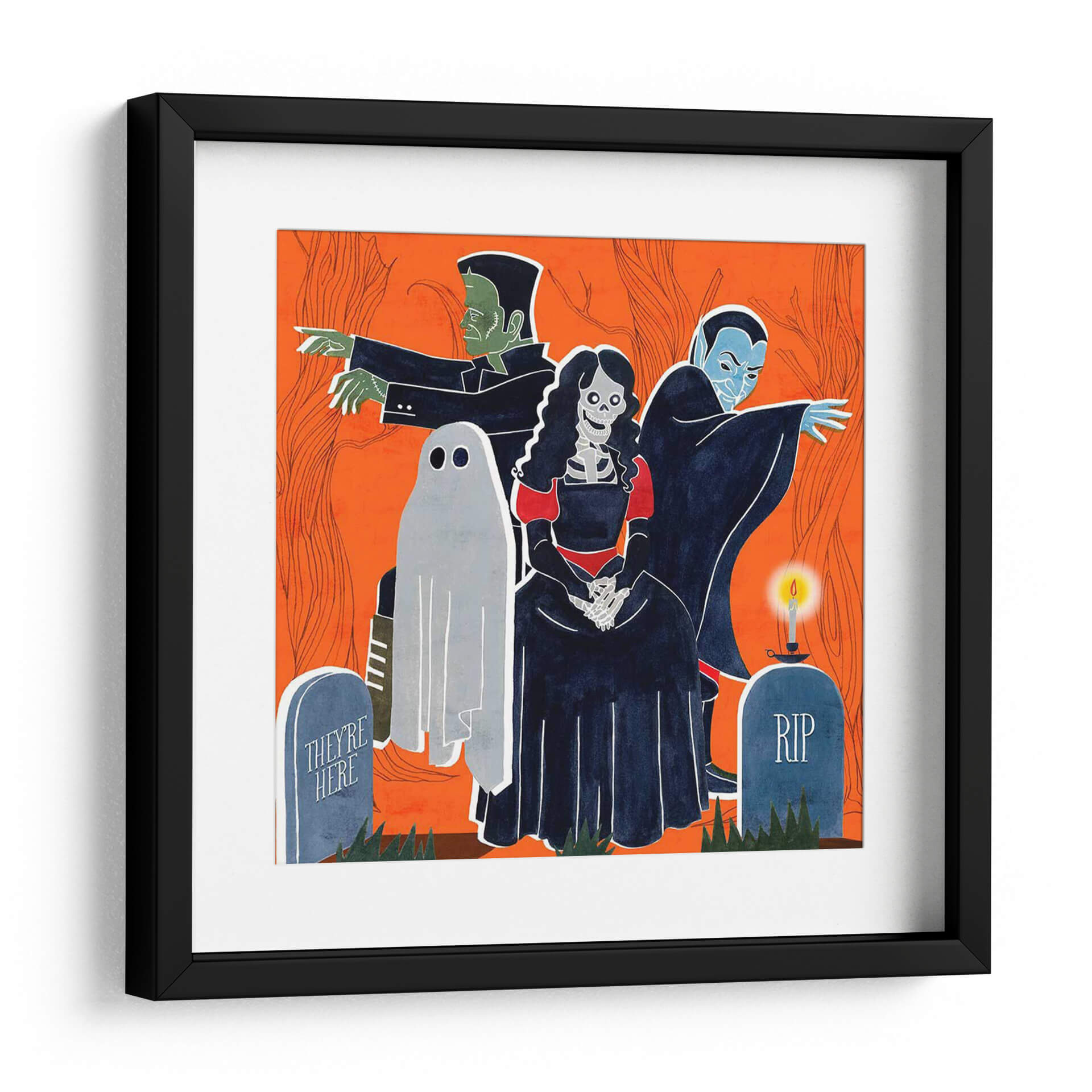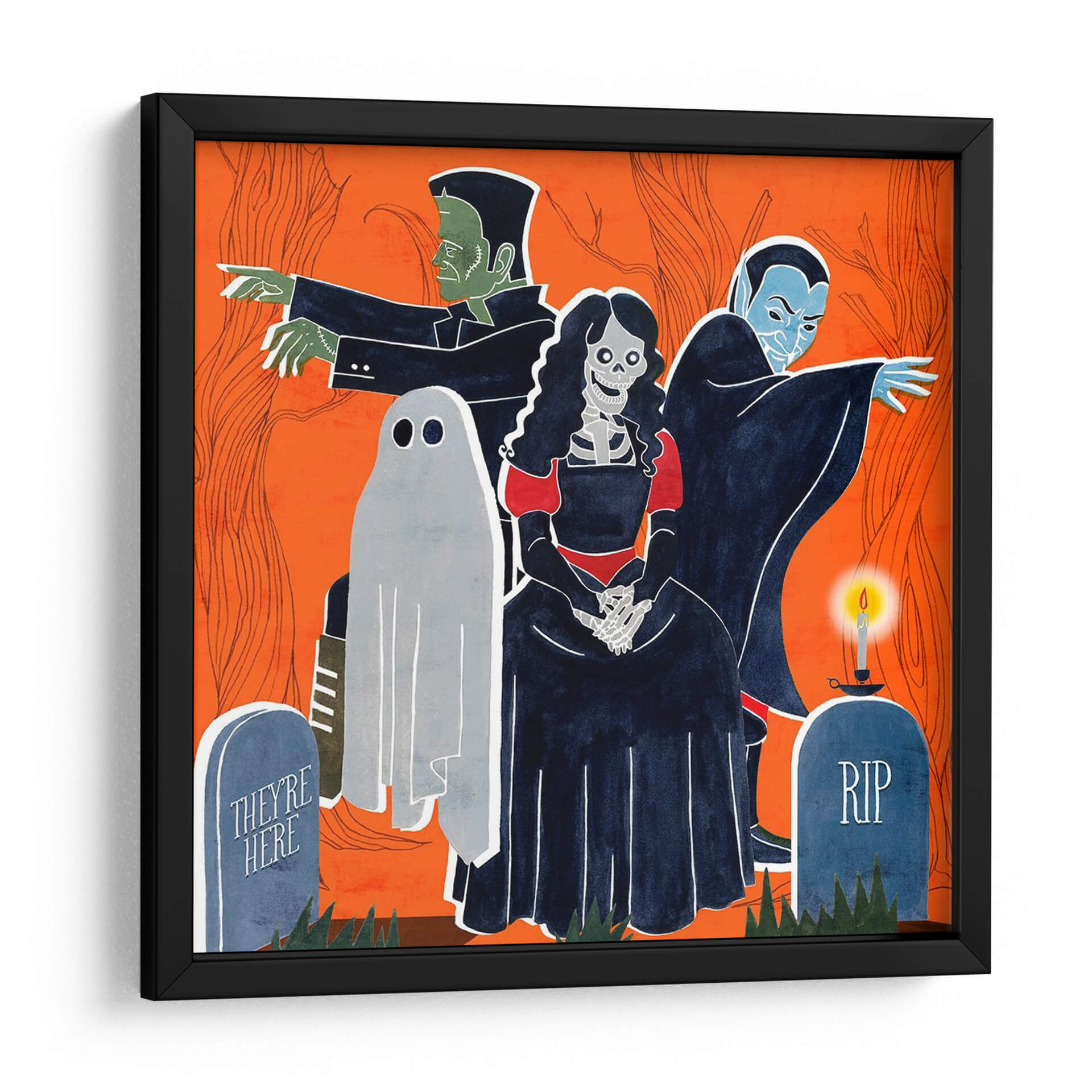 Sumérgete en la divertida y espeluznante atmósfera de 'Graveyard Gang I', una obra de arte contemporáneo de Grace Popp que celebra el espíritu de Halloween con un toque de humor gótico. Esta pieza presenta una reunión encantadora de monstruos clásicos: un fantasma etéreo, una figura esquelética vestida elegantemente, el icónico monstruo de Frankenstein y un vampiro sombrío, todos posando en un cementerio iluminado por la tenue luz de una vela. El vibrante fondo naranja, salpicado de contornos de árboles estilizados, crea un contraste audaz con los tonos más oscuros de los personajes y las lápidas, generando una sensación de misterio y festividad. El estilo gráfico y las líneas definidas de Popp aportan una calidad moderna y artística a estos personajes de terror tradicionales, haciendo de este cuadro decorativo una adición única y memorable para cualquier espacio. Ideal para aquellos que buscan añadir un toque de personalidad peculiar y temática a su hogar u oficina, esta obra invita a una sonrisa y a una pizca de escalofrío. Es perfecta para salas de estar, estudios o cualquier rincón que desee un toque de originalidad y conversación.