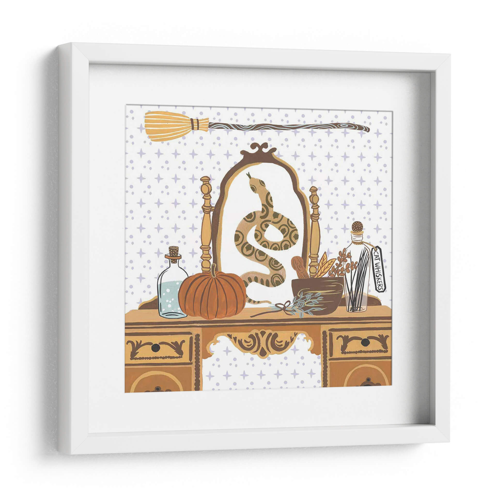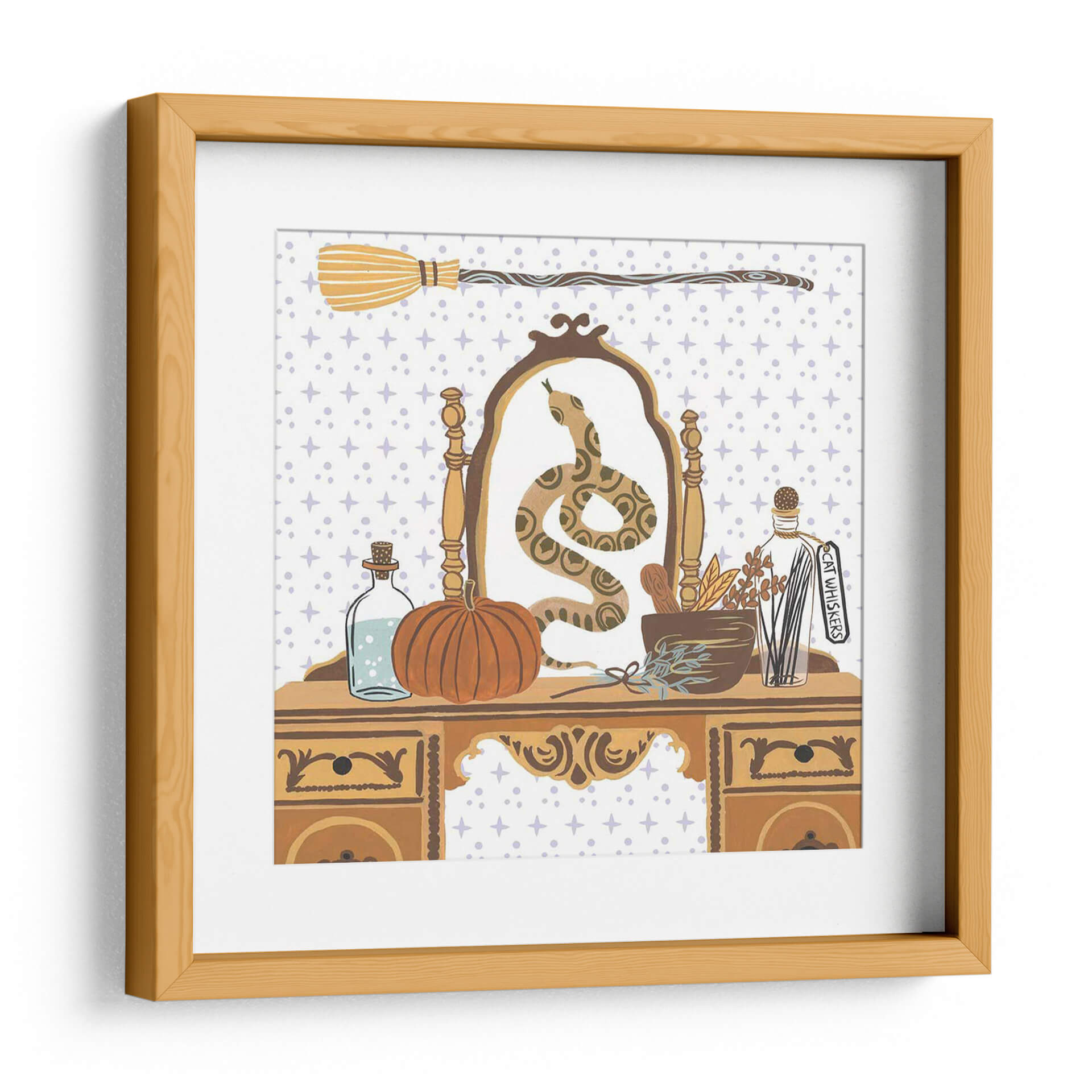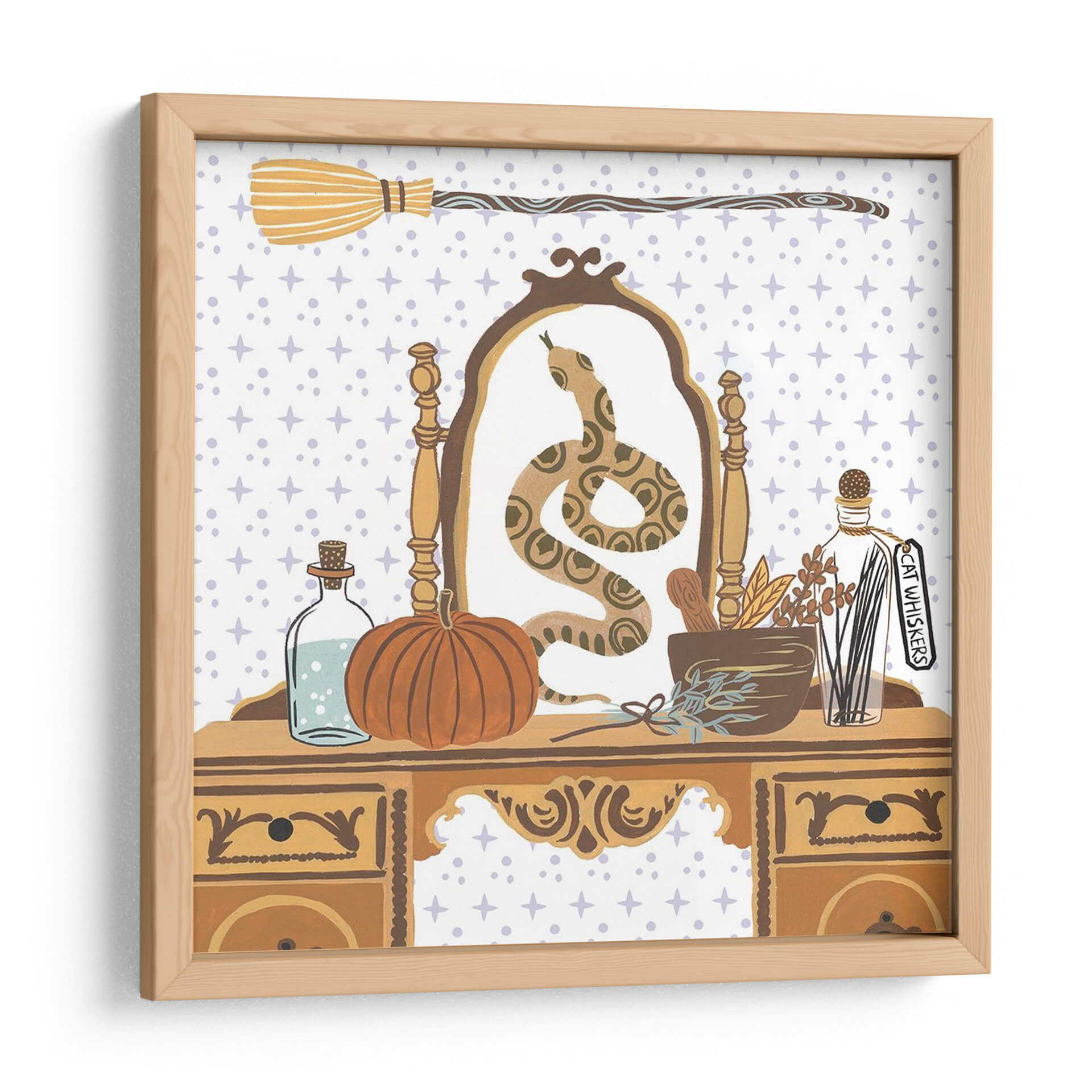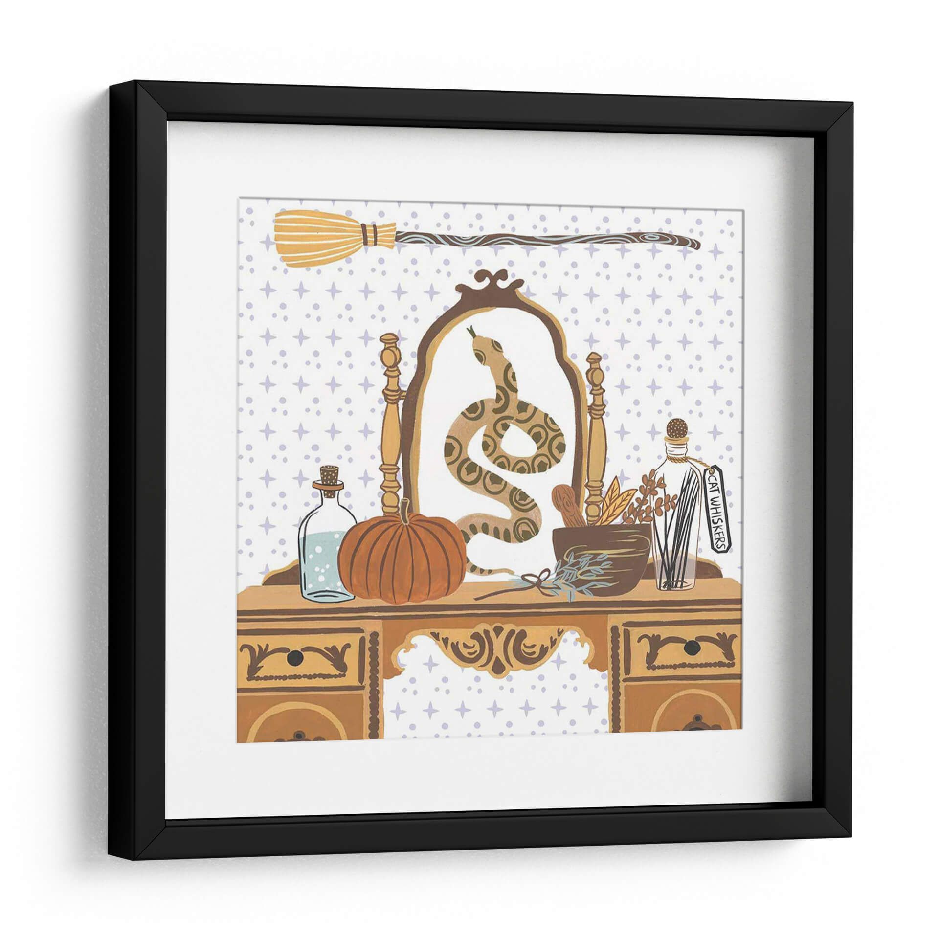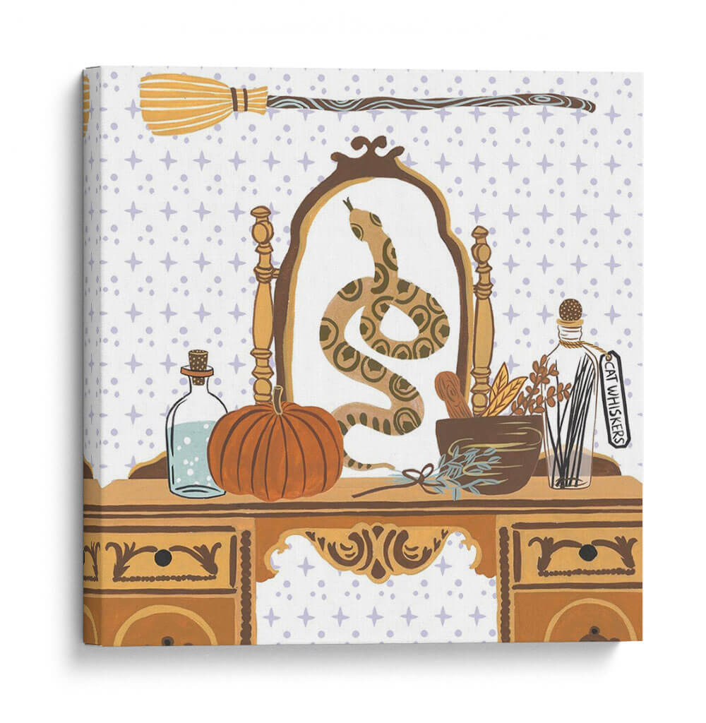 Sumérgete en el encanto misterioso de "Halloween Prep Ii", una obra de arte contemporáneo de Melissa Wang que captura la esencia de la preparación para una noche mágica. Esta pieza visualmente cautivadora presenta una serpiente enroscada, reflejada en un espejo ornamentado, flanqueada por elementos icónicos de Halloween como una calabaza anaranjada, pociones místicas y un atado de hierbas aromáticas. La paleta de colores, dominada por tonos tierra cálidos, ocres y toques de azul y violeta en el fondo con un sutil patrón de estrellas, crea una atmósfera acogedora pero intrigante. El estilo artístico combina elementos de ilustración y arte popular, con líneas definidas y una composición equilibrada que atrae la mirada hacia el detalle central. "Halloween Prep Ii" es ideal para añadir un toque de fantasía y un aire de misterio a cualquier espacio, desde una sala de estar moderna hasta un estudio o dormitorio temático. Este cuadro decorativo evoca la anticipación y la magia de la temporada otoñal, convirtiéndose en un punto focal único que invita a la contemplación y la conversación.