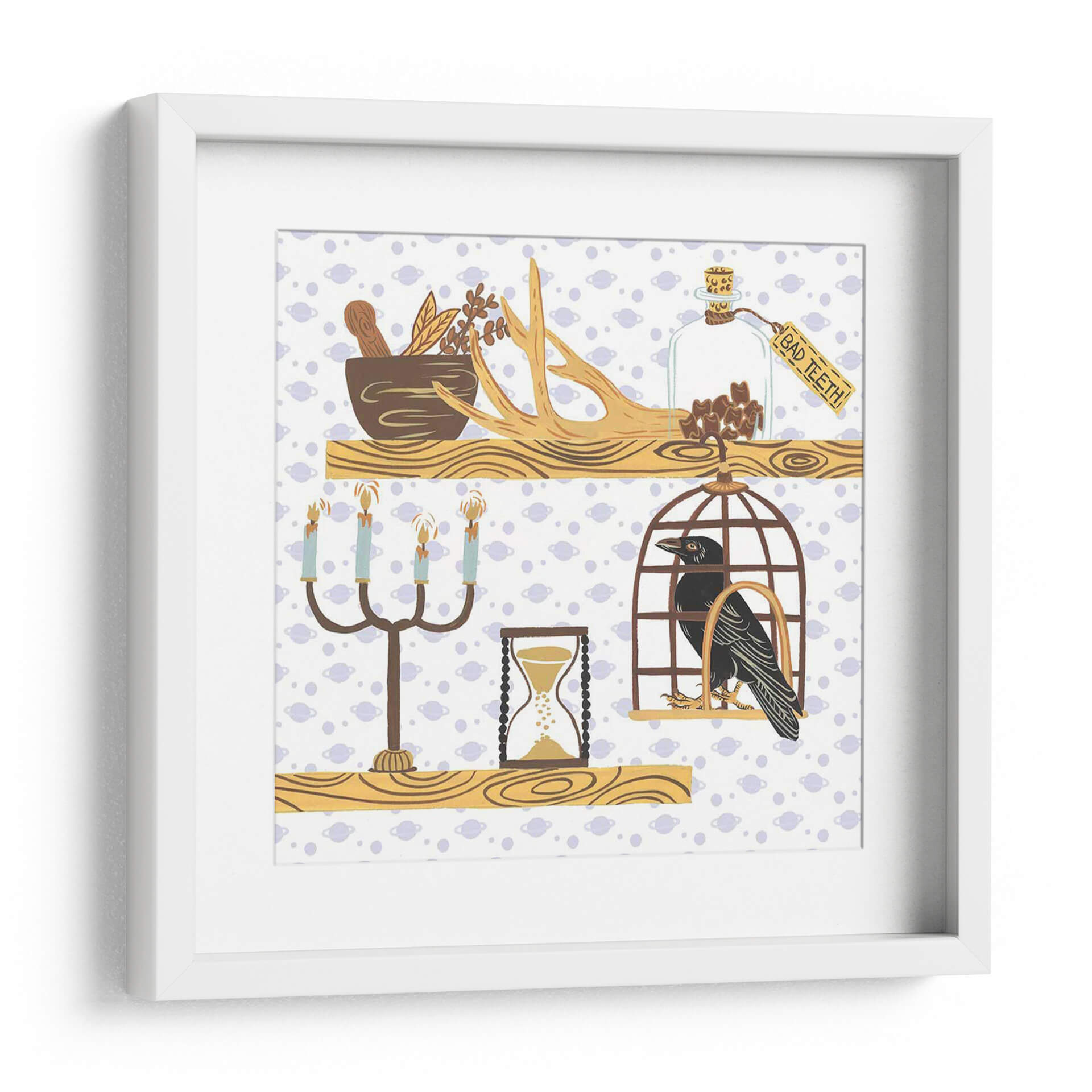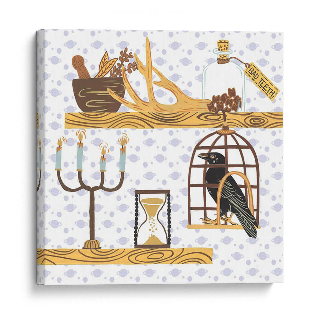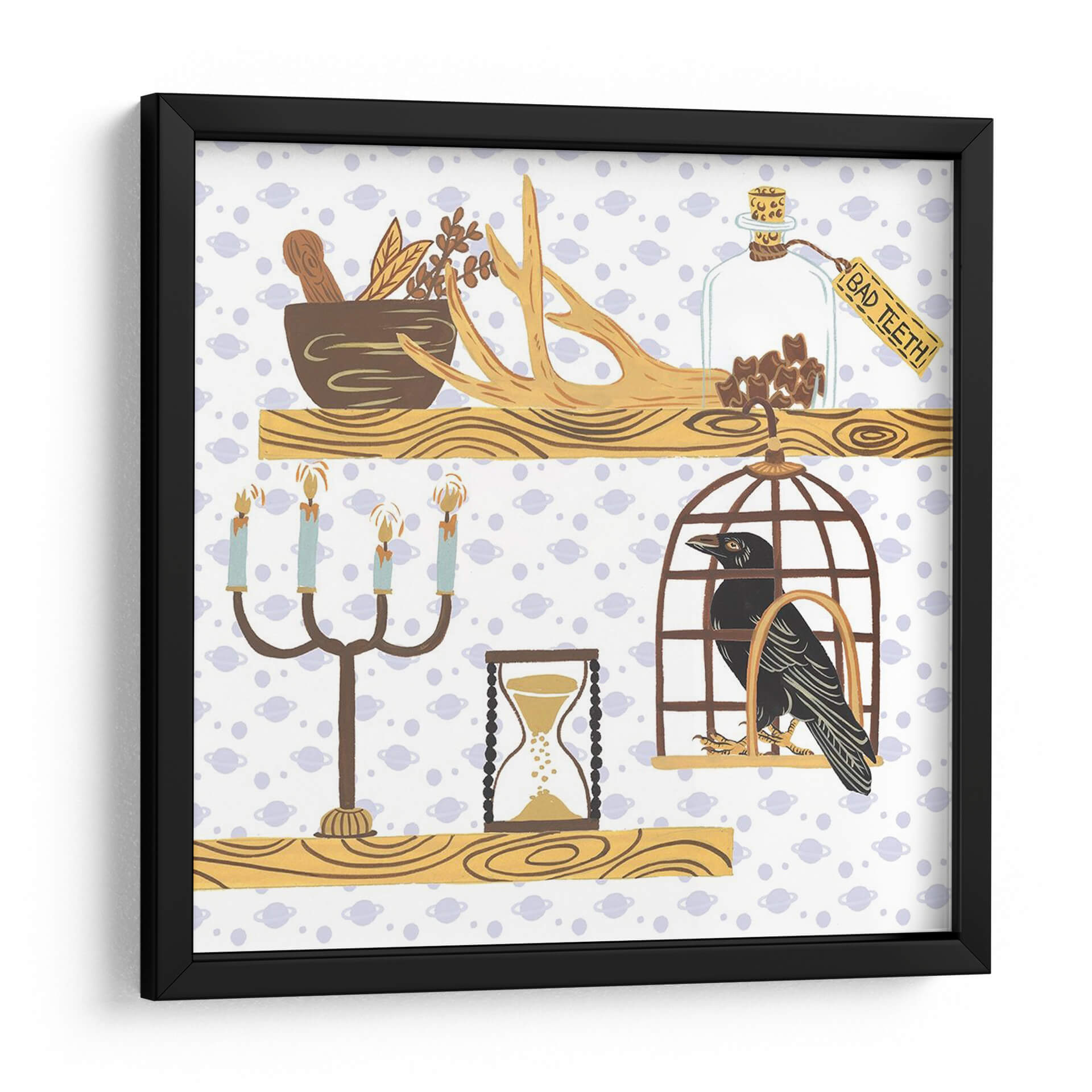 Adéntrate en el mundo misterioso y encantador de "Halloween Prep Iii", una obra de arte digital que evoca una atmósfera única y cautivadora. Esta pieza, creada por Melissa Wang, presenta una composición intrincada y llena de detalles, dispuesta sobre estantes de madera que recuerdan a un botiquín o gabinete de curiosidades. En la parte superior, observamos elementos como un mortero con hierbas secas, astas de venado y una botella etiquetada "BAD TEETH", junto a unas piñas o bellotas, sugiriendo preparativos para una celebración o un ritual ancestral. En el estante inferior, un candelabro con velas de tonos azulados ilumina la escena, acompañado por un reloj de arena que marca el inexorable paso del tiempo y una jaula de pájaros con un cuervo en su interior, añadiendo un toque de misterio y simbolismo. El fondo, con un patrón sutil de planetas o burbujas en tonos lila y blanco, crea una sensación etérea y onírica. La paleta de colores, dominada por tonos terrosos, ocres, azules pálidos y acentos oscuros, crea un ambiente acogedor pero enigmático. Este cuadro decorativo es ideal para añadir un toque de singularidad y conversación a cualquier espacio, ya sea un salón moderno, una oficina creativa o un dormitorio con personalidad. Su estilo artístico, que combina elementos naíf con un aire vintage y un toque de lo gótico suave, lo convierte en una pieza versátil para quienes buscan una decoración que se salga de lo común y transmita una narrativa visual interesante. "Halloween Prep Iii" no es solo arte de pared, es una invitación a explorar lo inusual y celebrar la imaginación.