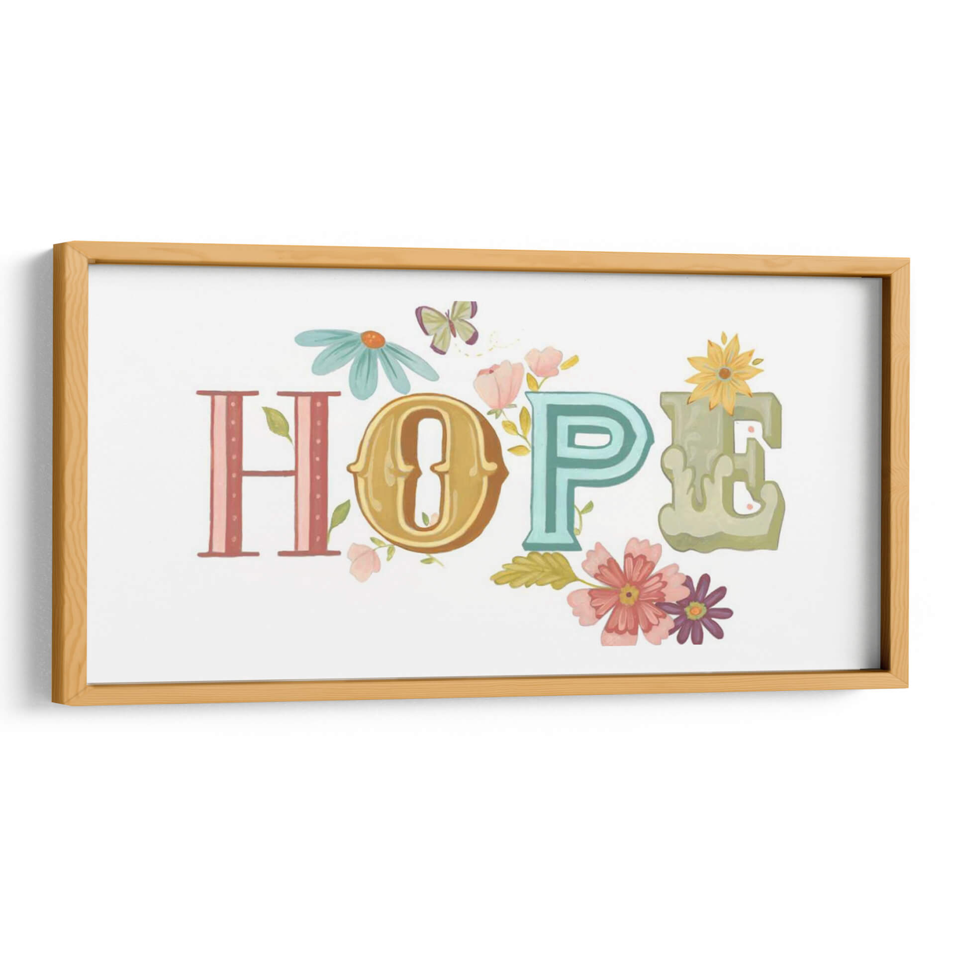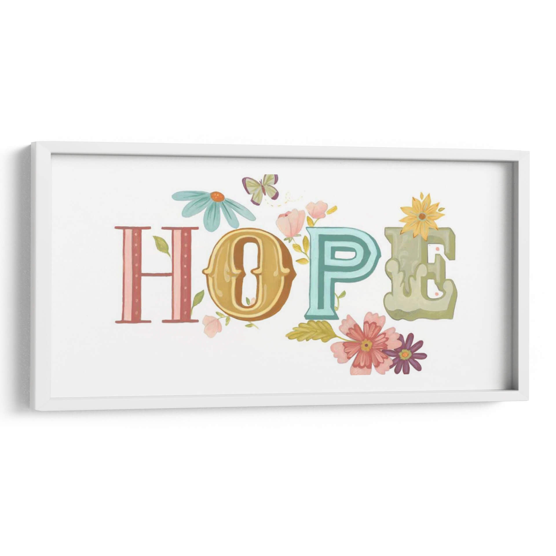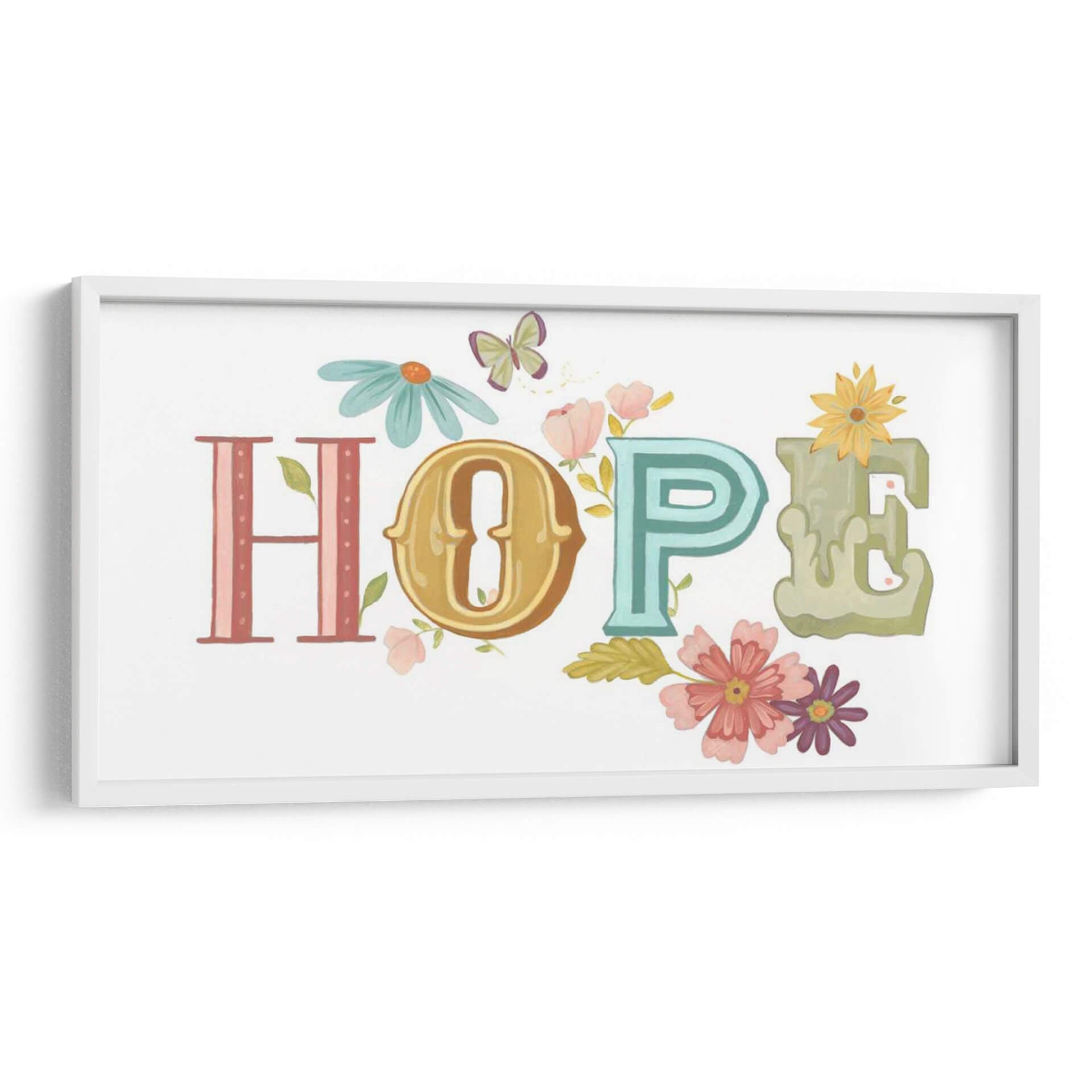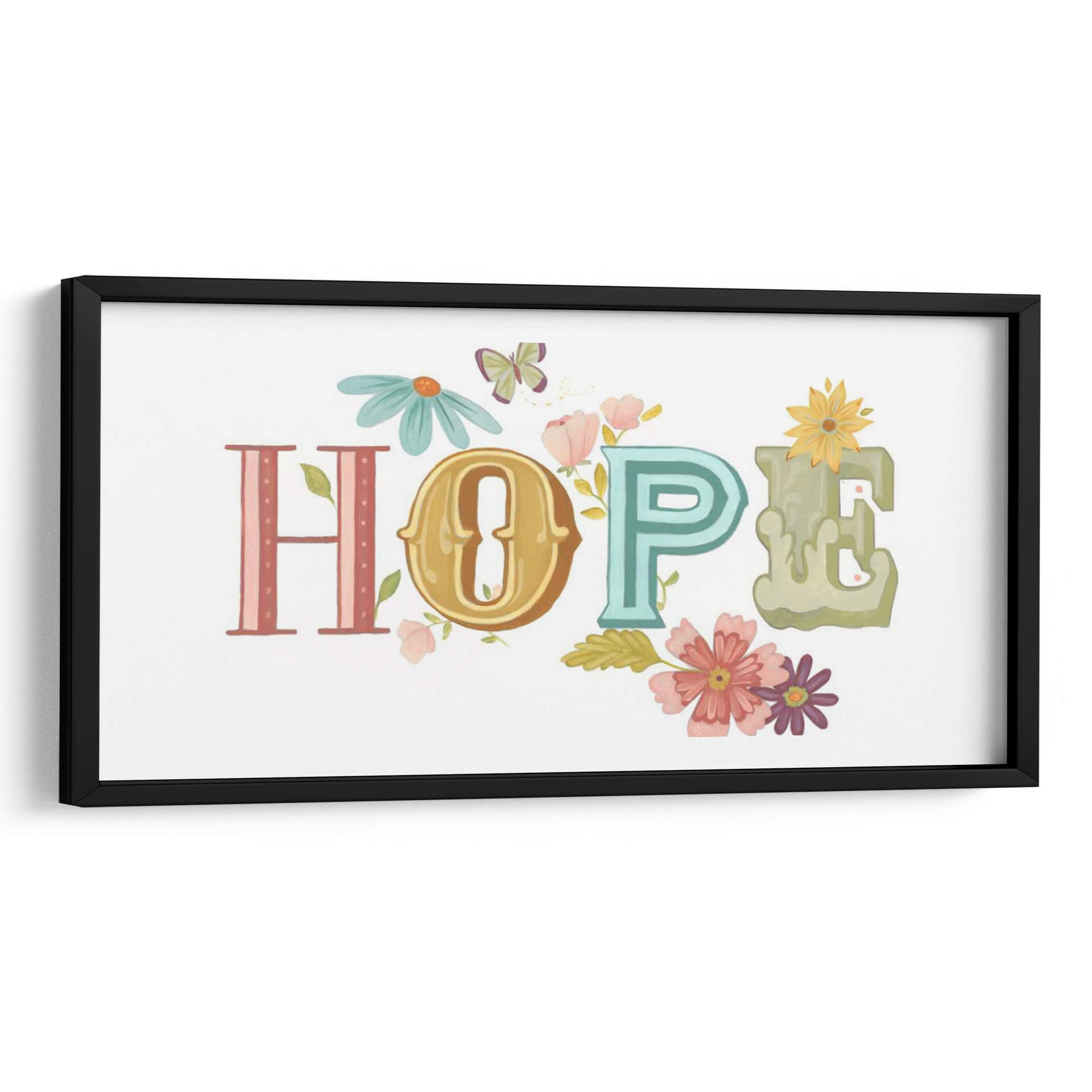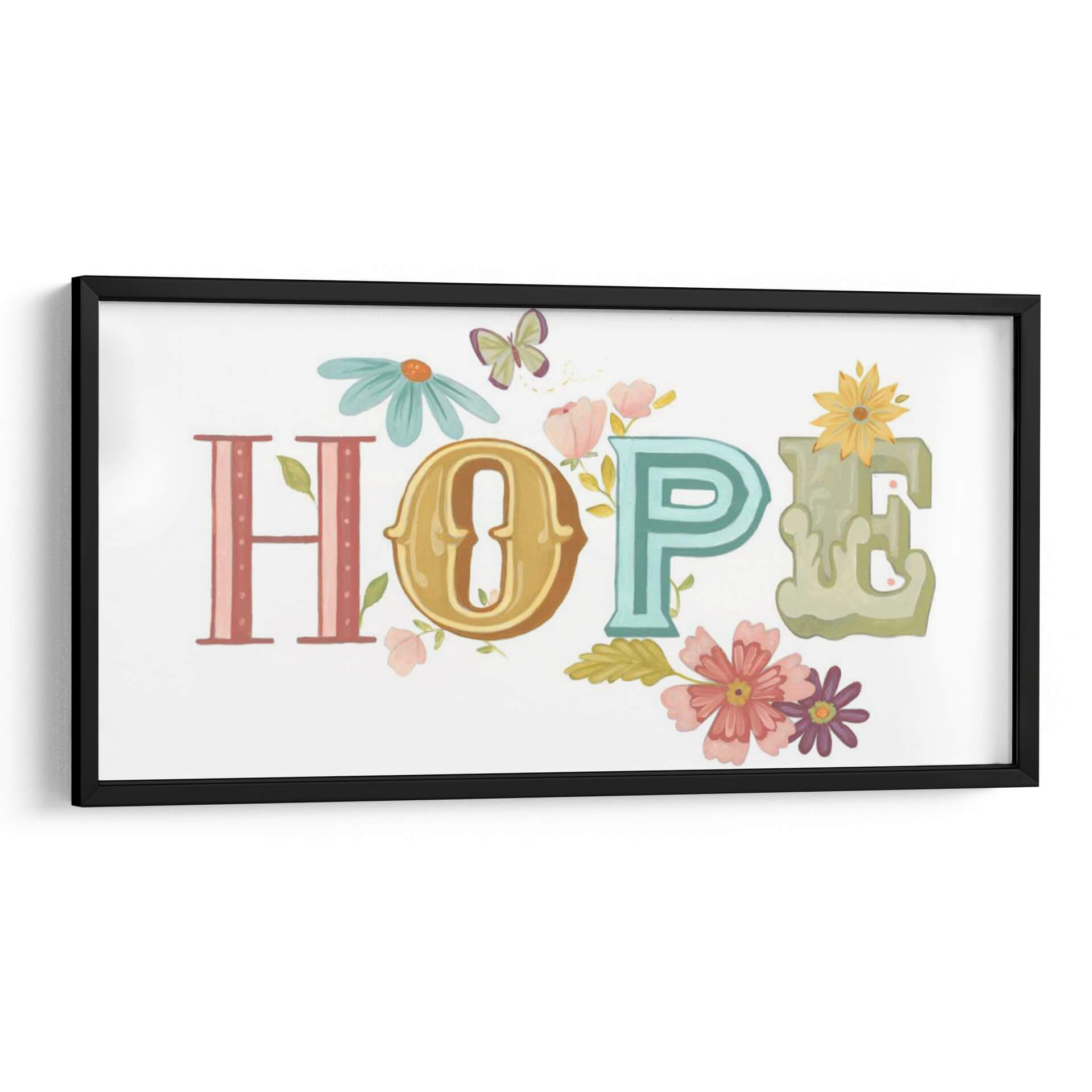 Inyecta un soplo de optimismo y color en tu espacio con "Hermosas Palabras II", una obra de arte digital de June Erica Vess. Este cautivador cuadro decorativo presenta la palabra "HOPE" (esperanza) escrita con letras estilizadas que evocan un encanto vintage, cada una con su propia personalidad y paleta de colores. La "H" en tonos rosados y lineales, la "O" en un dorado cálido y ornamentado, la "P" en un vibrante turquesa, y la "E" en un suave verde acuarela, se combinan armoniosamente sobre un fondo blanco inmaculado. La obra está generosamente adornada con delicadas flores en tonos pastel de rosa, coral y morado, junto con pequeñas margenes, que parecen brotar entre las letras, y alegres mariposas que revolotean, añadiendo un toque de naturaleza y vitalidad. La composición es equilibrada y alegre, transmitiendo una sensación de paz y positividad. "Hermosas Palabras II" es una pieza inspiradora, perfecta para iluminar cualquier habitación, desde una sala de estar moderna hasta un dormitorio acogedor o una oficina, recordándote la belleza y la resiliencia de la vida. Este cuadro es una elección ideal para quienes buscan un arte que no solo embellezca, sino que también eleve el espíritu.