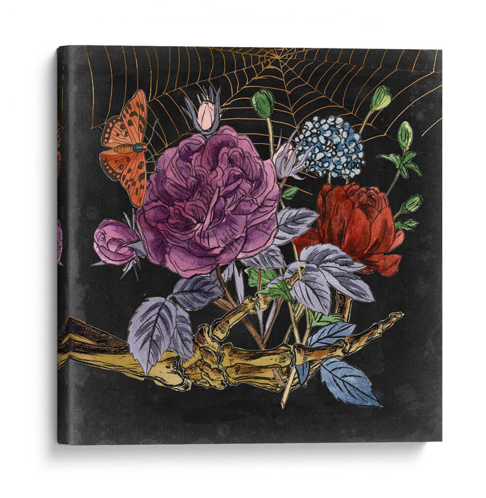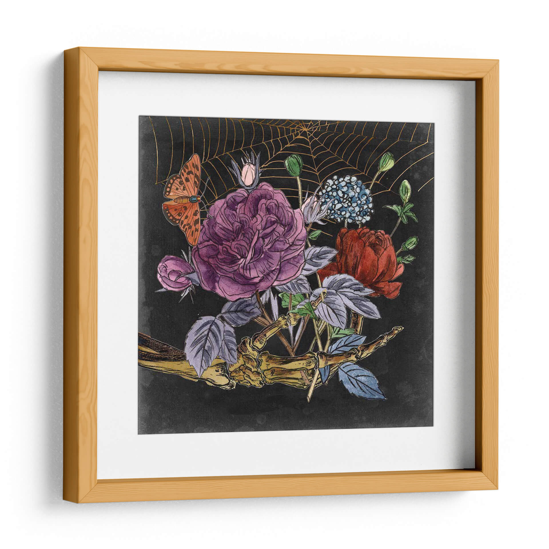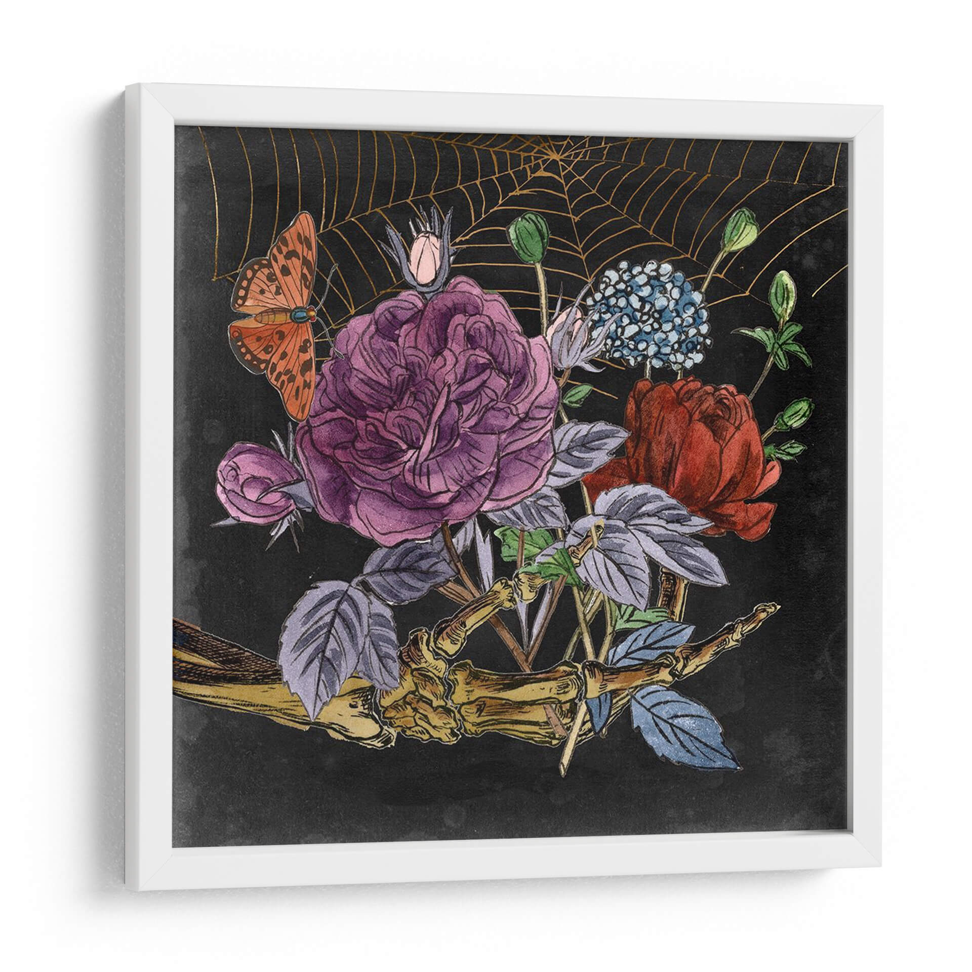 Sumérgete en la enigmática belleza de "Huesos Iv", una obra de arte cautivadora de Melissa Wang que desafía las convenciones. Esta pieza explora la fascinante dualidad entre la vida y la decadencia, presentando un exuberante ramo de flores en tonos morados, rojos y azules, que contrastan dramáticamente con un esqueleto de mano dorada y una telaraña intrincada sobre un fondo oscuro y texturizado. La mariposa naranja vibrante añade un toque de movimiento y vida fugaz a la composición. El estilo detallado y casi gótico de la ilustración evoca una atmósfera de misterio y reflexión, invitando al espectador a contemplar la naturaleza efímera de la existencia. "Huesos Iv" es ideal para quienes buscan añadir un toque de sofisticación audaz y un toque de intriga a su hogar u oficina. Este cuadro decorativo transformará cualquier pared en un punto focal de conversación, perfecto para salas de estar, estudios o comedores que aprecien el arte contemporáneo con un giro inesperado. La detallada acuarela y los toques dorados le confieren una calidad lujosa, mientras que el tema subyacente añade profundidad y carácter a tu decoración.