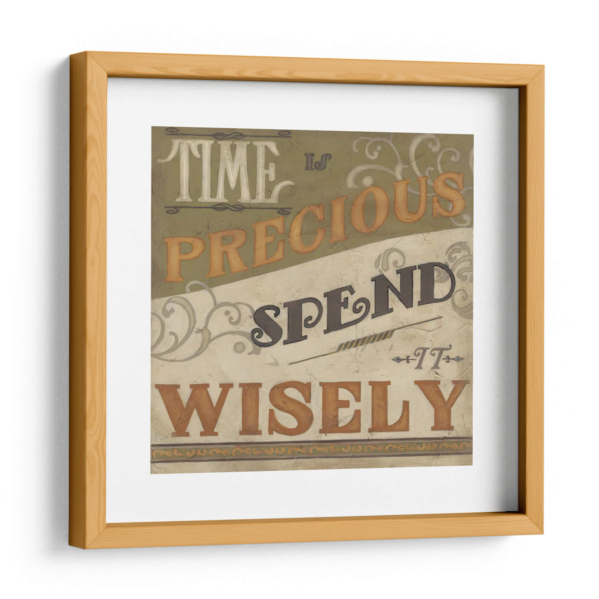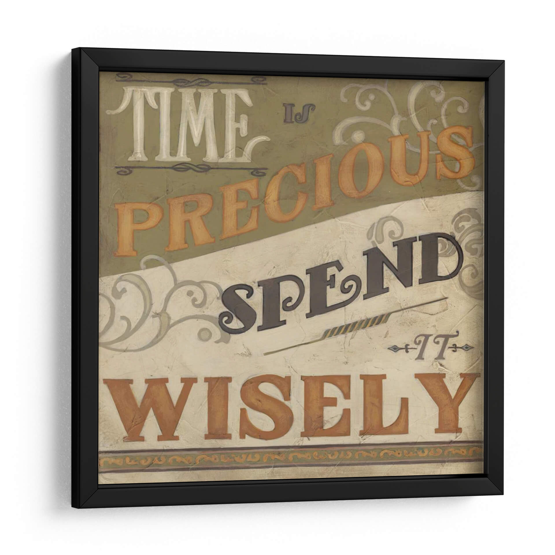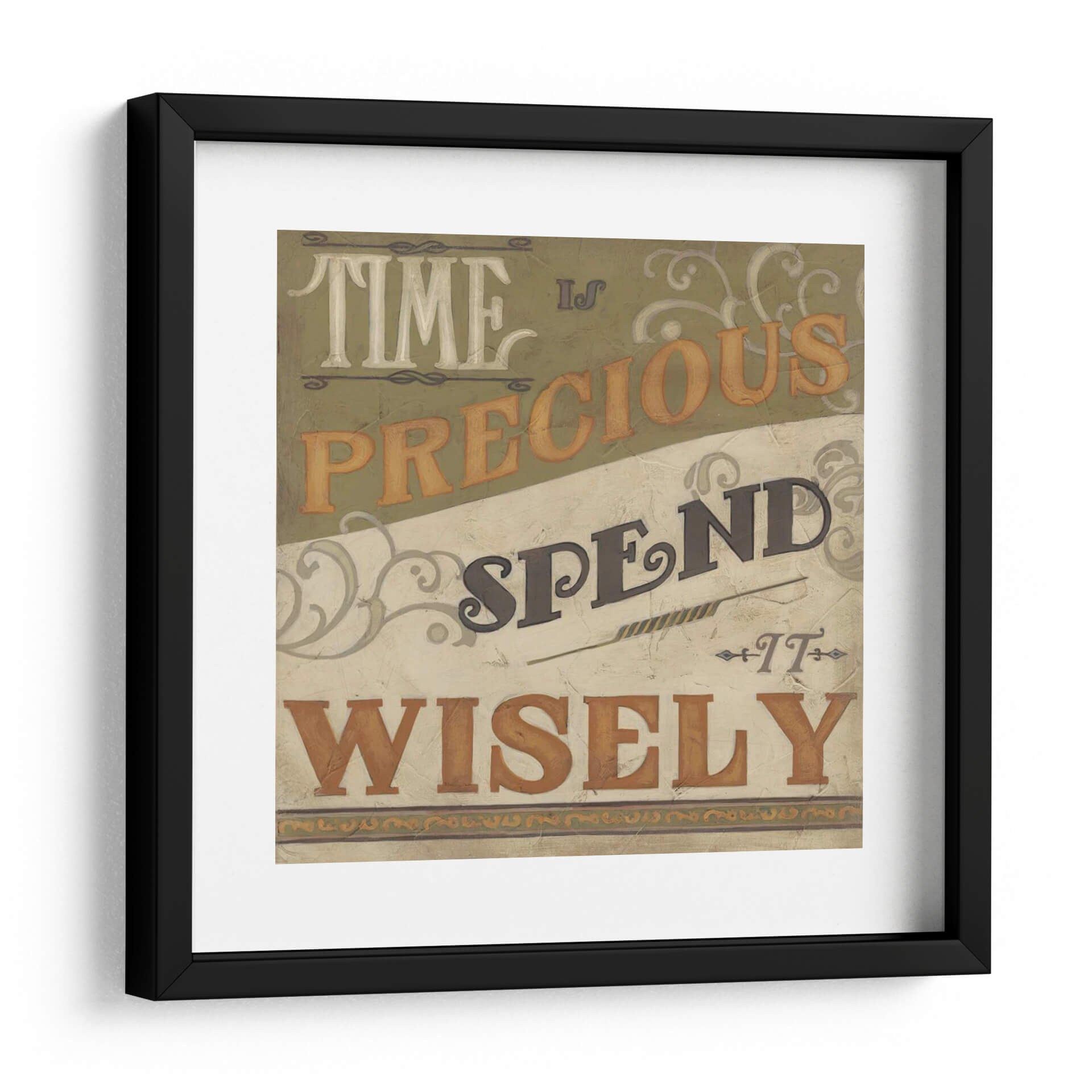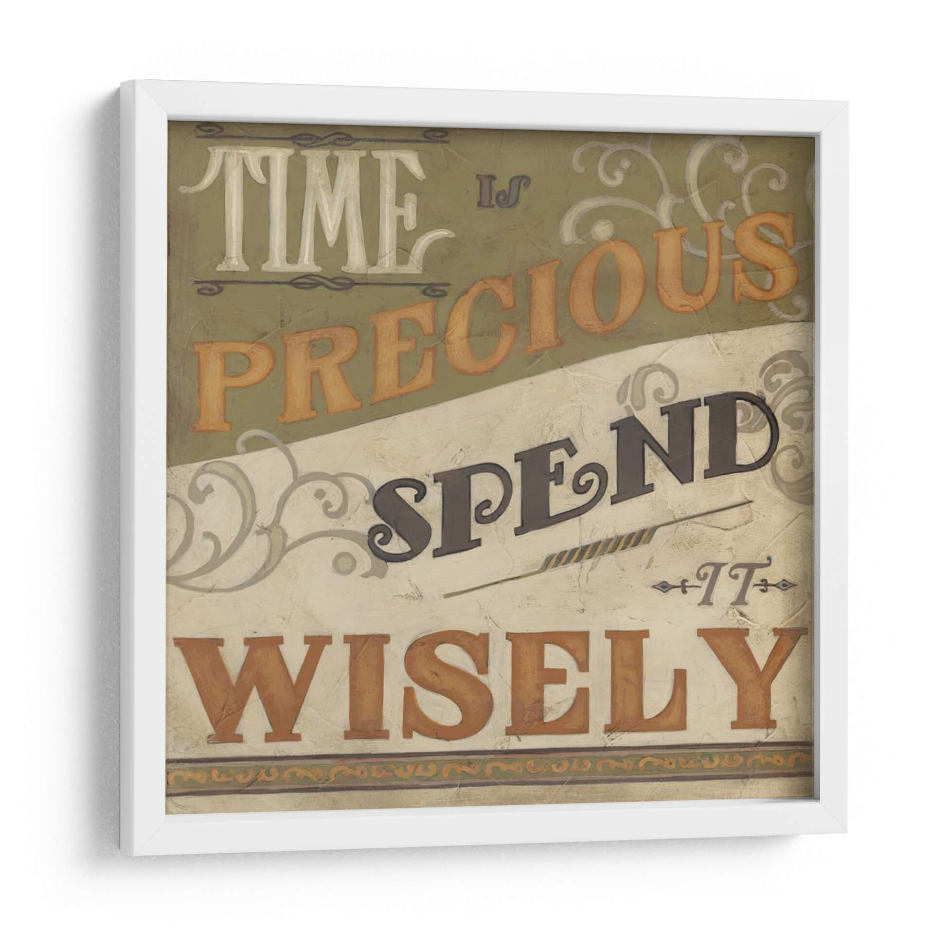 Captura la esencia del tiempo y la sabiduría con "Inspiraciones Retro IV", una obra de arte de June Erica Vess que evoca una sensación de reflexión y propósito. Este cuadro decorativo presenta una composición tipográfica audaz y nostálgica, con las palabras "TIME IS PRECIOUS SPEND IT WISELY" dispuestas en un diseño dinámico. La paleta de colores, dominada por tonos tierra, verdes apagados y acentos de ocre, crea una atmósfera cálida y atemporal, reminiscente de carteles vintage o anuncios clásicos. Los detalles ornamentales sutiles en las esquinas y entre las frases añaden un toque de elegancia y complejidad visual. "Inspiraciones Retro IV" es ideal para inspirar en espacios de trabajo, estudios o cualquier área donde se valore la productividad y la apreciación del momento presente. Su estilo retro y su mensaje inspirador lo convierten en una pieza de arte mural perfecta para infundir carácter y significado a tu hogar u oficina, recordándote constantemente la importancia de vivir cada instante con intención. Añade un toque de reflexión y estilo vintage a tu decoración.