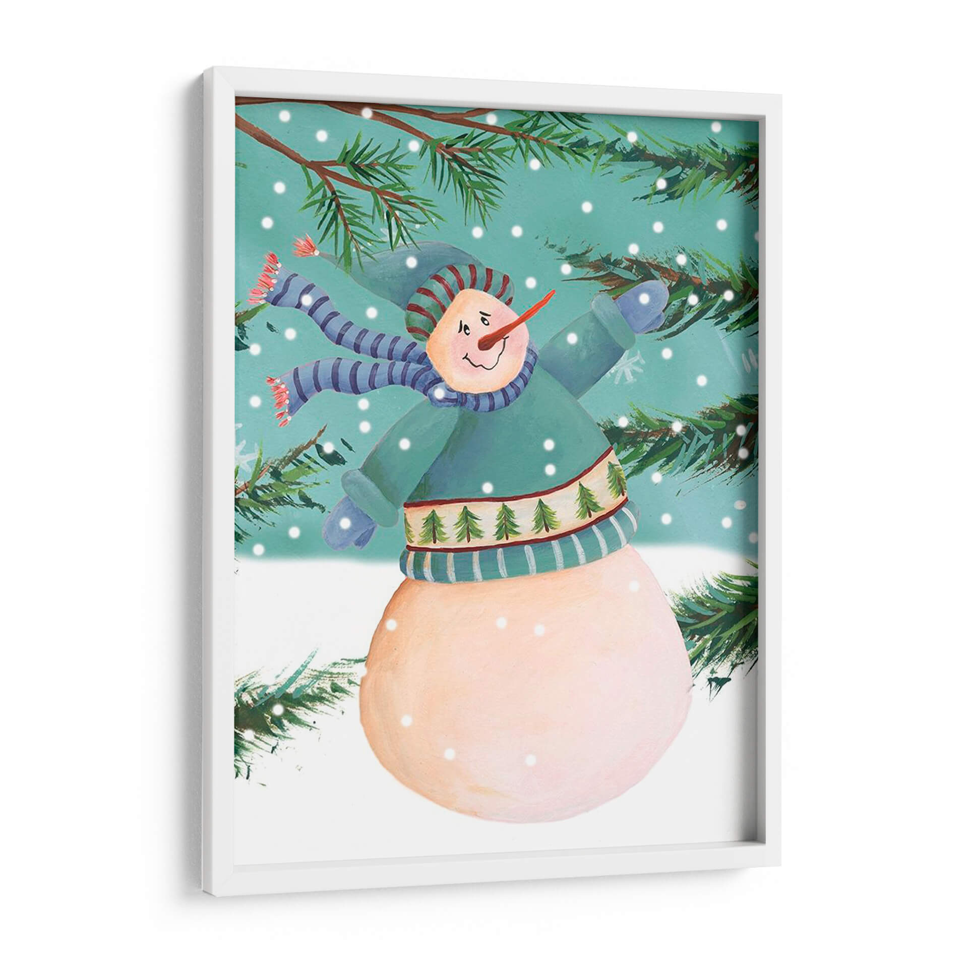 Emb uevo en un viaje invernal con "La Nieve Está Cayendo Yo", una encantadora obra de arte de Regina Moore que captura la magia y la alegría de la temporada. Este cuadro decorativo presenta un muñeco de nieve amigable, vestido con un suéter festivo y una bufanda, disfrutando de un día nevado bajo ramas de pino cubiertas de nieve. La paleta de colores, dominada por tonos fríos de azul y verde, se complementa con los tonos cálidos del muñeco de nieve, creando un equilibrio visual que evoca una sensación de confort y calidez en medio del frío invernal. La técnica de pintura, que combina elementos ilustrativos con un toque de expresionismo, da vida a la escena, invitando al espectador a sentir la frescura del aire y la tranquilidad del paisaje nevado. "La Nieve Está Cayendo Yo" es la pieza perfecta para añadir un toque de encanto y espíritu navideño a cualquier espacio, ya sea una sala de estar acogedora, un dormitorio infantil o una entrada que dé la bienvenida a los invitados con alegría. Este cuadro decorativo no solo embellece tu hogar, sino que también cuenta una historia de diversión invernal y momentos felices bajo la nieve. Ideal para quienes buscan arte que transmita emociones positivas y celebre la belleza de las estaciones.