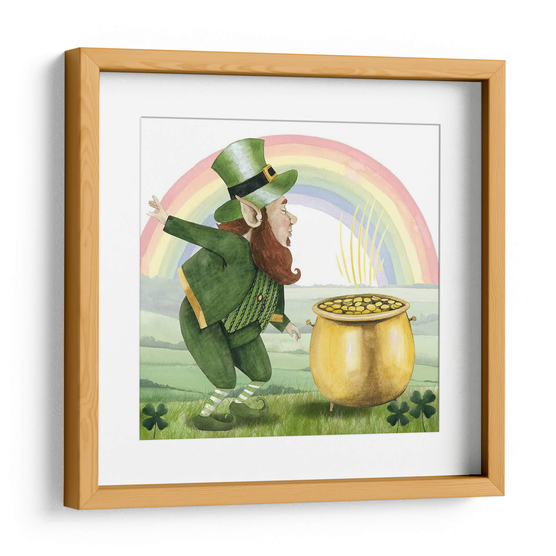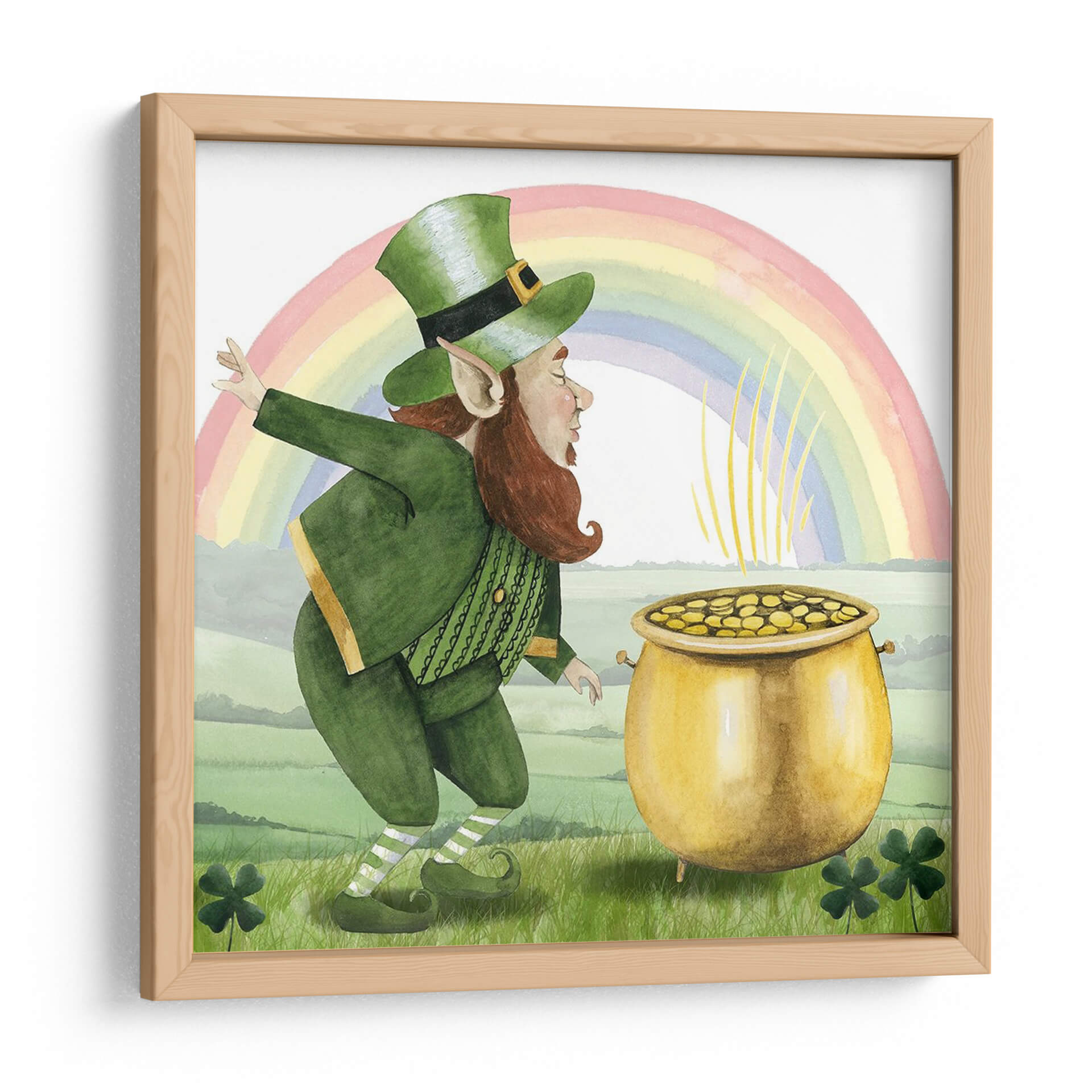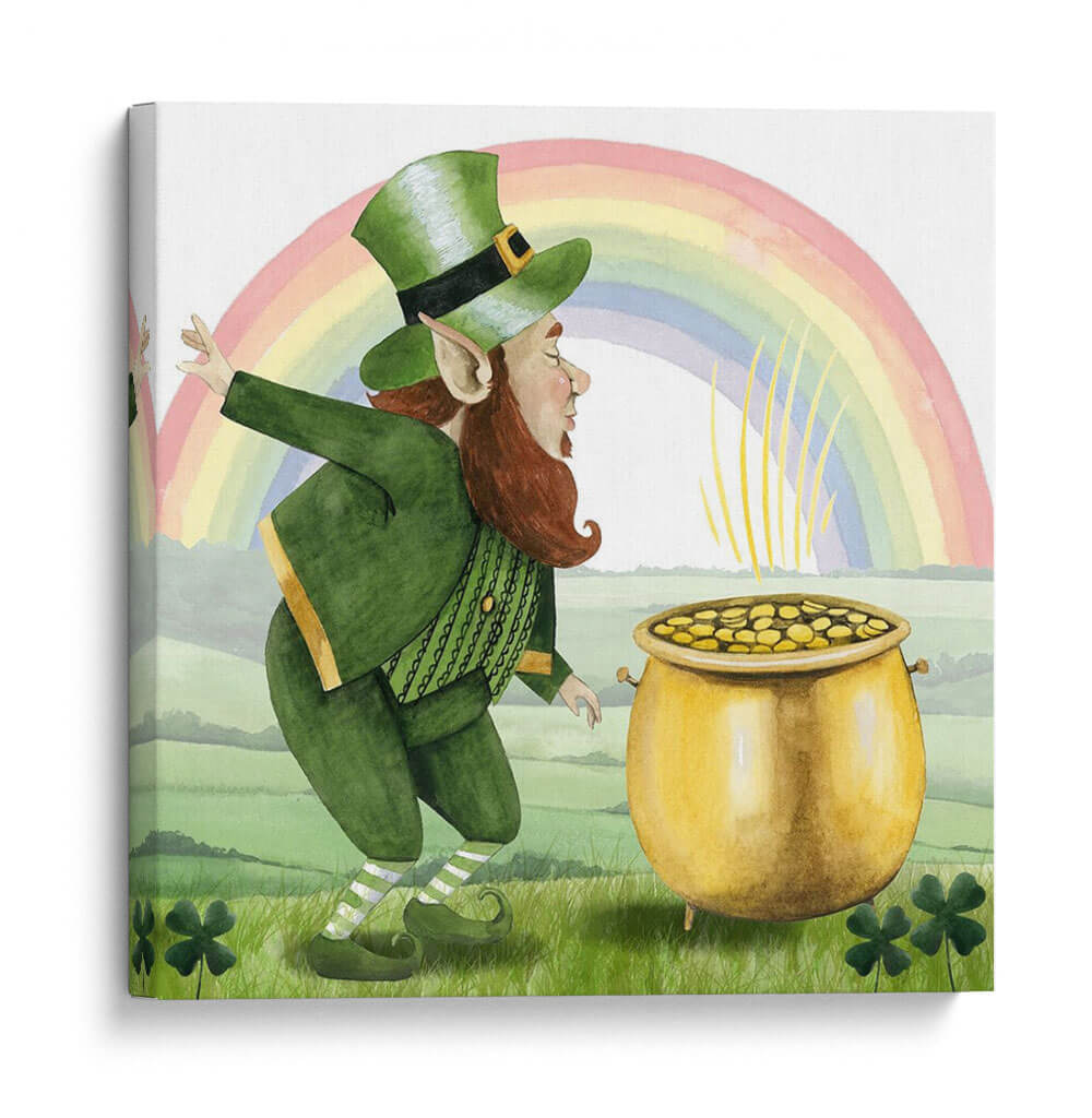 Embárcate en un viaje mágico con "Leprechauns Rainbow II", una obra de arte vibrante que captura la esencia de la suerte y la fantasía. Esta pieza, creada por Grace Popp, presenta a un leprechaun juguetón con su característico sombrero verde, inclinado con asombro sobre una olla rebosante de monedas de oro brillante. El arcoíris, pintado en delicados tonos pastel, se extiende elegantemente en el fondo, simulando el legendario final del arcoíris donde se esconde el tesoro. Los campos verdes y la hierba detallada crean un escenario idílico y encantador, mientras que los tréboles dispersos refuerzan la temática de la fortuna. El estilo pictórico, con sus trazos suaves y colores alegres, evoca una sensación de optimismo y aventura. Este cuadro decorativo es perfecto para añadir un toque de fantasía y color a cualquier espacio, desde una sala de estar moderna hasta una habitación infantil o una oficina que necesite un punto de alegría. Su composición equilibrada y sus colores cálidos lo convierten en una adición encantadora y memorable a tu decoración de pared.
