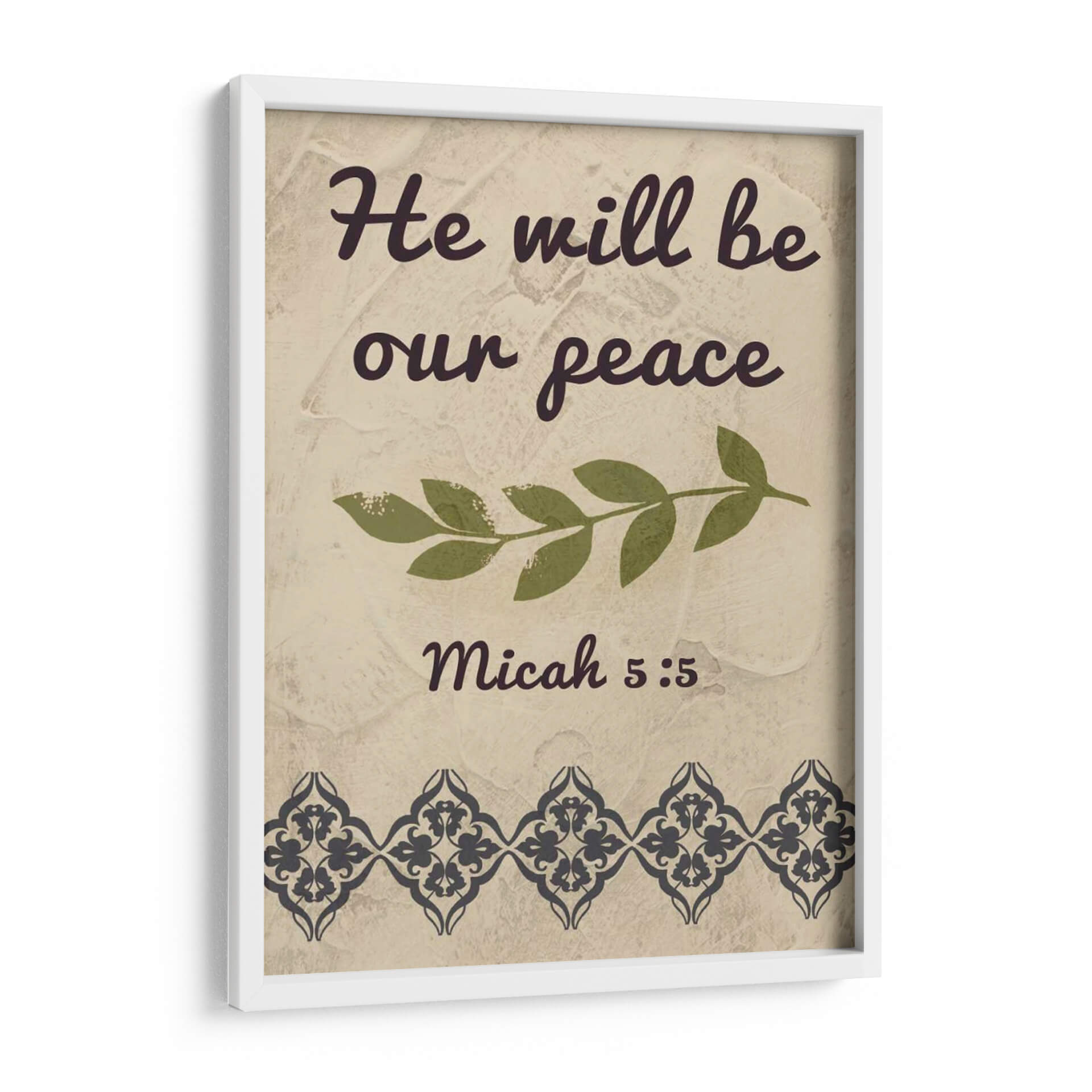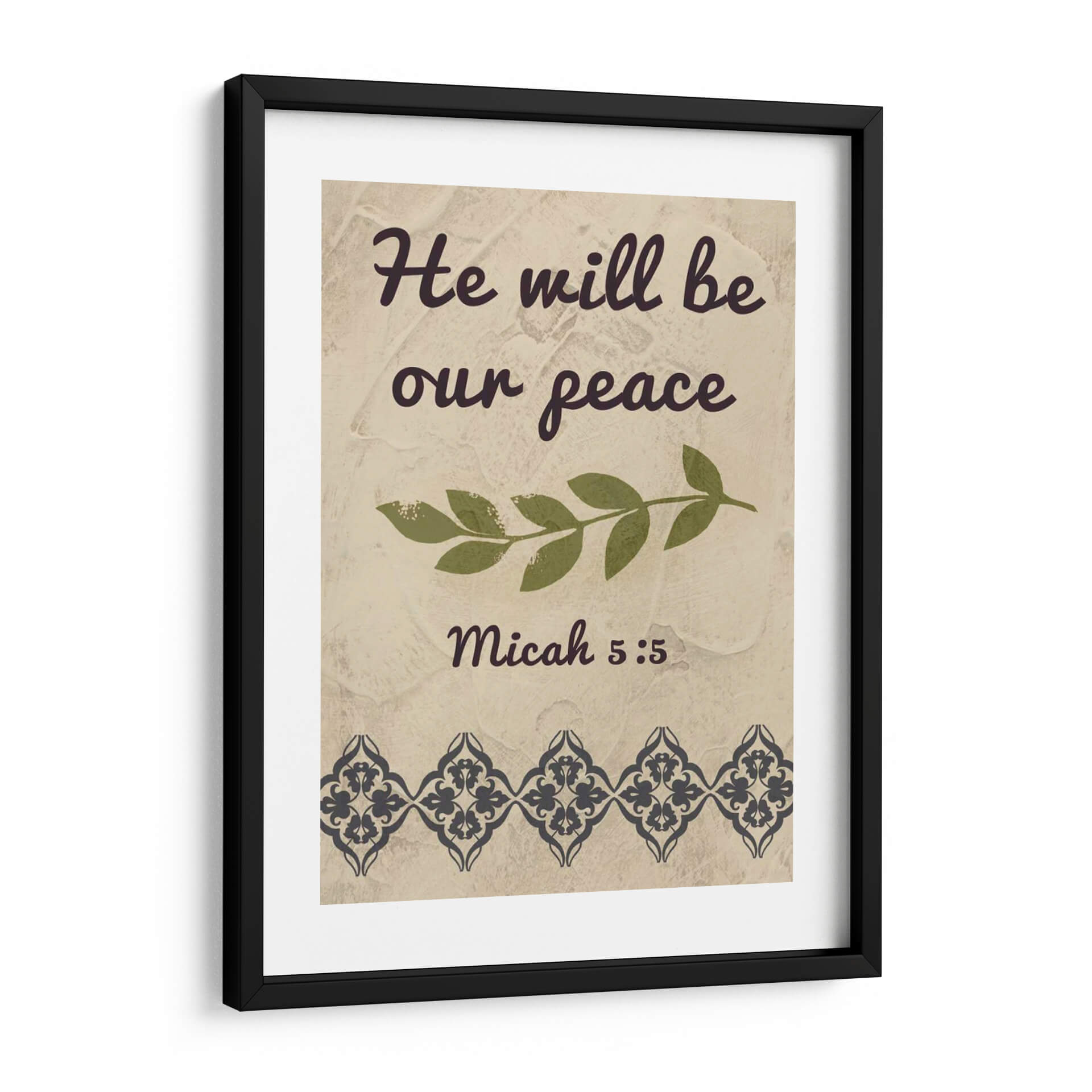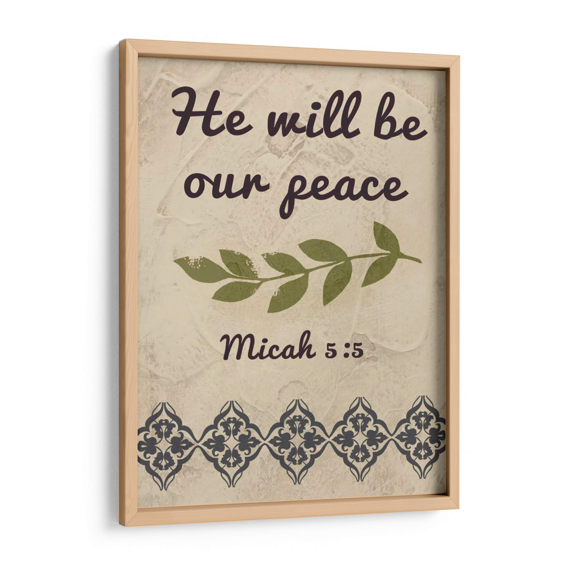 Este inspirador cuadro decorativo, titulado "Más Que Palabras Ii" del artista Studio W, es una pieza que irradia calma y serenidad. La obra presenta una paleta de colores suaves en tonos tierra, con un fondo texturizado que evoca la calidez de un pergamino antiguo. En el centro, una delicada rama con hojas verdes se despliega con gracia, simbolizando crecimiento y esperanza. Sobre ella, la frase "He will be our peace" (Él será nuestra paz) está escrita en una elegante tipografía morada, acompañada de la referencia bíblica "Micah 5:5". En la parte inferior, un sutil patrón ornamental en tonos oscuros añade un toque de sofisticación y estructura. Este cuadro es ideal para crear un ambiente de tranquilidad en tu hogar u oficina, siendo perfecto para dormitorios, salas de estar o espacios de meditación. Su diseño minimalista y su mensaje reconfortante lo convierten en una adición significativa y estilosa a cualquier decoración.