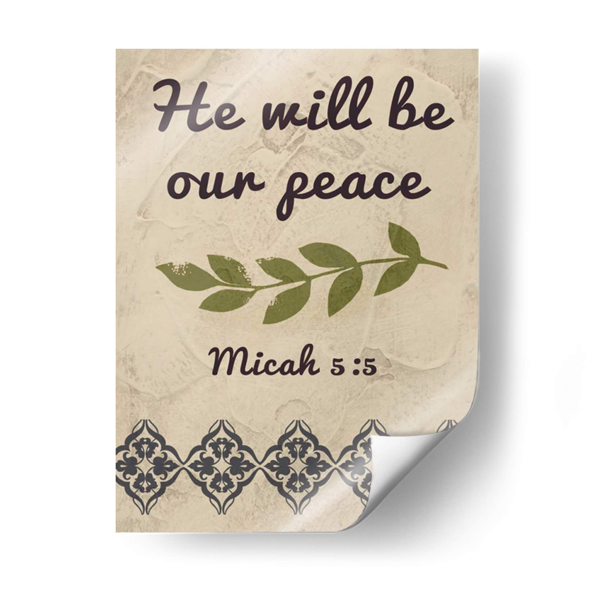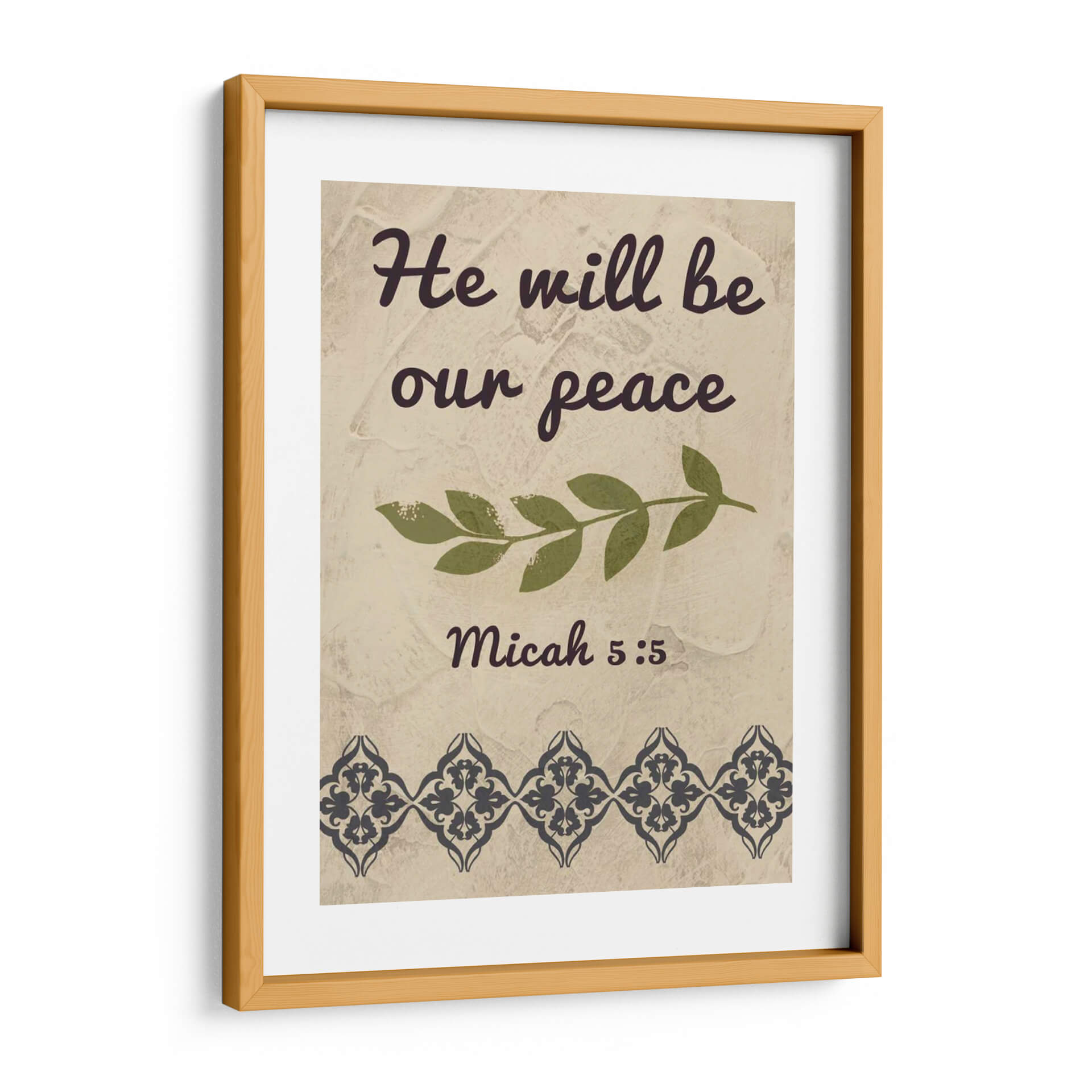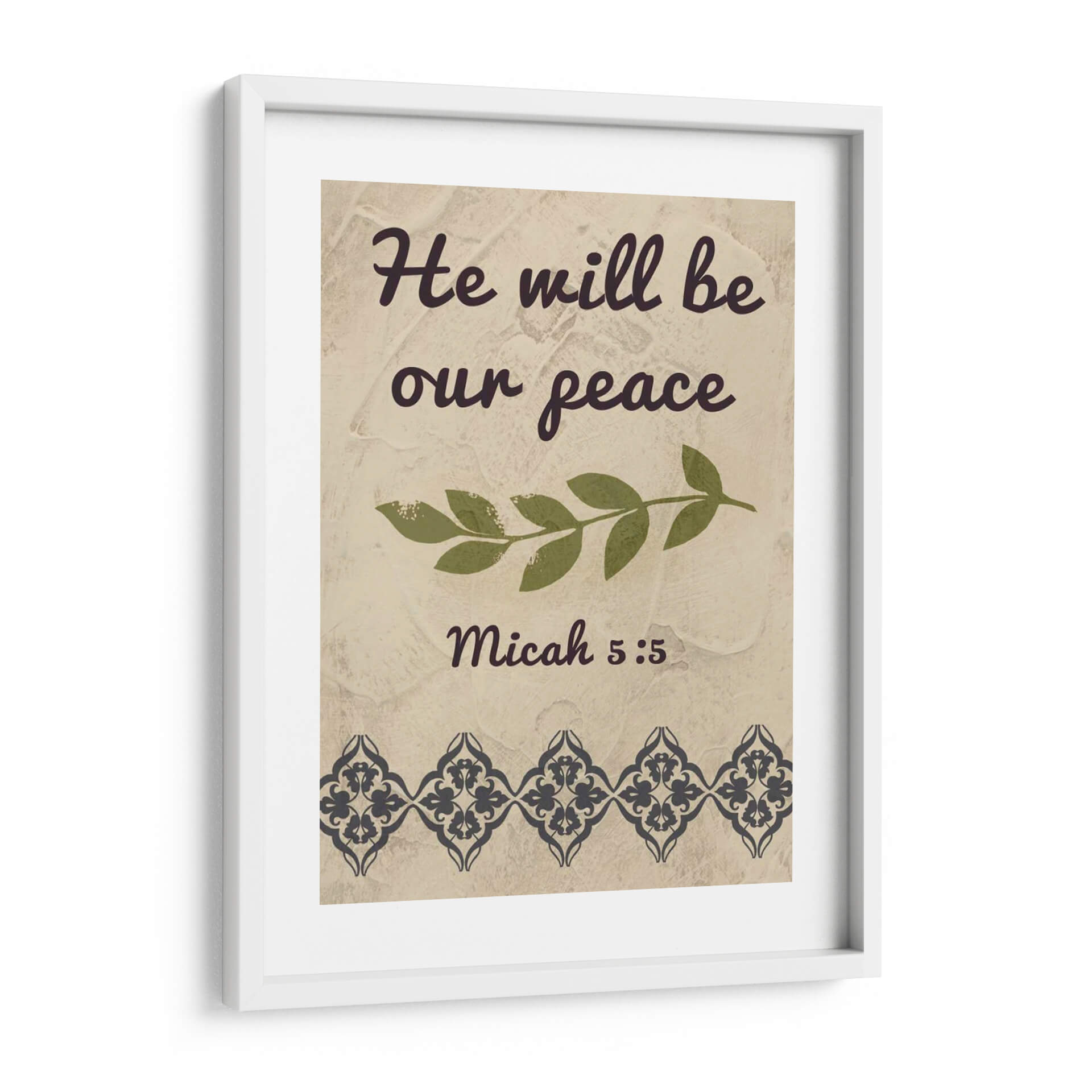 Este inspirador cuadro decorativo, titulado "Más Que Palabras Ii" del artista Studio W, es una pieza que irradia calma y serenidad. La obra presenta una paleta de colores suaves en tonos tierra, con un fondo texturizado que evoca la calidez de un pergamino antiguo. En el centro, una delicada rama con hojas verdes se despliega con gracia, simbolizando crecimiento y esperanza. Sobre ella, la frase "He will be our peace" (Él será nuestra paz) está escrita en una elegante tipografía morada, acompañada de la referencia bíblica "Micah 5:5". En la parte inferior, un sutil patrón ornamental en tonos oscuros añade un toque de sofisticación y estructura. Este cuadro es ideal para crear un ambiente de tranquilidad en tu hogar u oficina, siendo perfecto para dormitorios, salas de estar o espacios de meditación. Su diseño minimalista y su mensaje reconfortante lo convierten en una adición significativa y estilosa a cualquier decoración.